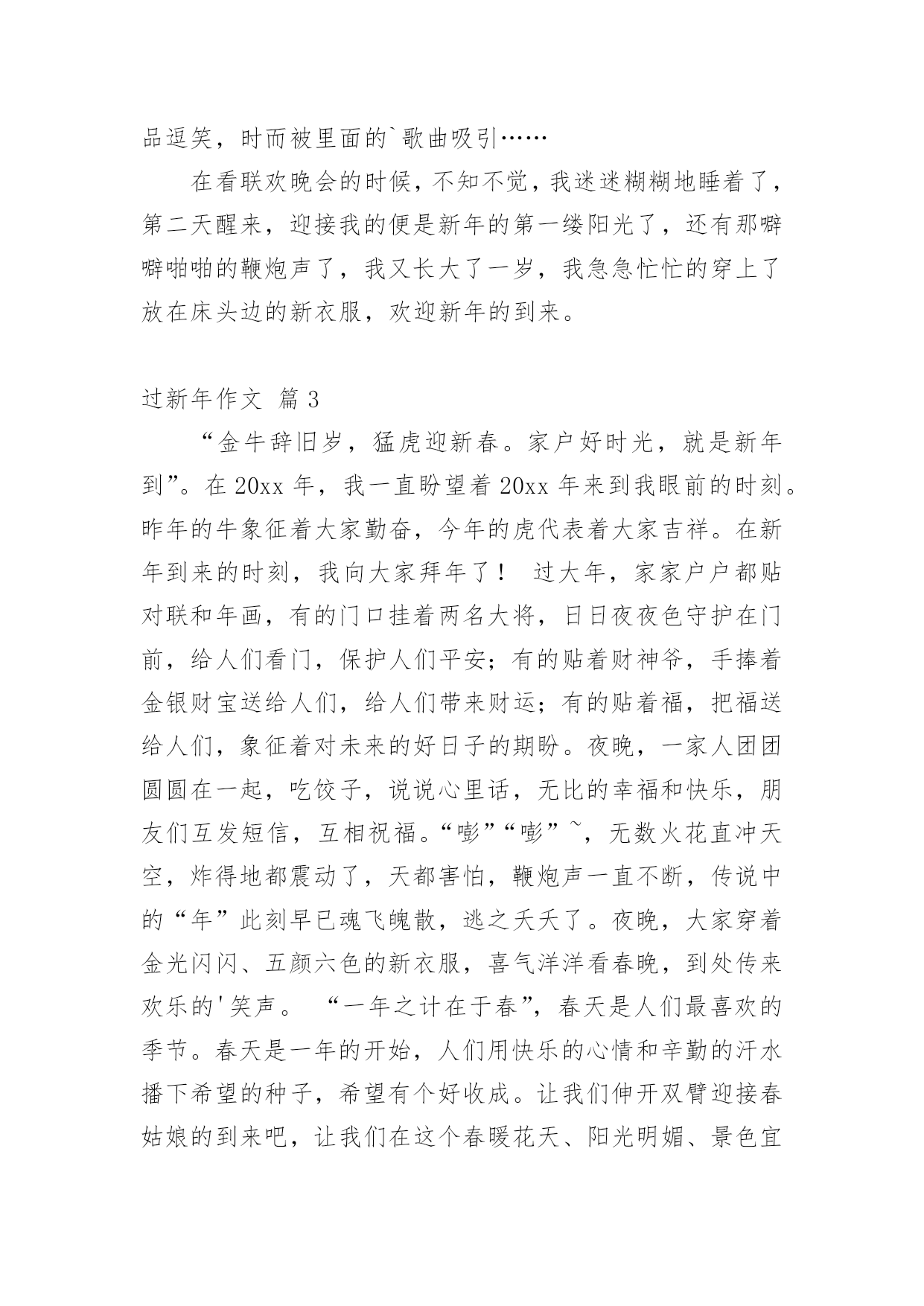 过新年作文 【热门】过新年作文三篇无论在学习、工作或是生活中,大家都不可避免地会接触到作文吧,作文是一种言语活动,具有高度的综合性和创造性。你知道作文怎样才能写的好吗?下面是小编整理的过新年作文4篇,欢迎大家借鉴与参考,希望对大家有所帮助。过新年作文篇1今天是元旦,也是新年,还是奥运年――20xx年的第一天,我很高兴。昨天我也很高兴,因为我在青少年宫上兴趣班拿到了奖品,还拿到了二等奖学金——50元。星期六我们班演过50年以后的变化,里面也说20xx是奥运年,奥运会将在20xx年8月8日中国北京隆重开幕。我好盼望8月8日早日来到。过新年作文篇2过年是我们中国的传统节日。过年要做的事可多了,买年货,做年糕,做饺子,晒鱼干,做香肠等。家家户户为过年而忙碌着,最忙要数大年三十和正月初一啦。大年三十的晚上,家家都吃团圆饭,大家一齐动手,做出自已的拿手菜,摆了满满一大桌子。一家人高高兴兴地吃着年夜饭,看着春节联欢晚会,等着新年钟声敲响后放鞭炮。在八点的时候,我们开始看联欢晚会,时而被里面的小品逗笑,时而被里面的`歌曲吸引……在看联欢晚会的时候,不知不觉,我迷迷糊糊地睡着了,第二天醒来,迎接我的便是新年的第一缕阳光了,还有那噼噼啪啪的鞭炮声了,我又长大了一岁,我急急忙忙的穿上了放在床头边的新衣服,欢迎新年的到来。过新年作文篇3“金牛辞旧岁,猛虎迎新春。家户好时光,就是新年到”。在20xx年,我一直盼望着20xx年来到我眼前的时刻。昨年的牛象征着大家勤奋,今年的虎代表着大家吉祥。在新年到来的时刻,我向大家拜年了!过大年,家家户户都贴对联和年画,有的门口挂着两名大将,日日夜夜色守护在门前,给人们看门,保护人们平安;有的贴着财神爷,手捧着金银财宝送给人们,给人们带来财运;有的贴着福,把福送给人们,象征着对未来的好日子的期盼。夜晚,一家人团团圆圆在一起,吃饺子,说说心里话,无比的幸福和快乐,朋友们互发短信,互相祝福。“嘭”“嘭”~,无数火花直冲天空,炸得地都震动了,天都害怕,鞭炮声一直不断,传说中的“年”此刻早已魂飞魄散,逃之夭夭了。夜晚,大家穿着金光闪闪、五颜六色的新衣服,喜气洋洋看春晚,到处传来欢乐的'笑声。“一年之计在于春”,春天是人们最喜欢的季节。春天是一年的开始,人们用快乐的心情和辛勤的汗水播下希望的种子,希望有个好收成。让我们伸开双臂迎接春姑娘的到来吧,让我们在这个春暖花天、阳光明媚、景色宜人的日了里一起学习、一起玩耍、一起进步吧。,