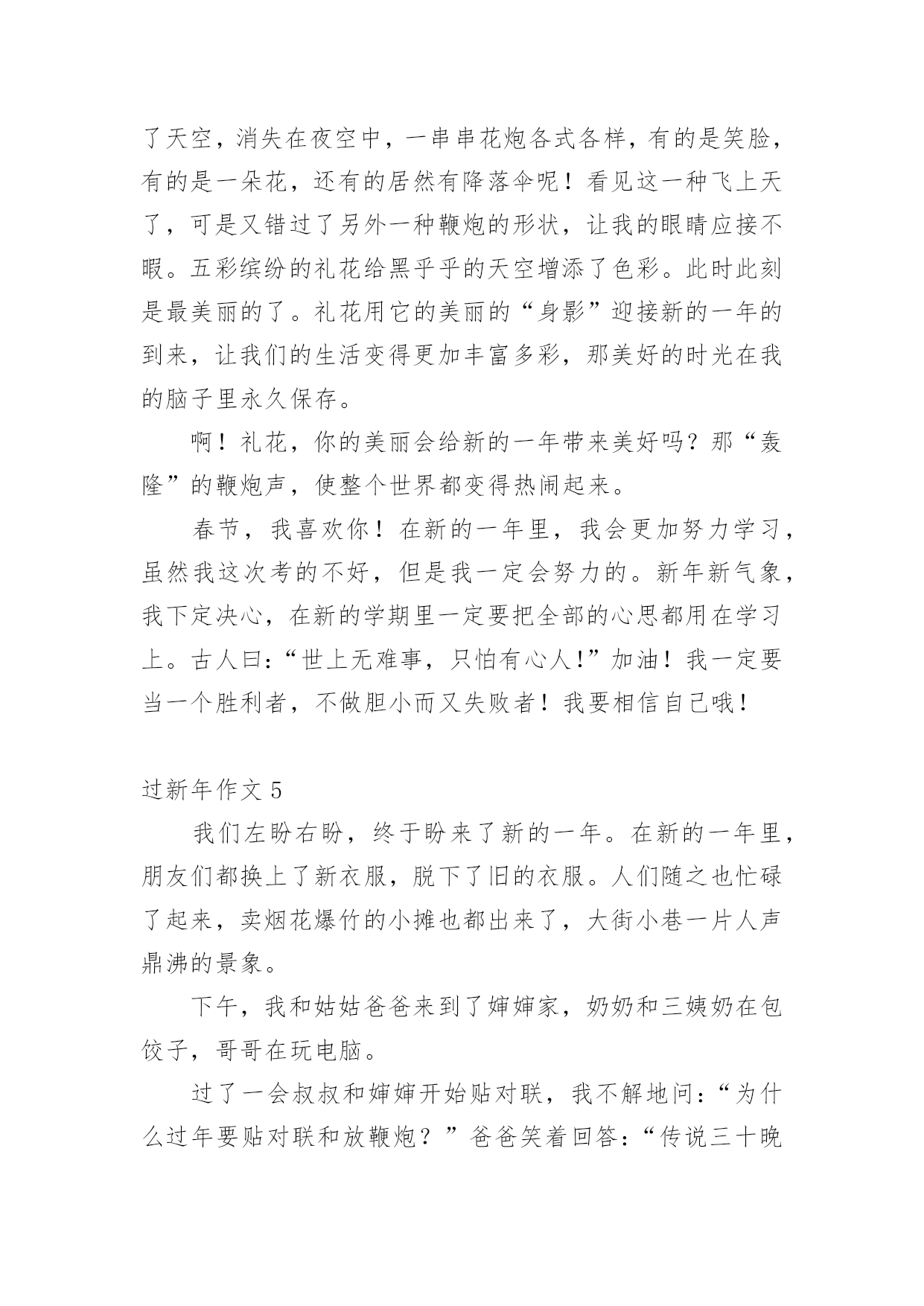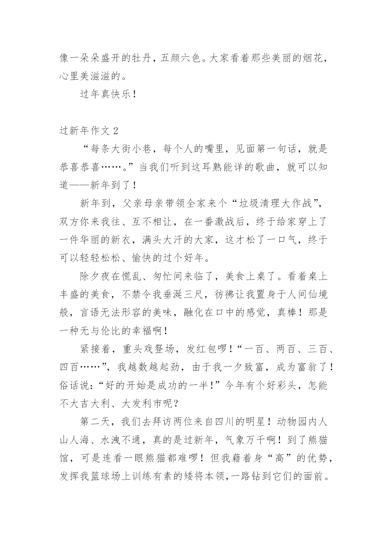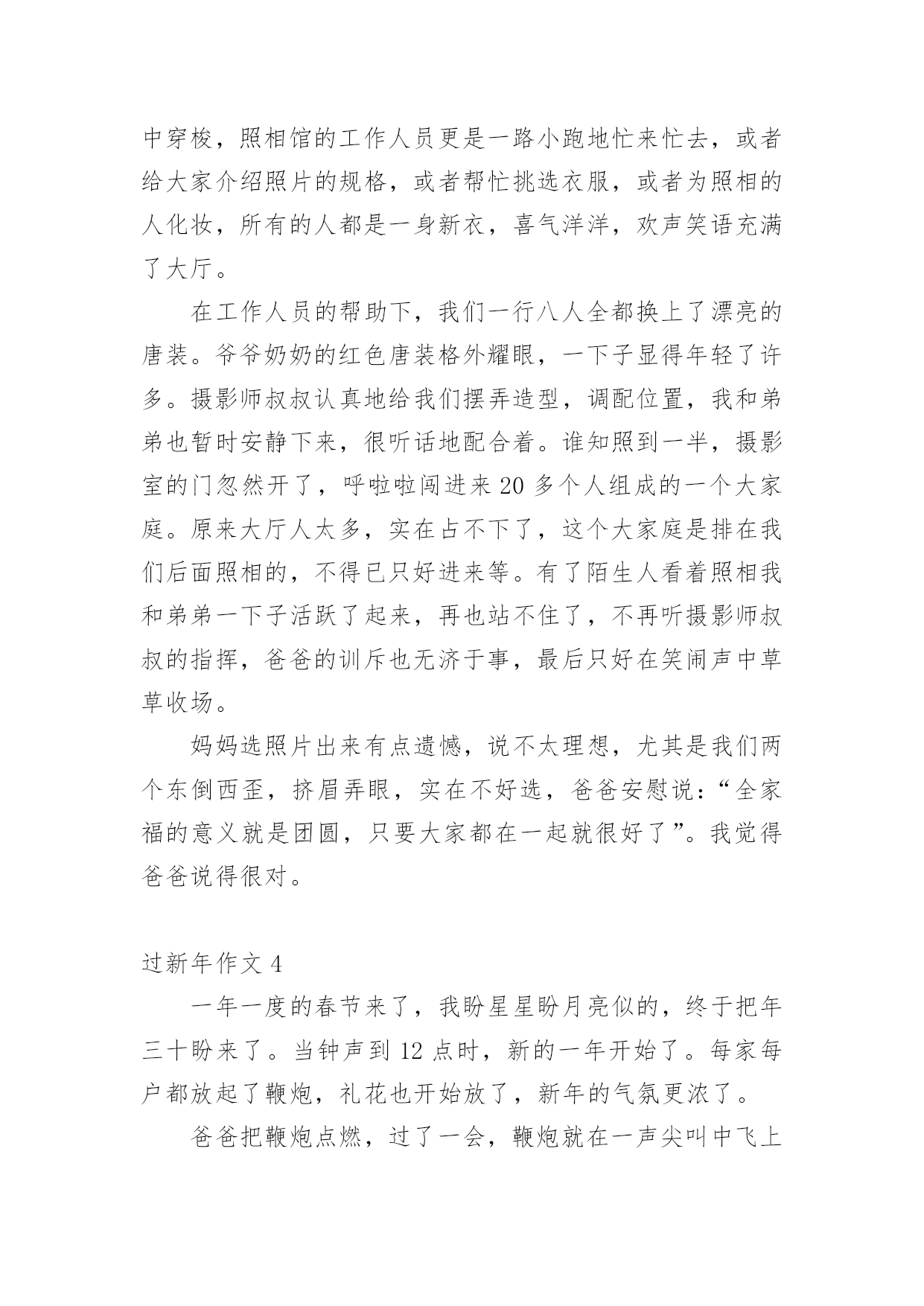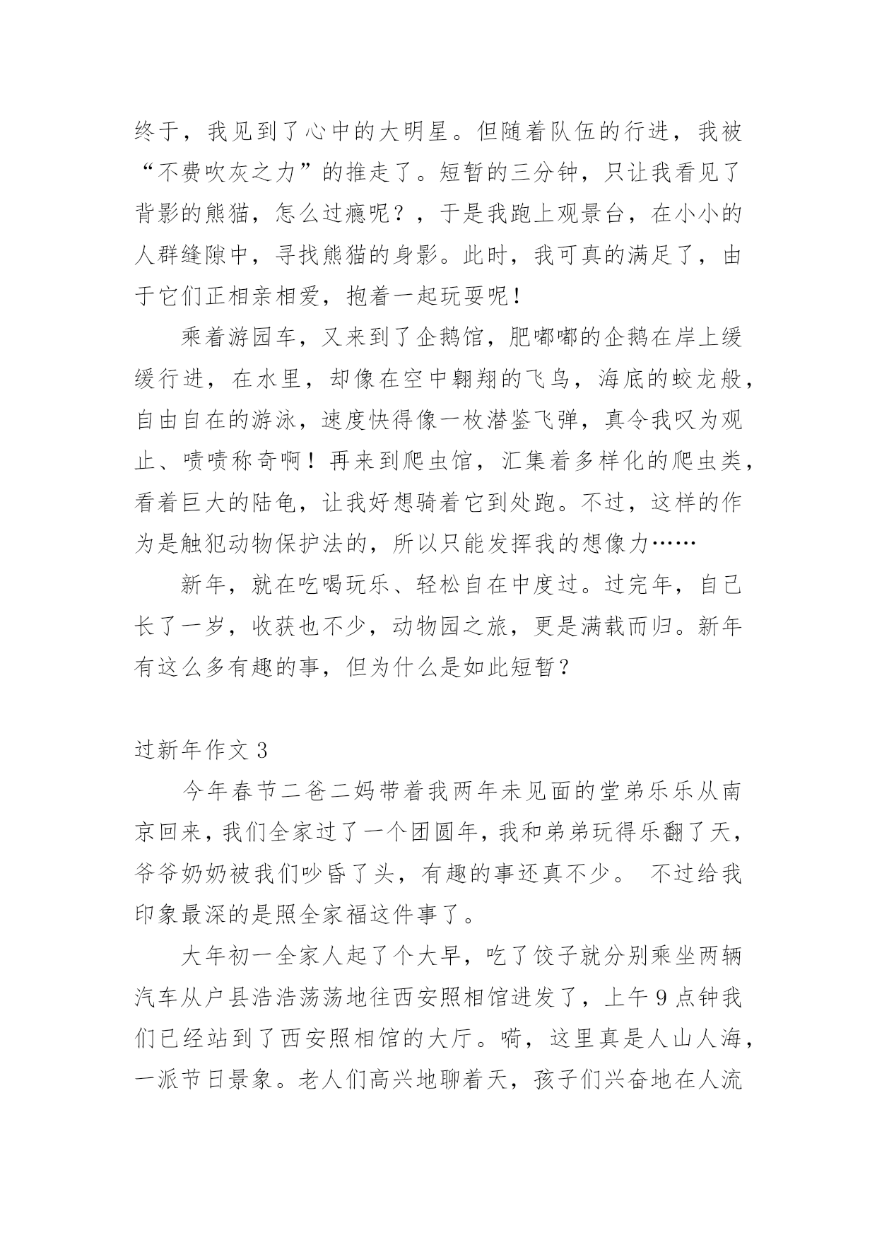 过新年作文 过新年作文【热门】无论是身处学校还是步入社会,大家都接触过作文吧,作文一定要做到主题集中,围绕同一主题作深入阐述,切忌东拉西扯,主题涣散甚至无主题。相信许多人会觉得作文很难写吧,下面是小编精心整理的过新年作文,欢迎阅读,希望大家能够喜欢。过新年作文1突然,母亲叫我敬酒,我扭扭捏捏了半天,才答应,我对着大伙说:“祝大伙在新年里快快乐乐,恭喜发财,红包拿来。”我的“恭喜发财,红包拿来”的这句话,一出,桌上的所有人都笑了起来,我的脸立刻红了,连忙坐了下来。终于熬到吃完了,大多数的长辈,来到我身边,笑着说:“由于你的恭喜发财,所以大家要给你红包,如何,开心吧?”结果,虽然我很开心,但是我跟着一个个长辈说谢谢,快要累死我了。过年时,我最喜爱的项目就是:放烟花!吃完年夜饭,我和姐姐,一起像风似的,冲到了楼下,大大家反而比大家更孩子子,比大家先一步来到了楼下。终于要放烟花了,大家先放了大的,没想到,尽然比小烟花,更小,真是不尽兴,然后大家放了小的,小的尽然是冲天炮,那些放出的烟花,像一朵朵盛开的牡丹,五颜六色。大家看着那些美丽的烟花,心里美滋滋的。过年真快乐!过新年作文2“每条大街小巷,每个人的嘴里,见面第一句话,就是恭喜恭喜……。”当我们听到这耳熟能详的歌曲,就可以知道——新年到了!新年到,父亲母亲带领全家来个“垃圾清理大作战”,双方你来我往、互不相让,在一番激战后,终于给家穿上了一件华丽的新衣,满头大汗的大家,这才松了一口气,终于可以轻轻松松、愉快的过个好年。除夕夜在慌乱、匆忙间来临了,美食上桌了。看着桌上丰盛的美食,不禁令我垂涎三尺,彷彿让我置身于人间仙境般,言语无法形容的美味,融化在口中的感觉,真棒!那是一种无与伦比的幸福啊!紧接着,重头戏豋场,发红包啰!“一百、两百、三百、四百……”,我越数越起劲,由于我一夕致富,成为富翁了!俗话说:“好的开始是成功的一半!”今年有个好彩头,怎能不大吉大利、大发利市呢?第二天,我们去拜访两位来自四川的明星!动物园内人山人海、水洩不通,真的是过新年,气象万千啊!到了熊猫馆,可是连看一眼熊猫都难啰!但我藉着身“高”的优势,发挥我篮球场上训练有素的矮将本领,一路钻到它们的面前。终于,我见到了心中的大明星。但随着队伍的行进,我被“不费吹灰之力”的推走了。短暂的三分钟,只让我看见了背影的熊猫,怎么过瘾呢?,于是我跑上观景台,在小小的人群缝隙中,寻找熊猫的身影。此时,我可真的满足了,由于它们正相亲相爱,抱着一起玩耍呢!乘着游园车,又来到了企鹅馆,肥嘟嘟的企鹅在岸上缓缓行进,在水里,却像在空中翱翔的飞鸟,海底的蛟龙般,自由自在的游泳,速度快得像一枚潜鉴飞弹,真令我叹为观止、啧啧称奇啊!再来到爬虫馆,汇集着多样化的爬虫类,看着巨大的陆龟,让我好想骑着它到处跑。不过,这样的作为是触犯动物保护法的,所以只能发挥我的想像力……新年,就在吃喝玩乐、轻松自在中度过。过完年,自己长了一岁,收获也不少,动物园之旅,更是满载而归。新年有这么多有趣的事,但为什么是如此短暂?过新年作文3今年春节二爸二妈带着我两年未见面的堂弟乐乐从南京回来,我们全家过了一个团圆年,我和弟弟玩得乐翻了天,爷爷奶奶被我们吵昏了头,有趣的事还真不少。不过给我印象最深的是照全家福这件事了。大年初一全家人起了个大早,吃了饺子就分别乘坐两辆汽车从户县浩浩荡荡地往西安照相馆进发了,上午9点钟我们已经站到了西安照相馆的大厅。嗬,这里真是人山人海,一派节日景象。老人们高兴地聊着天,孩子们兴奋地在人流中穿梭,照相馆的工作人员更是一路小跑地忙来忙去,或者给大家介绍照片的规格,或者帮忙挑选衣服,或者为照相的人化妆,所有的人都是一身新衣,喜气洋洋,欢声笑语充满了大厅。在工作人员的帮助下,我们一行八人全都换上了漂亮的唐装。爷爷奶奶的红色唐装格外耀眼,一下子显得年轻了许多。摄影师叔叔认真地给我们摆弄造型,调配位置,我和弟弟也暂时安静下来,很听话地配合着。谁知照到一半,摄影室的门忽然开了,呼啦啦闯进来20多个人组成的一个大家庭。原来大厅人太多,实在占不下了,这个大家庭是排在我们后面照相的,不得已只好进来等。有了陌生人看着照相我和弟弟一下子活跃了起来,再也站不住了,不再听摄影师叔叔的指挥,爸爸的训斥也无济于事,最后只好在笑闹声中草草收场。妈妈选照片出来有点遗憾,说不太理想,尤其是我们两个东倒西歪,挤眉弄眼,实在不好选,爸爸安慰说:“全家福的意义就是团圆,只要大家都在一起就很好了”。我觉得爸爸说得很对。过新年作文4一年一度的春节来了,我盼星星盼月亮似的,终于把年三十盼来了。当钟声到12点时,新的一年开始了。每家每户都放起了鞭炮,礼花也开始放了,新年的气氛更浓了。爸爸把鞭炮点燃,过了一会,鞭炮就在一声尖叫中飞上了天空,消失在夜空中,一串串花炮各式各样,有的是笑脸,有的是一朵