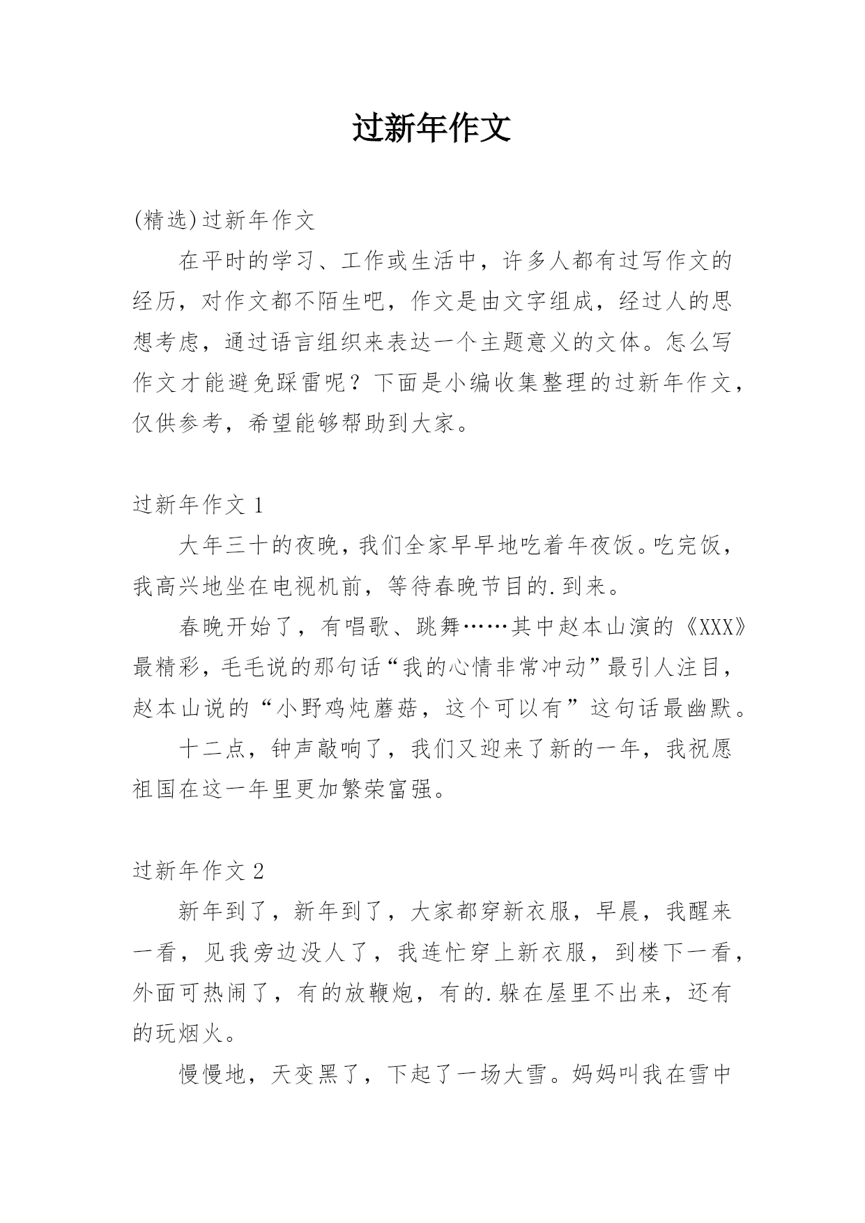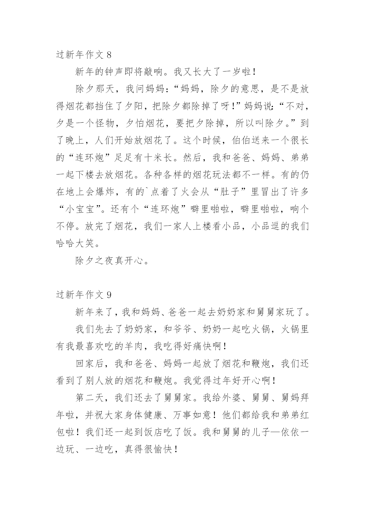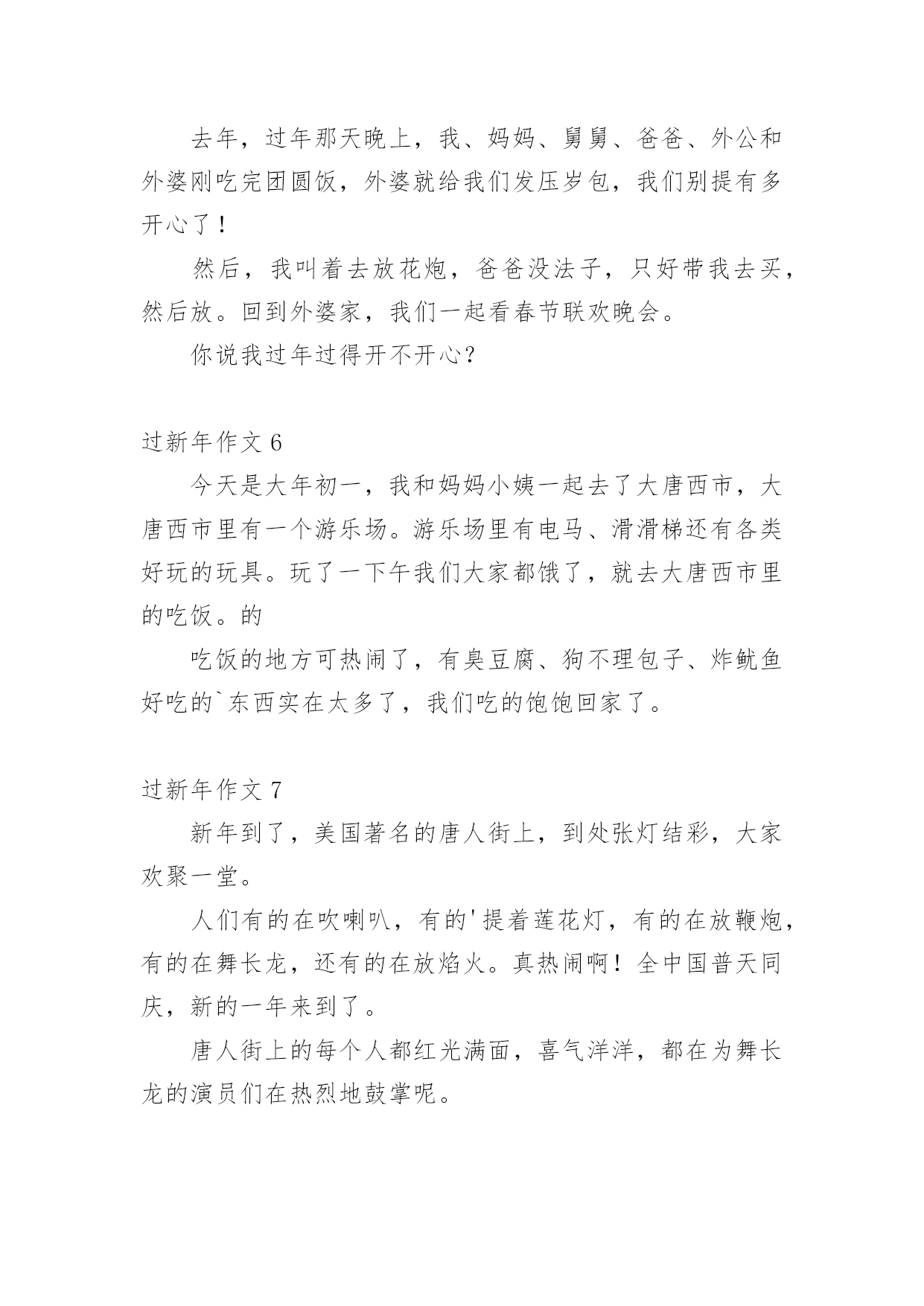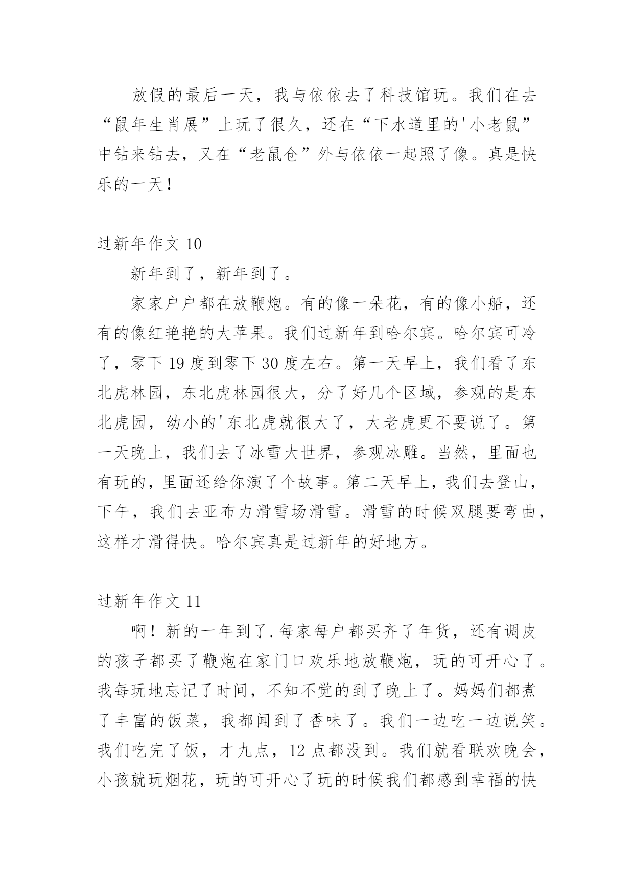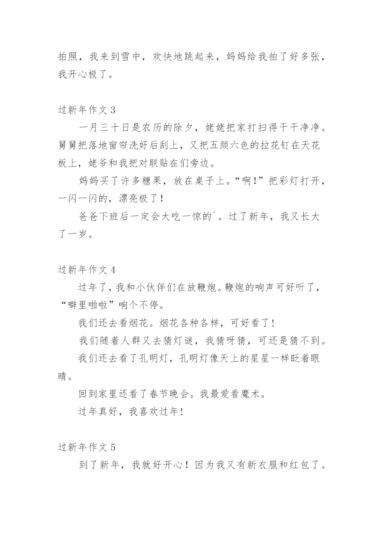 过新年作文 (精选)过新年作文在平时的学习、工作或生活中,许多人都有过写作文的经历,对作文都不陌生吧,作文是由文字组成,经过人的思想考虑,通过语言组织来表达一个主题意义的文体。怎么写作文才能避免踩雷呢?下面是小编收集整理的过新年作文,仅供参考,希望能够帮助到大家。过新年作文1大年三十的夜晚,我们全家早早地吃着年夜饭。吃完饭,我高兴地坐在电视机前,等待春晚节目的.到来。春晚开始了,有唱歌、跳舞……其中赵本山演的《XXX》最精彩,毛毛说的那句话“我的心情非常冲动”最引人注目,赵本山说的“小野鸡炖蘑菇,这个可以有”这句话最幽默。十二点,钟声敲响了,我们又迎来了新的一年,我祝愿祖国在这一年里更加繁荣富强。过新年作文2新年到了,新年到了,大家都穿新衣服,早晨,我醒来一看,见我旁边没人了,我连忙穿上新衣服,到楼下一看,外面可热闹了,有的放鞭炮,有的.躲在屋里不出来,还有的玩烟火。慢慢地,天变黑了,下起了一场大雪。妈妈叫我在雪中拍照,我来到雪中,欢快地跳起来,妈妈给我拍了好多张,我开心极了。过新年作文3一月三十日是农历的除夕,姥姥把家打扫得干干净净。舅舅把落地窗帘洗好后刮上,又把五颜六色的拉花钉在天花板上,姥爷和我把对联贴在们旁边。妈妈买了许多糖果,放在桌子上。“啊!”把彩灯打开,一闪一闪的,漂亮极了!爸爸下班后一定会大吃一惊的`。过了新年,我又长大了一岁。过新年作文4过年了,我和小伙伴们在放鞭炮。鞭炮的响声可好听了,“噼里啪啦”响个不停。我们还去看烟花。烟花各种各样,可好看了!我们随着人群又去猜灯谜,我猜呀猜,可还是猜不到。我们还去看了孔明灯,孔明灯像天上的星星一样眨着眼睛。回到家里还看了春节晚会。我最爱看魔术。过年真好,我喜欢过年!过新年作文5到了新年,我就好开心!因为我又有新衣服和红包了。去年,过年那天晚上,我、妈妈、舅舅、爸爸、外公和外婆刚吃完团圆饭,外婆就给我们发压岁包,我们别提有多开心了!然后,我叫着去放花炮,爸爸没法子,只好带我去买,然后放。回到外婆家,我们一起看春节联欢晚会。你说我过年过得开不开心?过新年作文6今天是大年初一,我和妈妈小姨一起去了大唐西市,大唐西市里有一个游乐场。游乐场里有电马、滑滑梯还有各类好玩的玩具。玩了一下午我们大家都饿了,就去大唐西市里的吃饭。的吃饭的地方可热闹了,有臭豆腐、狗不理包子、炸鱿鱼好吃的`东西实在太多了,我们吃的饱饱回家了。过新年作文7新年到了,美国著名的唐人街上,到处张灯结彩,大家欢聚一堂。人们有的在吹喇叭,有的'提着莲花灯,有的在放鞭炮,有的在舞长龙,还有的在放焰火。真热闹啊!全中国普天同庆,新的一年来到了。唐人街上的每个人都红光满面,喜气洋洋,都在为舞长龙的演员们在热烈地鼓掌呢。过新年作文8新年的钟声即将敲响。我又长大了一岁啦!除夕那天,我问妈妈:“妈妈,除夕的意思,是不是放得烟花都挡住了夕阳,把除夕都除掉了呀!”妈妈说:“不对,夕是一个怪物,夕怕烟花,要把夕除掉,所以叫除夕。”到了晚上,人们开始放烟花了。这个时候,伯伯送来一个很长的“连环炮”足足有十米长。然后,我和爸爸、妈妈、弟弟一起下楼去放烟花。各种各样的烟花玩法都不一样。有的仍在地上会爆炸,有的`点着了火会从“肚子”里冒出了许多“小宝宝”。还有个“连环炮”噼里啪啦,噼里啪啦,响个不停。放完了烟花,我们一家人上楼看小品,小品逗的我们哈哈大笑。除夕之夜真开心。过新年作文9新年来了,我和妈妈、爸爸一起去奶奶家和舅舅家玩了。我们先去了奶奶家,和爷爷、奶奶一起吃火锅,火锅里有我最喜欢吃的羊肉,我吃得好痛快啊!回家后,我和爸爸、妈妈一起放了烟花和鞭炮,我们还看到了别人放的烟花和鞭炮。我觉得过年好开心啊!第二天,我们还去了舅舅家。我给外婆、舅舅、舅妈拜年啦,并祝大家身体健康、万事如意!他们都给我和弟弟红包啦!我们还一起到饭店吃了饭。我和舅舅的儿子—依依一边玩、一边吃,真得很愉快!放假的最后一天,我与依依去了科技馆玩。我们在去“鼠年生肖展”上玩了很久,还在“下水道里的'小老鼠”中钻来钻去,又在“老鼠仓”外与依依一起照了像。真是快乐的一天!过新年作文10新年到了,新年到了。家家户户都在放鞭炮。有的像一朵花,有的像小船,还有的像红艳艳的大苹果。我们过新年到哈尔宾。哈尔宾可冷了,零下19度到零下30度左右。第一天早上,我们看了东北虎林园,东北虎林园很大,分了好几个区域,参观的是东北虎园,幼小的'东北虎就很大了,大老虎更不要说了。第一天晚上,我们去了冰雪大世界,参观冰雕。当然,里面也有玩的,里面还给你演了个故事。第二天早上,我们去登山,下午,我们去亚布力滑雪场滑雪。滑雪的时候双腿要弯曲,这样才滑得快。哈尔宾真是过新年的好地方。过新年作文11啊!新的一年到了.每家每户都买齐了年货,还有调皮的孩子都买了鞭炮在家门口欢乐地放鞭炮,玩的可开心了。我每玩地忘