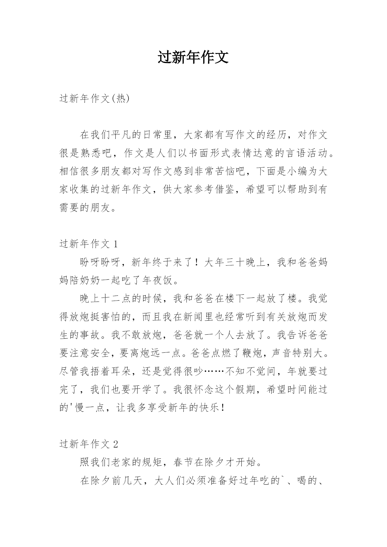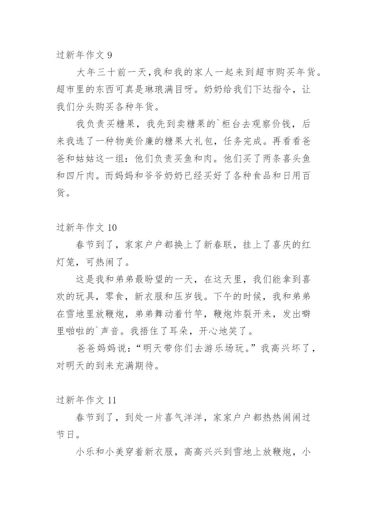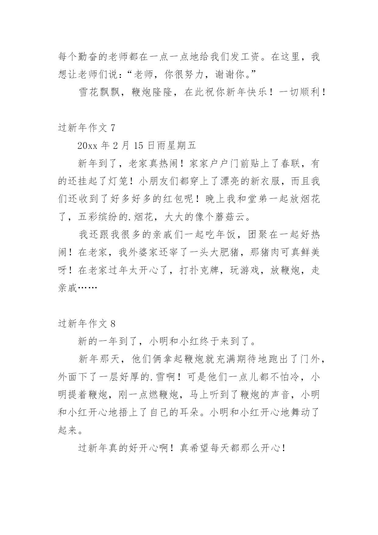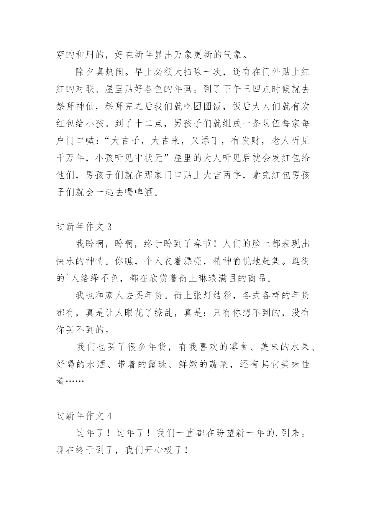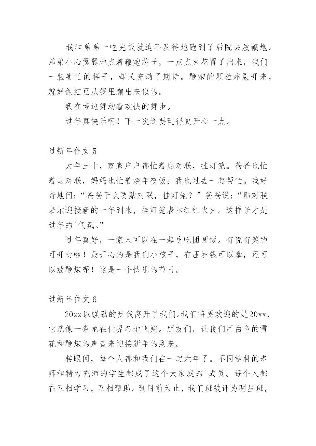 过新年作文 过新年作文(热)在我们平凡的日常里,大家都有写作文的经历,对作文很是熟悉吧,作文是人们以书面形式表情达意的言语活动。相信很多朋友都对写作文感到非常苦恼吧,下面是小编为大家收集的过新年作文,供大家参考借鉴,希望可以帮助到有需要的朋友。过新年作文1盼呀盼呀,新年终于来了!大年三十晚上,我和爸爸妈妈陪奶奶一起吃了年夜饭。晚上十二点的时候,我和爸爸在楼下一起放了楼。我觉得放炮挺害怕的,而且我在新闻里也经常听到有关放炮而发生的事故。我不敢放炮,爸爸就一个人去放了。我告诉爸爸要注意安全,要离炮远一点。爸爸点燃了鞭炮,声音特别大。尽管我捂着耳朵,还是觉得很吵……不知不觉间,年就要过完了,我们也要开学了。我很怀念这个假期,希望时间能过的'慢一点,让我多享受新年的快乐!过新年作文2照我们老家的规矩,春节在除夕才开始。在除夕前几天,大人们必须准备好过年吃的`、喝的、穿的和用的,好在新年显出万象更新的气象。除夕真热闹。早上必须大扫除一次,还有在门外贴上红红的对联、屋里贴好各色的年画。到了下午三四点时候就去祭拜神仙,祭拜完之后我们就吃团圆饭,饭后大人们就有发红包给小孩。到了十二点,男孩子们就组成一条队伍每家每户门口喊:“大吉子,大吉来,又添丁,有发财,老人听见千万年,小孩听见中状元”屋里的大人听见后就会发红包给他们,男孩子们就在那家门口贴上大吉两字,拿完红包男孩子们就会一起去喝啤酒。过新年作文3我盼啊,盼啊,终于盼到了春节!人们的脸上都表现出快乐的神情。你瞧,个人衣着漂亮,精神愉悦地赶集。逛街的`人络绎不色,都在欣赏着街上琳琅满目的商品。我也和家人去买年货。街上张灯结彩,各式各样的年货都有,真是让人眼花了缭乱,真是:只有你想不到的,没有你买不到的。我们也买了很多年货,有我喜欢的零食、美味的水果、好喝的水酒、带着的露珠、鲜嫩的蔬菜,还有其它美味佳肴……过新年作文4过年了!过年了!我们一直都在盼望新一年的.到来。现在终于到了,我们开心极了!我和弟弟一吃完饭就迫不及待地跑到了后院去放鞭炮。弟弟小心翼翼地点着鞭炮芯子,一点点火花冒了出来,我们一脸害怕的样子,却又充满了期待。鞭炮的颗粒炸裂开来,就好像红豆从锅里蹦出来似的。我在旁边舞动着欢快的舞步。过年真快乐啊!下一次还要玩得更开心一点。过新年作文5大年三十,家家户户都忙着贴对联,挂灯笼。爸爸也忙着贴对联,妈妈也忙着烧年夜饭;我也过去一起帮忙。我好奇地问:“爸爸干么要贴对联,挂灯笼?”爸爸说:“贴对联表示迎接新的一年到来,挂灯笼表示红红火火。这样子才是过年的'气氛。”过年真好,一家人可以在一起吃吃团圆饭。有说有笑的可开心啦!最开心的是我们小孩子,有压岁钱可以拿,还可以放鞭炮呢!这是一个快乐的节日。过新年作文620xx以强劲的步伐离开了我们。我们将要欢迎的是20xx,它就像一条龙在世界各地飞翔。朋友们,让我们用白色的雪花和鞭炮的声音来迎接新年的到来。转眼间,每个人都和我们在一起六年了。不同学科的老师和精力充沛的学生都成了这个大家庭的`成员。每个人都在互相学习,互相帮助。到目前为止,我们班被评为明星班,每个勤奋的老师都在一点一点地给我们发工资。在这里,我想让老师们说:“老师,你很努力,谢谢你。”雪花飘飘,鞭炮隆隆,在此祝你新年快乐!一切顺利!过新年作文720xx年2月15日雨星期五新年到了,老家真热闹!家家户户门前贴上了春联,有的还挂起了灯笼!小朋友们都穿上了漂亮的新衣服,而且我们还收到了好多好多的红包呢!晚上我和堂弟一起放烟花了,五彩缤纷的.烟花,大大的像个蘑菇云。我还跟我很多的亲戚们一起吃年饭,团聚在一起好热闹!在老家,我外婆家还宰了一头大肥猪,那猪肉可真鲜美呀!在老家过年太开心了,打扑克牌,玩游戏,放鞭炮,走亲戚……过新年作文8新的一年到了,小明和小红终于来到了。新年那天,他们俩拿起鞭炮就充满期待地跑出了门外,外面下了一层好厚的.雪啊!可是他们一点儿都不怕冷,小明提着鞭炮,刚一点燃鞭炮,马上听到了鞭炮的声音,小明和小红开心地捂上了自己的耳朵。小明和小红开心地舞动了起来。过新年真的好开心啊!真希望每天都那么开心!过新年作文9大年三十前一天,我和我的家人一起来到超市购买年货。超市里的东西可真是琳琅满目呀。奶奶给我们下达指令,让我们分头购买各种年货。我负责买糖果,我先到卖糖果的`柜台去观察价钱,后来我选了一种物美价廉的糖果大礼包,任务完成。再看看爸爸和姑姑这一组:他们负责买鱼和肉。他们买了两条喜头鱼和四斤肉。而妈妈和爷爷奶奶已经买好了各种食品和日用百货。过新年作文10春节到了,家家户户都换上了新春联,挂上了喜庆的红灯笼,可热闹了。这是我和弟弟最盼望的一天,在这天里,我们能拿到喜欢的玩具,零食,新衣服和压岁钱。下午的时候,我和弟弟在雪地里放鞭炮,弟弟舞动着竹竿,鞭炮炸裂开来,发出噼里啪啦的`声音。我捂住