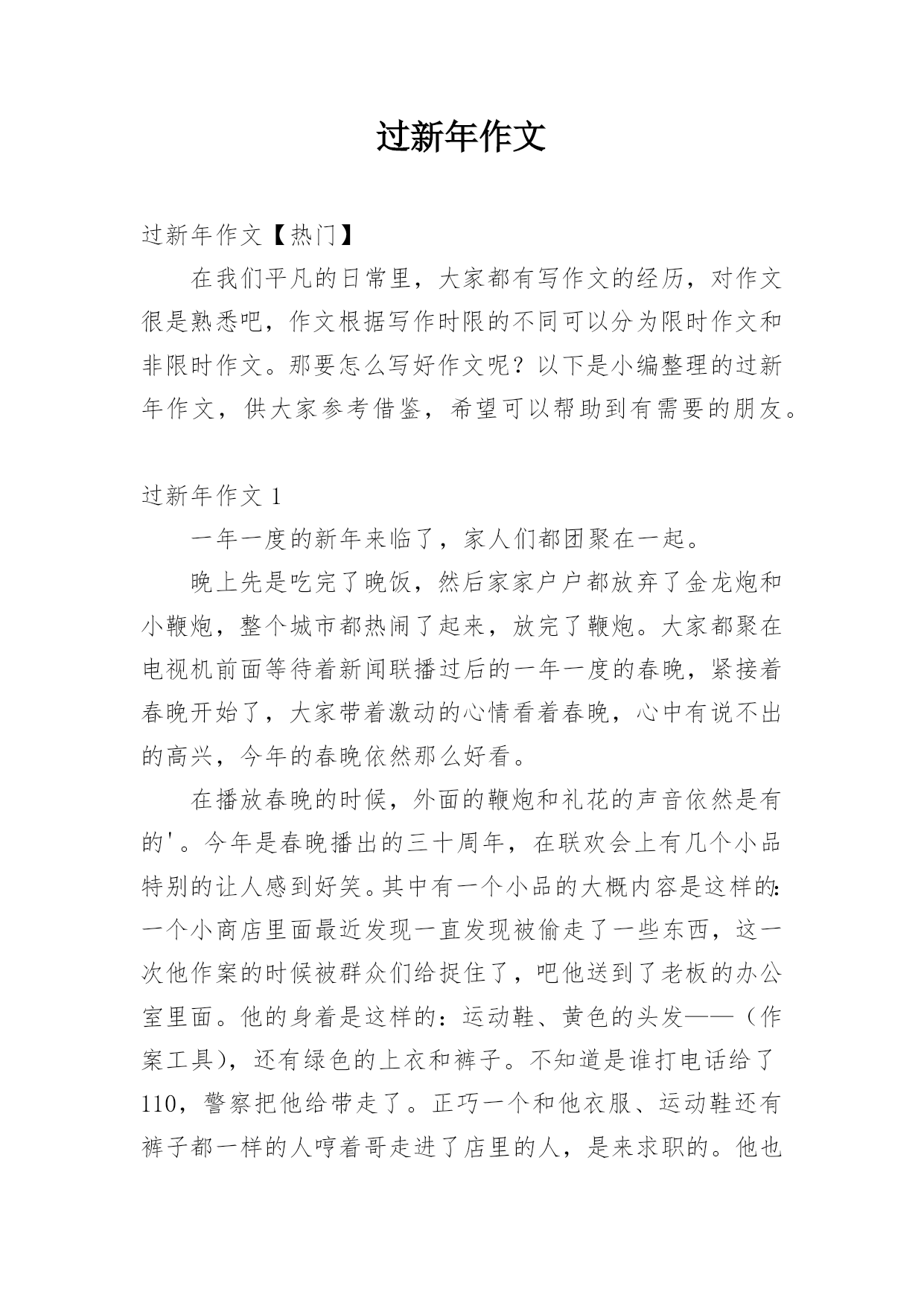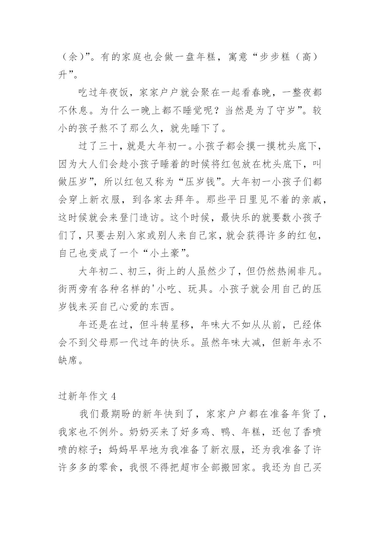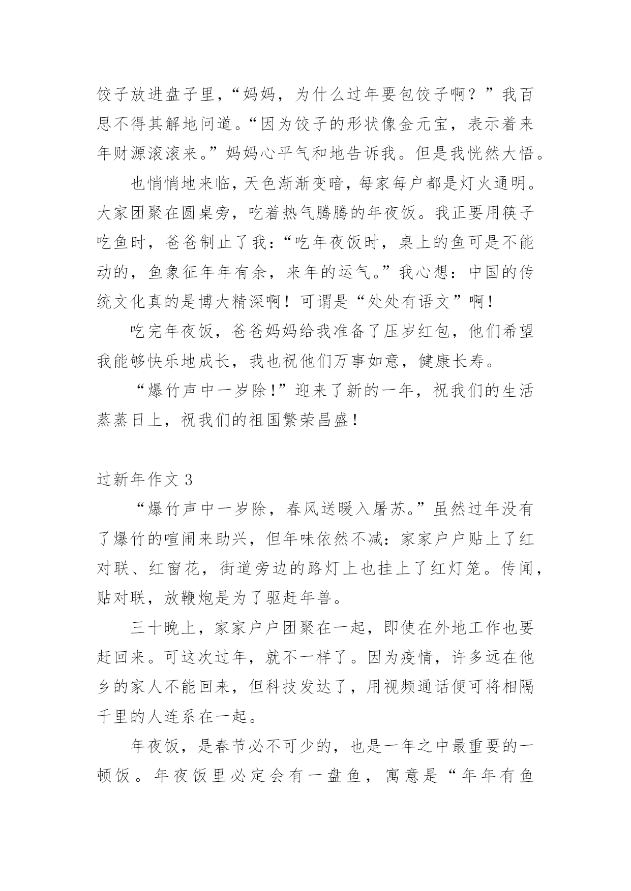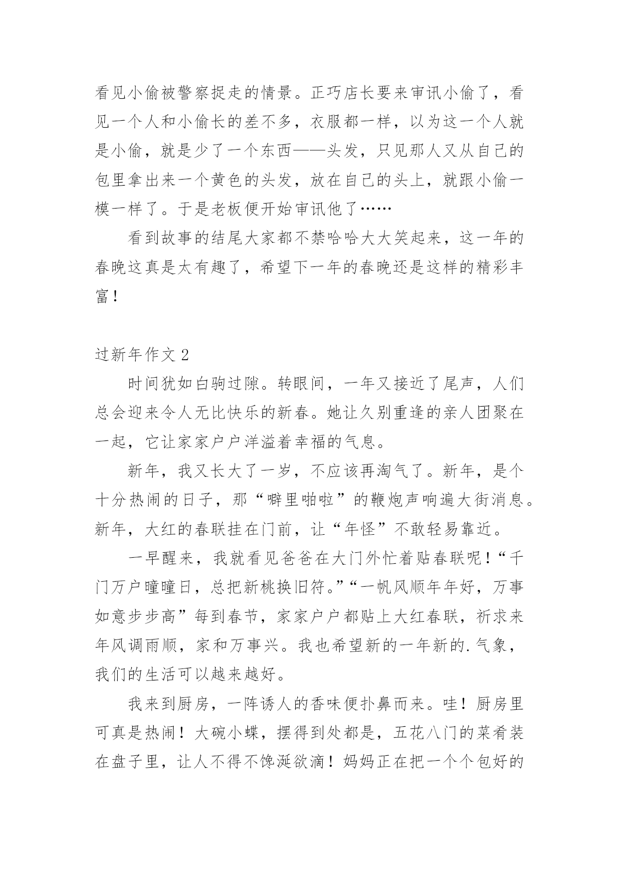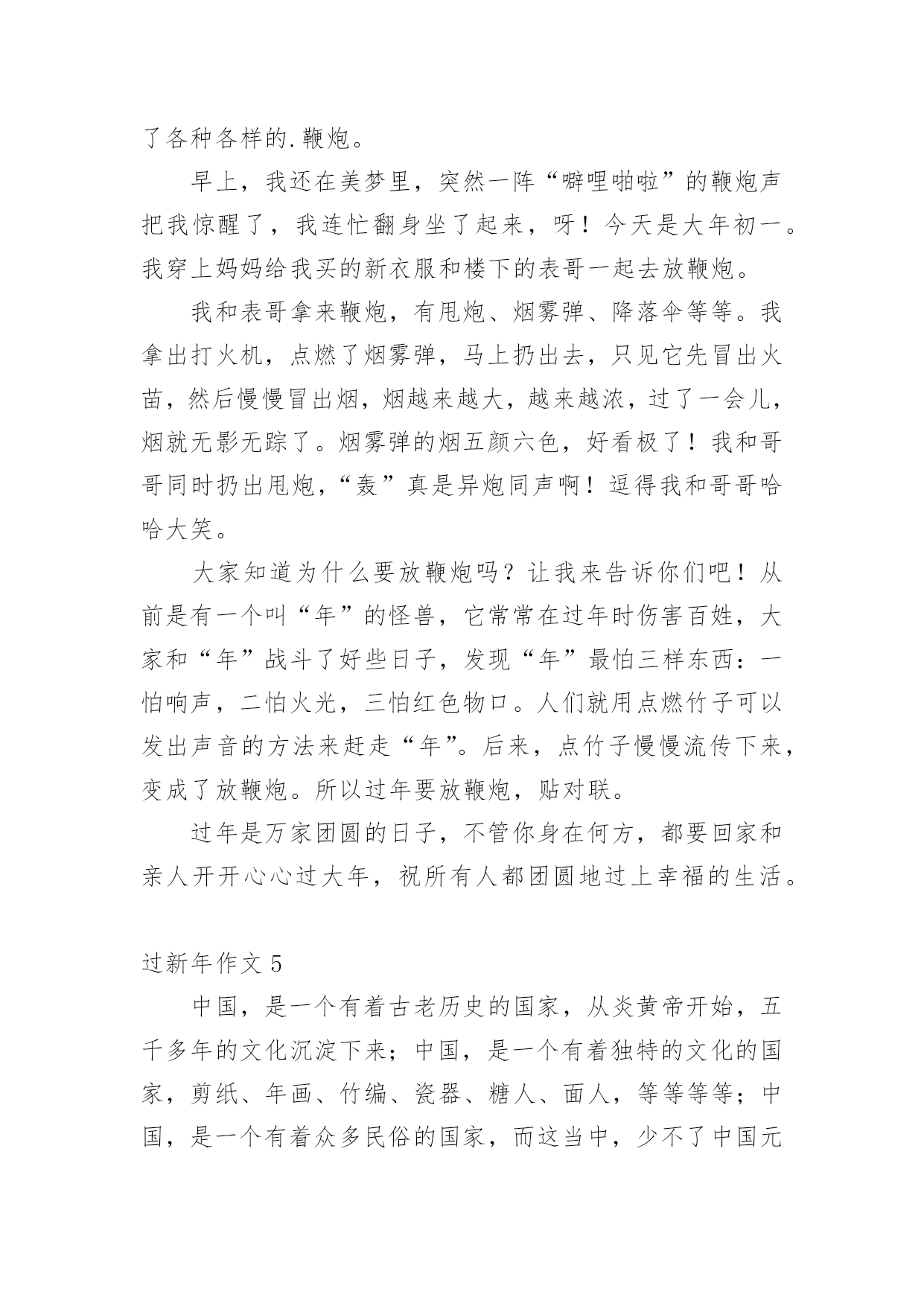 过新年作文 过新年作文【热门】在我们平凡的日常里,大家都有写作文的经历,对作文很是熟悉吧,作文根据写作时限的不同可以分为限时作文和非限时作文。那要怎么写好作文呢?以下是小编整理的过新年作文,供大家参考借鉴,希望可以帮助到有需要的朋友。过新年作文1一年一度的新年来临了,家人们都团聚在一起。晚上先是吃完了晚饭,然后家家户户都放弃了金龙炮和小鞭炮,整个城市都热闹了起来,放完了鞭炮。大家都聚在电视机前面等待着新闻联播过后的一年一度的春晚,紧接着春晚开始了,大家带着激动的心情看着春晚,心中有说不出的高兴,今年的春晚依然那么好看。在播放春晚的时候,外面的鞭炮和礼花的声音依然是有的'。今年是春晚播出的三十周年,在联欢会上有几个小品特别的让人感到好笑。其中有一个小品的大概内容是这样的:一个小商店里面最近发现一直发现被偷走了一些东西,这一次他作案的时候被群众们给捉住了,吧他送到了老板的办公室里面。他的身着是这样的:运动鞋、黄色的头发——(作案工具),还有绿色的上衣和裤子。不知道是谁打电话给了110,警察把他给带走了。正巧一个和他衣服、运动鞋还有裤子都一样的人哼着哥走进了店里的人,是来求职的。他也看见小偷被警察捉走的情景。正巧店长要来审讯小偷了,看见一个人和小偷长的差不多,衣服都一样,以为这一个人就是小偷,就是少了一个东西——头发,只见那人又从自己的包里拿出来一个黄色的头发,放在自己的头上,就跟小偷一模一样了。于是老板便开始审讯他了……看到故事的结尾大家都不禁哈哈大大笑起来,这一年的春晚这真是太有趣了,希望下一年的春晚还是这样的精彩丰富!过新年作文2时间犹如白驹过隙。转眼间,一年又接近了尾声,人们总会迎来令人无比快乐的新春。她让久别重逢的亲人团聚在一起,它让家家户户洋溢着幸福的气息。新年,我又长大了一岁,不应该再淘气了。新年,是个十分热闹的日子,那“噼里啪啦”的鞭炮声响遍大街消息。新年,大红的春联挂在门前,让“年怪”不敢轻易靠近。一早醒来,我就看见爸爸在大门外忙着贴春联呢!“千门万户曈曈日,总把新桃换旧符。”“一帆风顺年年好,万事如意步步高”每到春节,家家户户都贴上大红春联,祈求来年风调雨顺,家和万事兴。我也希望新的一年新的.气象,我们的生活可以越来越好。我来到厨房,一阵诱人的香味便扑鼻而来。哇!厨房里可真是热闹!大碗小蝶,摆得到处都是,五花八门的菜肴装在盘子里,让人不得不馋涎欲滴!妈妈正在把一个个包好的饺子放进盘子里,“妈妈,为什么过年要包饺子啊?”我百思不得其解地问道。“因为饺子的形状像金元宝,表示着来年财源滚滚来。”妈妈心平气和地告诉我。但是我恍然大悟。也悄悄地来临,天色渐渐变暗,每家每户都是灯火通明。大家团聚在圆桌旁,吃着热气腾腾的年夜饭。我正要用筷子吃鱼时,爸爸制止了我:“吃年夜饭时,桌上的鱼可是不能动的,鱼象征年年有余,来年的运气。”我心想:中国的传统文化真的是博大精深啊!可谓是“处处有语文”啊!吃完年夜饭,爸爸妈妈给我准备了压岁红包,他们希望我能够快乐地成长,我也祝他们万事如意,健康长寿。“爆竹声中一岁除!”迎来了新的一年,祝我们的生活蒸蒸日上,祝我们的祖国繁荣昌盛!过新年作文3“爆竹声中一岁除,春风送暖入屠苏。”虽然过年没有了爆竹的喧闹来助兴,但年味依然不减:家家户户贴上了红对联、红窗花,街道旁边的路灯上也挂上了红灯笼。传闻,贴对联,放鞭炮是为了驱赶年兽。三十晚上,家家户户团聚在一起,即使在外地工作也要赶回来。可这次过年,就不一样了。因为疫情,许多远在他乡的家人不能回来,但科技发达了,用视频通话便可将相隔千里的人连系在一起。年夜饭,是春节必不可少的,也是一年之中最重要的一顿饭。年夜饭里必定会有一盘鱼,寓意是“年年有鱼(余)”。有的家庭也会做一盘年糕,寓意“步步糕(高)升”。吃过年夜饭,家家户户就会聚在一起看春晚,一整夜都不休息。为什么一晚上都不睡觉呢?当然是为了守岁”。较小的孩子熬不了那么久,就先睡下了。过了三十,就是大年初一。小孩子都会摸一摸枕头底下,因为大人们会趁小孩子睡着的时候将红包放在枕头底下,叫做压岁”,所以红包又称为“压岁钱”。大年初一小孩子们都会穿上新衣服,到各家去拜年。那些平日里见不着的亲戚,这时候就会来登门造访。这个时候,最快乐的就要数小孩子们了,只要去别入家或别人来自己家,就会获得许多的红包,自己也变成了一个“小土豪”。大年初二、初三,街上的人虽然少了,但仍然热闹非凡。街两旁有各种名样的'小吃、玩具。小孩子就会用自己的压岁钱来买自己心爱的东西。年还是在过,但斗转星移,年味大不如从从前,已经体会不到父母那一代过年的快乐。虽然年味大减,但新年永不缺席。过新年作文4我们最期盼的新年快到了,家家户户都在准备年货了,我家也不例外。奶奶买来了好多鸡、鸭、年糕,还包了香喷喷的粽子;妈妈早早地为我准备了新衣服,还为我准备了许