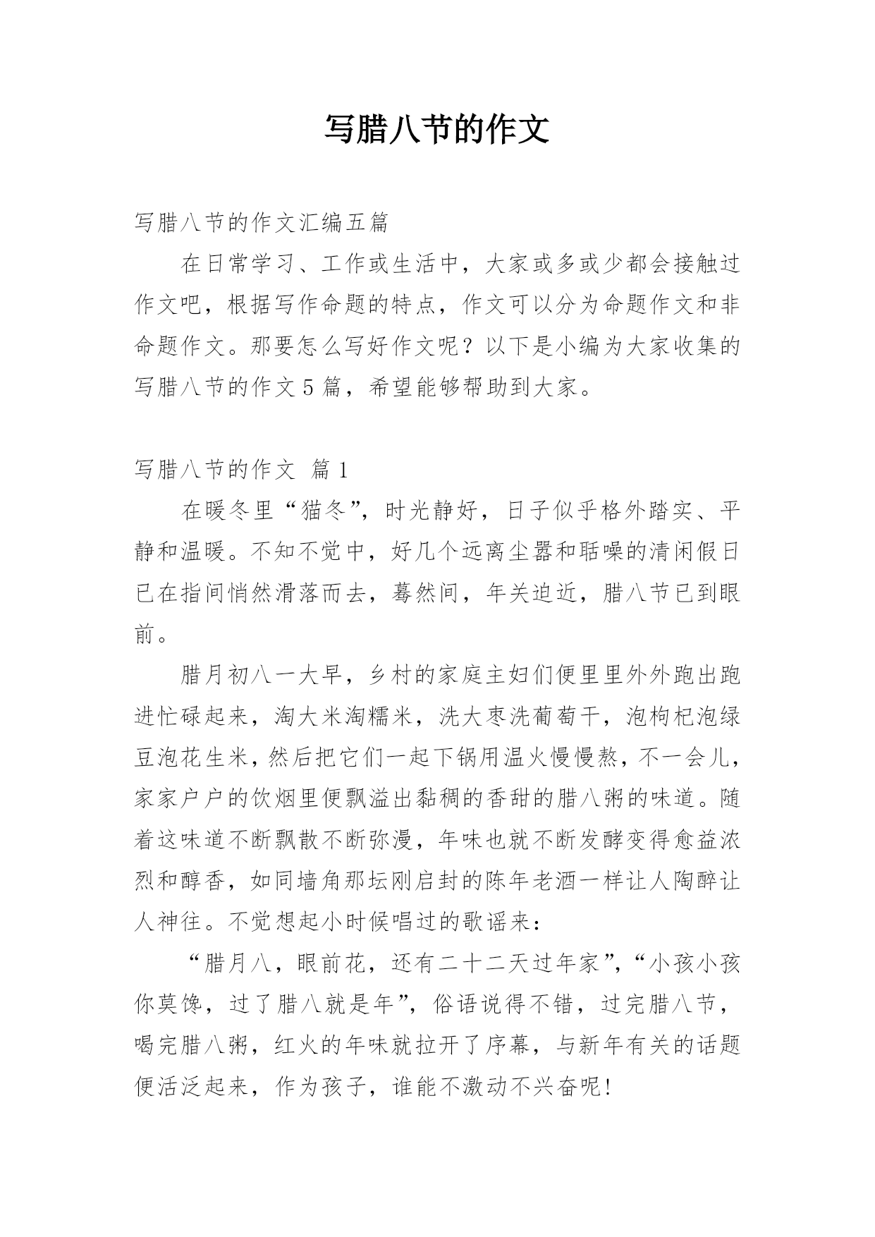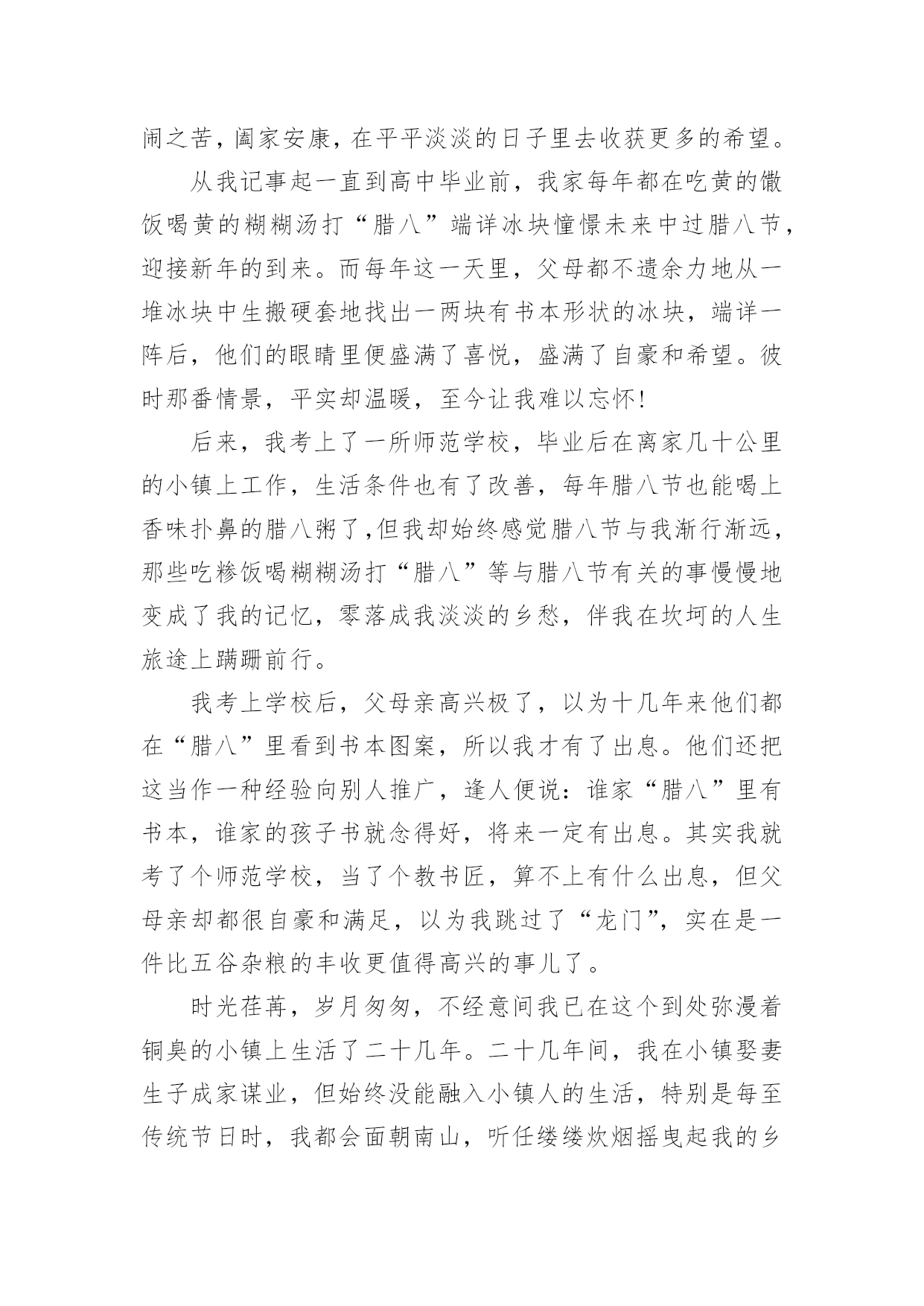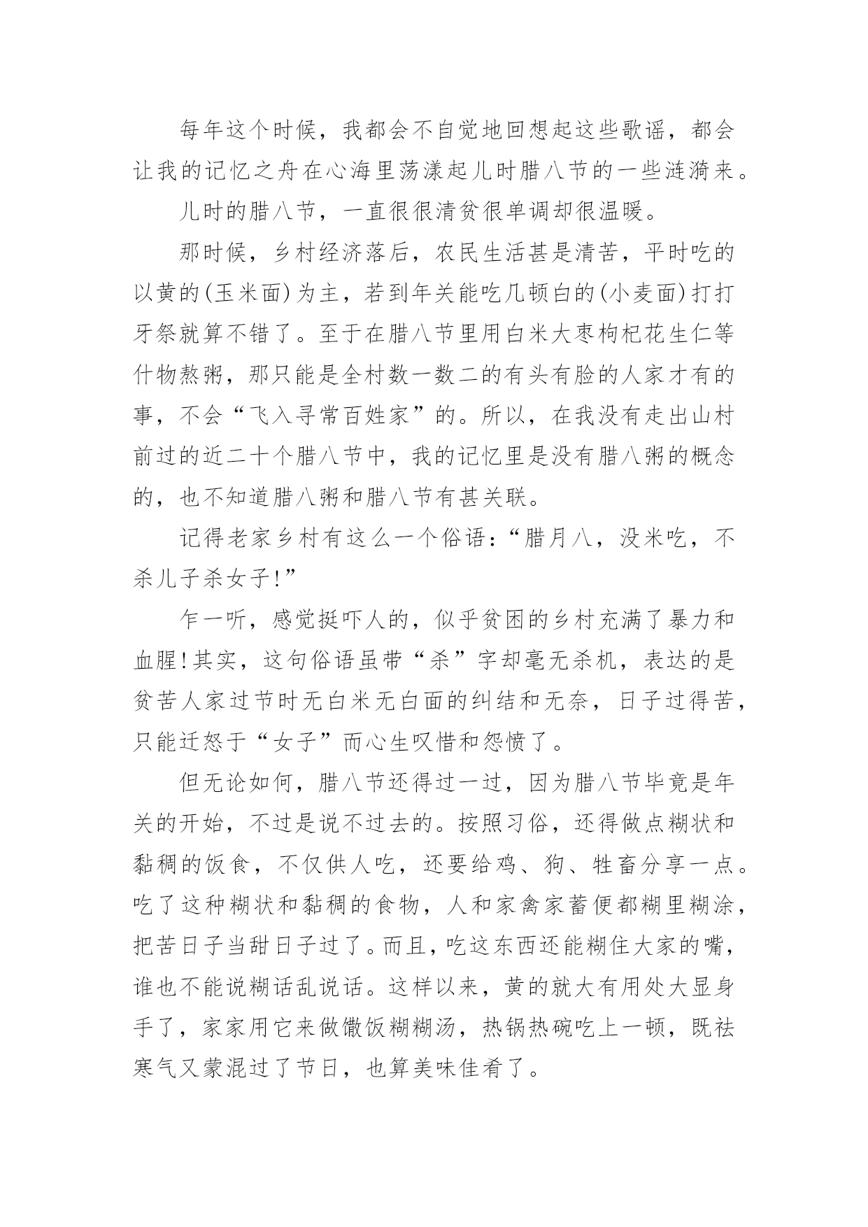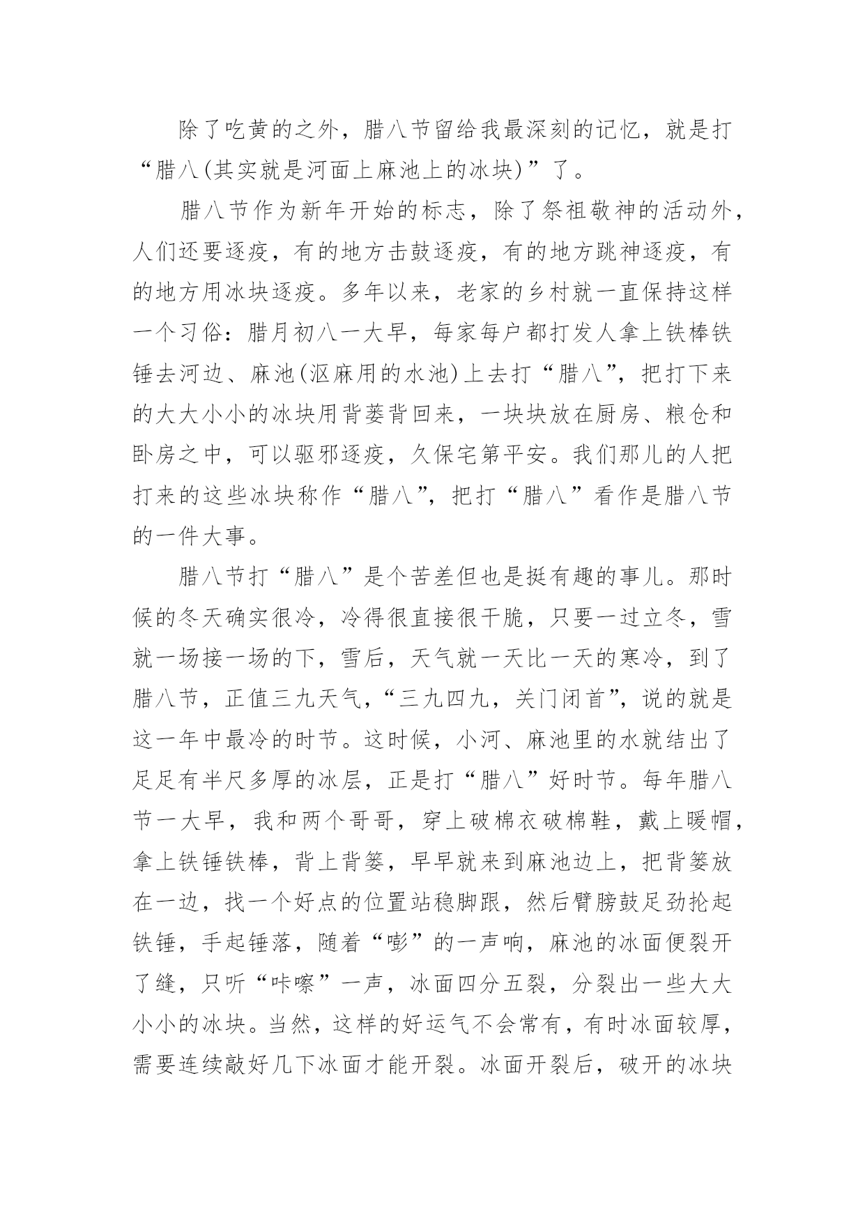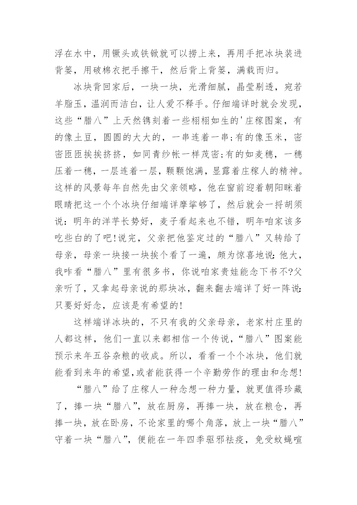 写腊八节的作文 写腊八节的作文汇编五篇在日常学习、工作或生活中,大家或多或少都会接触过作文吧,根据写作命题的特点,作文可以分为命题作文和非命题作文。那要怎么写好作文呢?以下是小编为大家收集的写腊八节的作文5篇,希望能够帮助到大家。写腊八节的作文篇1在暖冬里“猫冬”,时光静好,日子似乎格外踏实、平静和温暖。不知不觉中,好几个远离尘嚣和聒噪的清闲假日已在指间悄然滑落而去,蓦然间,年关迫近,腊八节已到眼前。腊月初八一大早,乡村的家庭主妇们便里里外外跑出跑进忙碌起来,淘大米淘糯米,洗大枣洗葡萄干,泡枸杞泡绿豆泡花生米,然后把它们一起下锅用温火慢慢熬,不一会儿,家家户户的饮烟里便飘溢出黏稠的香甜的腊八粥的味道。随着这味道不断飘散不断弥漫,年味也就不断发酵变得愈益浓烈和醇香,如同墙角那坛刚启封的陈年老酒一样让人陶醉让人神往。不觉想起小时候唱过的歌谣来:“腊月八,眼前花,还有二十二天过年家”,“小孩小孩你莫馋,过了腊八就是年”,俗语说得不错,过完腊八节,喝完腊八粥,红火的年味就拉开了序幕,与新年有关的话题便活泛起来,作为孩子,谁能不激动不兴奋呢!每年这个时候,我都会不自觉地回想起这些歌谣,都会让我的记忆之舟在心海里荡漾起儿时腊八节的一些涟漪来。儿时的腊八节,一直很很清贫很单调却很温暖。那时候,乡村经济落后,农民生活甚是清苦,平时吃的以黄的(玉米面)为主,若到年关能吃几顿白的(小麦面)打打牙祭就算不错了。至于在腊八节里用白米大枣枸杞花生仁等什物熬粥,那只能是全村数一数二的有头有脸的人家才有的事,不会“飞入寻常百姓家”的。所以,在我没有走出山村前过的近二十个腊八节中,我的记忆里是没有腊八粥的概念的,也不知道腊八粥和腊八节有甚关联。记得老家乡村有这么一个俗语:“腊月八,没米吃,不杀儿子杀女子!”乍一听,感觉挺吓人的,似乎贫困的乡村充满了暴力和血腥!其实,这句俗语虽带“杀”字却毫无杀机,表达的是贫苦人家过节时无白米无白面的纠结和无奈,日子过得苦,只能迁怒于“女子”而心生叹惜和怨愤了。但无论如何,腊八节还得过一过,因为腊八节毕竟是年关的开始,不过是说不过去的。按照习俗,还得做点糊状和黏稠的饭食,不仅供人吃,还要给鸡、狗、牲畜分享一点。吃了这种糊状和黏稠的食物,人和家禽家蓄便都糊里糊涂,把苦日子当甜日子过了。而且,吃这东西还能糊住大家的嘴,谁也不能说糊话乱说话。这样以来,黄的就大有用处大显身手了,家家用它来做馓饭糊糊汤,热锅热碗吃上一顿,既祛寒气又蒙混过了节日,也算美味佳肴了。除了吃黄的之外,腊八节留给我最深刻的记忆,就是打“腊八(其实就是河面上麻池上的冰块)”了。腊八节作为新年开始的标志,除了祭祖敬神的活动外,人们还要逐疫,有的地方击鼓逐疫,有的地方跳神逐疫,有的地方用冰块逐疫。多年以来,老家的乡村就一直保持这样一个习俗:腊月初八一大早,每家每户都打发人拿上铁棒铁锤去河边、麻池(沤麻用的水池)上去打“腊八”,把打下来的大大小小的冰块用背蒌背回来,一块块放在厨房、粮仓和卧房之中,可以驱邪逐疫,久保宅第平安。我们那儿的人把打来的这些冰块称作“腊八”,把打“腊八”看作是腊八节的一件大事。腊八节打“腊八”是个苦差但也是挺有趣的事儿。那时候的冬天确实很冷,冷得很直接很干脆,只要一过立冬,雪就一场接一场的下,雪后,天气就一天比一天的寒冷,到了腊八节,正值三九天气,“三九四九,关门闭首”,说的就是这一年中最冷的时节。这时候,小河、麻池里的水就结出了足足有半尺多厚的冰层,正是打“腊八”好时节。每年腊八节一大早,我和两个哥哥,穿上破棉衣破棉鞋,戴上暖帽,拿上铁锤铁棒,背上背篓,早早就来到麻池边上,把背篓放在一边,找一个好点的位置站稳脚跟,然后臂膀鼓足劲抡起铁锤,手起锤落,随着“嘭”的一声响,麻池的冰面便裂开了缝,只听“咔嚓”一声,冰面四分五裂,分裂出一些大大小小的冰块。当然,这样的好运气不会常有,有时冰面较厚,需要连续敲好几下冰面才能开裂。冰面开裂后,破开的冰块浮在水中,用镢头或铁锨就可以捞上来,再用手把冰块装进背篓,用破棉衣把手擦干,然后背上背篓,满载而归。冰块背回家后,一块一块,光滑细腻,晶莹剔透,宛若羊脂玉,温润而洁白,让人爱不释手。仔细端详时就会发现,这些“腊八”上天然镌刻着一些栩栩如生的'庄稼图案,有的像土豆,圆圆的大大的,一串连着一串;有的像玉米,密密匝匝挨挨挤挤,如同青纱帐一样茂密;有的如麦穗,一穗压着一穗,一层连着一层,颗颗饱满,显露着庄稼人的精神。这样的风景每年自然先由父亲领略,他在窗前迎着朝阳眯着眼睛把这一个个冰块仔细端详摩挲够了,然后就会一捋胡须说:明年的洋芋长势好,麦子看起来也不错,明年咱家该多吃些白的了吧!说完,父亲把他鉴定过的“腊八”又转给了母亲,母亲一块接一块挨个看了一遍,颇为惊喜地说:他大,我咋看“腊八”里有很多书,你说咱家贵娃能念下