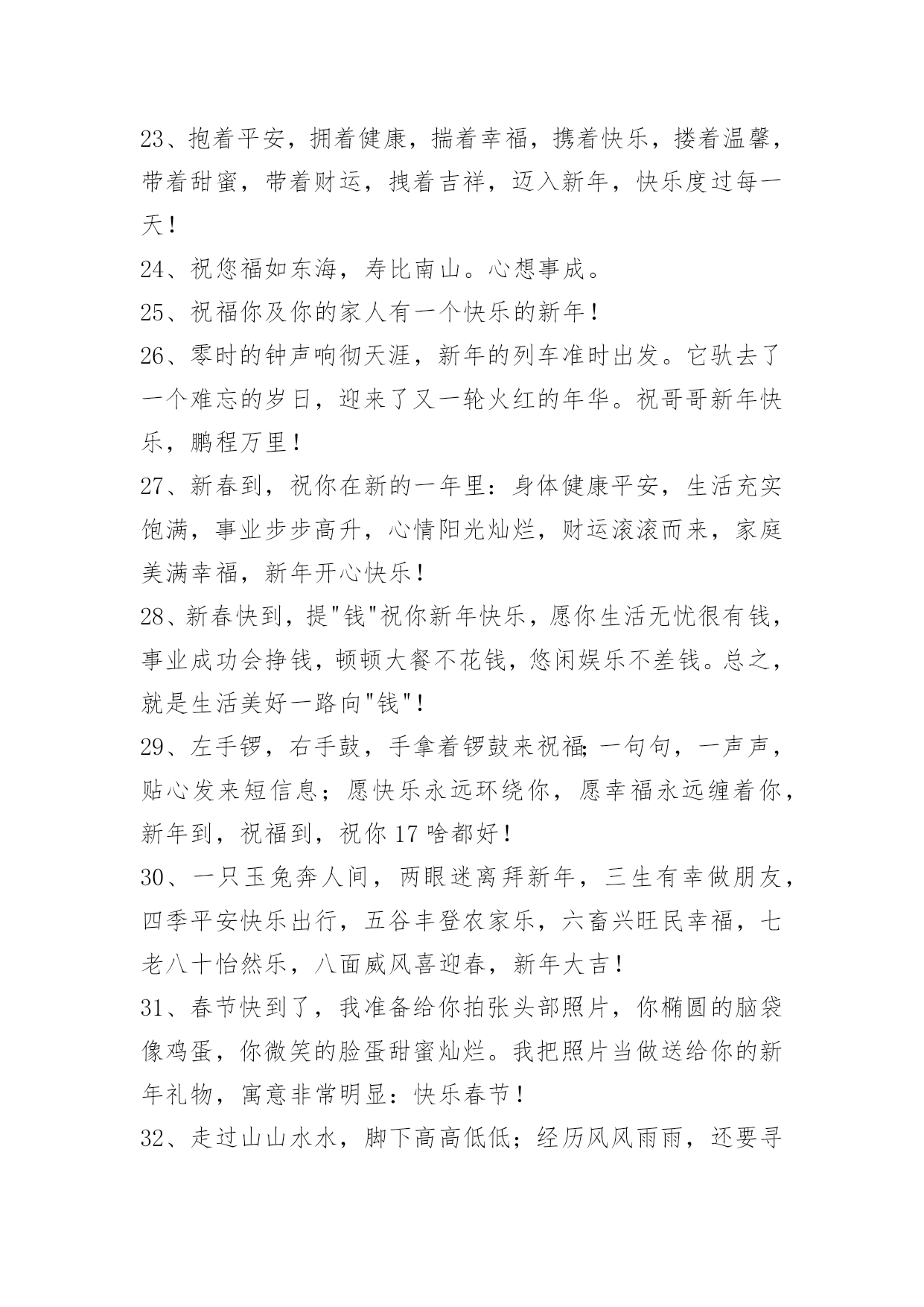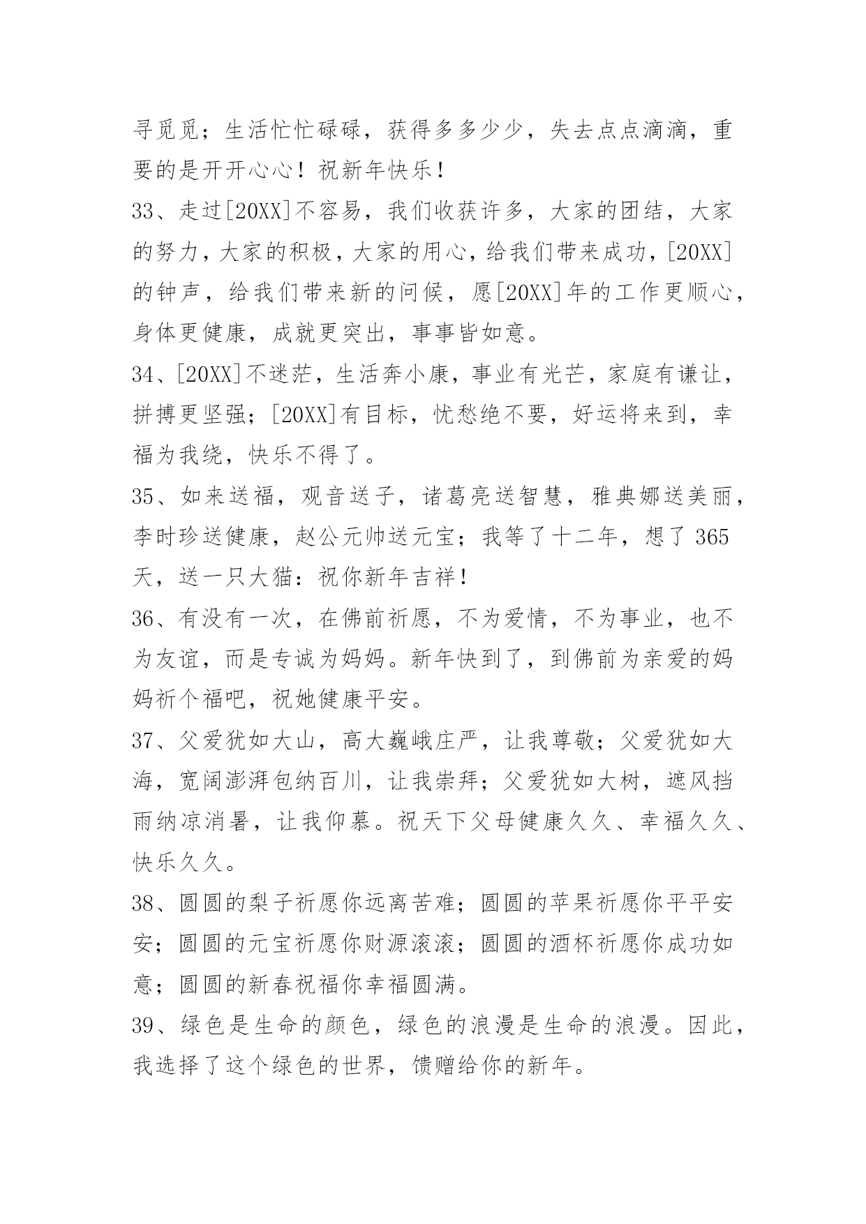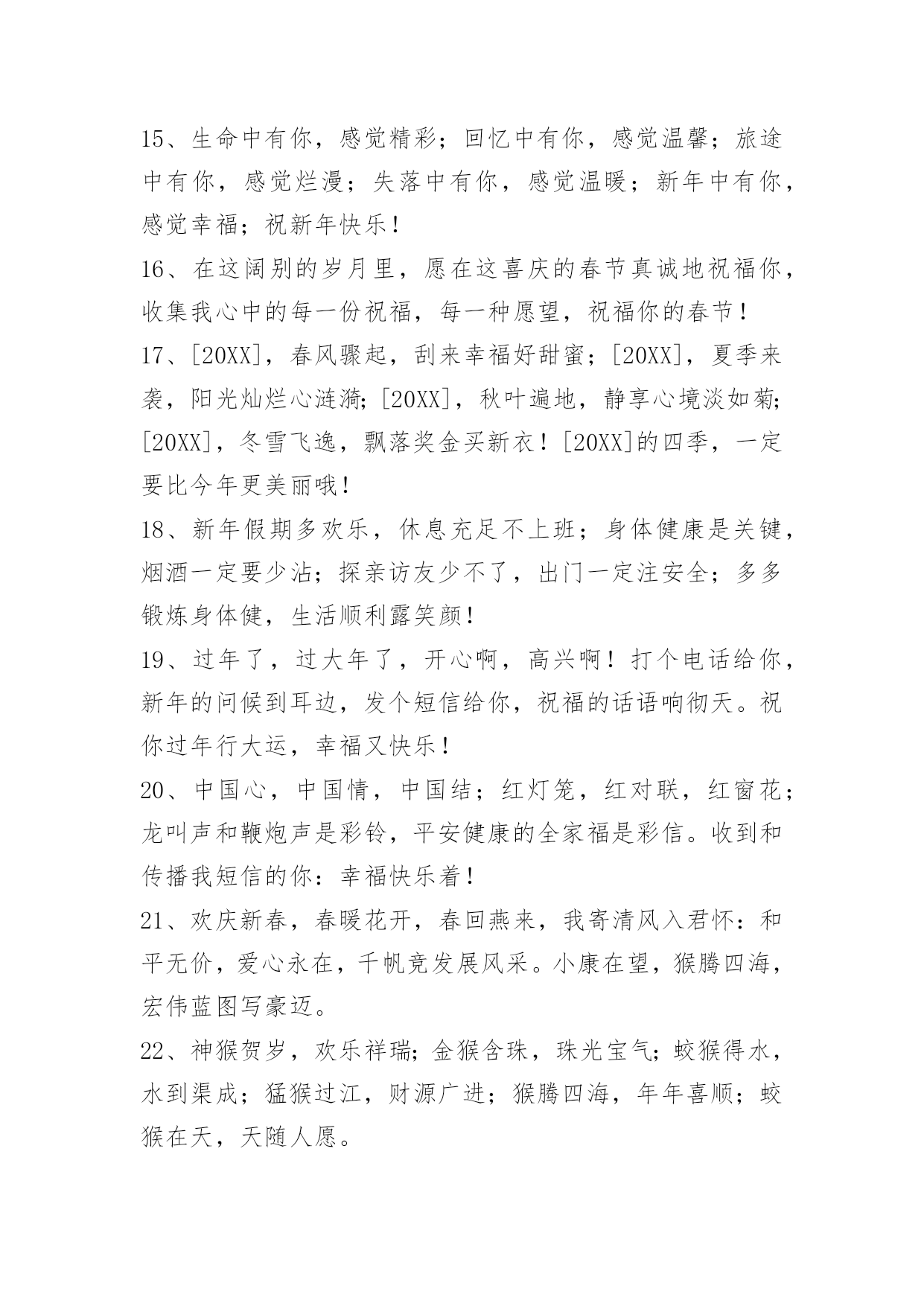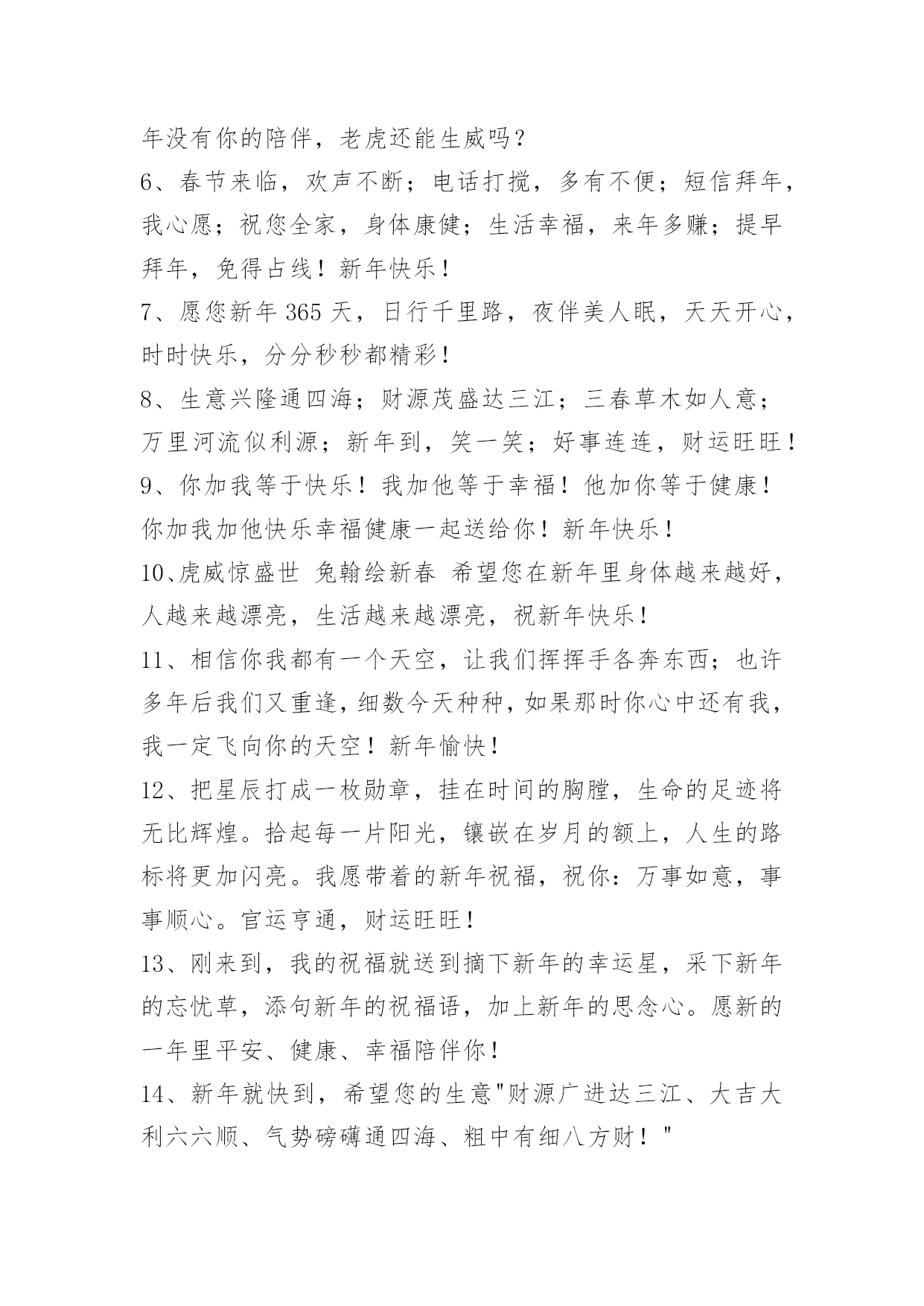 新年问候语 常用新年问候语130句[20新年问候语]年的最后一天,为自己画一幅画像,画上一年的得失,画上一年的成败,画上一年的忧喜,画上一年的悲欢。然后,逐一修改,期待来年,收获多多,成就多多,喜事多多,幸福多多!以下这篇文章是小编整理的新年问候语,供大家参考借鉴,希望可以帮助到有需要的朋友。1、又是一年新春到,又是一年新开始。没有华丽的语言,也没有精美的礼物,只有一句真诚的祝福送与你:新年快乐,吉祥如意!2、自信来源于成功的暗示;自卑来源于失败的暗示。如果你有自信,它会在无形之中释放出能量,推动你走向成功;如果你自卑或恐惧,它也会在无形之中释放出能量,导致你走向失败。[20XX]你好!3、当鸟儿倦了的时候,它会选择飞回巢穴,当人儿累的时候,他会选择回到家里,卸去疲惫的伪装,放松自己心情,原来生活是这样的美好,再见了[20XX]年,[20XX]年你好,朋友!4、我是一个大方的人,别人就只祝你新年快乐,我除了祝你新年快乐,还要祝你新春幸福!新春好运!新春发财!新春健康!新春平安!新春如意!5、每一次考试我就想你,每一次上街我就想你,没了你谁给我答案;没了你谁能无私的掏口袋!现在我更想你了,新年没有你的陪伴,老虎还能生威吗?6、春节来临,欢声不断;电话打搅,多有不便;短信拜年,我心愿;祝您全家,身体康健;生活幸福,来年多赚;提早拜年,免得占线!新年快乐!7、愿您新年365天,日行千里路,夜伴美人眠,天天开心,时时快乐,分分秒秒都精彩!8、生意兴隆通四海;财源茂盛达三江;三春草木如人意;万里河流似利源;新年到,笑一笑;好事连连,财运旺旺!9、你加我等于快乐!我加他等于幸福!他加你等于健康!你加我加他快乐幸福健康一起送给你!新年快乐!10、虎威惊盛世兔翰绘新春希望您在新年里身体越来越好,人越来越漂亮,生活越来越漂亮,祝新年快乐!11、相信你我都有一个天空,让我们挥挥手各奔东西;也许多年后我们又重逢,细数今天种种,如果那时你心中还有我,我一定飞向你的天空!新年愉快!12、把星辰打成一枚勋章,挂在时间的胸膛,生命的足迹将无比辉煌。拾起每一片阳光,镶嵌在岁月的额上,人生的路标将更加闪亮。我愿带着的新年祝福,祝你:万事如意,事事顺心。官运亨通,财运旺旺!13、刚来到,我的祝福就送到摘下新年的幸运星,采下新年的忘忧草,添句新年的祝福语,加上新年的思念心。愿新的一年里平安、健康、幸福陪伴你!14、新年就快到,希望您的生意"财源广进达三江、大吉大利六六顺、气势磅礴通四海、粗中有细八方财!"15、生命中有你,感觉精彩;回忆中有你,感觉温馨;旅途中有你,感觉烂漫;失落中有你,感觉温暖;新年中有你,感觉幸福;祝新年快乐!16、在这阔别的岁月里,愿在这喜庆的春节真诚地祝福你,收集我心中的每一份祝福,每一种愿望,祝福你的春节!17、[20XX],春风骤起,刮来幸福好甜蜜;[20XX],夏季来袭,阳光灿烂心涟漪;[20XX],秋叶遍地,静享心境淡如菊;[20XX],冬雪飞逸,飘落奖金买新衣![20XX]的四季,一定要比今年更美丽哦!18、新年假期多欢乐,休息充足不上班;身体健康是关键,烟酒一定要少沾;探亲访友少不了,出门一定注安全;多多锻炼身体健,生活顺利露笑颜!19、过年了,过大年了,开心啊,高兴啊!打个电话给你,新年的问候到耳边,发个短信给你,祝福的话语响彻天。祝你过年行大运,幸福又快乐!20、中国心,中国情,中国结;红灯笼,红对联,红窗花;龙叫声和鞭炮声是彩铃,平安健康的全家福是彩信。收到和传播我短信的你:幸福快乐着!21、欢庆新春,春暖花开,春回燕来,我寄清风入君怀:和平无价,爱心永在,千帆竞发展风采。小康在望,猴腾四海,宏伟蓝图写豪迈。22、神猴贺岁,欢乐祥瑞;金猴含珠,珠光宝气;蛟猴得水,水到渠成;猛猴过江,财源广进;猴腾四海,年年喜顺;蛟猴在天,天随人愿。23、抱着平安,拥着健康,揣着幸福,携着快乐,搂着温馨,带着甜蜜,带着财运,拽着吉祥,迈入新年,快乐度过每一天!24、祝您福如东海,寿比南山。心想事成。25、祝福你及你的家人有一个快乐的新年!26、零时的钟声响彻天涯,新年的列车准时出发。它驮去了一个难忘的岁日,迎来了又一轮火红的年华。祝哥哥新年快乐,鹏程万里!27、新春到,祝你在新的一年里:身体健康平安,生活充实饱满,事业步步高升,心情阳光灿烂,财运滚滚而来,家庭美满幸福,新年开心快乐!28、新春快到,提"钱"祝你新年快乐,愿你生活无忧很有钱,事业成功会挣钱,顿顿大餐不花钱,悠闲娱乐不差钱。总之,就是生活美好一路向"钱"!29、左手锣,右手鼓,手拿着锣鼓来祝福;一句句,一声声,贴心发来短信息;愿快乐永远环绕你,愿幸福永远缠着你,新年到,祝福到,祝你17啥都好!30、一只玉兔奔人间,两眼迷离拜新年,三生有幸做朋友,四季平安快乐出行,五谷丰登农家