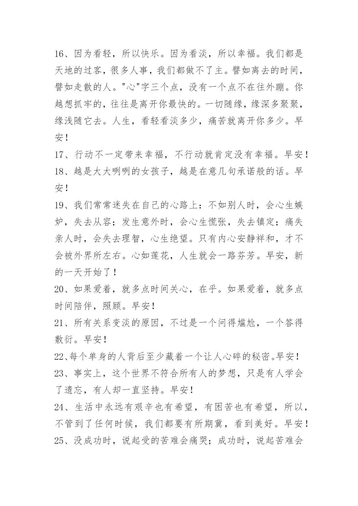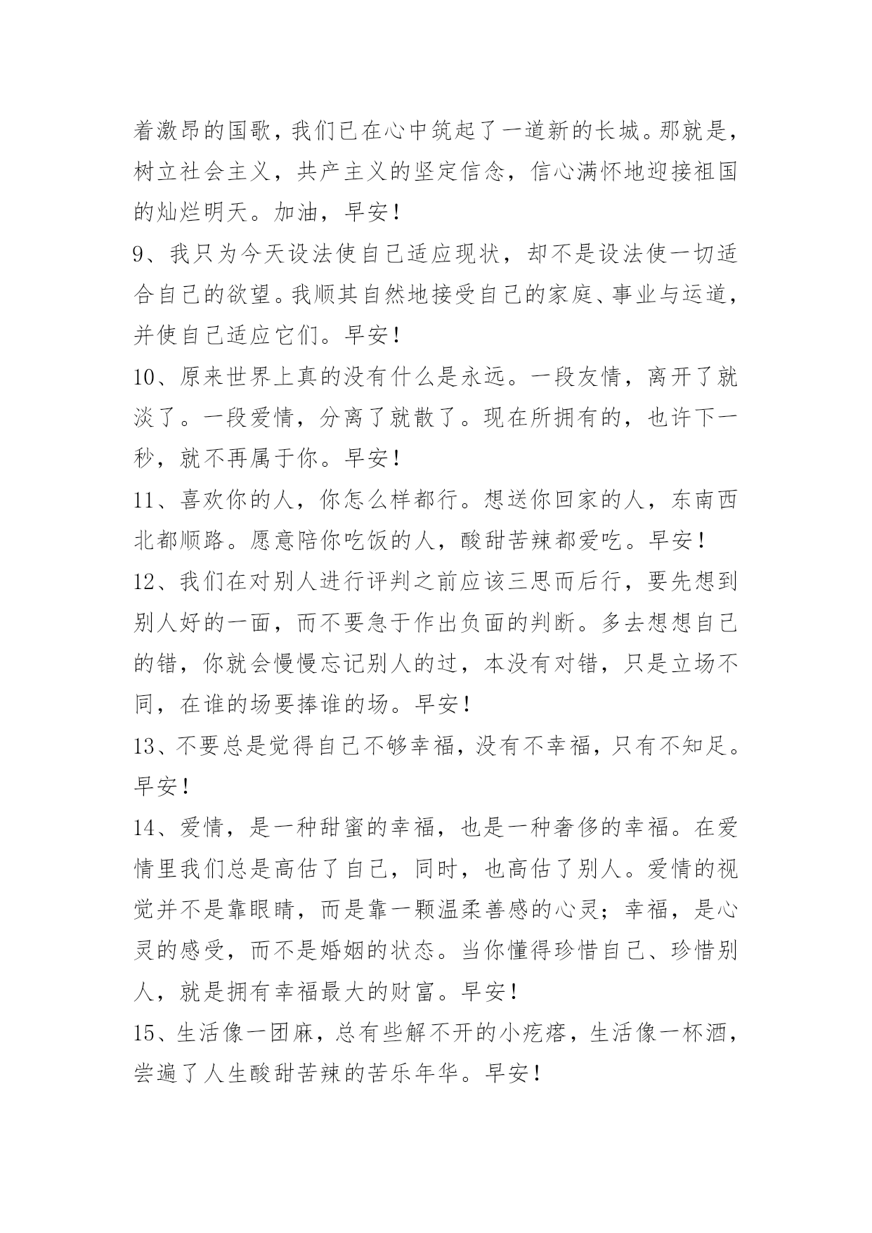 新版早安问候语短信25条 【热门】新版早安问候语短信25条只要内心不乱,那么外界就是很难去改变你什么。不要艳羡他人,不要输掉自己。早安!以下是小编为大家整理推荐的新版早安问候语25条,一起来欣赏吧。1、终于为那一身江南烟雨覆了天下,容华谢后,不过一场,山河永寂。早安!2、时间久了,才发现很多该做的事都没做;时间久了,才发现很多该说的话都没说;时间久了,才发现很多该爱的人都没爱;时间久了,才发现很多该忘的情都没忘;时间久了,才发现已经忘记了原来的自己是怎么样的。早安!3、成功从来都不是偶然的,要明白自己想要的与不想要的,一步一个脚印,沿着内心选择的方向努力前行。早安!4、职是树,责是根,没有根,树则枯;只要职,不要责,名不符,职不存;不同职,不同责,在其职,尽其责。早安!5、有缘可相见,有分可再见。早安!6、进出一扇门的时候记得停一小会,帮后面的人把门开着。早安!7、上游,是勇士噼风破浪的终点,下游,是懦夫一帆风顺的归宿。早安!8、跨入新世纪的中国,焕发出勃勃生机,三峡工程的改造,西部大开发的实施,载人宇宙飞船的成功升空,都预示着新中国有一个更广阔的前景。今天我们凝望着五星红旗,倾听着激昂的国歌,我们已在心中筑起了一道新的长城。那就是,树立社会主义,共产主义的坚定信念,信心满怀地迎接祖国的灿烂明天。加油,早安!9、我只为今天设法使自己适应现状,却不是设法使一切适合自己的欲望。我顺其自然地接受自己的家庭、事业与运道,并使自己适应它们。早安!10、原来世界上真的没有什么是永远。一段友情,离开了就淡了。一段爱情,分离了就散了。现在所拥有的,也许下一秒,就不再属于你。早安!11、喜欢你的人,你怎么样都行。想送你回家的人,东南西北都顺路。愿意陪你吃饭的人,酸甜苦辣都爱吃。早安!12、我们在对别人进行评判之前应该三思而后行,要先想到别人好的一面,而不要急于作出负面的判断。多去想想自己的错,你就会慢慢忘记别人的过,本没有对错,只是立场不同,在谁的场要捧谁的场。早安!13、不要总是觉得自己不够幸福,没有不幸福,只有不知足。早安!14、爱情,是一种甜蜜的幸福,也是一种奢侈的幸福。在爱情里我们总是高估了自己,同时,也高估了别人。爱情的视觉并不是靠眼睛,而是靠一颗温柔善感的心灵;幸福,是心灵的感受,而不是婚姻的状态。当你懂得珍惜自己、珍惜别人,就是拥有幸福最大的财富。早安!15、生活像一团麻,总有些解不开的小疙瘩,生活像一杯酒,尝遍了人生酸甜苦辣的苦乐年华。早安!16、因为看轻,所以快乐。因为看淡,所以幸福。我们都是天地的过客,很多人事,我们都做不了主。譬如离去的时间,譬如走散的人。"心"字三个点,没有一个点不在往外蹦。你越想抓牢的,往往是离开你最快的。一切随缘,缘深多聚聚,缘浅随它去。人生,看轻看淡多少,痛苦就离开你多少。早安!17、行动不一定带来幸福,不行动就肯定没有幸福。早安!18、越是大大咧咧的女孩子,越是在意几句承诺般的话。早安!19、我们常常迷失在自己的心路上:不如别人时,会心生嫉妒,失去从容;发生意外时,会心生慌张,失去镇定;痛失亲人时,会失去理智,心生绝望。只有内心安静祥和,才不会被外界所左右。心如莲花,人生就会一路芬芳。早安,新的一天开始了!20、如果爱着,就多点时间关心,在乎。如果爱着,就多点时间陪伴,照顾。早安!21、所有关系变淡的原因,不过是一个问得尴尬,一个答得敷衍。早安!22、每个单身的人背后至少藏着一个让人心碎的秘密。早安!23、事实上,这个世界不符合所有人的梦想,只是有人学会了遗忘,有人却一直坚持。早安!24、生活中永远有艰辛也有希望,有困苦也有希望,所以,不管到了任何时候,我们都要有所期冀,看到美好。早安!25、没成功时,说起受的苦难会痛哭;成功时,说起苦难会欣慰激昂。年轻时,经历少一点痛苦都委屈地大哭;中年时痛苦经历多了,说着说着就笑了;老年时,痛苦也不觉得是痛苦了。其实,真正的大痛是说不出来的,连呜咽都不会有,已经沉滞在心的深处。早安!