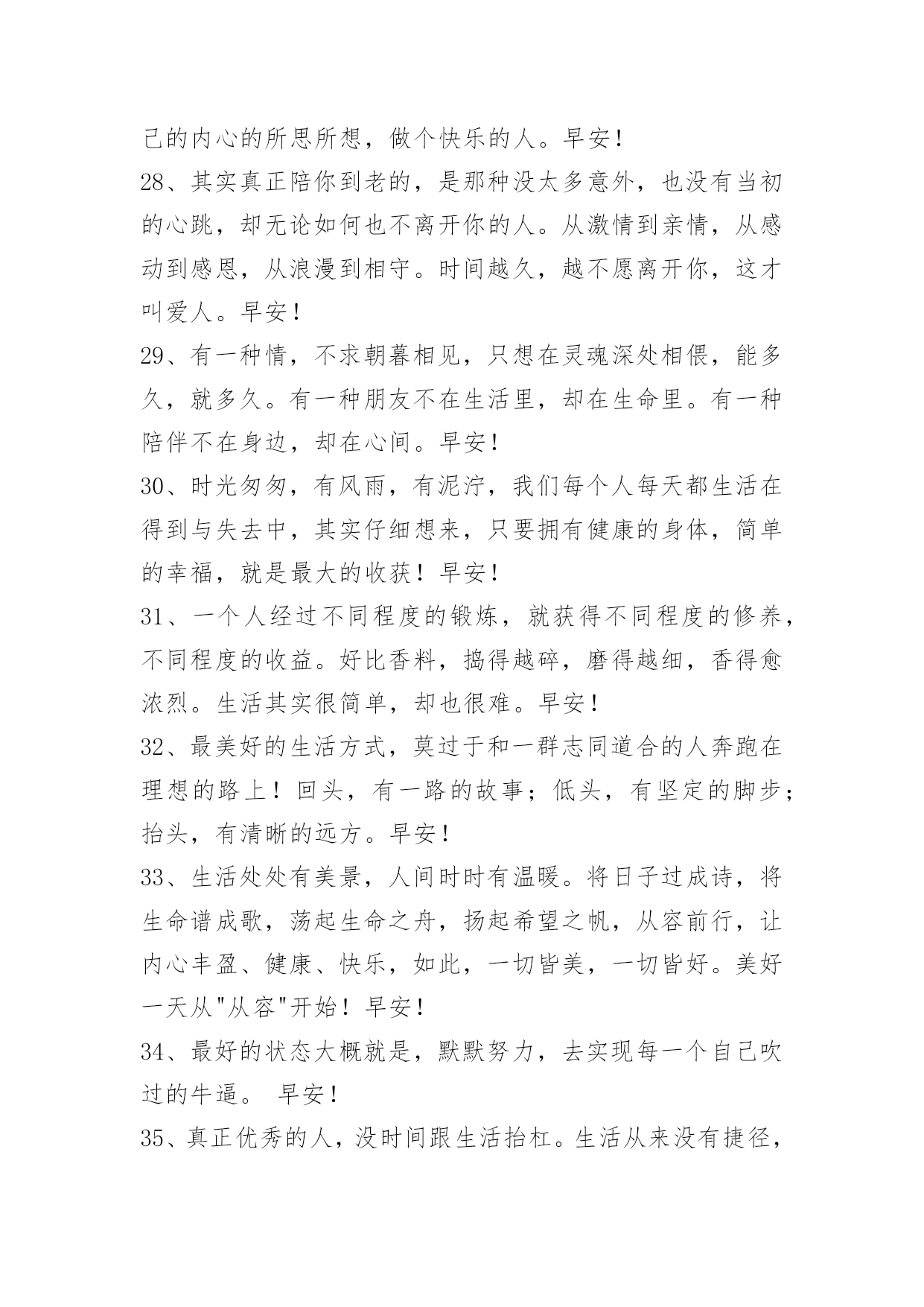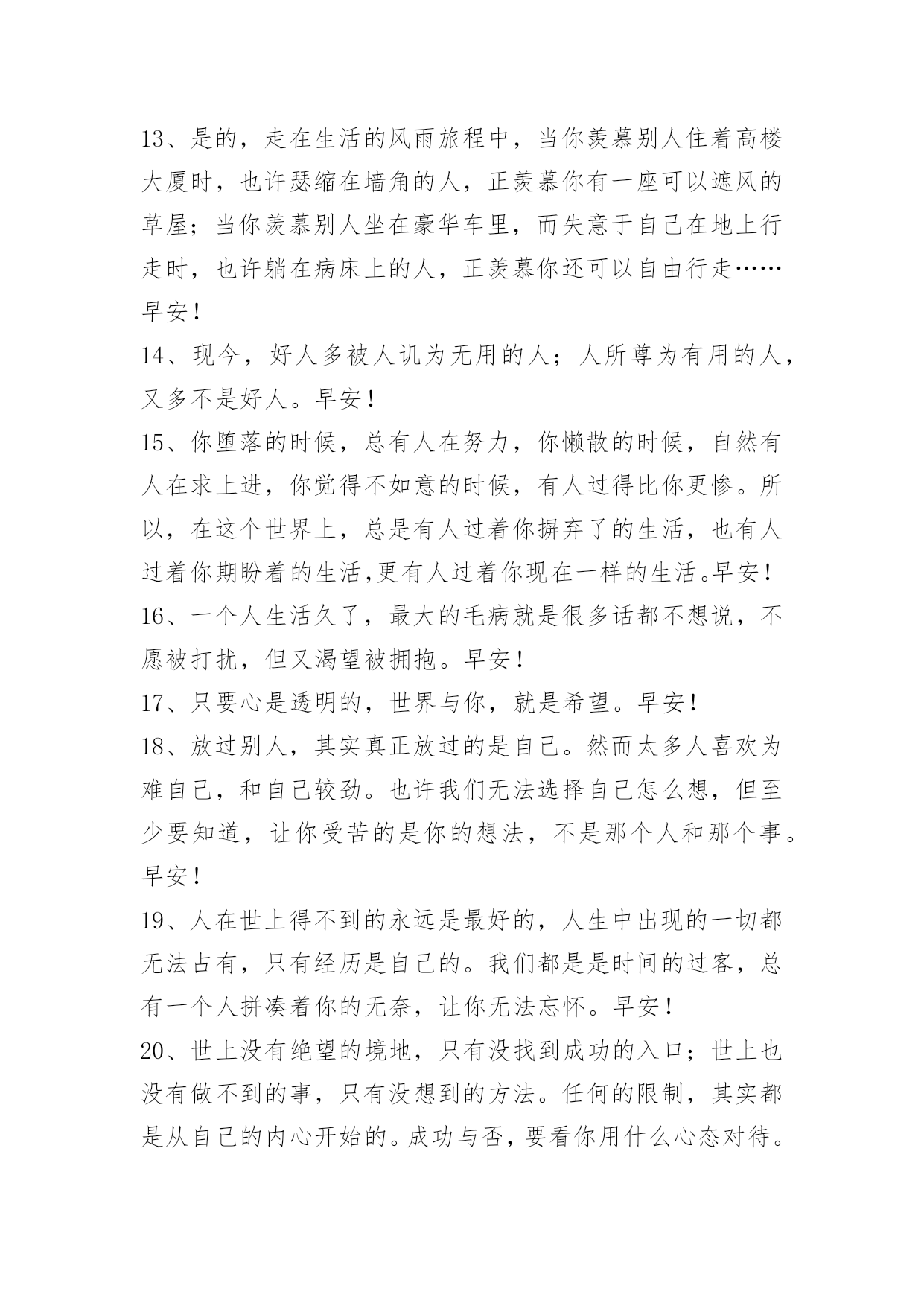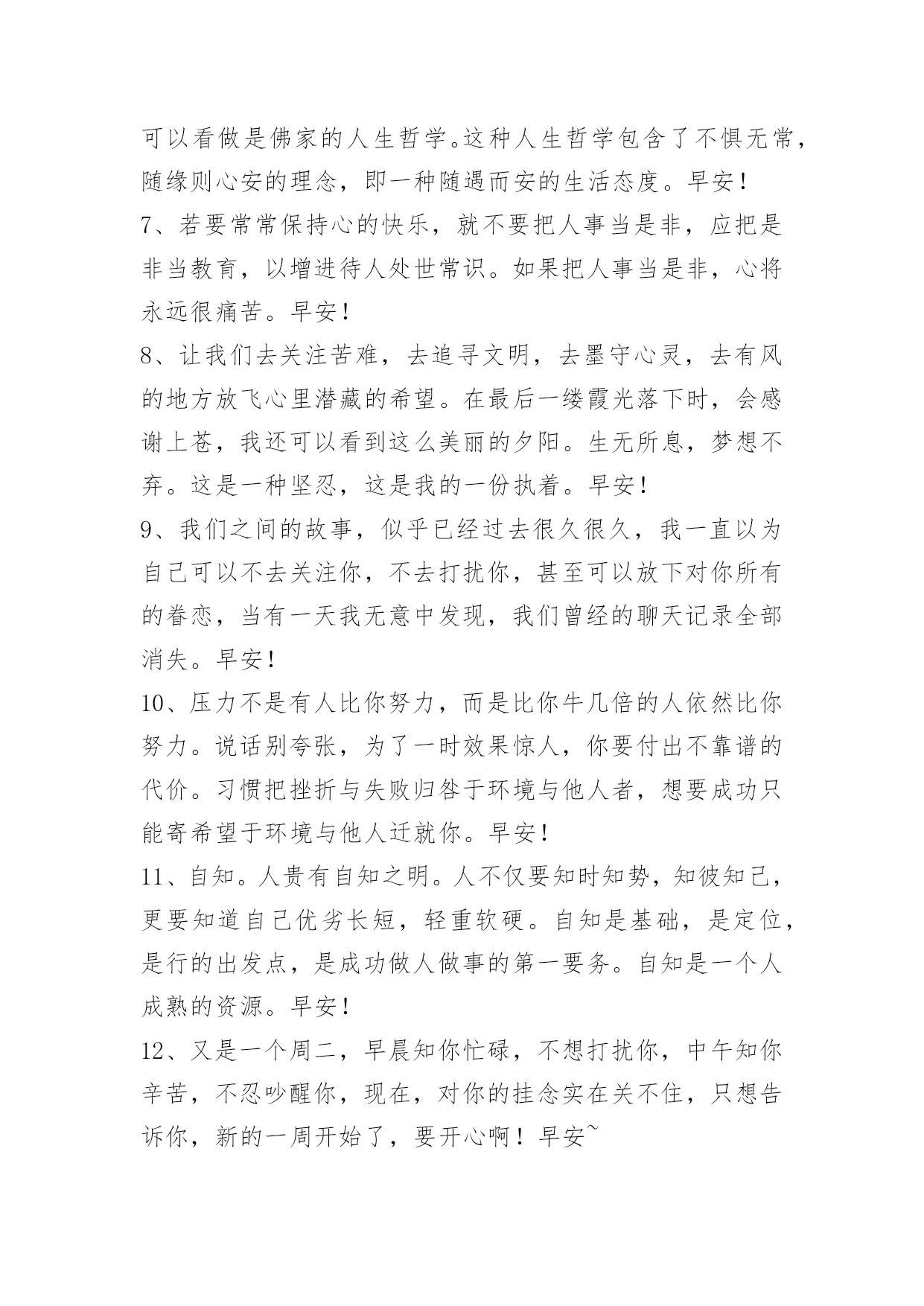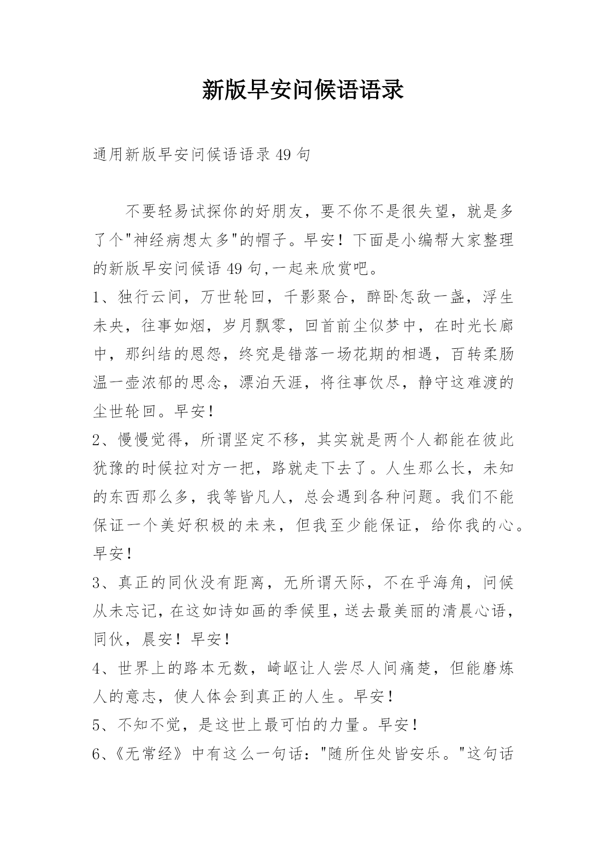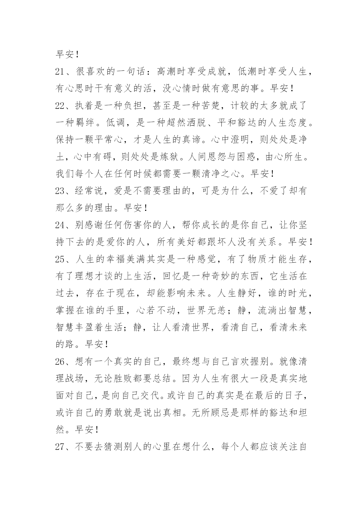 新版早安问候语语录 通用新版早安问候语语录49句不要轻易试探你的好朋友,要不你不是很失望,就是多了个"神经病想太多"的帽子。早安!下面是小编帮大家整理的新版早安问候语49句,一起来欣赏吧。1、独行云间,万世轮回,千影聚合,醉卧怎敌一盏,浮生未央,往事如烟,岁月飘零,回首前尘似梦中,在时光长廊中,那纠结的恩怨,终究是错落一场花期的相遇,百转柔肠温一壶浓郁的思念,漂泊天涯,将往事饮尽,静守这难渡的尘世轮回。早安!2、慢慢觉得,所谓坚定不移,其实就是两个人都能在彼此犹豫的时候拉对方一把,路就走下去了。人生那么长,未知的东西那么多,我等皆凡人,总会遇到各种问题。我们不能保证一个美好积极的未来,但我至少能保证,给你我的心。早安!3、真正的同伙没有距离,无所谓天际,不在乎海角,问候从未忘记,在这如诗如画的季候里,送去最美丽的清晨心语,同伙,晨安!早安!4、世界上的路本无数,崎岖让人尝尽人间痛楚,但能磨炼人的意志,使人体会到真正的人生。早安!5、不知不觉,是这世上最可怕的力量。早安!6、《无常经》中有这么一句话:"随所住处皆安乐。"这句话可以看做是佛家的人生哲学。这种人生哲学包含了不惧无常,随缘则心安的理念,即一种随遇而安的生活态度。早安!7、若要常常保持心的快乐,就不要把人事当是非,应把是非当教育,以增进待人处世常识。如果把人事当是非,心将永远很痛苦。早安!8、让我们去关注苦难,去追寻文明,去墨守心灵,去有风的地方放飞心里潜藏的希望。在最后一缕霞光落下时,会感谢上苍,我还可以看到这么美丽的夕阳。生无所息,梦想不弃。这是一种坚忍,这是我的一份执着。早安!9、我们之间的故事,似乎已经过去很久很久,我一直以为自己可以不去关注你,不去打扰你,甚至可以放下对你所有的眷恋,当有一天我无意中发现,我们曾经的聊天记录全部消失。早安!10、压力不是有人比你努力,而是比你牛几倍的人依然比你努力。说话别夸张,为了一时效果惊人,你要付出不靠谱的代价。习惯把挫折与失败归咎于环境与他人者,想要成功只能寄希望于环境与他人迁就你。早安!11、自知。人贵有自知之明。人不仅要知时知势,知彼知己,更要知道自己优劣长短,轻重软硬。自知是基础,是定位,是行的出发点,是成功做人做事的第一要务。自知是一个人成熟的资源。早安!12、又是一个周二,早晨知你忙碌,不想打扰你,中午知你辛苦,不忍吵醒你,现在,对你的挂念实在关不住,只想告诉你,新的一周开始了,要开心啊!早安~13、是的,走在生活的风雨旅程中,当你羡慕别人住着高楼大厦时,也许瑟缩在墙角的人,正羡慕你有一座可以遮风的草屋;当你羡慕别人坐在豪华车里,而失意于自己在地上行走时,也许躺在病床上的人,正羡慕你还可以自由行走……早安!14、现今,好人多被人讥为无用的人;人所尊为有用的人,又多不是好人。早安!15、你堕落的时候,总有人在努力,你懒散的时候,自然有人在求上进,你觉得不如意的时候,有人过得比你更惨。所以,在这个世界上,总是有人过着你摒弃了的生活,也有人过着你期盼着的生活,更有人过着你现在一样的生活。早安!16、一个人生活久了,最大的毛病就是很多话都不想说,不愿被打扰,但又渴望被拥抱。早安!17、只要心是透明的,世界与你,就是希望。早安!18、放过别人,其实真正放过的是自己。然而太多人喜欢为难自己,和自己较劲。也许我们无法选择自己怎么想,但至少要知道,让你受苦的是你的想法,不是那个人和那个事。早安!19、人在世上得不到的永远是最好的,人生中出现的一切都无法占有,只有经历是自己的。我们都是是时间的过客,总有一个人拼凑着你的无奈,让你无法忘怀。早安!20、世上没有绝望的境地,只有没找到成功的入口;世上也没有做不到的事,只有没想到的方法。任何的限制,其实都是从自己的内心开始的。成功与否,要看你用什么心态对待。早安!21、很喜欢的一句话:高潮时享受成就,低潮时享受人生,有心思时干有意义的活,没心情时做有意思的事。早安!22、执着是一种负担,甚至是一种苦楚,计较的太多就成了一种羁绊。低调,是一种超然洒脱、平和豁达的人生态度。保持一颗平常心,才是人生的真谛。心中澄明,则处处是净土,心中有碍,则处处是炼狱。人间恩怨与困惑,由心所生。我们每个人在任何时候都需要一颗清净之心。早安!23、经常说,爱是不需要理由的,可是为什么,不爱了却有那么多的理由。早安!24、别感谢任何伤害你的人,帮你成长的是你自己,让你坚持下去的是爱你的人,所有美好都跟坏人没有关系。早安!25、人生的幸福美满其实是一种感觉,有了物质才能生存,有了理想才谈的上生活,回忆是一种奇妙的东西,它生活在过去,存在于现在,却能影响未来。人生静好,谁的时光,掌握在谁的手里,心若不动,世界无恙;静,流淌出智慧,智慧丰盈着生活;静,让人看清世界,看清自己,看清未来的路。早安!26、想有一个真实的自