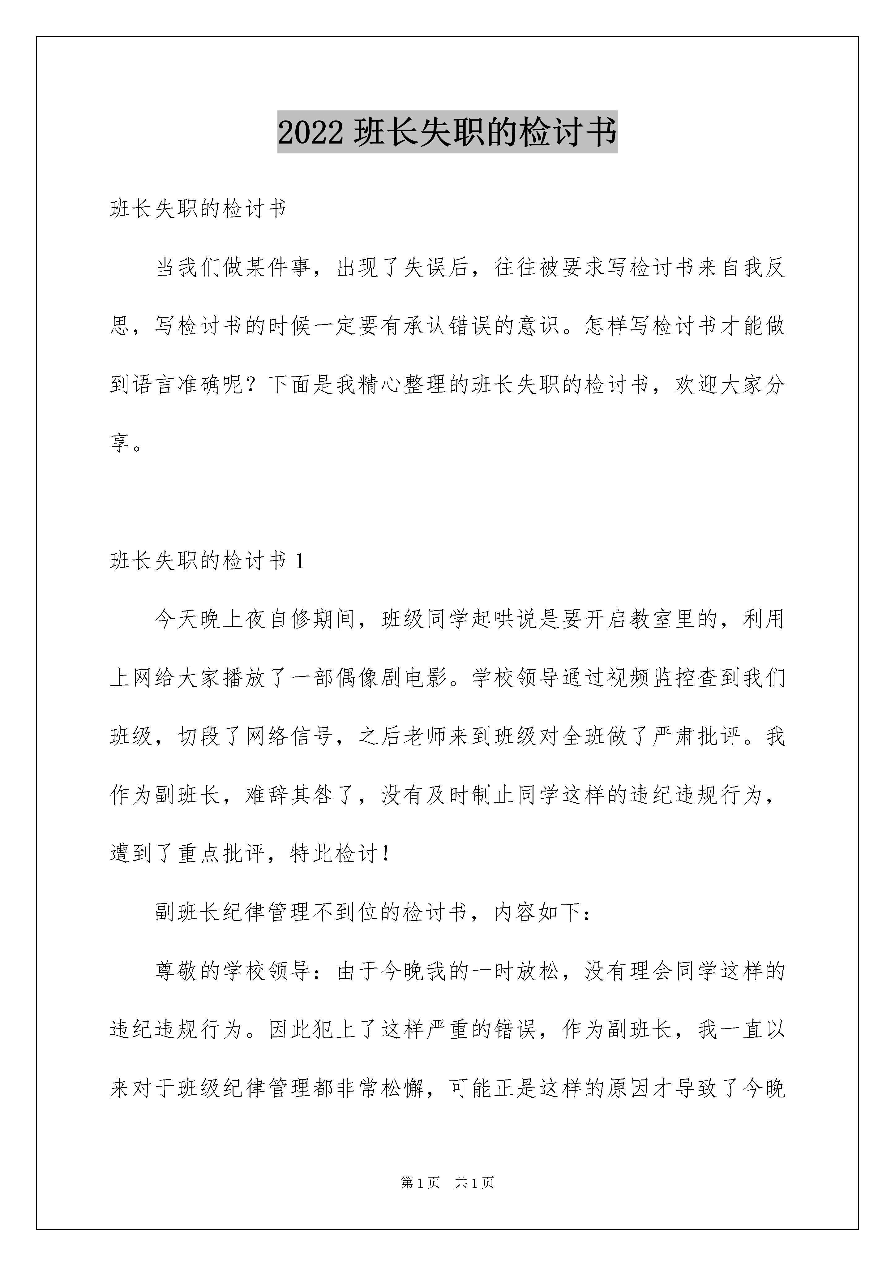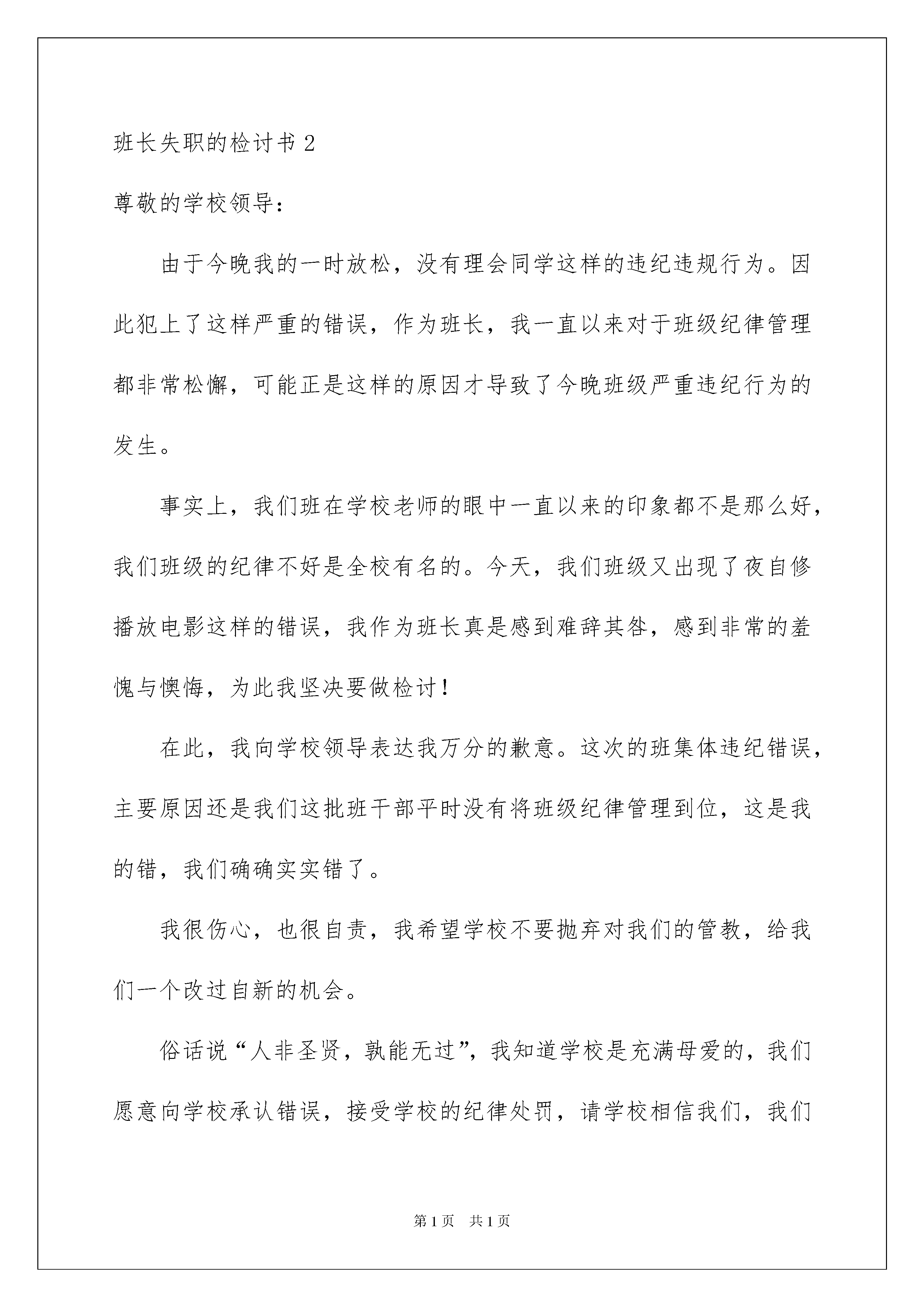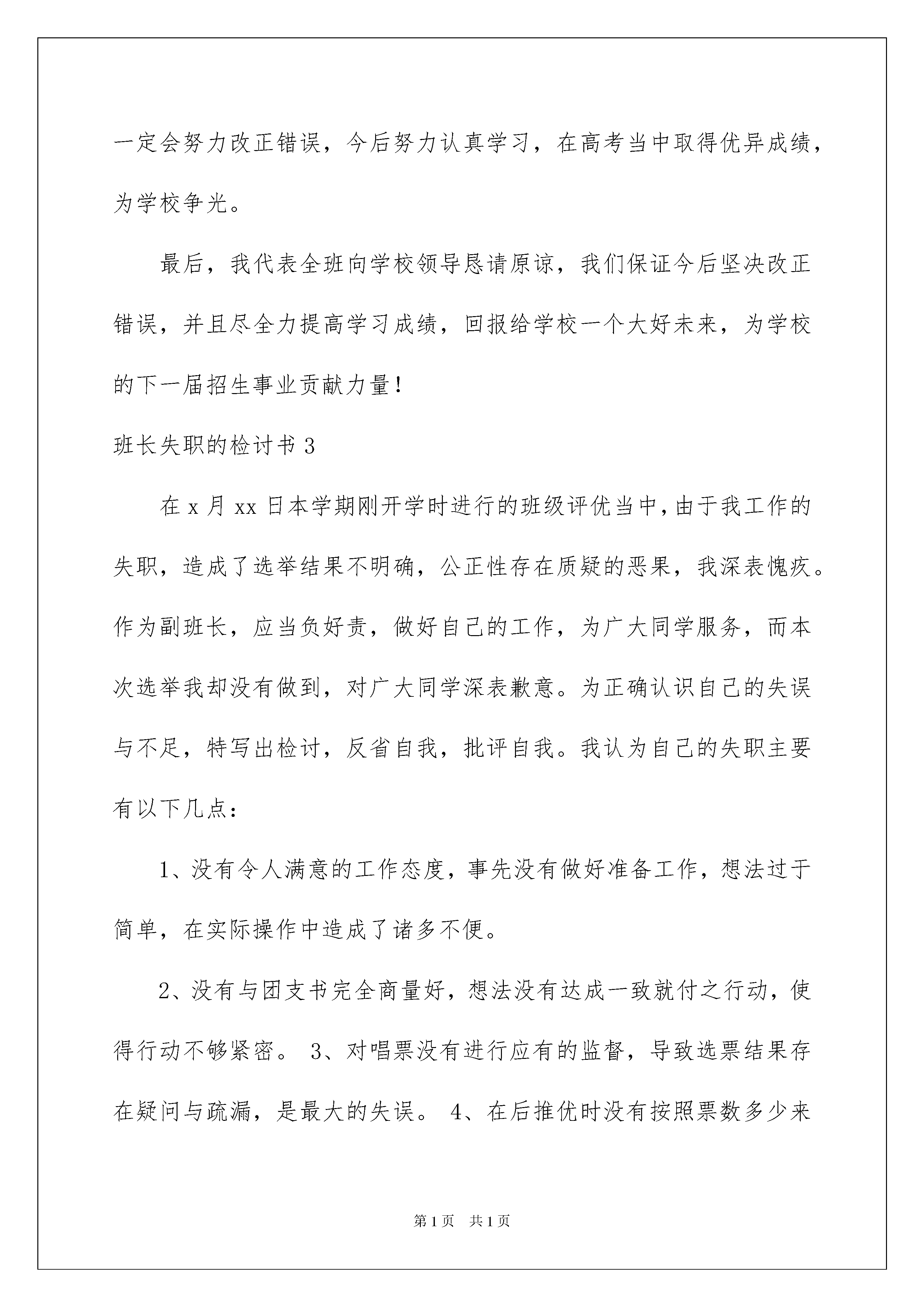 2022班长失职的检讨书班长失职的检讨书当我们做某件事,出现了失误后,往往被要求写检讨书来自我反思,写检讨书的时候一定要有承认错误的意识。怎样写检讨书才能做到语言准确呢?下面是我精心整理的班长失职的检讨书,欢迎大家分享。班长失职的检讨书1今天晚上夜自修期间,班级同学起哄说是要开启教室里的,利用上网给大家播放了一部偶像剧电影。学校领导通过视频监控查到我们班级,切段了网络信号,之后老师来到班级对全班做了严肃批评。我作为副班长,难辞其咎了,没有及时制止同学这样的违纪违规行为,遭到了重点批评,特此检讨!副班长纪律管理不到位的检讨书,内容如下:尊敬的学校领导:由于今晚我的一时放松,没有理会同学这样的违纪违规行为。因此犯上了这样严重的错误,作为副班长,我一直以来对于班级纪律管理都非常松懈,可能正是这样的原因才导致了今晚班级严重违纪行为的发生。事实上,我们班在学校老师的眼中一直以来的印象都不是那么好,我们班级的纪律不好是全校有名的。今天,我们班级又出现了夜自修播放电影这样的错误,我作为副班长真是感到难辞其咎,感到非常的羞愧与懊悔,为此我坚决要做检讨!在此,我向学校领导表达我万分的歉意。这次的班集体违纪错误,主要原因还是我们这批班干部平时没有将班级纪律管理到位,这是我的错,我们确确实实错了。我很伤心,也很自责,我希望学校不要抛弃对我们的管教,给我们一个改过自新的机会。俗话说“,孰能无过”,我知道学校是充满母爱的,我们愿意向学校承认错误,接受学校的纪律处罚,请学校相信我们,我们一定会努力改正错误,今后努力认真学习,在高考当中取得优异成绩,为学校争光。最后,我代表全班向学校领导恳请原谅,我们保证今后坚决改正错误,并且尽全力提高学习成绩,回报给学校一个大好未来,为学校的下一届招生事业贡献力量!班长失职的检讨书2尊敬的学校领导:由于今晚我的一时放松,没有理会同学这样的违纪违规行为。因此犯上了这样严重的错误,作为班长,我一直以来对于班级纪律管理都非常松懈,可能正是这样的原因才导致了今晚班级严重违纪行为的发生。事实上,我们班在学校老师的眼中一直以来的印象都不是那么好,我们班级的纪律不好是全校有名的。今天,我们班级又出现了夜自修播放电影这样的错误,我作为班长真是感到难辞其咎,感到非常的羞愧与懊悔,为此我坚决要做检讨!在此,我向学校领导表达我万分的歉意。这次的班集体违纪错误,主要原因还是我们这批班干部平时没有将班级纪律管理到位,这是我的错,我们确确实实错了。我很伤心,也很自责,我希望学校不要抛弃对我们的管教,给我们一个改过自新的机会。俗话说“人非圣贤,孰能无过”,我知道学校是充满母爱的,我们愿意向学校承认错误,接受学校的纪律处罚,请学校相信我们,我们一定会努力改正错误,今后努力认真学习,在高考当中取得优异成绩,为学校争光。最后,我代表全班向学校领导恳请原谅,我们保证今后坚决改正错误,并且尽全力提高学习成绩,回报给学校一个大好未来,为学校的下一届招生事业贡献力量!班长失职的检讨书3在x月xx日本学期刚开学时进行的班级评优当中,由于我工作的失职,造成了选举结果不明确,公正性存在质疑的恶果,我深表愧疚。作为副班长,应当负好责,做好自己的工作,为广大同学服务,而本次选举我却没有做到,对广大同学深表歉意。为正确认识自己的失误与不足,特写出检讨,反省自我,批评自我。我认为自己的失职主要有以下几点:1、没有令人满意的工作态度,事先没有做好准备工作,想法过于简单,在实际操作中造成了诸多不便。2、没有与团支书完全商量好,想法没有达成一致就付之行动,使得行动不够紧密。3、对唱票没有进行应有的监督,导致选票结果存在疑问与疏漏,是最大的失误。4、在后推优时没有按照票数多少来优先推荐优秀的同学,主观意识犯错。我想自己最主要的一点失职是准备工作没有做好,在事情发生了以后,我深感错误严重,对某些同学的应得利益造成了损害,我十分自责。为了避免类似情况的发生,为了更好的给同学们提供服务,创造一个良好的学习生活环境,我今后会做到以下几点。1、在班级集体参与的活动前一定做好准备工作,积极筹备,排除困难,为同学们取得便利。2、行动前与团支书等班委进行充分沟通,并且广泛听取同学们的意见和建议,力争符合广大同学们的心意。3、对活动过程进行必要的监督,确保每次选举的公正性,给大家一个满意的结果。4、不被主观意识误导,一切按照集体利益、集体荣誉来办事,坚决不搞小动作。不仅是我,班委对自己的失职都已经有了充分的认识,希望大家大家能够谅解。我们的态度是诚恳的,我们的心灵是真诚的,我们的愿望是美好的,就是我们大家能够一同把班级建设好。我想有了这样的经验,我
