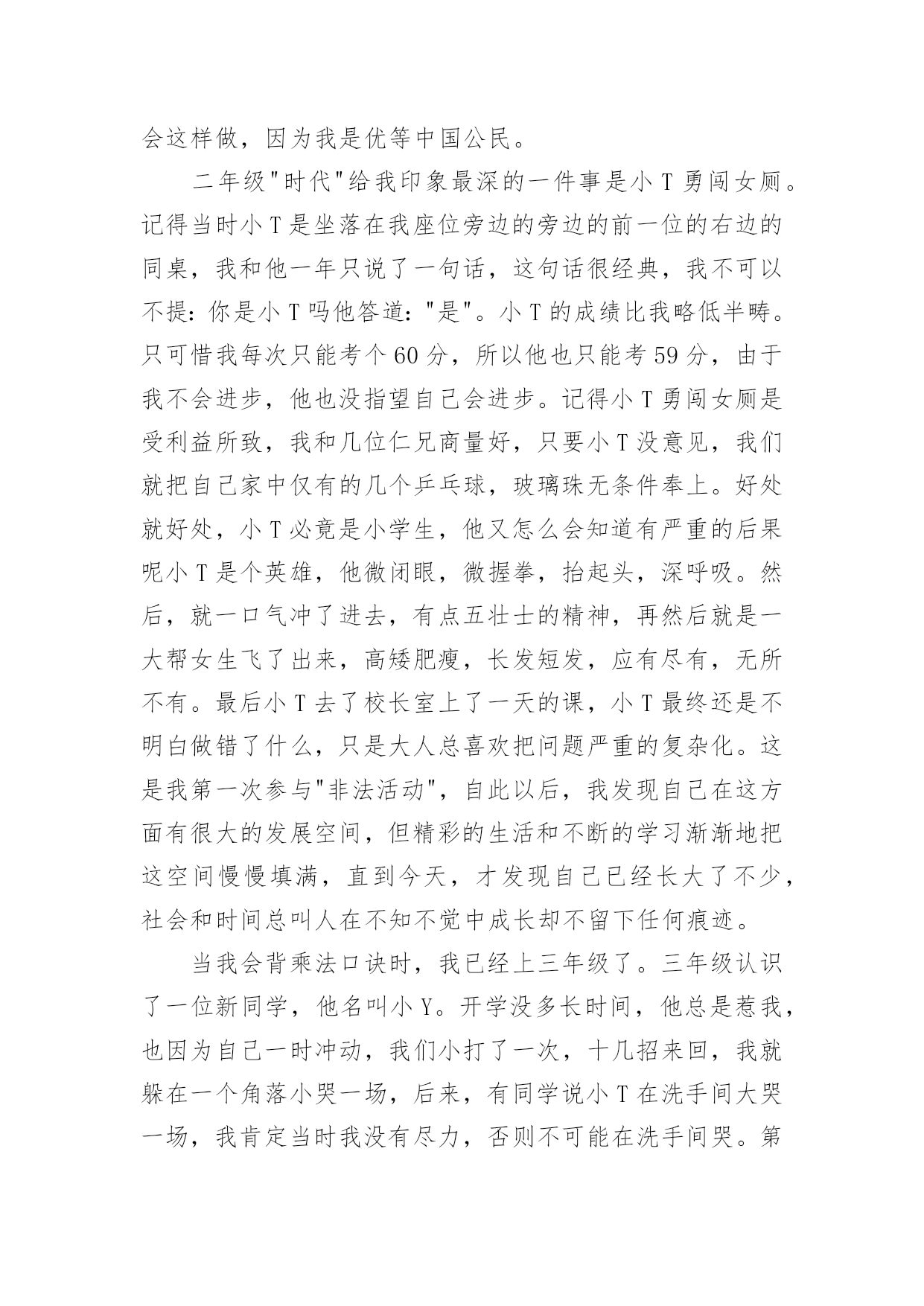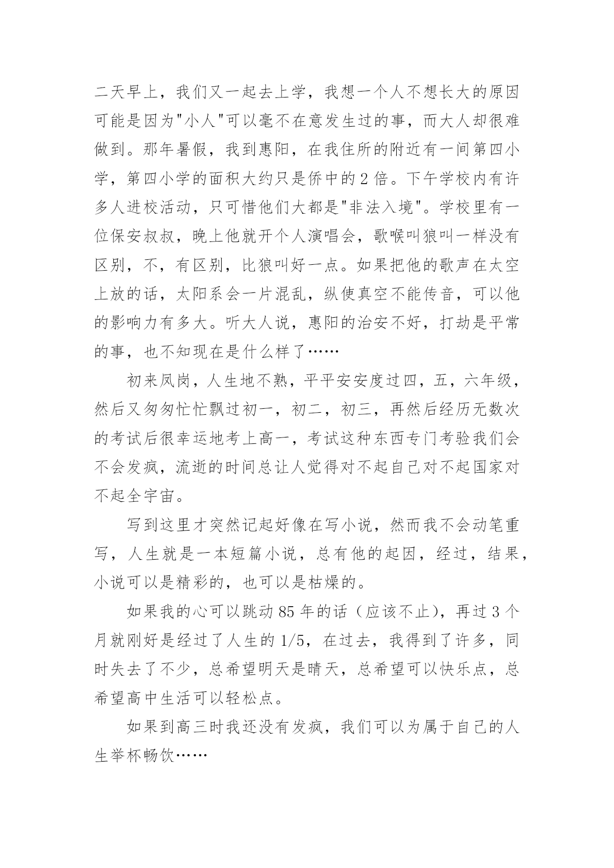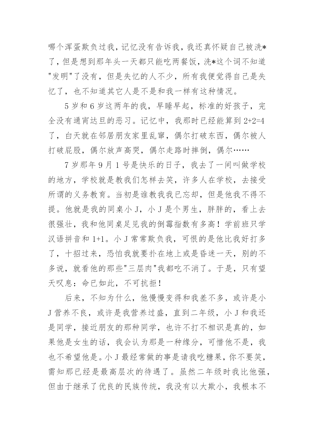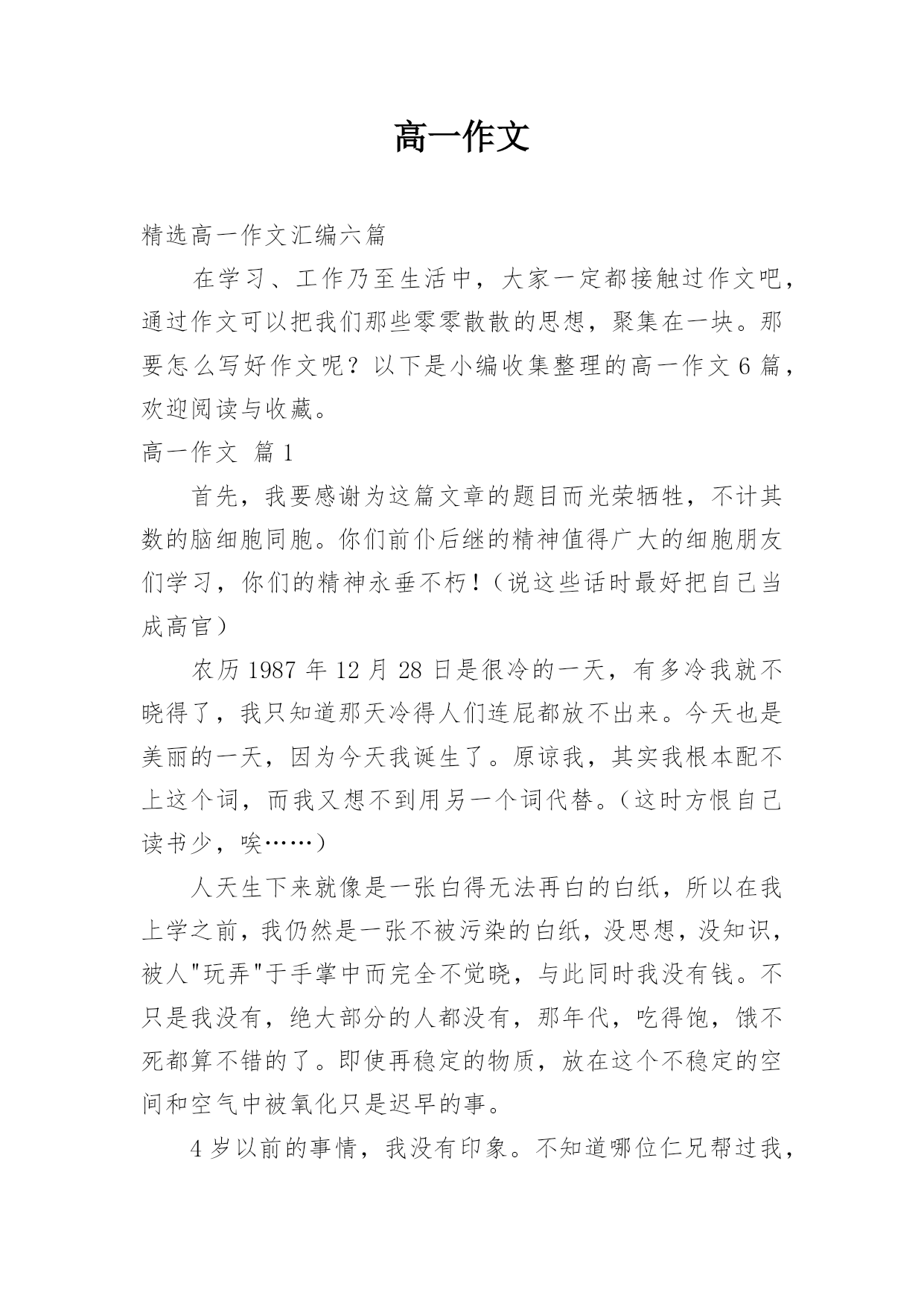 高一作文 精选高一作文汇编六篇在学习、工作乃至生活中,大家一定都接触过作文吧,通过作文可以把我们那些零零散散的思想,聚集在一块。那要怎么写好作文呢?以下是小编收集整理的高一作文6篇,欢迎阅读与收藏。高一作文篇1首先,我要感谢为这篇文章的题目而光荣牺牲,不计其数的脑细胞同胞。你们前仆后继的精神值得广大的细胞朋友们学习,你们的精神永垂不朽!(说这些话时最好把自己当成高官)农历1987年12月28日是很冷的一天,有多冷我就不晓得了,我只知道那天冷得人们连屁都放不出来。今天也是美丽的一天,因为今天我诞生了。原谅我,其实我根本配不上这个词,而我又想不到用另一个词代替。(这时方恨自己读书少,唉……)人天生下来就像是一张白得无法再白的白纸,所以在我上学之前,我仍然是一张不被污染的白纸,没思想,没知识,被人"玩弄"于手掌中而完全不觉晓,与此同时我没有钱。不只是我没有,绝大部分的人都没有,那年代,吃得饱,饿不死都算不错的了。即使再稳定的物质,放在这个不稳定的空间和空气中被氧化只是迟早的事。4岁以前的事情,我没有印象。不知道哪位仁兄帮过我,哪个浑蛋欺负过我,记忆没有告诉我,我还真怀疑自己被洗*了,但是想到那年头一天都只能吃两餐饭,洗*这个词不知道"发明"了没有,但是失忆的人不少,所有我便觉得自己是失忆了,也不知道其它人是不是和我一样有这种情况。5岁和6岁这两年的我,早睡早起,标准的好孩子,完全没有通宵达旦的恶习。记忆中,我那时已经能算到2+2=4了,白天就在邻居朋友家里乱窜,偶尔打破东西,偶尔被人打破屁股,偶尔放声高哭,偶尔走路时摔倒,偶尔……7岁那年9月1号是快乐的日子,我去了一间叫做学校的地方,学校就是教我们怎样去笑,许多人在学校,去接受所谓的义务教育。当初是谁教我我已忘却,但是他我不得不提。他就是我的同桌小J,小J是个男生,胖胖的,看上去很强壮,我和他同桌足见我的倒霉指数有多高!学前班只学汉语拼音和1+1。小J常常欺负我,可恨的是他比我好打多了,十招过来,恐怕我就要扑在地上或是昏迷一天,别的不多说,就看他的那些"三层肉"我都吃不消了。于是,只有望天叹息:命已如此,不可抗拒!后来,不知为什么,他慢慢变得和我差不多,或许是小J营养不良,或许是我营养过盛,直到二年级,小J和我还是同学,接近朋友的那种同学,也许不打不相识是真的,如果他是女生的话,我会认为那是一种缘分,可惜他不是,我也不希望他是。小J最经常做的事是请我吃糖果,你不要笑,需知那已经是最高层次的待遇了。虽然二年级时我比他强,但由于继承了优良的民族传统,我没有以大欺小,我根本不会这样做,因为我是优等中国公民。二年级"时代"给我印象最深的一件事是小T勇闯女厕。记得当时小T是坐落在我座位旁边的旁边的前一位的右边的同桌,我和他一年只说了一句话,这句话很经典,我不可以不提:你是小T吗他答道:"是"。小T的成绩比我略低半畴。只可惜我每次只能考个60分,所以他也只能考59分,由于我不会进步,他也没指望自己会进步。记得小T勇闯女厕是受利益所致,我和几位仁兄商量好,只要小T没意见,我们就把自己家中仅有的几个乒乓球,玻璃珠无条件奉上。好处就好处,小T必竟是小学生,他又怎么会知道有严重的后果呢小T是个英雄,他微闭眼,微握拳,抬起头,深呼吸。然后,就一口气冲了进去,有点五壮士的精神,再然后就是一大帮女生飞了出来,高矮肥瘦,长发短发,应有尽有,无所不有。最后小T去了校长室上了一天的课,小T最终还是不明白做错了什么,只是大人总喜欢把问题严重的复杂化。这是我第一次参与"非法活动",自此以后,我发现自己在这方面有很大的发展空间,但精彩的生活和不断的学习渐渐地把这空间慢慢填满,直到今天,才发现自己已经长大了不少,社会和时间总叫人在不知不觉中成长却不留下任何痕迹。当我会背乘法口诀时,我已经上三年级了。三年级认识了一位新同学,他名叫小Y。开学没多长时间,他总是惹我,也因为自己一时冲动,我们小打了一次,十几招来回,我就躲在一个角落小哭一场,后来,有同学说小T在洗手间大哭一场,我肯定当时我没有尽力,否则不可能在洗手间哭。第二天早上,我们又一起去上学,我想一个人不想长大的原因可能是因为"小人"可以毫不在意发生过的事,而大人却很难做到。那年暑假,我到惠阳,在我住所的附近有一间第四小学,第四小学的面积大约只是侨中的2倍。下午学校内有许多人进校活动,只可惜他们大都是"非法入境"。学校里有一位保安叔叔,晚上他就开个人演唱会,歌喉叫狼叫一样没有区别,不,有区别,比狼叫好一点。如果把他的歌声在太空上放的话,太阳系会一片混乱,纵使真空不能传音,可以他的影响力有多大。听大人说,惠阳的治安不好,打劫是平常的事,也不知现在是什么样了……初来凤岗,人生地不熟,平平安安度过四,五,六年级,然后又匆匆忙忙飘过初一,初二,初三,再然后经历无数次的考试后很幸