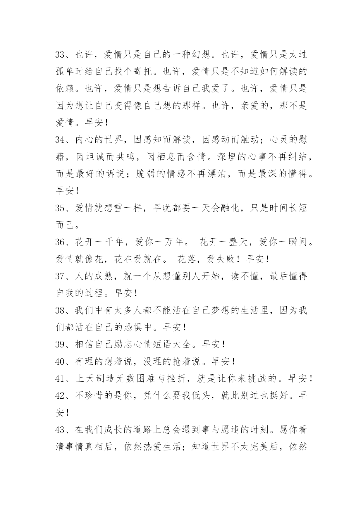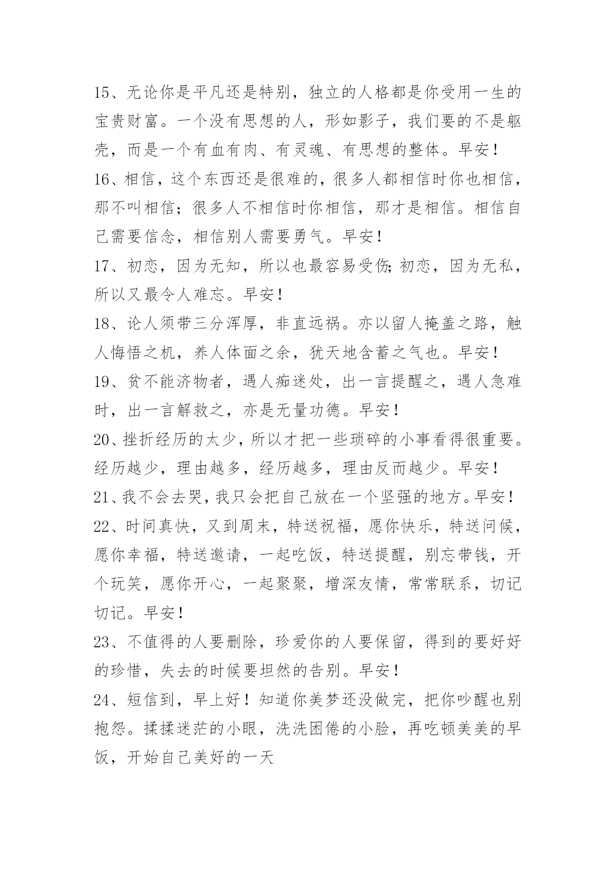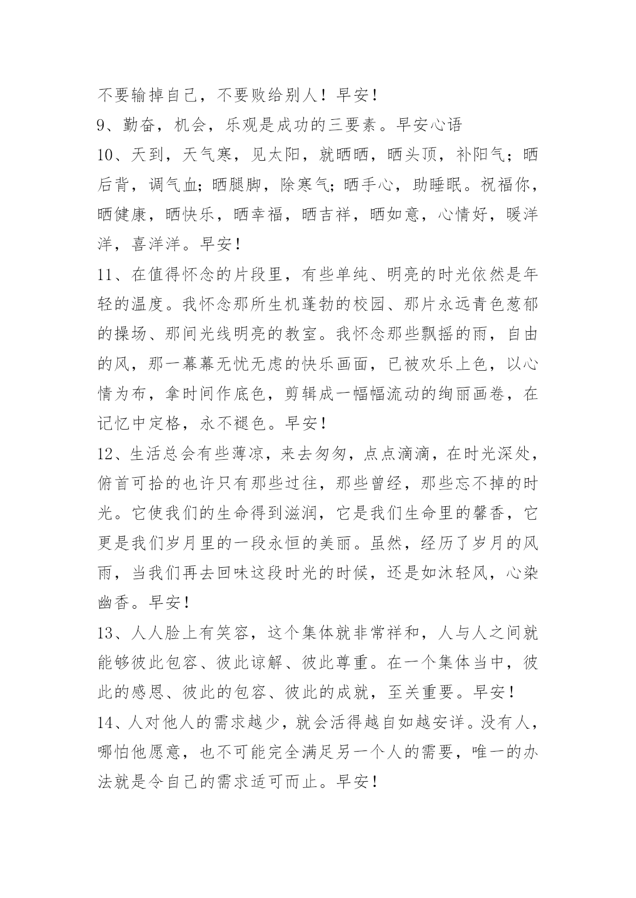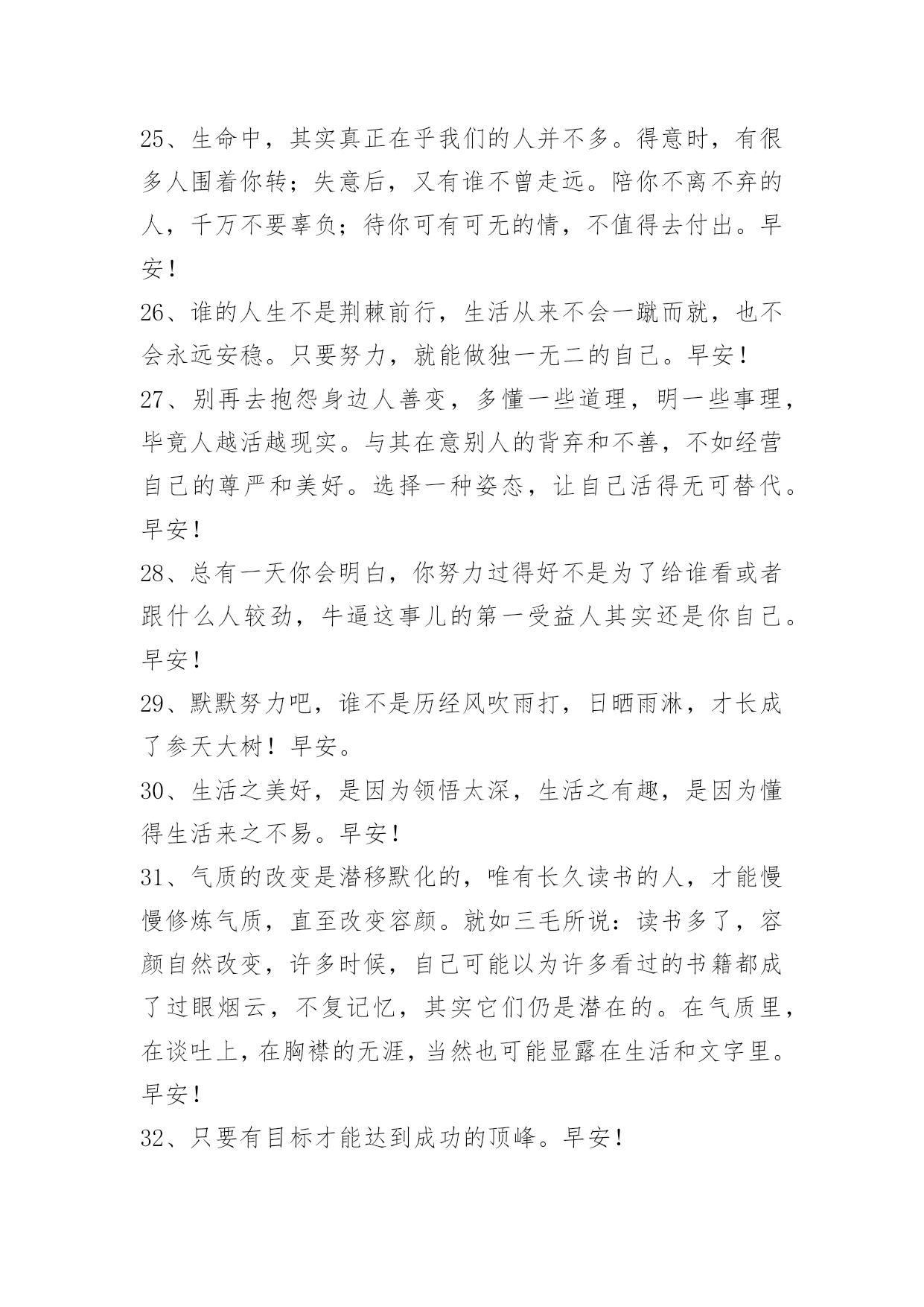 新版早安问候语语录48条 2023年精选新版早安问候语语录集合48条要相信,你很强大,几十亿的细胞都在为你而活。早安!以下是关于新版早安问候语48条,欢迎参考。1、每个孩子都有自己的梦想,他们的愿望或许有些天真,但却是他们远大志向的表现。志向促使一个人不断进取,给人以希望,让每一天都充满激情与快乐。年轻人,一定要尽早确立可行的志向,之后全力以赴去实现它,人生将因此充满意义。2、当每天醒来的时候有两个选择:醒来,再睡,继续未完的美梦;醒来,站起,去实现自己的梦想!早安!3、走过一些路,才知道辛苦;经过一些事,才知道经验;等过了一辈子,才知道幸福。早安!4、天上不会掉馅饼,努力很重要,选择决定方向,方向决定命运,为事在人,成事在天,我们能做的,就是走好当下的路,用心去选择,其他的交给上帝。早安!5、追悔过去,不如把握现在,成就未来。早安!6、年少时,以为爱能超越一切,那时不明白,世上另有一种力量,叫做命运。早安!7、生病的时候,最烂的安慰是多喝水。早安!8、自己是人生的唯一高墙,越过去,全世界将看到你的光亮。命运不是放弃,而是努力。命运不是运气,而是选择。不要输掉自己,不要败给别人!早安!9、勤奋,机会,乐观是成功的三要素。早安心语10、天到,天气寒,见太阳,就晒晒,晒头顶,补阳气;晒后背,调气血;晒腿脚,除寒气;晒手心,助睡眠。祝福你,晒健康,晒快乐,晒幸福,晒吉祥,晒如意,心情好,暖洋洋,喜洋洋。早安!11、在值得怀念的片段里,有些单纯、明亮的时光依然是年轻的温度。我怀念那所生机蓬勃的校园、那片永远青色葱郁的操场、那间光线明亮的教室。我怀念那些飘摇的雨,自由的风,那一幕幕无忧无虑的快乐画面,已被欢乐上色,以心情为布,拿时间作底色,剪辑成一幅幅流动的绚丽画卷,在记忆中定格,永不褪色。早安!12、生活总会有些薄凉,来去匆匆,点点滴滴,在时光深处,俯首可拾的也许只有那些过往,那些曾经,那些忘不掉的时光。它使我们的生命得到滋润,它是我们生命里的馨香,它更是我们岁月里的一段永恒的美丽。虽然,经历了岁月的风雨,当我们再去回味这段时光的时候,还是如沐轻风,心染幽香。早安!13、人人脸上有笑容,这个集体就非常祥和,人与人之间就能够彼此包容、彼此谅解、彼此尊重。在一个集体当中,彼此的感恩、彼此的包容、彼此的成就,至关重要。早安!14、人对他人的需求越少,就会活得越自如越安详。没有人,哪怕他愿意,也不可能完全满足另一个人的需要,唯一的办法就是令自己的需求适可而止。早安!15、无论你是平凡还是特别,独立的人格都是你受用一生的宝贵财富。一个没有思想的人,形如影子,我们要的不是躯壳,而是一个有血有肉、有灵魂、有思想的整体。早安!16、相信,这个东西还是很难的,很多人都相信时你也相信,那不叫相信;很多人不相信时你相信,那才是相信。相信自己需要信念,相信别人需要勇气。早安!17、初恋,因为无知,所以也最容易受伤;初恋,因为无私,所以又最令人难忘。早安!18、论人须带三分浑厚,非直远祸。亦以留人掩盖之路,触人悔悟之机,养人体面之余,犹天地含蓄之气也。早安!19、贫不能济物者,遇人痴迷处,出一言提醒之,遇人急难时,出一言解救之,亦是无量功德。早安!20、挫折经历的太少,所以才把一些琐碎的小事看得很重要。经历越少,理由越多,经历越多,理由反而越少。早安!21、我不会去哭,我只会把自己放在一个坚强的地方。早安!22、时间真快,又到周末,特送祝福,愿你快乐,特送问候,愿你幸福,特送邀请,一起吃饭,特送提醒,别忘带钱,开个玩笑,愿你开心,一起聚聚,增深友情,常常联系,切记切记。早安!23、不值得的人要删除,珍爱你的人要保留,得到的要好好的珍惜,失去的时候要坦然的告别。早安!24、短信到,早上好!知道你美梦还没做完,把你吵醒也别抱怨。揉揉迷茫的小眼,洗洗困倦的小脸,再吃顿美美的早饭,开始自己美好的一天25、生命中,其实真正在乎我们的人并不多。得意时,有很多人围着你转;失意后,又有谁不曾走远。陪你不离不弃的人,千万不要辜负;待你可有可无的情,不值得去付出。早安!26、谁的人生不是荆棘前行,生活从来不会一蹴而就,也不会永远安稳。只要努力,就能做独一无二的自己。早安!27、别再去抱怨身边人善变,多懂一些道理,明一些事理,毕竟人越活越现实。与其在意别人的背弃和不善,不如经营自己的尊严和美好。选择一种姿态,让自己活得无可替代。早安!28、总有一天你会明白,你努力过得好不是为了给谁看或者跟什么人较劲,牛逼这事儿的第一受益人其实还是你自己。早安!29、默默努力吧,谁不是历经风吹雨打,日晒雨淋,才长成了参天大树!早安。30、生活之美好,是因为领悟太深,生活之有趣,是因为懂得生活来之不易。早安!31、气质的改变是潜移默化的,唯有长久读书的人,才能慢慢修炼气质,直至改变容颜。就如三毛所说