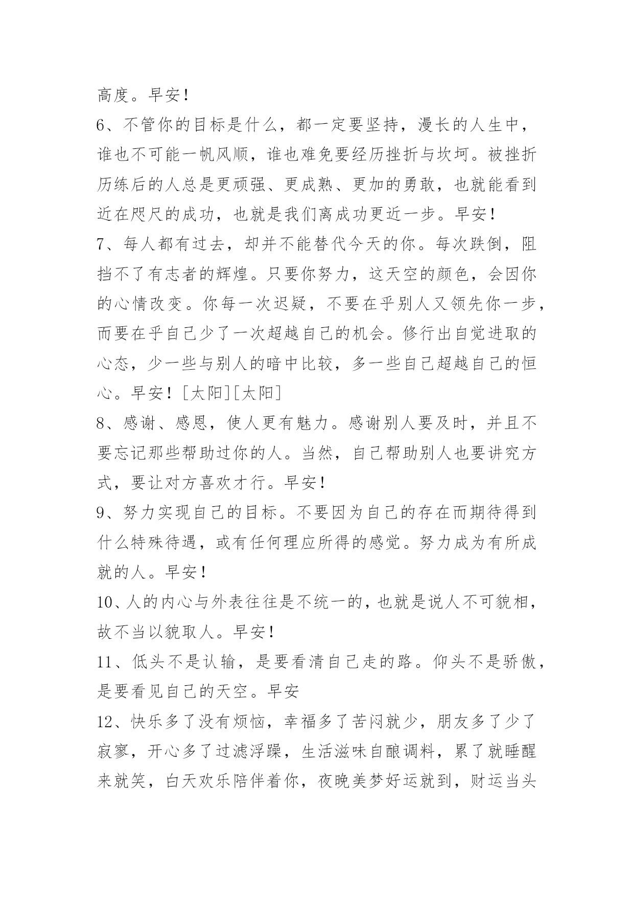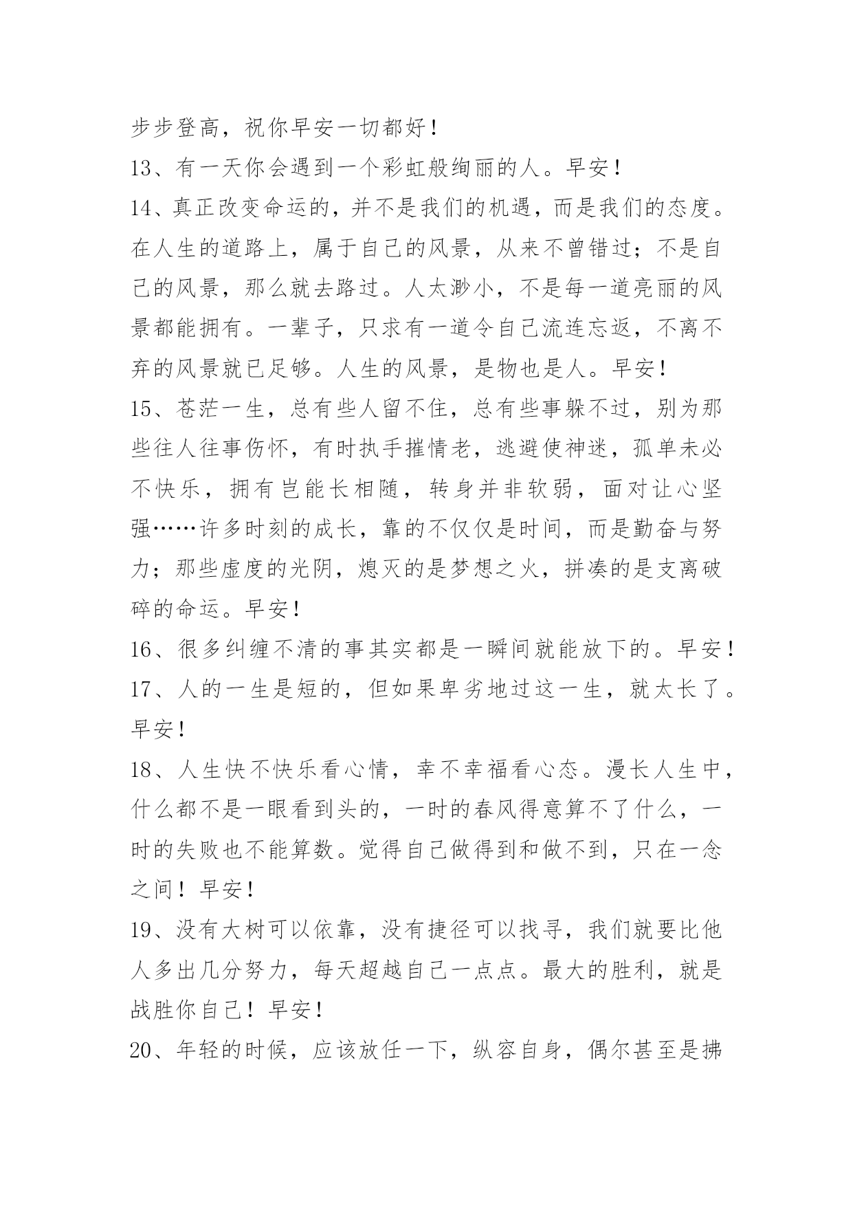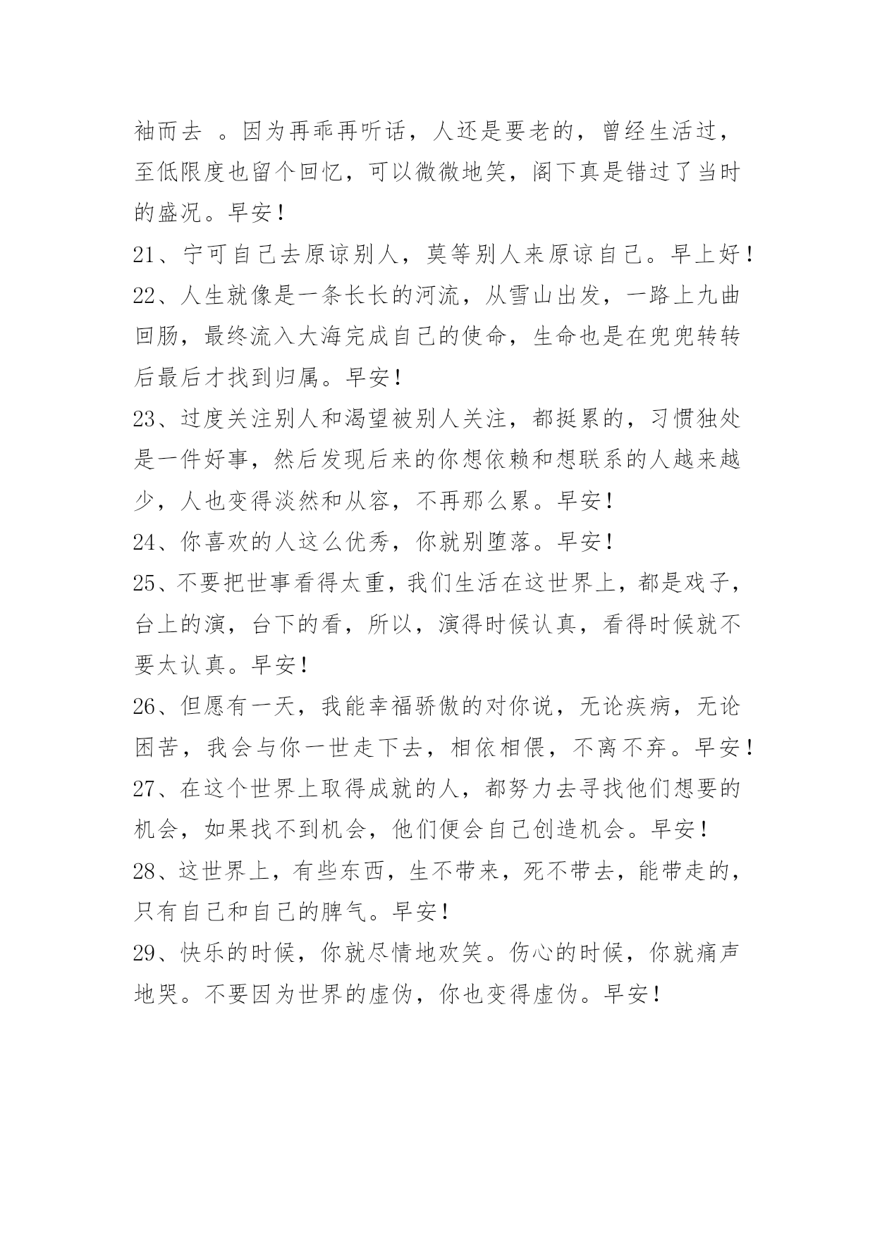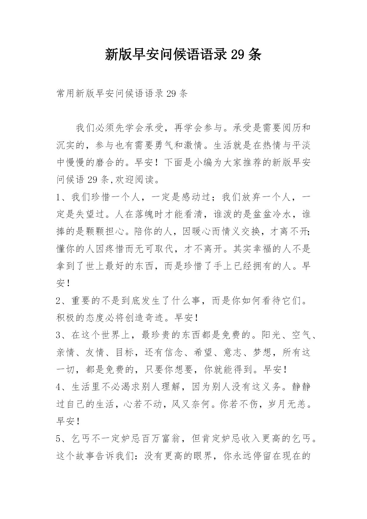 新版早安问候语语录29条 常用新版早安问候语语录29条我们必须先学会承受,再学会参与。承受是需要阅历和沉实的,参与也有需要勇气和激情。生活就是在热情与平淡中慢慢的磨合的。早安!下面是小编为大家推荐的新版早安问候语29条,欢迎阅读。1、我们珍惜一个人,一定是感动过;我们放弃一个人,一定是失望过。人在落魄时才能看清,谁泼的是盆盆冷水,谁捧的是颗颗担心。陪你的人,因暖心而情义交换,才离不开;懂你的人因疼惜而无可取代,才不离开。其实幸福的人不是拿到了世上最好的东西,而是珍惜了手上已经拥有的人。早安!2、重要的不是到底发生了什么事,而是你如何看待它们。积极的态度必将创造奇迹。早安!3、在这个世界上,最珍贵的东西都是免费的。阳光、空气、亲情、友情、目标,还有信念、希望、意志、梦想,所有这一切,都是免费的,只要你想要,你就能得到。早安!4、生活里不必渴求别人理解,因为别人没有这义务。静静过自己的生活,心若不动,风又奈何。你若不伤,岁月无恙。早安!5、乞丐不一定妒忌百万富翁,但肯定妒忌收入更高的乞丐。这个故事告诉我们:没有更高的眼界,你永远停留在现在的高度。早安!6、不管你的目标是什么,都一定要坚持,漫长的人生中,谁也不可能一帆风顺,谁也难免要经历挫折与坎坷。被挫折历练后的人总是更顽强、更成熟、更加的勇敢,也就能看到近在咫尺的成功,也就是我们离成功更近一步。早安!7、每人都有过去,却并不能替代今天的你。每次跌倒,阻挡不了有志者的辉煌。只要你努力,这天空的颜色,会因你的心情改变。你每一次迟疑,不要在乎别人又领先你一步,而要在乎自己少了一次超越自己的机会。修行出自觉进取的心态,少一些与别人的暗中比较,多一些自己超越自己的恒心。早安![太阳][太阳]8、感谢、感恩,使人更有魅力。感谢别人要及时,并且不要忘记那些帮助过你的人。当然,自己帮助别人也要讲究方式,要让对方喜欢才行。早安!9、努力实现自己的目标。不要因为自己的存在而期待得到什么特殊待遇,或有任何理应所得的感觉。努力成为有所成就的人。早安!10、人的内心与外表往往是不统一的,也就是说人不可貌相,故不当以貌取人。早安!11、低头不是认输,是要看清自己走的路。仰头不是骄傲,是要看见自己的天空。早安12、快乐多了没有烦恼,幸福多了苦闷就少,朋友多了少了寂寥,开心多了过滤浮躁,生活滋味自酿调料,累了就睡醒来就笑,白天欢乐陪伴着你,夜晚美梦好运就到,财运当头步步登高,祝你早安一切都好!13、有一天你会遇到一个彩虹般绚丽的人。早安!14、真正改变命运的,并不是我们的机遇,而是我们的态度。在人生的道路上,属于自己的风景,从来不曾错过;不是自己的风景,那么就去路过。人太渺小,不是每一道亮丽的风景都能拥有。一辈子,只求有一道令自己流连忘返,不离不弃的风景就已足够。人生的风景,是物也是人。早安!15、苍茫一生,总有些人留不住,总有些事躲不过,别为那些往人往事伤怀,有时执手摧情老,逃避使神迷,孤单未必不快乐,拥有岂能长相随,转身并非软弱,面对让心坚强……许多时刻的成长,靠的不仅仅是时间,而是勤奋与努力;那些虚度的光阴,熄灭的是梦想之火,拼凑的是支离破碎的命运。早安!16、很多纠缠不清的事其实都是一瞬间就能放下的。早安!17、人的一生是短的,但如果卑劣地过这一生,就太长了。早安!18、人生快不快乐看心情,幸不幸福看心态。漫长人生中,什么都不是一眼看到头的,一时的春风得意算不了什么,一时的失败也不能算数。觉得自己做得到和做不到,只在一念之间!早安!19、没有大树可以依靠,没有捷径可以找寻,我们就要比他人多出几分努力,每天超越自己一点点。最大的胜利,就是战胜你自己!早安!20、年轻的时候,应该放任一下,纵容自身,偶尔甚至是拂袖而去。因为再乖再听话,人还是要老的,曾经生活过,至低限度也留个回忆,可以微微地笑,阁下真是错过了当时的盛况。早安!21、宁可自己去原谅别人,莫等别人来原谅自己。早上好!22、人生就像是一条长长的河流,从雪山出发,一路上九曲回肠,最终流入大海完成自己的使命,生命也是在兜兜转转后最后才找到归属。早安!23、过度关注别人和渴望被别人关注,都挺累的,习惯独处是一件好事,然后发现后来的你想依赖和想联系的人越来越少,人也变得淡然和从容,不再那么累。早安!24、你喜欢的人这么优秀,你就别堕落。早安!25、不要把世事看得太重,我们生活在这世界上,都是戏子,台上的演,台下的看,所以,演得时候认真,看得时候就不要太认真。早安!26、但愿有一天,我能幸福骄傲的对你说,无论疾病,无论困苦,我会与你一世走下去,相依相偎,不离不弃。早安!27、在这个世界上取得成就的人,都努力去寻找他们想要的机会,如果找不到机会,他们便会自己创造机会。早安!28、这世界上,有些东西,生不带来,死不带去,能带走的,只有自己和自己的脾气。早安!2