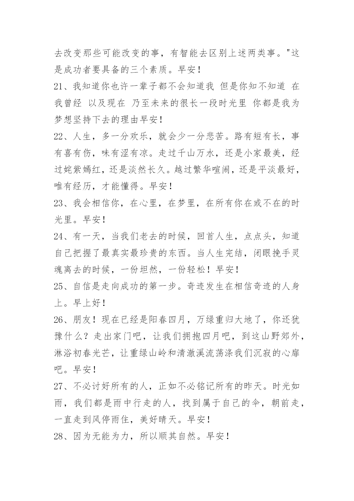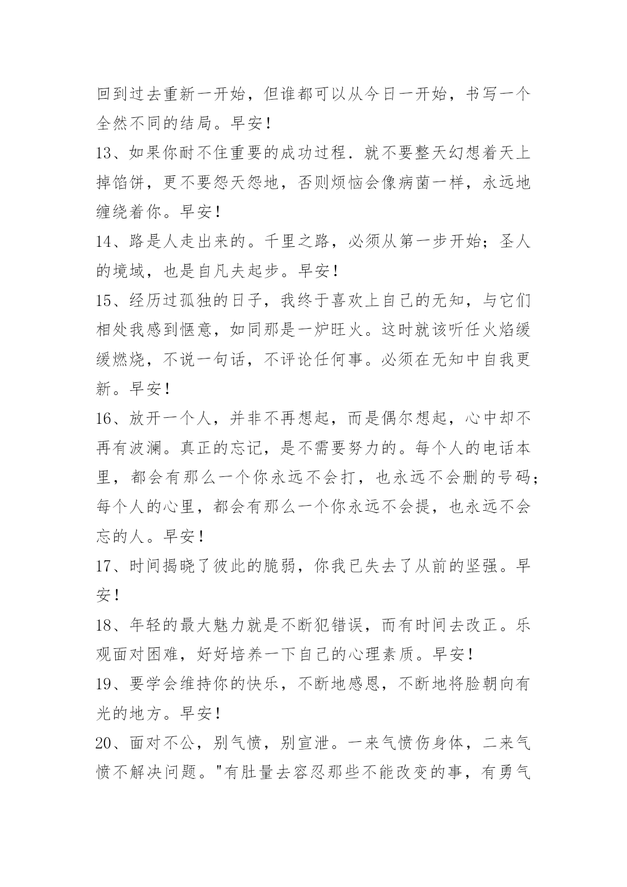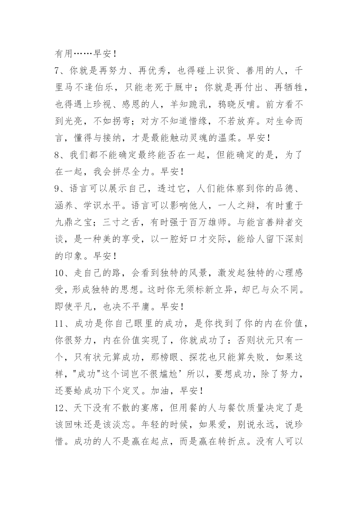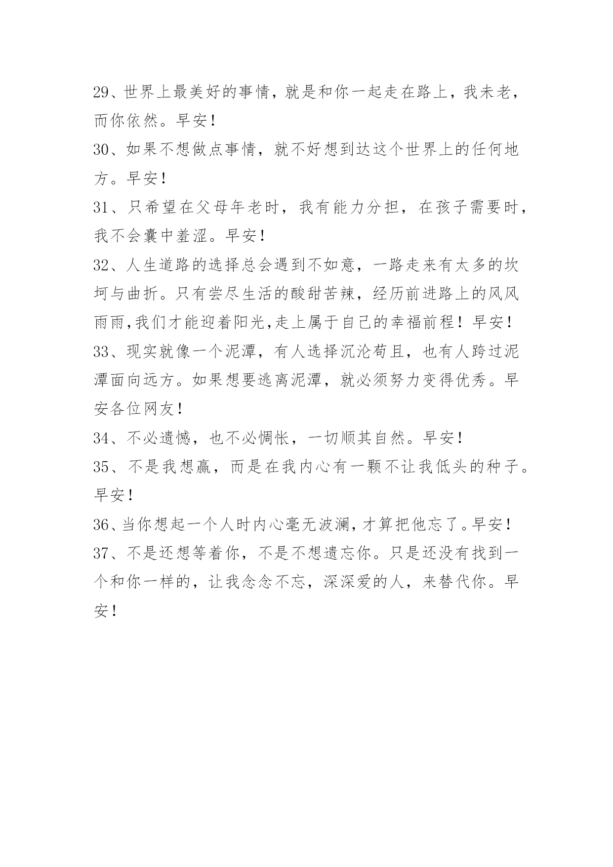 新版早安问候语语录37条 【实用】新版早安问候语语录37条你的好对别人来说就像一颗糖,吃了就没了;你的坏对别人来说就像一个疤痕,留下就永久在。这就是人性。我们只能把握自己内心的纯洁,记住别人给我们的糖而非疤痕。这样的世界才是我们真正想要创造的世界。——朱德庸早安!下面是关于新版早安问候语37条,希望大家喜欢。1、人生匆匆几十年,虽不是白驹过隙,但时光却如掌中的沙一样,在你紧握双手时快速地流逝,没有人能够挽留,更无法挽回。人生单行道上,我们如宇宙中的过客,匆匆而过,没有留下,又或者带走什么。功名利禄到头来终是一场过眼云烟。早安!2、曾经,以为每次的选择意味着获得,却不曾意识到选择也是意味着放弃。早安!3、锲而舍之,朽木不折;锲而不舍,金石可镂。当你坚持之后到达第三境界时,蓦然回首,成功即在眼前。早安!4、尽管青春悄然逝去,有点令人遗憾,但我们并不悲观。在兴致勃勃地挂上新的日历之际,让我们手挽手,充满信心迈向新的一年。早安!5、学会干净的语言和安静的笑,跟着风走把孤独当自由。早安!6、身体累的话,睡一觉就好了,不知道给心盖上被子有没有用……早安!7、你就是再努力、再优秀,也得碰上识货、善用的人,千里马不逢伯乐,只能老死于厩中;你就是再付出、再牺牲,也得遇上珍视、感恩的人,羊知跪乳,鸦晓反哺。前方看不到光亮,不如拐弯;对方不知道惜缘,不若放弃。对生命而言,懂得与接纳,才是最能触动灵魂的温柔。早安!8、我们都不能确定最终能否在一起,但能确定的是,为了在一起,我会拼尽全力。早安!9、语言可以展示自己,透过它,人们能体察到你的品德、涵养、学识水平。语言可以影响他人,一人之辩,有时重于九鼎之宝;三寸之舌,有时强于百万雄师。与能言善辩者交谈,是一种美的享受,以一腔好口才交际,能给人留下深刻的印象。早安!10、走自己的路,会看到独特的风景,激发起独特的心理感受,形成独特的思想。这时你无须标新立异,却已与众不同。即使平凡,也决不平庸。早安!11、成功是你自己眼里的成功,是你找到了你的内在价值,你很努力,内在价值实现了,你就成功了:否则状元只有一个,只有状元算成功,那榜眼、探花也只能算失败.如果这样,"成功"这个词岂不很尴尬’所以,要想成功,除了努力,还要蛤成功下个定叉。加油,早安!12、天下没有不散的宴席,但用餐的人与餐饮质量决定了是该回味还是该淡忘。年轻的时候,如果爱,别说永远,说珍惜。成功的人不是赢在起点,而是赢在转折点。没有人可以回到过去重新一开始,但谁都可以从今日一开始,书写一个全然不同的结局。早安!13、如果你耐不住重要的成功过程.就不要整天幻想着天上掉馅饼,更不要怨天怨地,否则烦恼会像病菌一样,永远地缠绕着你。早安!14、路是人走出来的。千里之路,必须从第一步开始;圣人的境域,也是自凡夫起步。早安!15、经历过孤独的日子,我终于喜欢上自己的无知,与它们相处我感到惬意,如同那是一炉旺火。这时就该听任火焰缓缓燃烧,不说一句话,不评论任何事。必须在无知中自我更新。早安!16、放开一个人,并非不再想起,而是偶尔想起,心中却不再有波澜。真正的忘记,是不需要努力的。每个人的电话本里,都会有那么一个你永远不会打,也永远不会删的号码;每个人的心里,都会有那么一个你永远不会提,也永远不会忘的人。早安!17、时间揭晓了彼此的脆弱,你我已失去了从前的坚强。早安!18、年轻的最大魅力就是不断犯错误,而有时间去改正。乐观面对困难,好好培养一下自己的心理素质。早安!19、要学会维持你的快乐,不断地感恩,不断地将脸朝向有光的地方。早安!20、面对不公,别气愤,别宣泄。一来气愤伤身体,二来气愤不解决问题。"有肚量去容忍那些不能改变的事,有勇气去改变那些可能改变的事,有智能去区别上述两类事。"这是成功者要具备的三个素质。早安!21、我知道你也许一辈子都不会知道我但是你知不知道在我曾经以及现在乃至未来的很长一段时光里你都是我为梦想坚持下去的理由早安!22、人生,多一分欢乐,就会少一分悲苦。路有短有长,事有喜有伤,味有涩有凉。走过千山万水,还是小家最美,经过姹紫嫣红,还是淡然长久。越过繁华喧闹,还是平淡最好,唯有经历,才能懂得。早安!23、我会相信你,在心里,在梦里,在所有你在或不在的时光里。早安!24、有一天,当我们老去的时候,回首人生,点点头,知道自己把握了最真实最珍贵的东西。当人生完结,闭眼挽手灵魂离去的时候,一份坦然,一份轻松!早安!25、自信是走向成功的第一步。奇迹发生在相信奇迹的人身上。早上好!26、朋友!现在已经是阳春四月,万绿重归大地了,你还犹豫什么?走出家门吧,让我们拥抱四月吧,到这山野郊外,淋浴初春光芒,让重绿山岭和清澈溪流荡涤我们沉寂的心扉吧。早安!27、不必讨好所有的人,正如不必铭记所有的昨天。时光如雨,我们都是雨中行走的人,找到属于自己的伞,朝