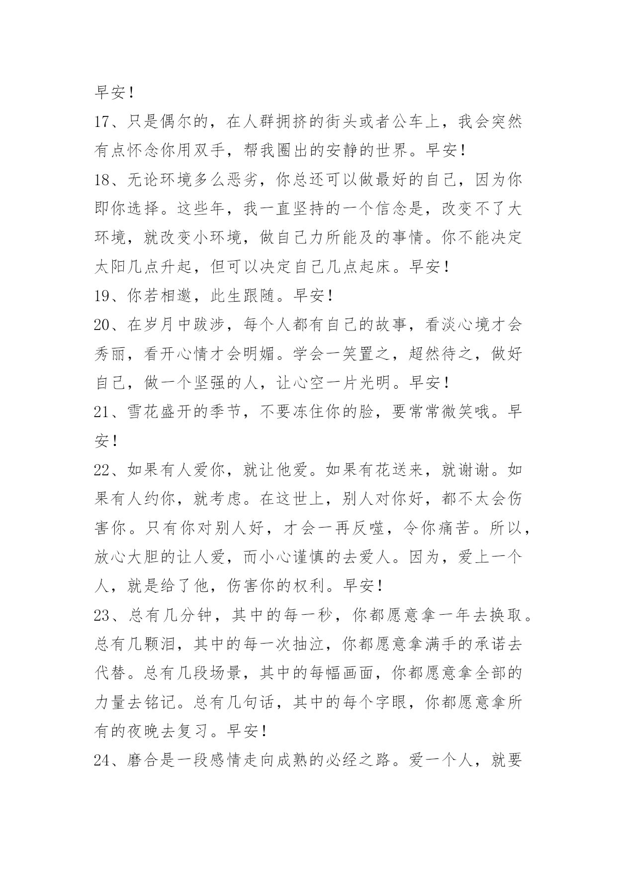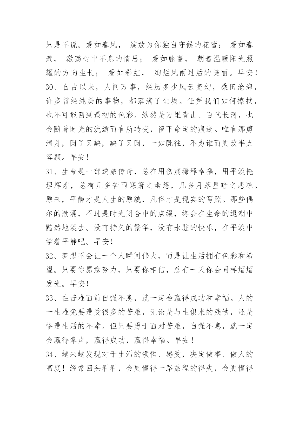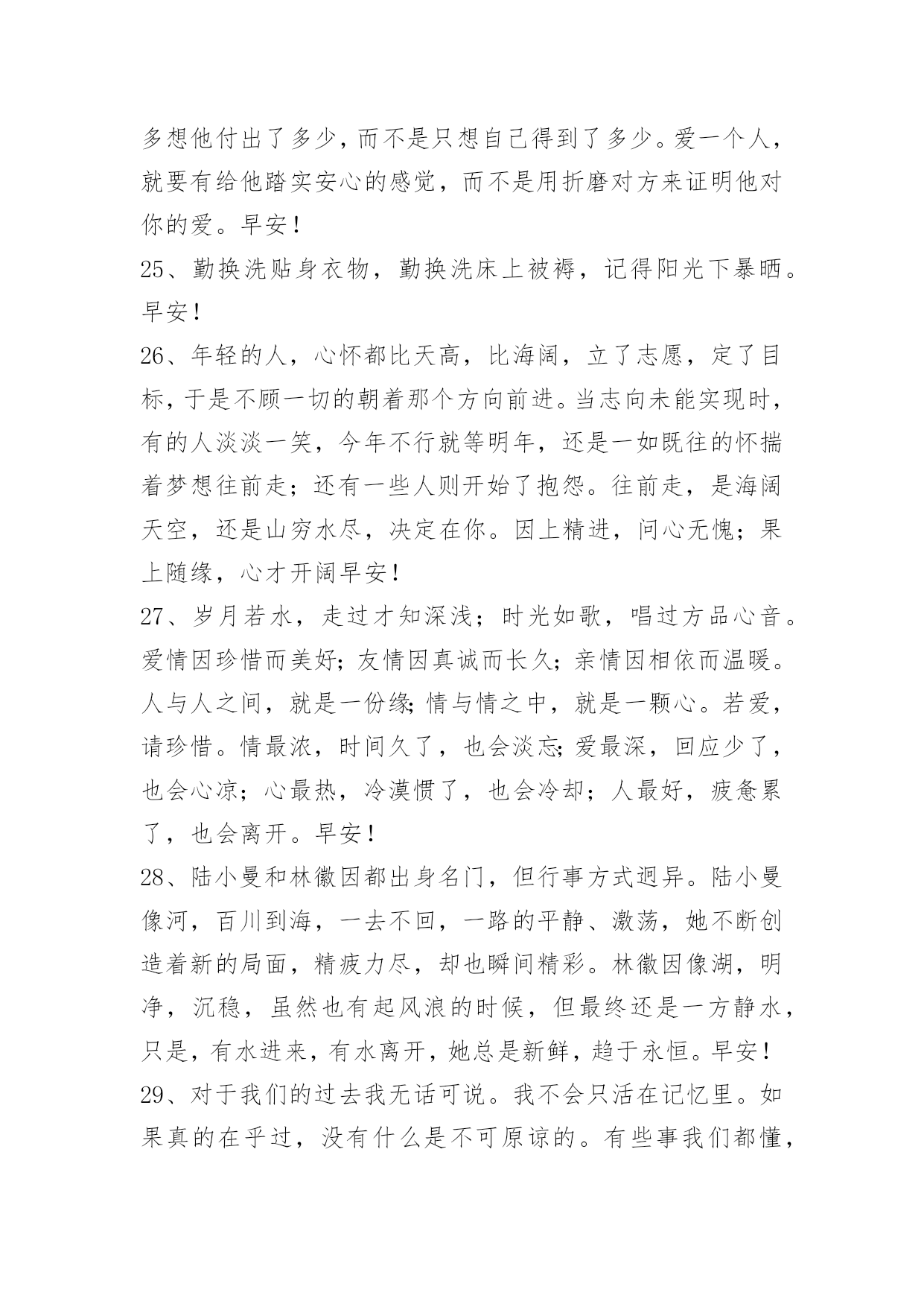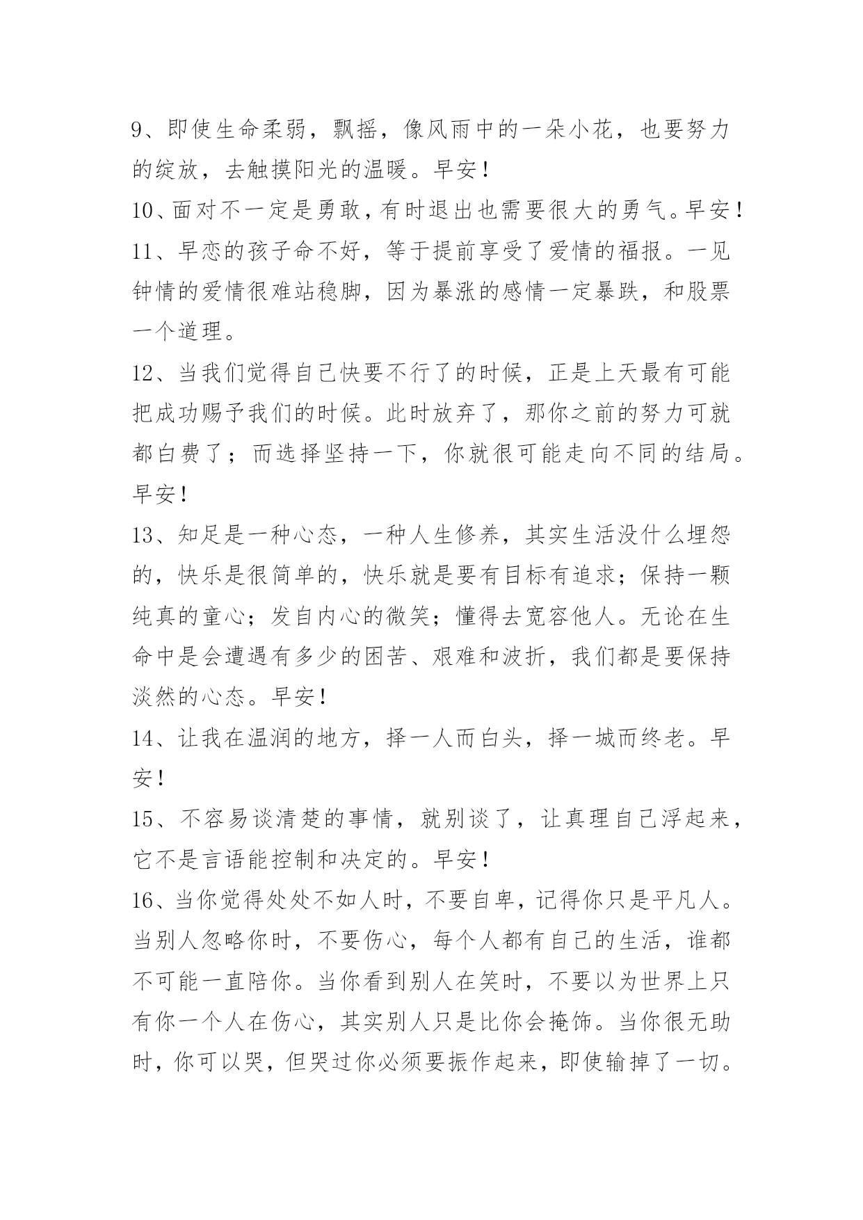 新版早安问候语语录59条 新版早安问候语语录59条你从不担心自己配不上优秀的人,你只会担心自己配不上喜欢的人。早安!以下是小编给各位读者分享的新版早安问候语59条,感兴趣的一起来看看吧。1、生死虽由命,富贵不在天。早安!2、记不得有多久没见你,你知否我的世界多寂寞,我想告诉你心中的小秘密,就是…"我在想念你"。早安!3、有时,我们愿意原谅一个人,并不是我们真的愿意原谅他,而是我们不愿意失去他。不想失去他,惟有假装原谅他。早安!4、只有常怀感恩之心,才能获得幸福之果。早安!5、默默安慰你的人很多,站出来为你说一句话的人太少。早安!6、你们不要总争自由,自由是外界给你的,你们先要争独立,给你自由你不独立你仍然是奴隶,你要把你身上蒙蔽你的概念和成见,要像剥笋一样一层一层的剥去露出里面他里头很鲜嫩很清的那个劲。早安!7、不要抱怨命运乖戾,人生艰难,关键在自己。是一滴水,投入洪流便不会泯灭;是一粒沙,经浪涛淘洗也可闪烁也海滩;是一寸真金,光华永不灭早安!8、只有登高,才能望远;只有望远,才能行远。早安!9、即使生命柔弱,飘摇,像风雨中的一朵小花,也要努力的绽放,去触摸阳光的温暖。早安!10、面对不一定是勇敢,有时退出也需要很大的勇气。早安!11、早恋的孩子命不好,等于提前享受了爱情的福报。一见钟情的爱情很难站稳脚,因为暴涨的感情一定暴跌,和股票一个道理。12、当我们觉得自己快要不行了的时候,正是上天最有可能把成功赐予我们的时候。此时放弃了,那你之前的努力可就都白费了;而选择坚持一下,你就很可能走向不同的结局。早安!13、知足是一种心态,一种人生修养,其实生活没什么埋怨的,快乐是很简单的,快乐就是要有目标有追求;保持一颗纯真的童心;发自内心的微笑;懂得去宽容他人。无论在生命中是会遭遇有多少的困苦、艰难和波折,我们都是要保持淡然的心态。早安!14、让我在温润的地方,择一人而白头,择一城而终老。早安!15、不容易谈清楚的事情,就别谈了,让真理自己浮起来,它不是言语能控制和决定的。早安!16、当你觉得处处不如人时,不要自卑,记得你只是平凡人。当别人忽略你时,不要伤心,每个人都有自己的生活,谁都不可能一直陪你。当你看到别人在笑时,不要以为世界上只有你一个人在伤心,其实别人只是比你会掩饰。当你很无助时,你可以哭,但哭过你必须要振作起来,即使输掉了一切。早安!17、只是偶尔的,在人群拥挤的街头或者公车上,我会突然有点怀念你用双手,帮我圈出的安静的世界。早安!18、无论环境多么恶劣,你总还可以做最好的自己,因为你即你选择。这些年,我一直坚持的一个信念是,改变不了大环境,就改变小环境,做自己力所能及的事情。你不能决定太阳几点升起,但可以决定自己几点起床。早安!19、你若相邀,此生跟随。早安!20、在岁月中跋涉,每个人都有自己的故事,看淡心境才会秀丽,看开心情才会明媚。学会一笑置之,超然待之,做好自己,做一个坚强的人,让心空一片光明。早安!21、雪花盛开的季节,不要冻住你的脸,要常常微笑哦。早安!22、如果有人爱你,就让他爱。如果有花送来,就谢谢。如果有人约你,就考虑。在这世上,别人对你好,都不太会伤害你。只有你对别人好,才会一再反噬,令你痛苦。所以,放心大胆的让人爱,而小心谨慎的去爱人。因为,爱上一个人,就是给了他,伤害你的权利。早安!23、总有几分钟,其中的每一秒,你都愿意拿一年去换取。总有几颗泪,其中的每一次抽泣,你都愿意拿满手的承诺去代替。总有几段场景,其中的每幅画面,你都愿意拿全部的力量去铭记。总有几句话,其中的每个字眼,你都愿意拿所有的夜晚去复习。早安!24、磨合是一段感情走向成熟的必经之路。爱一个人,就要多想他付出了多少,而不是只想自己得到了多少。爱一个人,就要有给他踏实安心的感觉,而不是用折磨对方来证明他对你的爱。早安!25、勤换洗贴身衣物,勤换洗床上被褥,记得阳光下暴晒。早安!26、年轻的人,心怀都比天高,比海阔,立了志愿,定了目标,于是不顾一切的朝着那个方向前进。当志向未能实现时,有的人淡淡一笑,今年不行就等明年,还是一如既往的怀揣着梦想往前走;还有一些人则开始了抱怨。往前走,是海阔天空,还是山穷水尽,决定在你。因上精进,问心无愧;果上随缘,心才开阔早安!27、岁月若水,走过才知深浅;时光如歌,唱过方品心音。爱情因珍惜而美好;友情因真诚而长久;亲情因相依而温暖。人与人之间,就是一份缘;情与情之中,就是一颗心。若爱,请珍惜。情最浓,时间久了,也会淡忘;爱最深,回应少了,也会心凉;心最热,冷漠惯了,也会冷却;人最好,疲惫累了,也会离开。早安!28、陆小曼和林徽因都出身名门,但行事方式迥异。陆小曼像河,百川到海,一去不回,一路的平静、激荡,她不断创造着新的局面,精疲力尽,却也瞬间精彩。林徽因像湖,明净,沉稳,虽然也有起风浪的时候,但最终还是