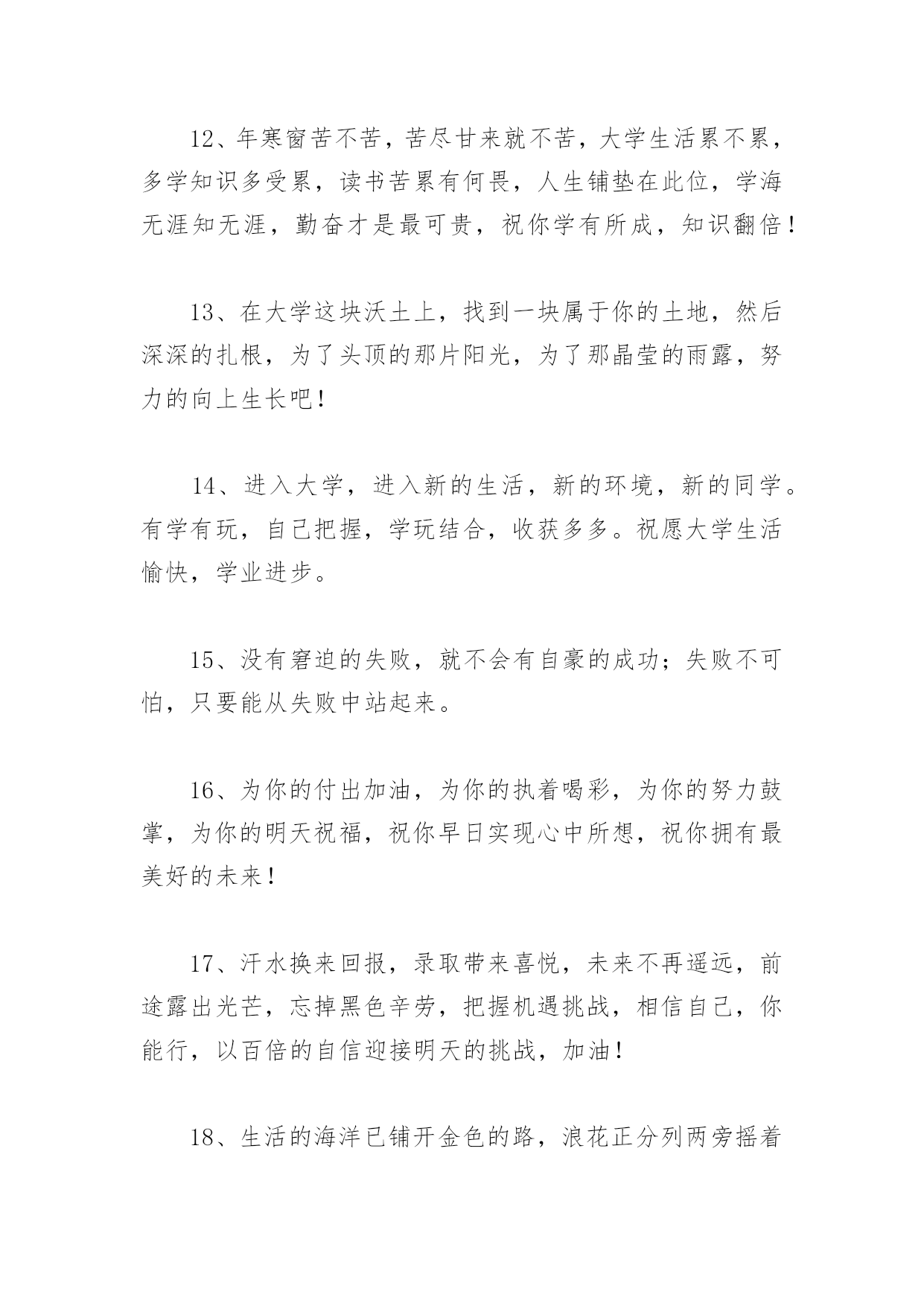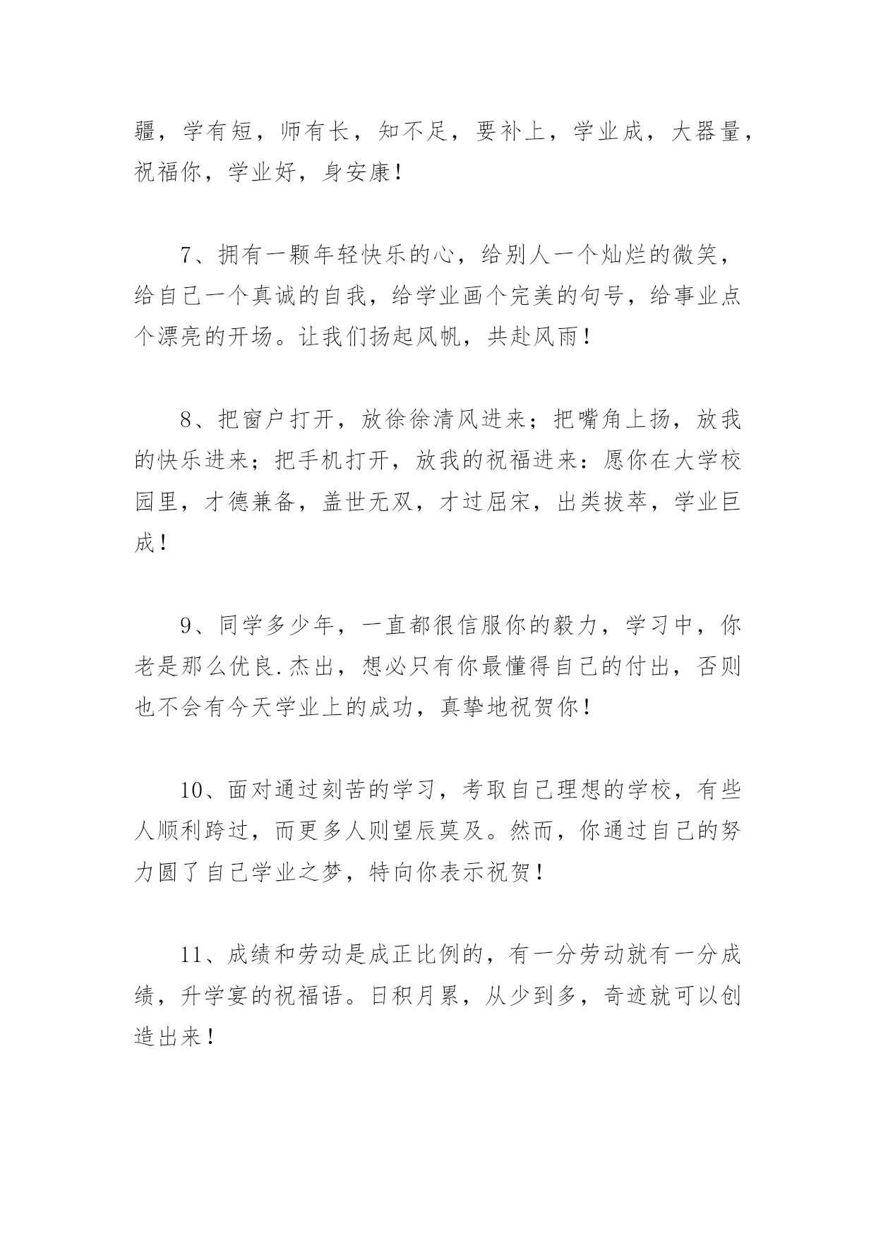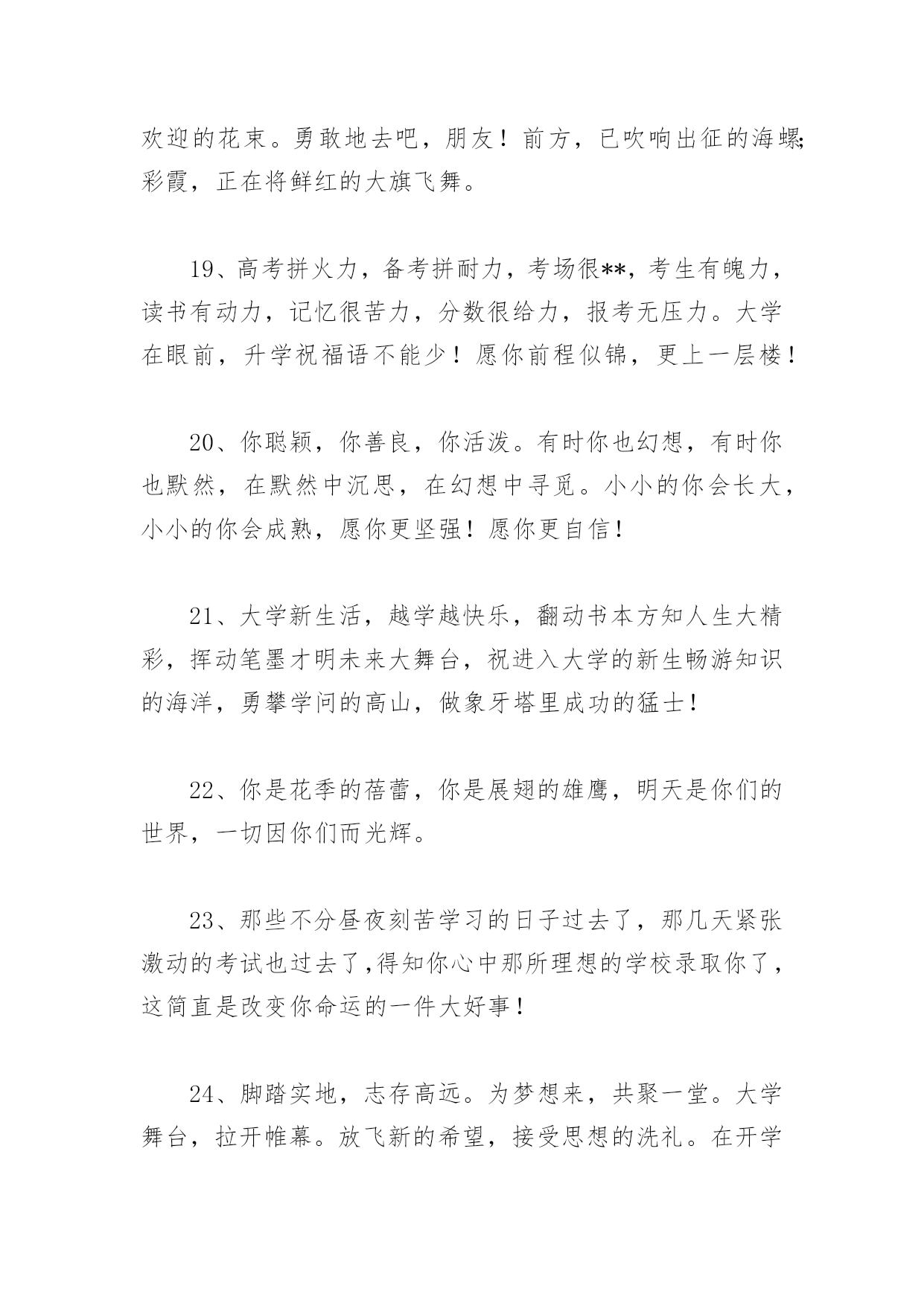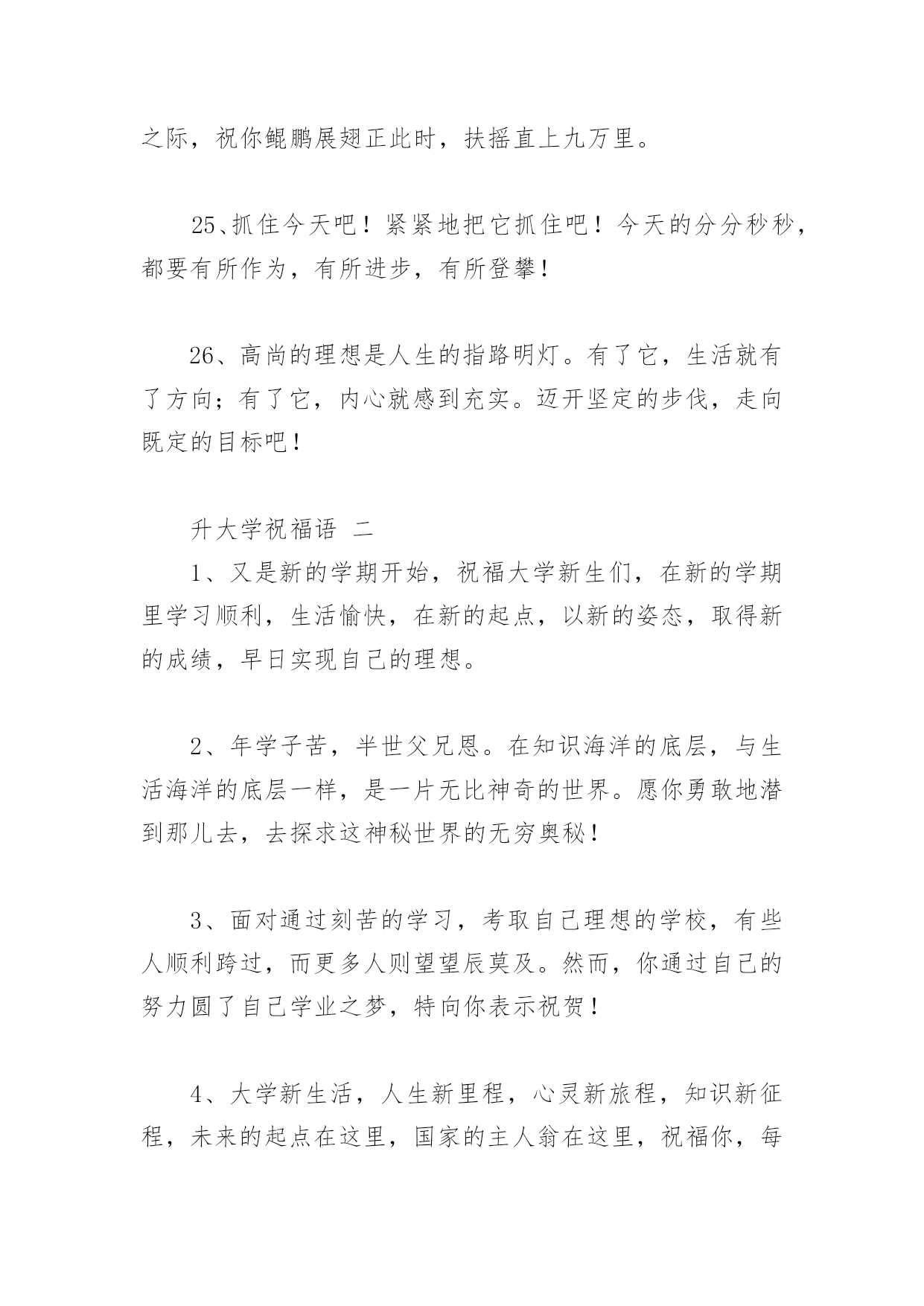 升大学祝福语(精选53句) 升大学祝福语一1、恭喜你考取自己理想的大学,恭喜你即将开始全新的生活。外面的世界很精彩,外面的世界很新奇。期待你成为学识广博,勇于创新的栋梁之才,新的天地再展新的风采。2、祝贺你考取了自己理想的大学,那段艰苦奋斗.刻苦学习的日子可以暂画一个句号了,这段日子,让自己干自愿事,吃顺口饭,听轻松话,睡安心觉吧!3、大学里充满了无限可能,它可能将你变得更坏,也可能将你变得更好。在汲取知识的同时,千万要注意加强下品格修养。做学问,先学做人!4、涨了,涨了,涨了,你的分数涨了!升了,升了,升了,你的学业升了!圆了,圆了,圆了,你的梦想圆了!加油!5、你一定想不到当我得知你考上大学的那一刻是多么的兴奋,你的刻苦努力得到了回报,你是你们全家人的骄傲和自豪,真诚地祝贺你!6、大学堂,学业忙,多吸收,多储藏,学有时,知无疆,学有短,师有长,知不足,要补上,学业成,大器量,祝福你,学业好,身安康!7、拥有一颗年轻快乐的心,给别人一个灿烂的微笑,给自己一个真诚的自我,给学业画个完美的句号,给事业点个漂亮的开场。让我们扬起风帆,共赴风雨!8、把窗户打开,放徐徐清风进来;把嘴角上扬,放我的快乐进来;把手机打开,放我的祝福进来:愿你在大学校园里,才德兼备,盖世无双,才过屈宋,出类拔萃,学业巨成!9、同学多少年,一直都很信服你的毅力,学习中,你老是那么优良.杰出,想必只有你最懂得自己的付出,否则也不会有今天学业上的成功,真挚地祝贺你!10、面对通过刻苦的学习,考取自己理想的学校,有些人顺利跨过,而更多人则望辰莫及。然而,你通过自己的努力圆了自己学业之梦,特向你表示祝贺!11、成绩和劳动是成正比例的,有一分劳动就有一分成绩,升学宴的祝福语。日积月累,从少到多,奇迹就可以创造出来!12、年寒窗苦不苦,苦尽甘来就不苦,大学生活累不累,多学知识多受累,读书苦累有何畏,人生铺垫在此位,学海无涯知无涯,勤奋才是最可贵,祝你学有所成,知识翻倍!13、在大学这块沃土上,找到一块属于你的土地,然后深深的扎根,为了头顶的那片阳光,为了那晶莹的雨露,努力的向上生长吧!14、进入大学,进入新的生活,新的环境,新的同学。有学有玩,自己把握,学玩结合,收获多多。祝愿大学生活愉快,学业进步。15、没有窘迫的失败,就不会有自豪的成功;失败不可怕,只要能从失败中站起来。16、为你的付出加油,为你的执着喝彩,为你的努力鼓掌,为你的明天祝福,祝你早日实现心中所想,祝你拥有最美好的未来!17、汗水换来回报,录取带来喜悦,未来不再遥远,前途露出光芒,忘掉黑色辛劳,把握机遇挑战,相信自己,你能行,以百倍的自信迎接明天的挑战,加油!18、生活的海洋已铺开金色的路,浪花正分列两旁摇着欢迎的花束。勇敢地去吧,朋友!前方,已吹响出征的海螺;彩霞,正在将鲜红的大旗飞舞。19、高考拼火力,备考拼耐力,考场很**,考生有魄力,读书有动力,记忆很苦力,分数很给力,报考无压力。大学在眼前,升学祝福语不能少!愿你前程似锦,更上一层楼!20、你聪颖,你善良,你活泼。有时你也幻想,有时你也默然,在默然中沉思,在幻想中寻觅。小小的你会长大,小小的你会成熟,愿你更坚强!愿你更自信!21、大学新生活,越学越快乐,翻动书本方知人生大精彩,挥动笔墨才明未来大舞台,祝进入大学的新生畅游知识的海洋,勇攀学问的高山,做象牙塔里成功的猛士!22、你是花季的蓓蕾,你是展翅的雄鹰,明天是你们的世界,一切因你们而光辉。23、那些不分昼夜刻苦学习的日子过去了,那几天紧张激动的考试也过去了,得知你心中那所理想的学校录取你了,这简直是改变你命运的一件大好事!24、脚踏实地,志存高远。为梦想来,共聚一堂。大学舞台,拉开帷幕。放飞新的希望,接受思想的洗礼。在开学之际,祝你鲲鹏展翅正此时,扶摇直上九万里。25、抓住今天吧!紧紧地把它抓住吧!今天的分分秒秒,都要有所作为,有所进步,有所登攀!26、高尚的理想是人生的指路明灯。有了它,生活就有了方向;有了它,内心就感到充实。迈开坚定的步伐,走向既定的目标吧!升大学祝福语二1、又是新的学期开始,祝福大学新生们,在新的学期里学习顺利,生活愉快,在新的起点,以新的姿态,取得新的成绩,早日实现自己的理想。2、年学子苦,半世父兄恩。在知识海洋的底层,与生活海洋的底层一样,是一片无比神奇的世界。愿你勇敢地潜到那儿去,去探求这神秘世界的无穷奥秘!3、面对通过刻苦的学习,考取自己理想的学校,有些人顺利跨过,而更多人则望望辰莫及。然而,你通过自己的努力圆了自己学业之梦,特向你表示祝贺!4、大学新生活,人生新里程,心灵新旅程,知识新征程,未来的起点在这里,国家的主人翁在这里,祝福你,每位踏进大学校门的新同学,愿你们学的精彩,玩的快乐!5、特殊地要向你表示热烈的祝贺!我的朋友,你被理想中的学校录取了,这要算