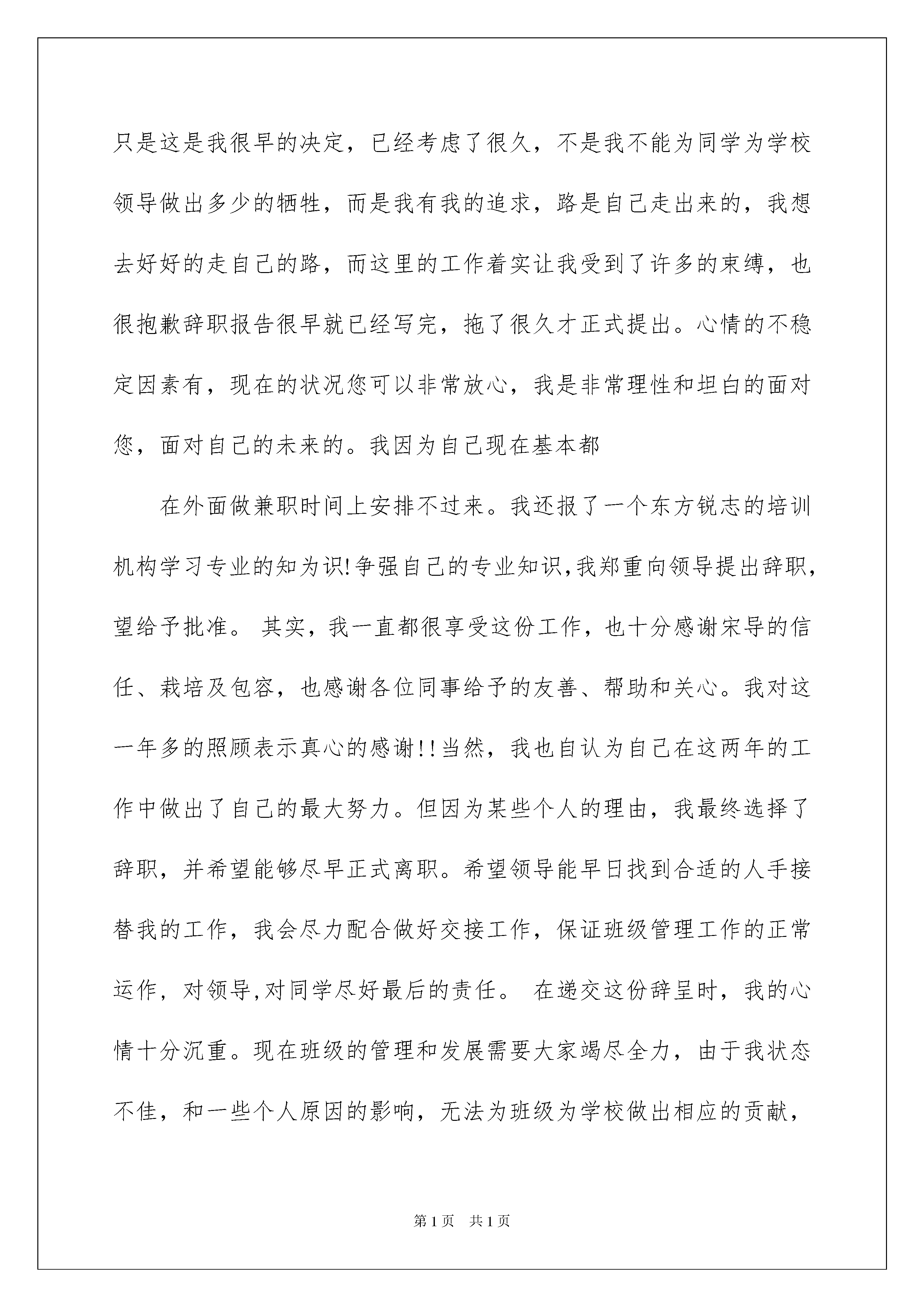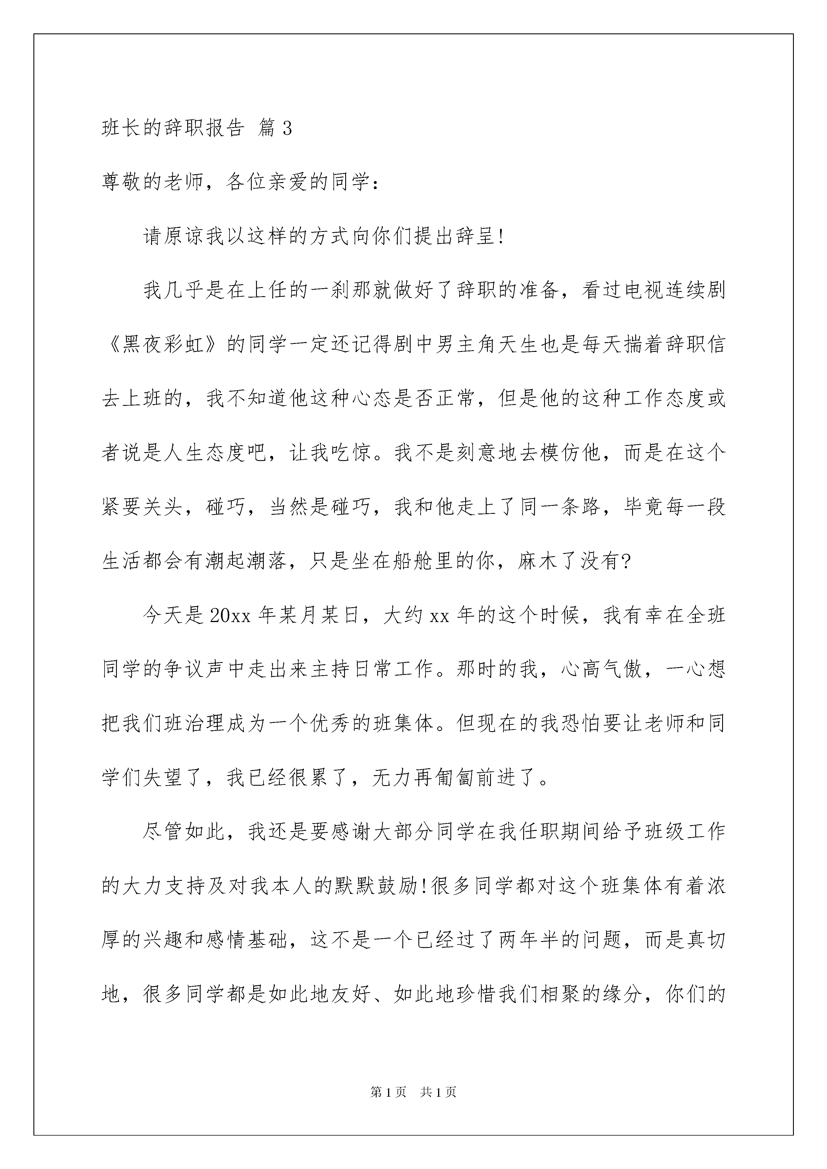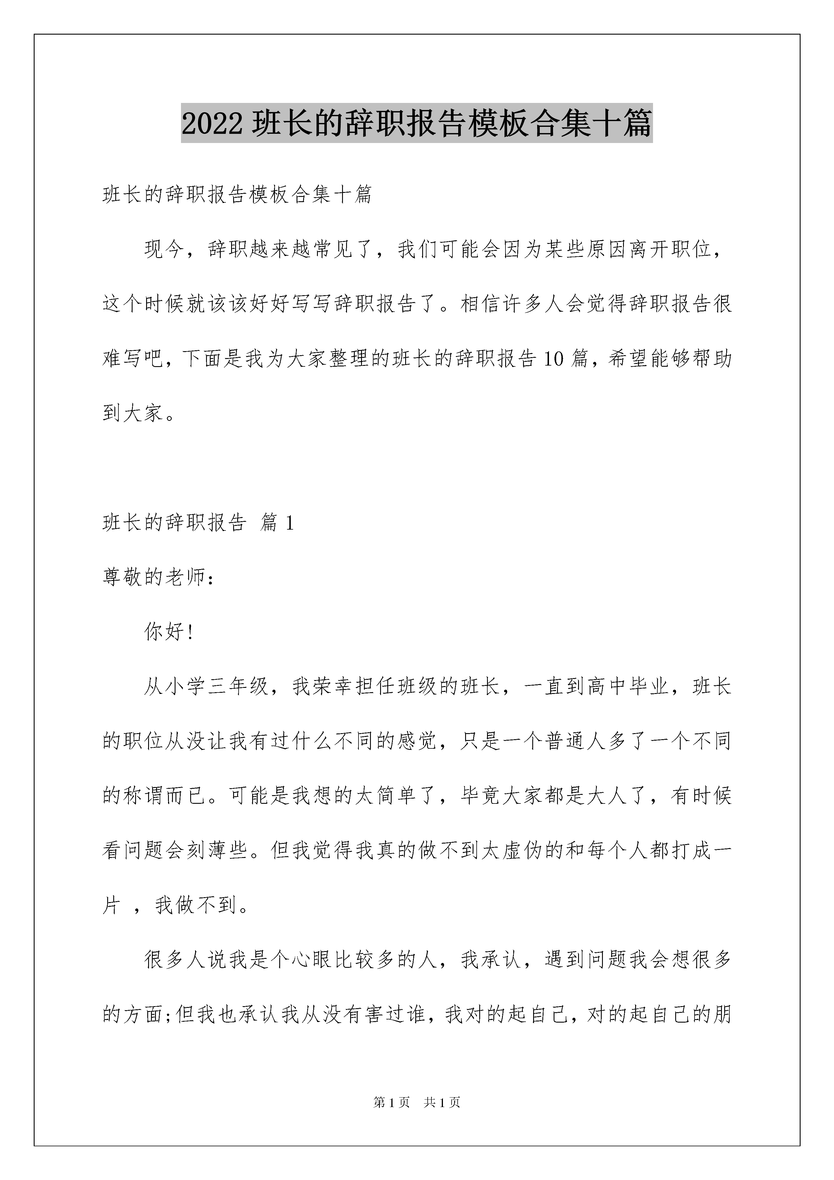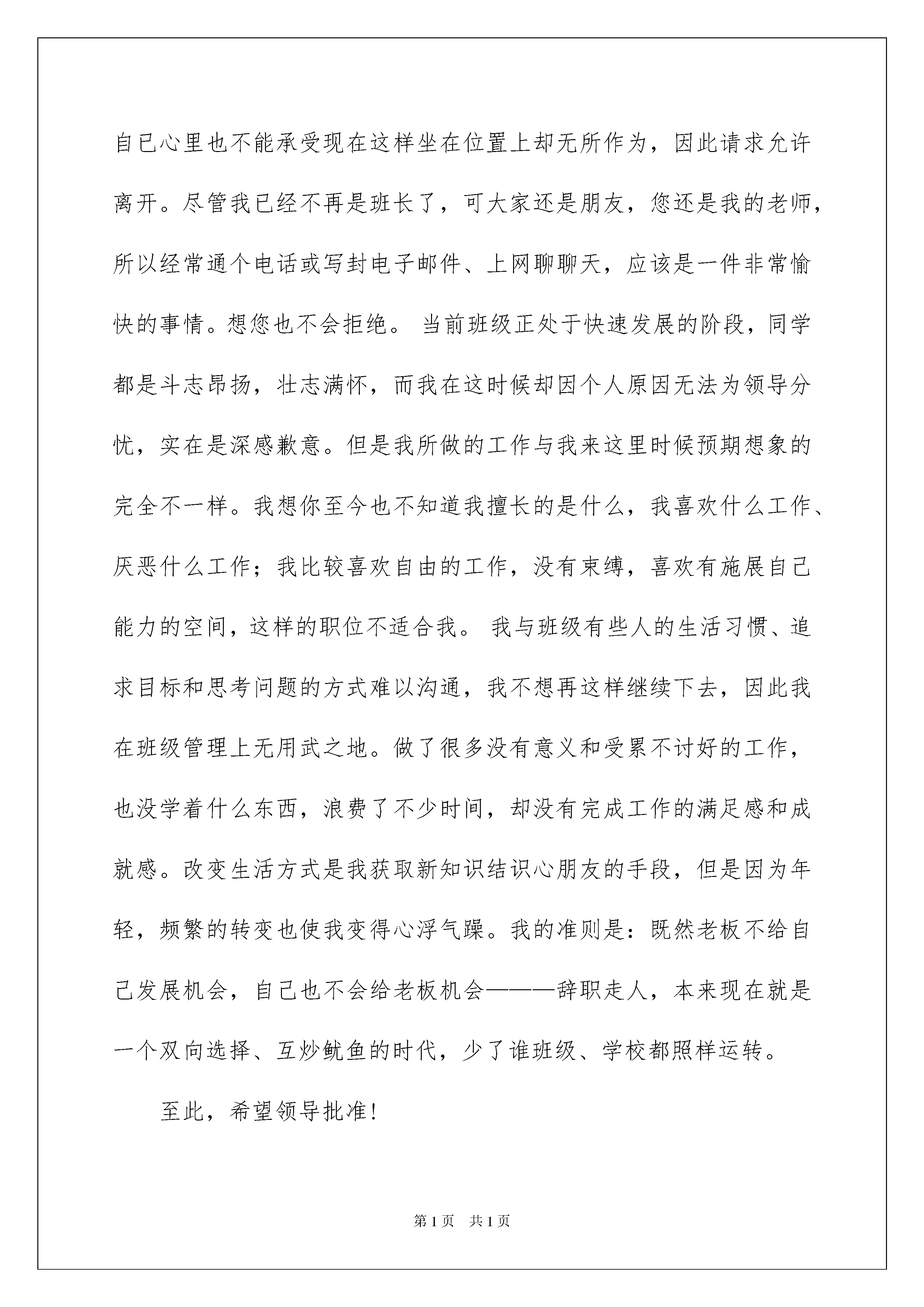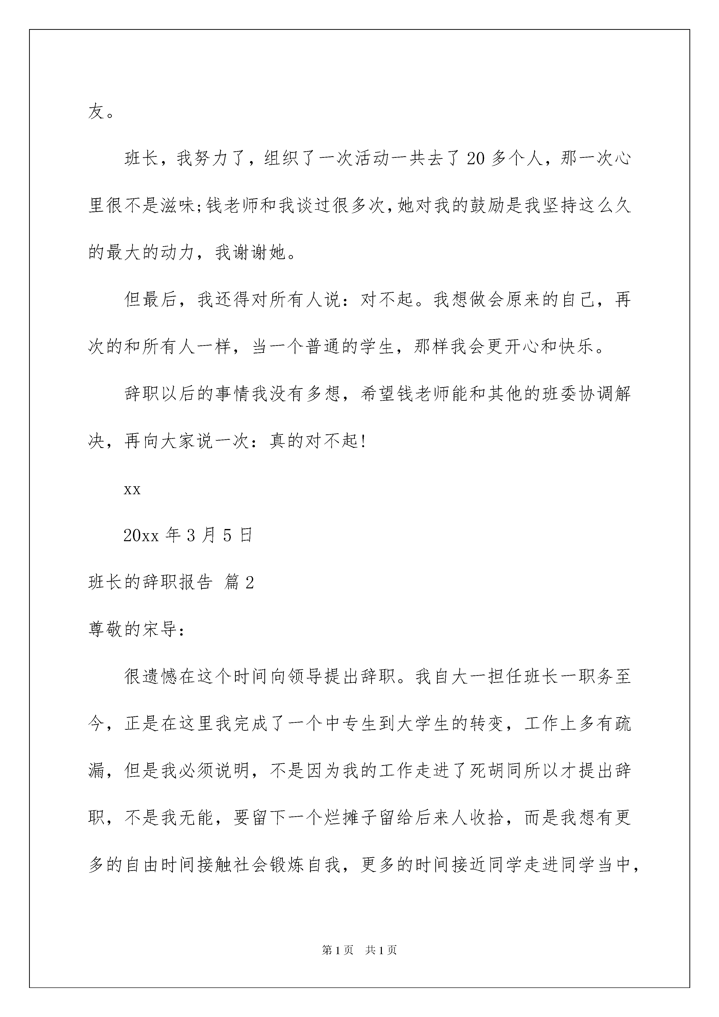 2022班长的辞职报告模板合集十篇班长的辞职报告模板合集十篇现今,辞职越来越常见了,我们可能会因为某些原因离开职位,这个时候就该该好好写写辞职报告了。相信许多人会觉得辞职报告很难写吧,下面是我为大家整理的班长的辞职报告10篇,希望能够帮助到大家。班长的辞职报告篇1尊敬的老师:你好!从小学三年级,我荣幸担任班级的班长,一直到高中毕业,班长的职位从没让我有过什么不同的感觉,只是一个普通人多了一个不同的称谓而已。可能是我想的太简单了,毕竟大家都是大人了,有时候看问题会刻薄些。但我觉得我真的做不到太虚伪的和每个人都打成一片,我做不到。很多人说我是个心眼比较多的人,我承认,遇到问题我会想很多的方面;但我也承认我从没有害过谁,我对的起自己,对的起自己的朋友。班长,我努力了,组织了一次活动一共去了20多个人,那一次心里很不是滋味;钱老师和我谈过很多次,她对我的鼓励是我坚持这么久的最大的动力,我谢谢她。但最后,我还得对所有人说:对不起。我想做会原来的自己,再次的和所有人一样,当一个普通的学生,那样我会更开心和快乐。辞职以后的事情我没有多想,希望钱老师能和其他的班委协调解决,再向大家说一次:真的对不起!xx20xx年3月5日班长的辞职报告篇2尊敬的宋导:很遗憾在这个时间向领导提出辞职。我自大一担任班长一职务至今,正是在这里我完成了一个中专生到大学生的转变,工作上多有疏漏,但是我必须说明,不是因为我的工作走进了死胡同所以才提出辞职,不是我无能,要留下一个烂摊子留给后来人收拾,而是我想有更多的自由时间接触社会锻炼自我,更多的时间接近同学走进同学当中,只是这是我很早的决定,已经考虑了很久,不是我不能为同学为学校领导做出多少的牺牲,而是我有我的追求,路是自己走出来的,我想去好好的走自己的路,而这里的工作着实让我受到了许多的束缚,也很抱歉辞职报告很早就已经写完,拖了很久才正式提出。心情的不稳定因素有,现在的状况您可以非常放心,我是非常理性和坦白的面对您,面对自己的未来的。我因为自己现在基本都在外面做兼职时间上安排不过来。我还报了一个东方锐志的培训机构学习专业的知为识!争强自己的专业知识,我郑重向领导提出辞职,望给予批准。其实,我一直都很享受这份工作,也十分感谢宋导的信任、栽培及包容,也感谢各位同事给予的友善、帮助和关心。我对这一年多的照顾表示真心的感谢!!当然,我也自认为自己在这两年的工作中做出了自己的最大努力。但因为某些个人的理由,我最终选择了辞职,并希望能够尽早正式离职。希望领导能早日找到合适的人手接替我的工作,我会尽力配合做好交接工作,保证班级管理工作的正常运作,对领导,对同学尽好最后的责任。在递交这份辞呈时,我的心情十分沉重。现在班级的管理和发展需要大家竭尽全力,由于我状态不佳,和一些个人原因的影响,无法为班级为学校做出相应的贡献,自已心里也不能承受现在这样坐在位置上却无所作为,因此请求允许离开。尽管我已经不再是班长了,可大家还是朋友,您还是我的老师,所以经常通个电话或写封电子邮件、上网聊聊天,应该是一件非常愉快的事情。想您也不会拒绝。当前班级正处于快速发展的阶段,同学都是斗志昂扬,壮志满怀,而我在这时候却因个人原因无法为领导分忧,实在是深感歉意。但是我所做的工作与我来这里时候预期想象的完全不一样。我想你至今也不知道我擅长的是什么,我喜欢什么工作、厌恶什么工作;我比较喜欢自由的工作,没有束缚,喜欢有施展自己能力的空间,这样的职位不适合我。我与班级有些人的生活习惯、追求目标和思考问题的方式难以沟通,我不想再这样继续下去,因此我在班级管理上无用武之地。做了很多没有意义和受累不讨好的工作,也没学着什么东西,浪费了不少时间,却没有完成工作的满足感和成就感。改变生活方式是我获取新知识结识心朋友的手段,但是因为年轻,频繁的转变也使我变得心浮气躁。我的准则是:既然老板不给自己发展机会,自己也不会给老板机会———辞职走人,本来现在就是一个双向选择、互炒鱿鱼的时代,少了谁班级、学校都照样运转。至此,希望领导批准!班长的辞职报告篇3尊敬的老师,各位亲爱的同学:请原谅我以这样的方式向你们提出辞呈!我几乎是在上任的一刹那就做好了辞职的准备,看过电视连续剧《黑夜彩虹》的同学一定还记得剧中男主角天生也是每天揣着辞职信去上班的,我不知道他这种心态是否正常,但是他的这种工作态度或者说是人生态度吧,让我吃惊。我不是刻意地去模仿他,而是在这个紧要关头,碰巧,当然是碰巧,我和他走上了同一条路,毕竟每一段生活都会有潮起潮落,只是坐在船舱里的你,麻木了没有?今天是20xx年某月某日,大约xx年的这个时候,我有幸在全班同学的争议声中走