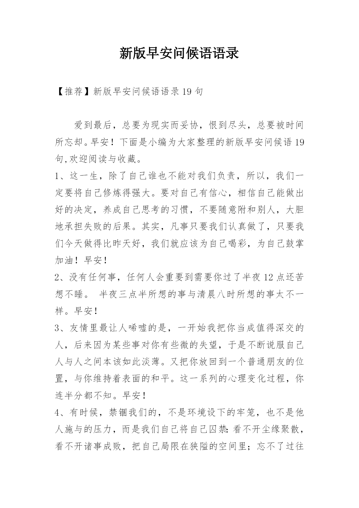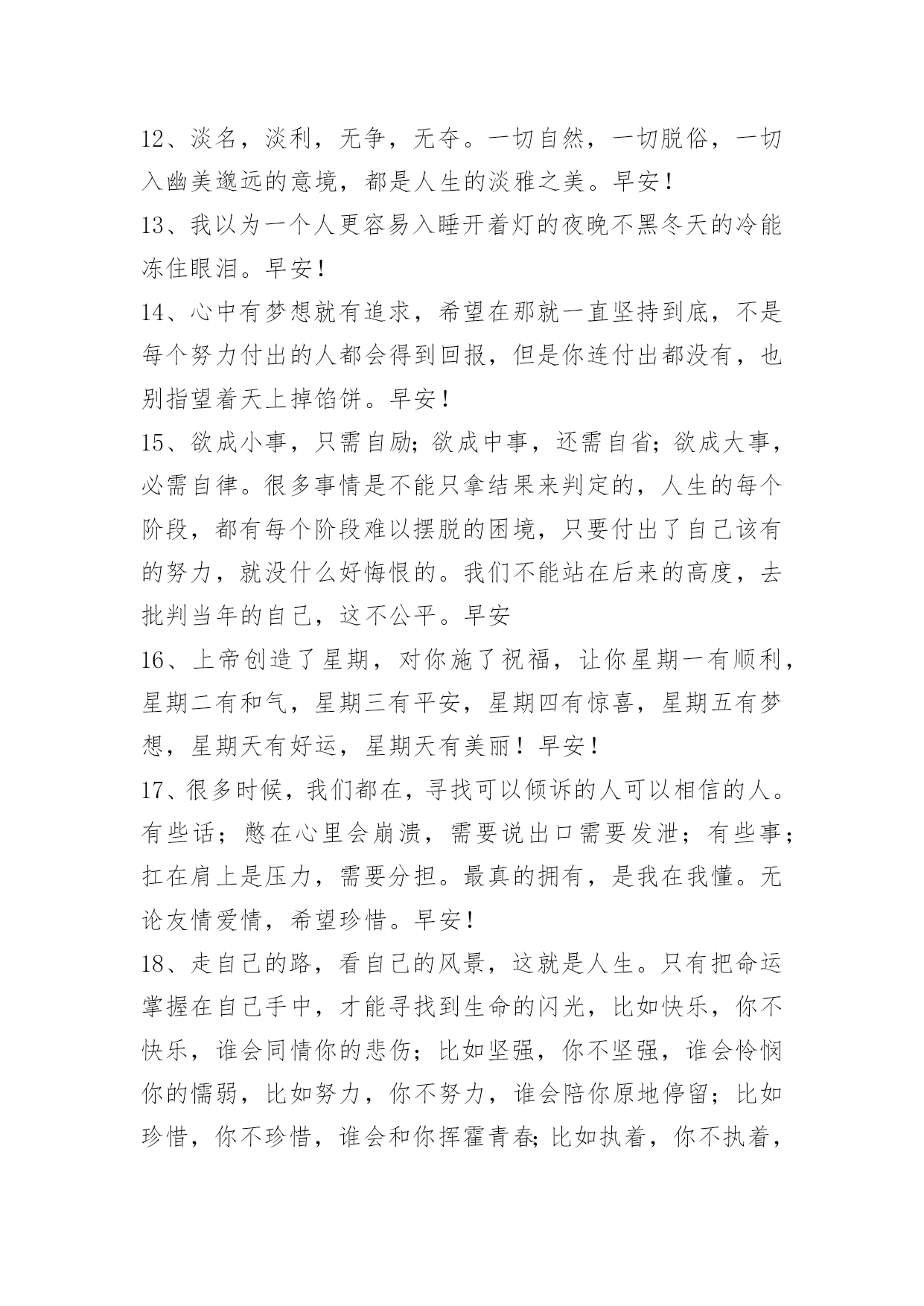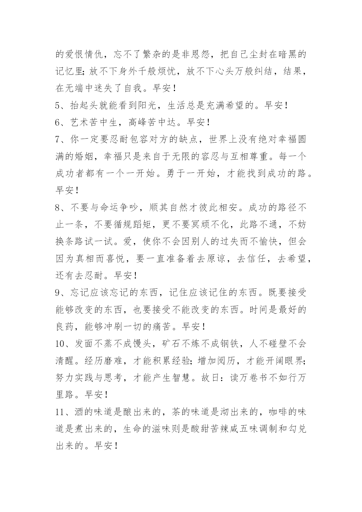 新版早安问候语语录 【推荐】新版早安问候语语录19句爱到最后,总要为现实而妥协,恨到尽头,总要被时间所忘却。早安!下面是小编为大家整理的新版早安问候语19句,欢迎阅读与收藏。1、这一生,除了自己谁也不能对我们负责,所以,我们一定要将自己修炼得强大。要对自己有信心,相信自己能做出好的决定,养成自己思考的习惯,不要随意附和别人,大胆地承担失败的后果。其实,凡事只要我们认真做了,只要我们今天做得比昨天好,我们就应该为自己喝彩,为自己鼓掌加油!早安!2、没有任何事,任何人会重要到需要你过了半夜12点还苦想不睡。半夜三点半所想的事与清晨八时所想的事太不一样。早安!3、友情里最让人唏嘘的是,一开始我把你当成值得深交的人,后来因为某些事对你有些微的失望,于是不断说服自己人与人之间本该如此淡薄。又把你放回到一个普通朋友的位置,与你维持着表面的和平。这一系列的心理变化过程,你连半分都不知。早安!4、有时候,禁锢我们的,不是环境设下的牢笼,也不是他人施与的压力,而是我们自己将自己囚禁:看不开尘缘聚散,看不开诸事成败,把自己局限在狭隘的空间里;忘不了过往的爱恨情仇,忘不了繁杂的是非恩怨,把自己尘封在暗黑的记忆里;放不下身外千般烦忧,放不下心头万般纠结,结果,在无端中迷失了自我。早安!5、抬起头就能看到阳光,生活总是充满希望的。早安!6、艺术苦中生,高峰苦中达。早安!7、你一定要忍耐包容对方的缺点,世界上没有绝对幸福圆满的婚姻,幸福只是来自于无限的容忍与互相尊重。每一个成功者都有一个一开始。勇于一开始,才能找到成功的路。早安!8、不要与命运争吵,顺其自然才彼此相安。成功的路径不止一条,不要循规蹈矩,更不要冥顽不化,此路不通,不妨换条路试一试。爱,使你不会因别人的过失而不愉快,但会因为真相而喜悦,要一直准备着去原谅,去信任,去希望,还有去忍耐。早安!9、忘记应该忘记的东西,记住应该记住的东西。既要接受能够改变的东西,也要接受不能改变的东西。时间是最好的良药,能够冲刷一切的痛苦。早安!10、发面不蒸不成馒头,矿石不炼不成钢铁,人不碰壁不会清醒。经历磨难,才能积累经验;增加阅历,才能开阔眼界;努力实践与思考,才能产生智慧。故日:读万卷书不如行万里路。早安!11、酒的味道是酿出来的,茶的味道是沏出来的,咖啡的味道是煮出来的,生命的滋味则是酸甜苦辣咸五味调制和勾兑出来的。早安!12、淡名,淡利,无争,无夺。一切自然,一切脱俗,一切入幽美邈远的意境,都是人生的淡雅之美。早安!13、我以为一个人更容易入睡开着灯的夜晚不黑冬天的冷能冻住眼泪。早安!14、心中有梦想就有追求,希望在那就一直坚持到底,不是每个努力付出的人都会得到回报,但是你连付出都没有,也别指望着天上掉馅饼。早安!15、欲成小事,只需自励;欲成中事,还需自省;欲成大事,必需自律。很多事情是不能只拿结果来判定的,人生的每个阶段,都有每个阶段难以摆脱的困境,只要付出了自己该有的努力,就没什么好悔恨的。我们不能站在后来的高度,去批判当年的自己,这不公平。早安16、上帝创造了星期,对你施了祝福,让你星期一有顺利,星期二有和气,星期三有平安,星期四有惊喜,星期五有梦想,星期天有好运,星期天有美丽!早安!17、很多时候,我们都在,寻找可以倾诉的人可以相信的人。有些话;憋在心里会崩溃,需要说出口需要发泄;有些事;扛在肩上是压力,需要分担。最真的拥有,是我在我懂。无论友情爱情,希望珍惜。早安!18、走自己的路,看自己的风景,这就是人生。只有把命运掌握在自己手中,才能寻找到生命的闪光,比如快乐,你不快乐,谁会同情你的悲伤;比如坚强,你不坚强,谁会怜悯你的懦弱,比如努力,你不努力,谁会陪你原地停留;比如珍惜,你不珍惜,谁会和你挥霍青春;比如执着,你不执着,谁会与你共进退…早安!19、坚持才是成功之道,每一个你羡慕的收获都是努力用心拼来的!早安!