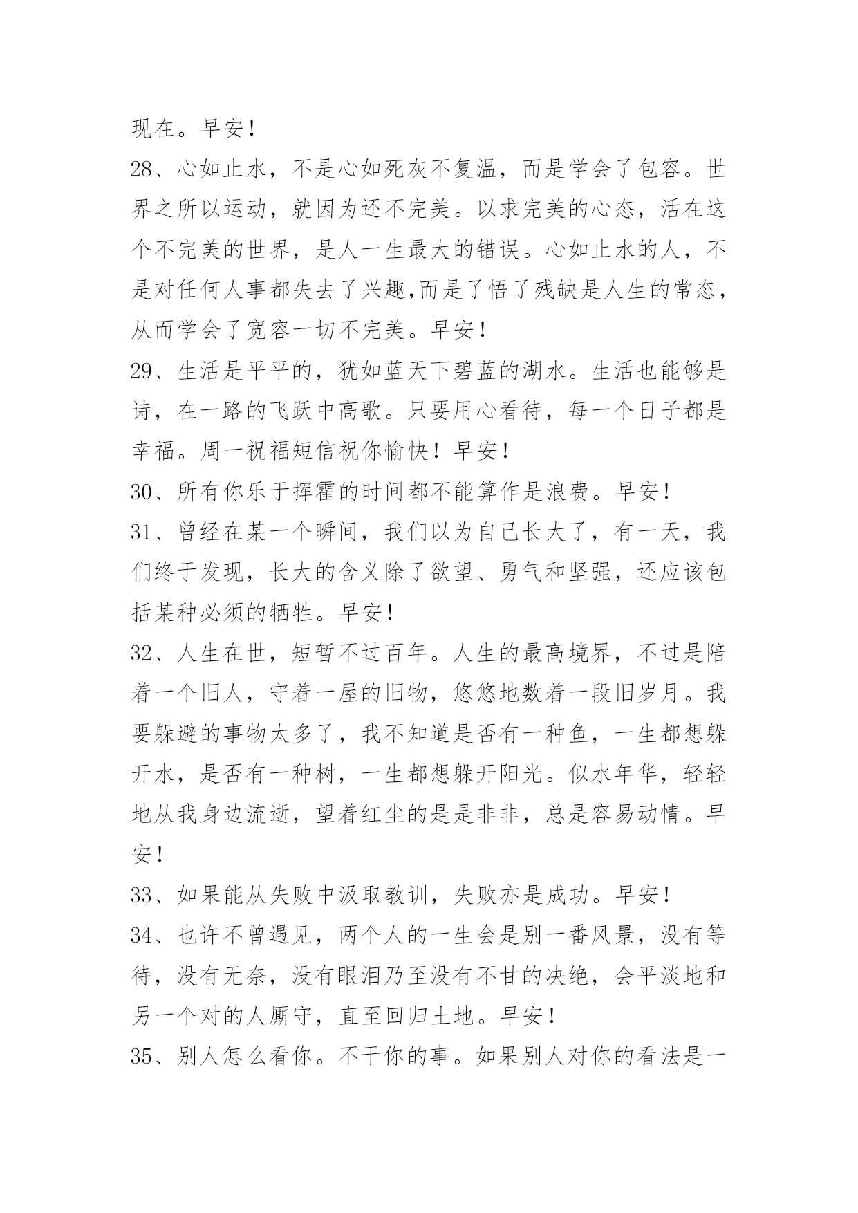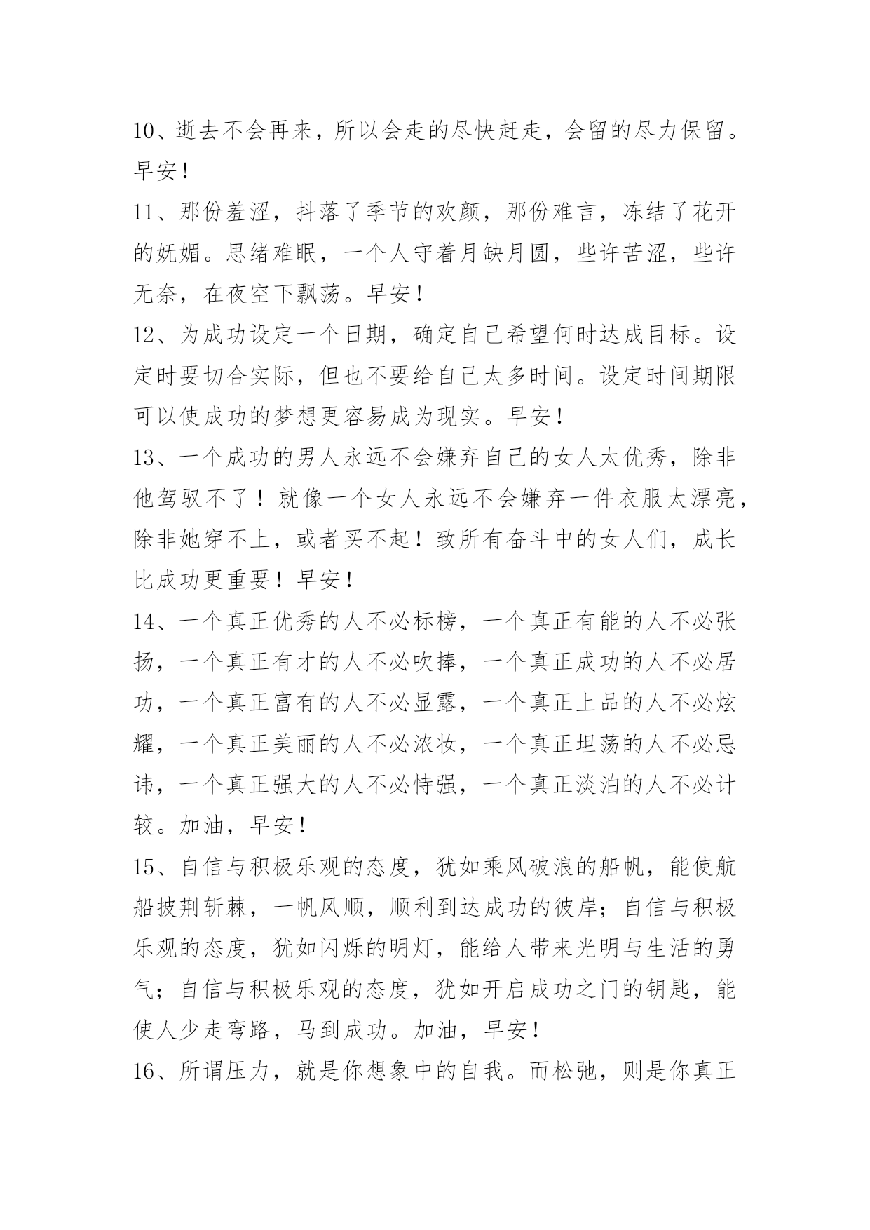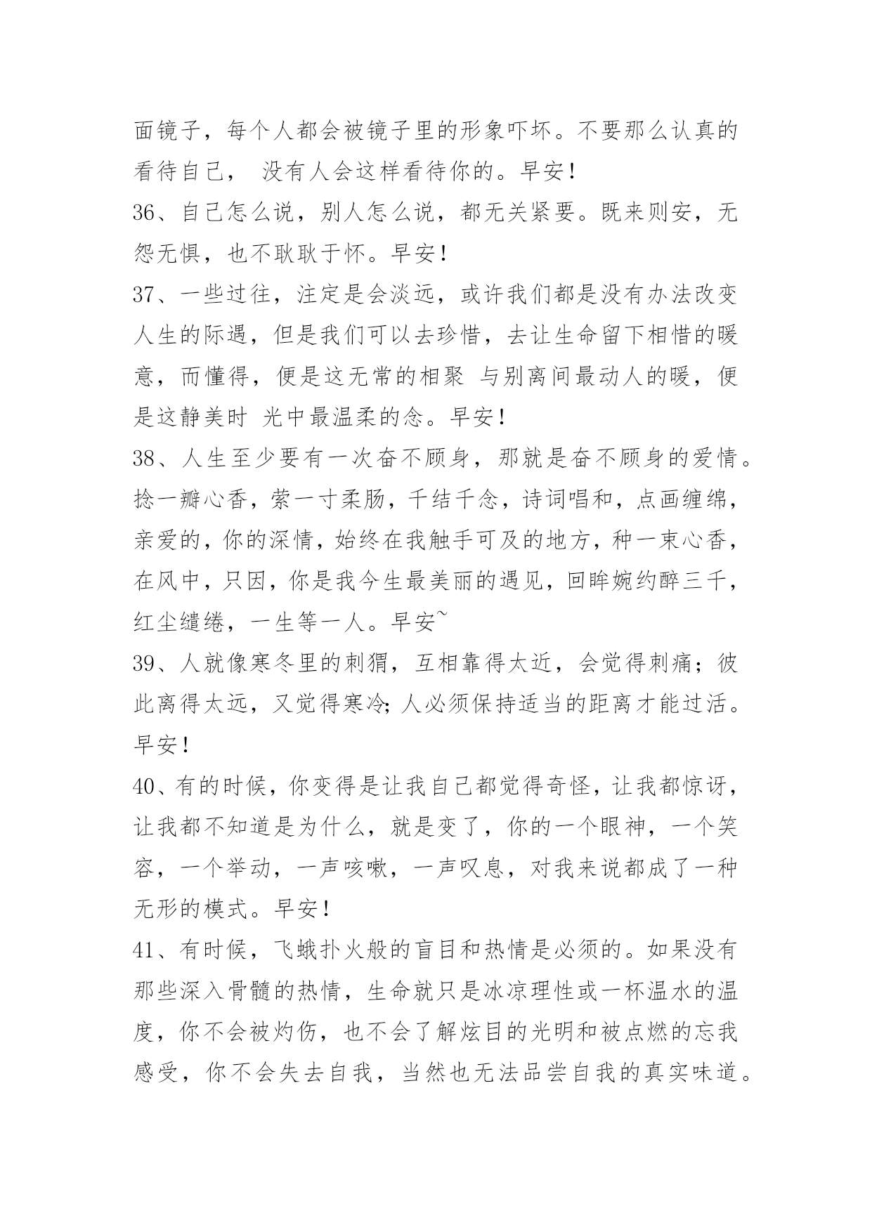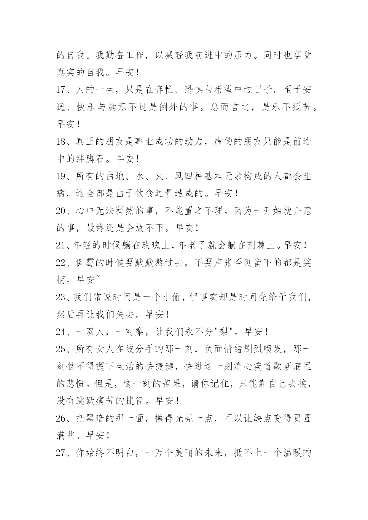 新版早安问候语语录 2023年常用新版早安问候语语录大合集70句一个人时要像一个团队,一个团队时要像一个人。早安!以下是小编精心准备的新版早安问候语70句,希望对大家有所帮助。1、快乐没有本来就是坏的,但是有些快乐的产生者却带来了比快乐大许多倍的烦扰。早安!2、现实社会,只要做好自己,才会成功。早安!3、你能够充满信心地走出家门你就能充满信心地回来。因为上苍总垂青一个充满信心的人。早安!4、我会回来,带回满身木棉和紫荆的清香,然后告诉你,我已找到天堂。早安!5、事情不分大小,一定要问问自己的内心,到底什么才是我们真正想要的;而无论你选择了什么,首先要明确自己的方向,只有这样,我们才有可能朝着正确的目标前进。早安!6、如果人生不冒险,怎么能知道,那些梦想属不属我们。早安!7、如果你四点钟要来,那么我在三点钟就会感到幸福了,这就是爱情。早安!8、最复杂的问题,往往有最简单的答案。早安!9、人性最大的弱点,不是贪婪,不是懦弱,而是一切都想尽善尽美。早安!10、逝去不会再来,所以会走的尽快赶走,会留的尽力保留。早安!11、那份羞涩,抖落了季节的欢颜,那份难言,冻结了花开的妩媚。思绪难眠,一个人守着月缺月圆,些许苦涩,些许无奈,在夜空下飘荡。早安!12、为成功设定一个日期,确定自己希望何时达成目标。设定时要切合实际,但也不要给自己太多时间。设定时间期限可以使成功的梦想更容易成为现实。早安!13、一个成功的男人永远不会嫌弃自己的女人太优秀,除非他驾驭不了!就像一个女人永远不会嫌弃一件衣服太漂亮,除非她穿不上,或者买不起!致所有奋斗中的女人们,成长比成功更重要!早安!14、一个真正优秀的人不必标榜,一个真正有能的人不必张扬,一个真正有才的人不必吹捧,一个真正成功的人不必居功,一个真正富有的人不必显露,一个真正上品的人不必炫耀,一个真正美丽的人不必浓妆,一个真正坦荡的人不必忌讳,一个真正强大的人不必恃强,一个真正淡泊的人不必计较。加油,早安!15、自信与积极乐观的态度,犹如乘风破浪的船帆,能使航船披荆斩棘,一帆风顺,顺利到达成功的彼岸;自信与积极乐观的态度,犹如闪烁的明灯,能给人带来光明与生活的勇气;自信与积极乐观的态度,犹如开启成功之门的钥匙,能使人少走弯路,马到成功。加油,早安!16、所谓压力,就是你想象中的自我。而松弛,则是你真正的自我。我勤奋工作,以减轻我前进中的压力。同时也享受真实的自我。早安!17、人的一生,只是在奔忙、恐惧与希望中过日子。至于安逸、快乐与满意不过是例外的事。总而言之,是乐不抵苦。早安!18、真正的朋友是事业成功的动力,虚伪的朋友只能是前进中的绊脚石。早安!19、所有的由地、水、火、风四种基本元素构成的人都会生病,这全部是由于饮食过量造成的。早安!20、心中无法释然的事,不能置之不理。因为一开始就介意的事,最终还是会放不下。早安!21、年轻的时候躺在玫瑰上,年老了就会躺在荆棘上。早安!22、倒霉的时候要默默熬过去,不要声张否则留下的都是笑柄。早安~23、我们常说时间是一个小偷,但事实却是时间先给予我们,然后再让我们失去。早安!24、一双人,一对梨,让我们永不分"梨"。早安!25、所有女人在被分手的那一刻,负面情绪剧烈喷发,那一刻恨不得摁下生活的快捷键,快进这一刻痛心疾首歇斯底里的悲愤。但是,这一刻的苦果,请你记住,只能靠自己去挨,没有跳跃痛苦的捷径。早安!26、把黑暗的那一面,擦得光亮一点,可以让缺点变得更圆满些。早安!27、你始终不明白,一万个美丽的未来,抵不上一个温暖的现在。早安!28、心如止水,不是心如死灰不复温,而是学会了包容。世界之所以运动,就因为还不完美。以求完美的心态,活在这个不完美的世界,是人一生最大的错误。心如止水的人,不是对任何人事都失去了兴趣,而是了悟了残缺是人生的常态,从而学会了宽容一切不完美。早安!29、生活是平平的,犹如蓝天下碧蓝的湖水。生活也能够是诗,在一路的飞跃中高歌。只要用心看待,每一个日子都是幸福。周一祝福短信祝你愉快!早安!30、所有你乐于挥霍的时间都不能算作是浪费。早安!31、曾经在某一个瞬间,我们以为自己长大了,有一天,我们终于发现,长大的含义除了欲望、勇气和坚强,还应该包括某种必须的牺牲。早安!32、人生在世,短暂不过百年。人生的最高境界,不过是陪着一个旧人,守着一屋的旧物,悠悠地数着一段旧岁月。我要躲避的事物太多了,我不知道是否有一种鱼,一生都想躲开水,是否有一种树,一生都想躲开阳光。似水年华,轻轻地从我身边流逝,望着红尘的是是非非,总是容易动情。早安!33、如果能从失败中汲取教训,失败亦是成功。早安!34、也许不曾遇见,两个人的一生会是别一番风景,没有等待,没有无奈,没有眼泪乃至没有不甘的决绝,会平淡地和另一个对的人厮守,直至回归土地。早安!35、别人怎么看你。不干