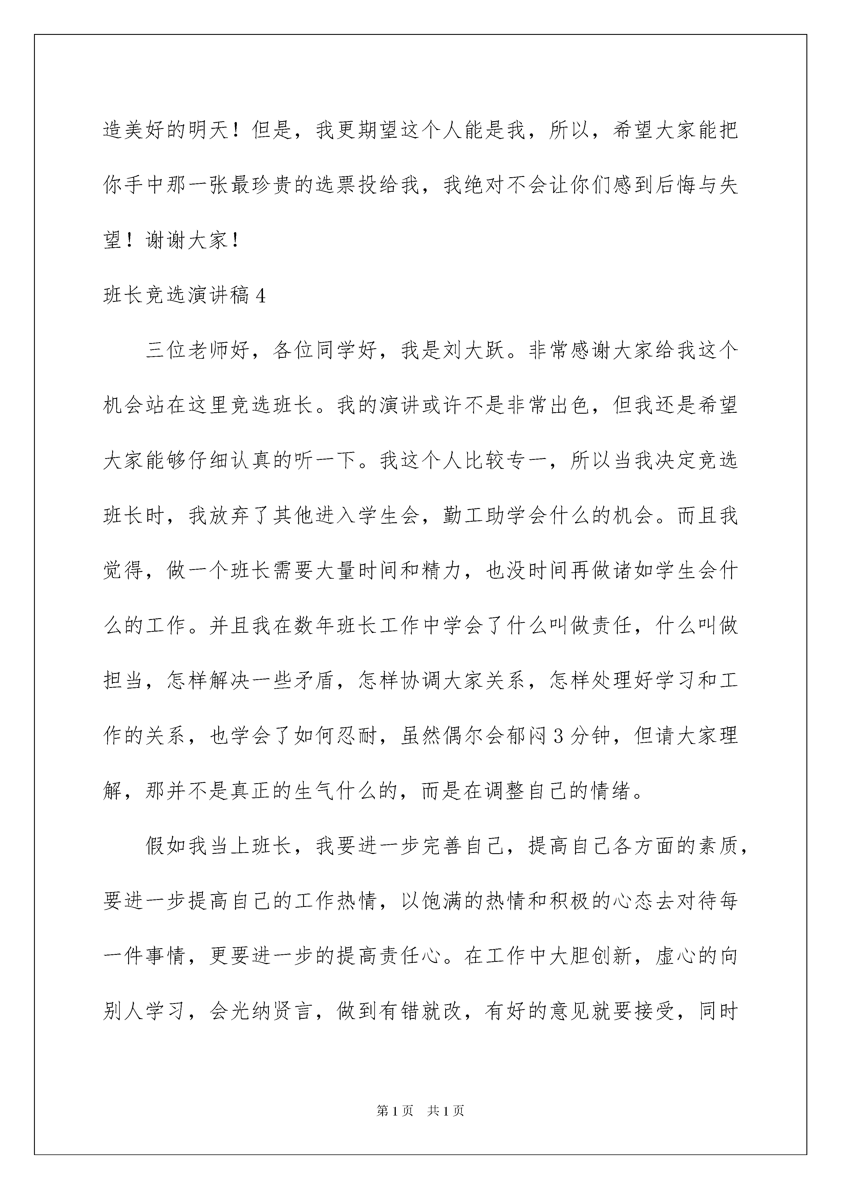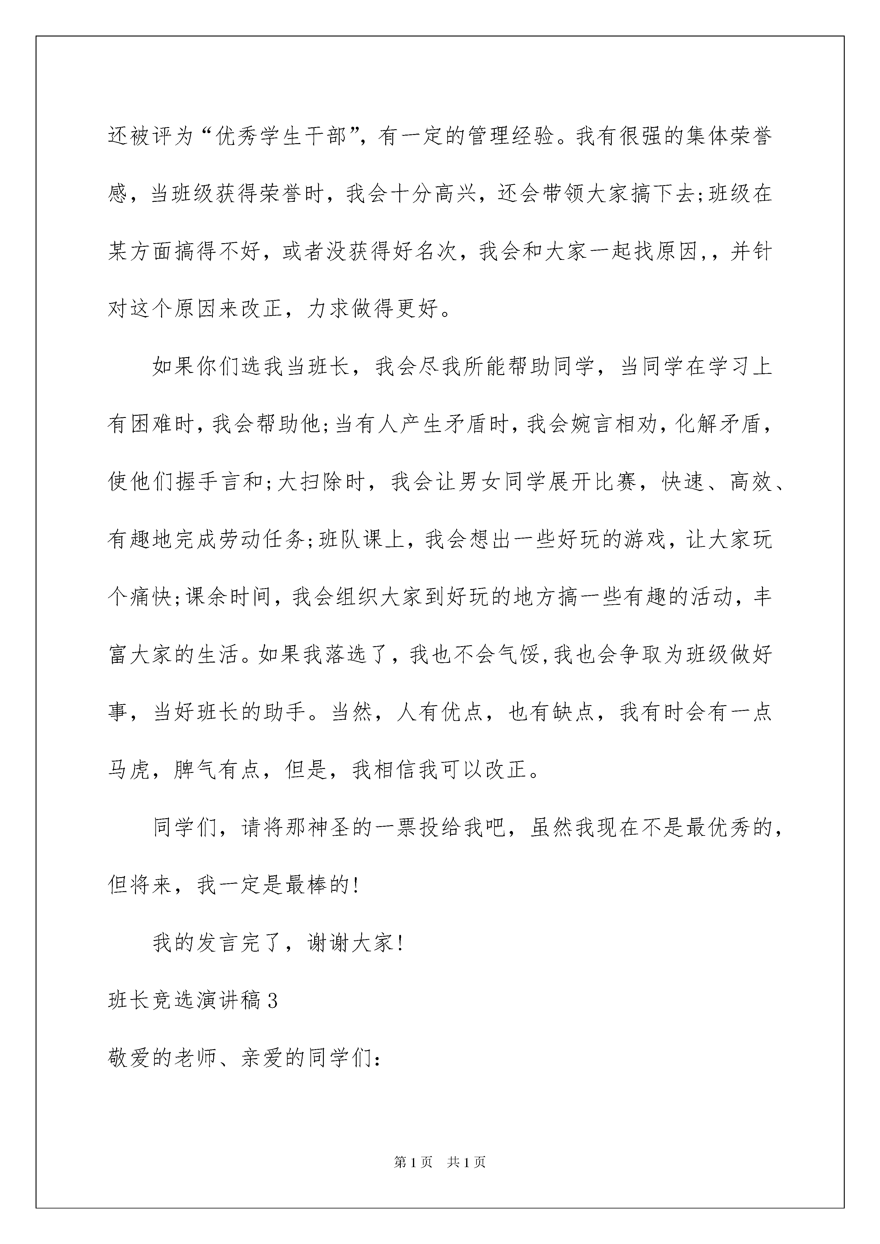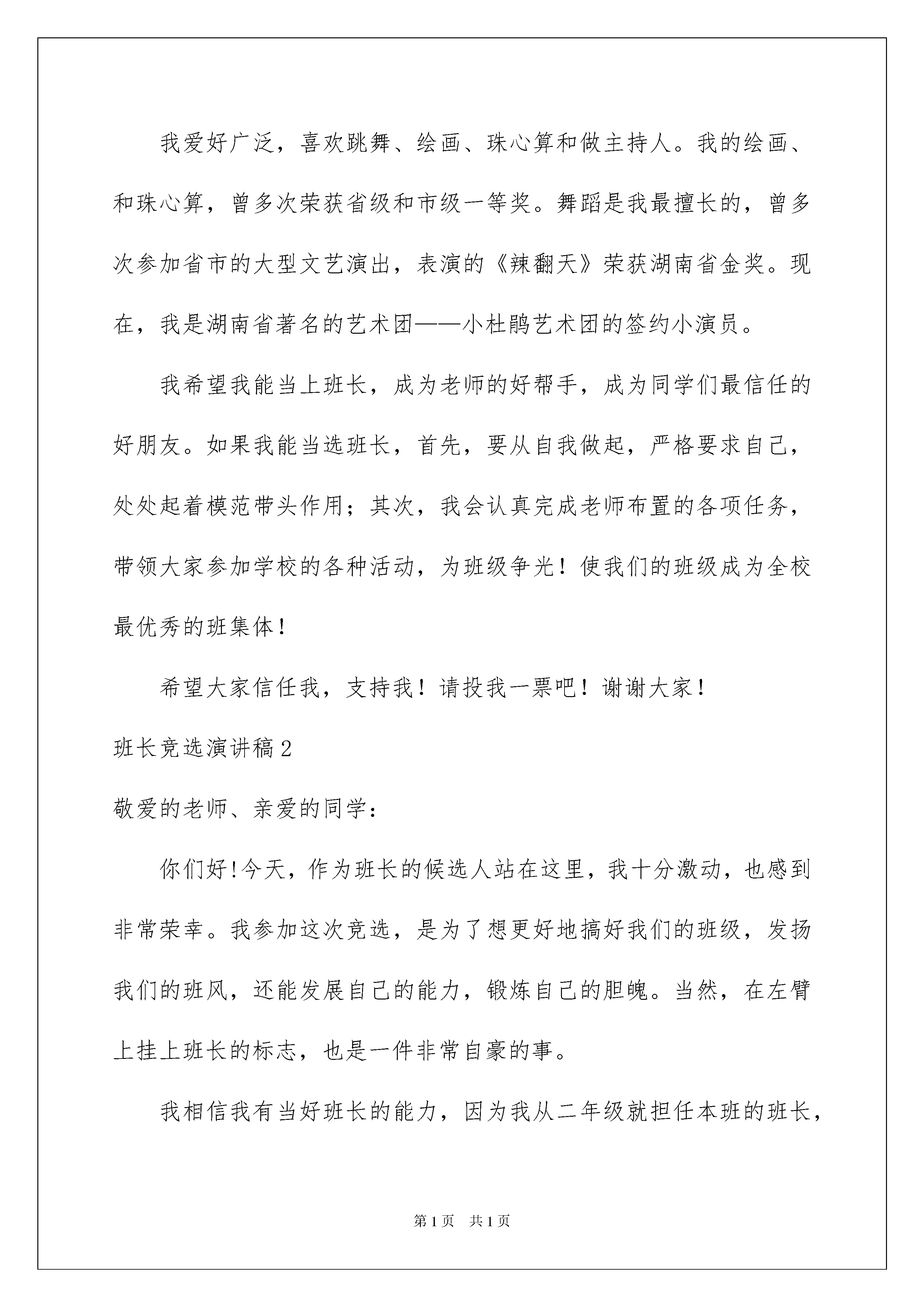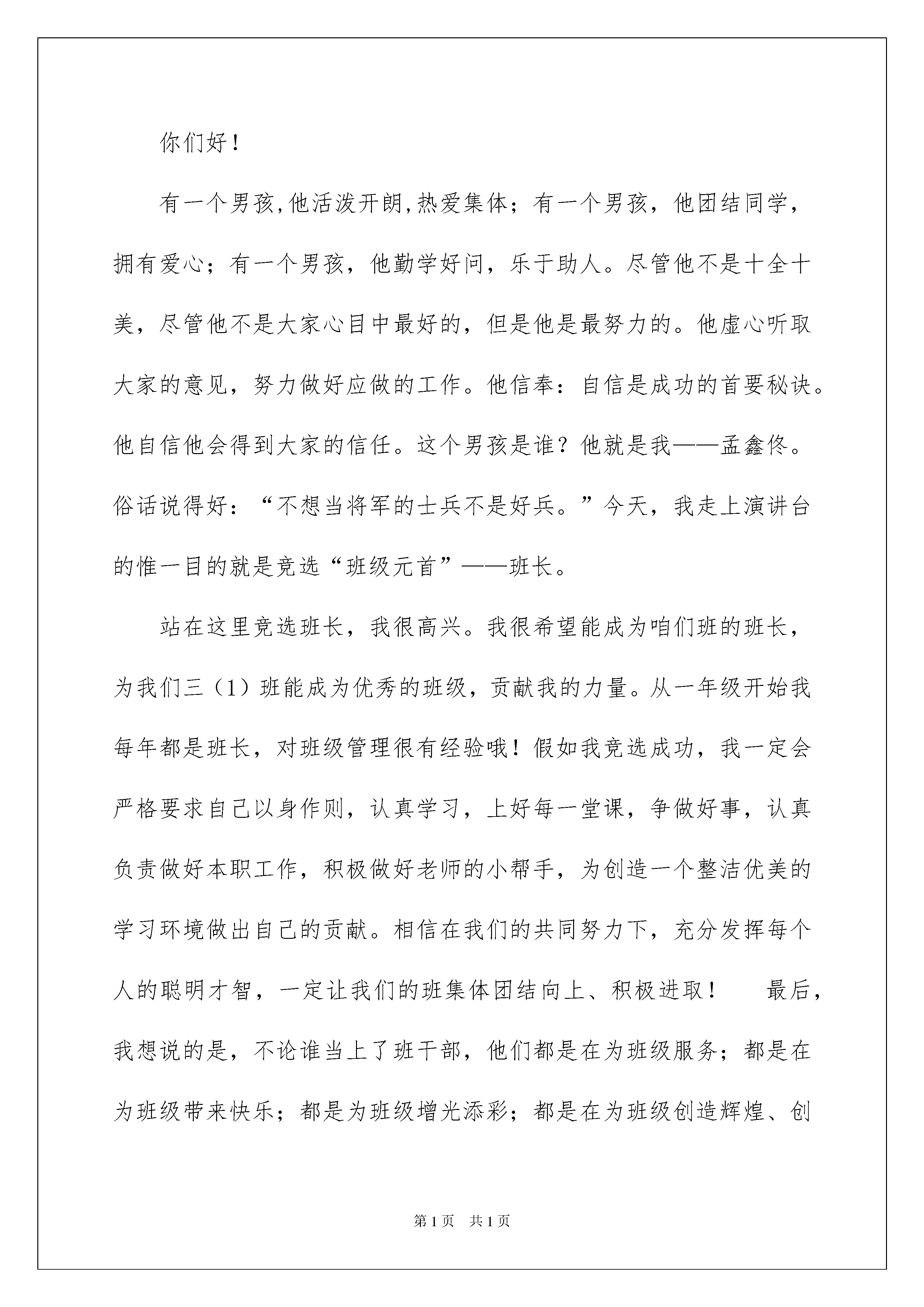 2022班长竞选演讲稿集合15篇班长竞选演讲稿集合15篇演讲稿具有观点鲜明,内容具有鼓动性的特点。在社会一步步向前发展的今天,我们都可能会用到演讲稿,写起演讲稿来就毫无头绪?以下是我为大家收集的班长竞选演讲稿,供大家参考借鉴,希望可以帮助到有需要的朋友。班长竞选演讲稿1敬爱的老师、亲爱的同学们:大家好!我叫隆楚妍,今年6岁。今天,我竞选的职位是班长。我是一个开朗活泼、热情大方、多才多艺的女孩。班长是一个许多同学向往的职位,需要一个有能力,有爱心的人来担当,我相信我有这个能力。我热爱学习,对自己要求严格。在第一个月的学习中,我共获得了69个奖章,荣获班级第一。我喜欢看书,现在能认识20xx多个汉字,我喜欢读《幼儿画报》《小公主》等杂志。如果我当上班长,我每个星期会讲一个我读到的最有趣的故事给大家听。我爱好广泛,喜欢跳舞、绘画、珠心算和做主持人。我的绘画、和珠心算,曾多次荣获省级和市级一等奖。舞蹈是我最擅长的,曾多次参加省市的大型文艺演出,表演的《辣翻天》荣获湖南省金奖。现在,我是湖南省著名的艺术团——小杜鹃艺术团的签约小演员。我希望我能当上班长,成为老师的好帮手,成为同学们最信任的好朋友。如果我能当选班长,首先,要从自我做起,严格要求自己,处处起着模范带头作用;其次,我会认真完成老师布置的各项任务,带领大家参加学校的各种活动,为班级争光!使我们的班级成为全校最优秀的班集体!希望大家信任我,支持我!请投我一票吧!谢谢大家!班长竞选演讲稿2敬爱的老师、亲爱的同学:你们好!今天,作为班长的候选人站在这里,我十分激动,也感到非常荣幸。我参加这次竞选,是为了想更好地搞好我们的班级,发扬我们的班风,还能发展自己的能力,锻炼自己的胆魄。当然,在左臂上挂上班长的标志,也是一件非常自豪的事。我相信我有当好班长的能力,因为我从二年级就担任本班的班长,还被评为“优秀学生干部”,有一定的管理经验。我有很强的集体荣誉感,当班级获得荣誉时,我会十分高兴,还会带领大家搞下去;班级在某方面搞得不好,或者没获得好名次,我会和大家一起找原因,,并针对这个原因来改正,力求做得更好。如果你们选我当班长,我会尽我所能帮助同学,当同学在学习上有困难时,我会帮助他;当有人产生矛盾时,我会婉言相劝,化解矛盾,使他们握手言和;大扫除时,我会让男女同学展开比赛,快速、高效、有趣地完成劳动任务;班队课上,我会想出一些好玩的游戏,让大家玩个痛快;课余时间,我会组织大家到好玩的地方搞一些有趣的活动,丰富大家的生活。如果我落选了,我也不会气馁,我也会争取为班级做好事,当好班长的助手。当然,人有优点,也有缺点,我有时会有一点马虎,脾气有点,但是,我相信我可以改正。同学们,请将那神圣的一票投给我吧,虽然我现在不是最优秀的,但将来,我一定是最棒的!我的发言完了,谢谢大家!班长竞选演讲稿3敬爱的老师、亲爱的同学们:你们好!有一个男孩,他活泼开朗,热爱集体;有一个男孩,他团结同学,拥有爱心;有一个男孩,他勤学好问,乐于助人。尽管他不是十全十美,尽管他不是大家心目中最好的,但是他是最努力的。他虚心听取大家的意见,努力做好应做的工作。他信奉:自信是成功的首要秘诀。他自信他会得到大家的信任。这个男孩是谁?他就是我——孟鑫佟。俗话说得好:“不想当将军的士兵不是好兵。”今天,我走上演讲台的惟一目的就是竞选“班级元首”——班长。站在这里竞选班长,我很高兴。我很希望能成为咱们班的班长,为我们三(1)班能成为优秀的班级,贡献我的力量。从一年级开始我每年都是班长,对班级管理很有经验哦!假如我竞选成功,我一定会严格要求自己以身作则,认真学习,上好每一堂课,争做好事,认真负责做好本职工作,积极做好老师的小帮手,为创造一个整洁优美的学习环境做出自己的贡献。相信在我们的共同努力下,充分发挥每个人的聪明才智,一定让我们的班集体团结向上、积极进取!最后,我想说的是,不论谁当上了班干部,他们都是在为班级服务;都是在为班级带来快乐;都是为班级增光添彩;都是在为班级创造辉煌、创造美好的明天!但是,我更期望这个人能是我,所以,希望大家能把你手中那一张最珍贵的选票投给我,我绝对不会让你们感到后悔与失望!谢谢大家!班长竞选演讲稿4三位老师好,各位同学好,我是刘大跃。非常感谢大家给我这个机会站在这里竞选班长。我的演讲或许不是非常出色,但我还是希望大家能够仔细认真的听一下。我这个人比较专一,所以当我决定竞选班长时,我放弃了其他进入学生会,勤工助学会什么的机会。而且我觉得,做一个班长需要大量时间和精力,也没时间再做诸如学生会什么的工作。并且我在数年班长工作中学会了什么叫做责任,什么叫做担当