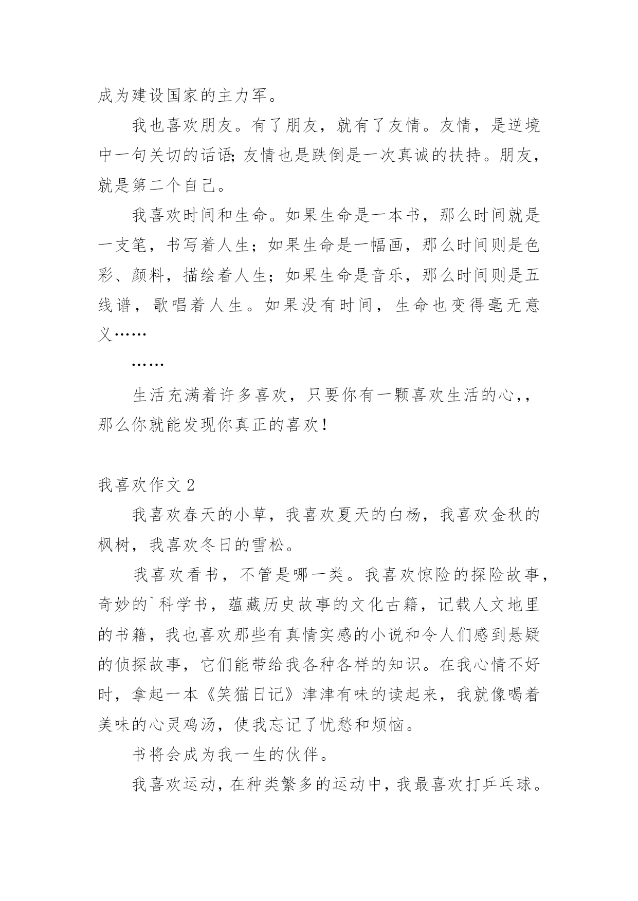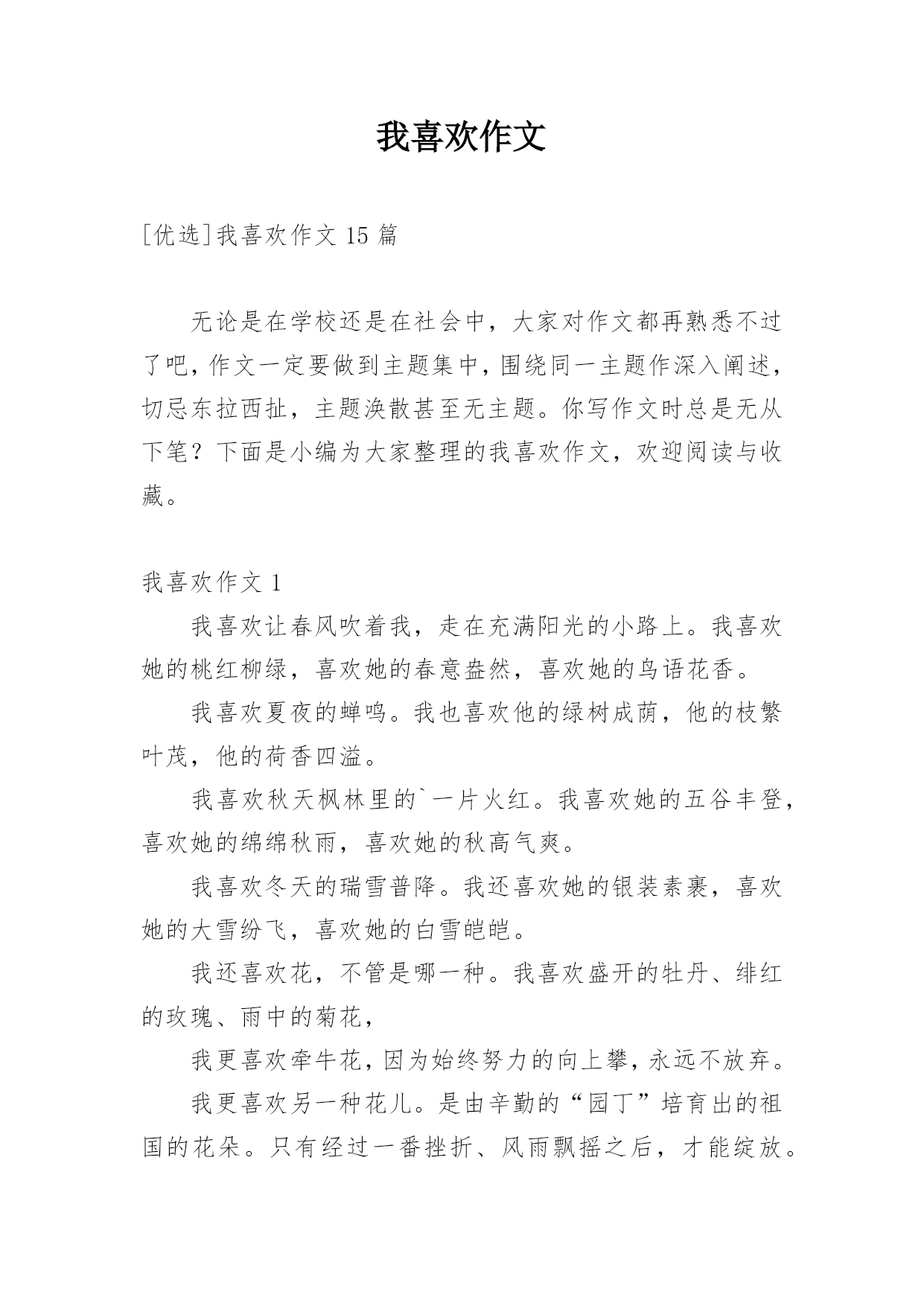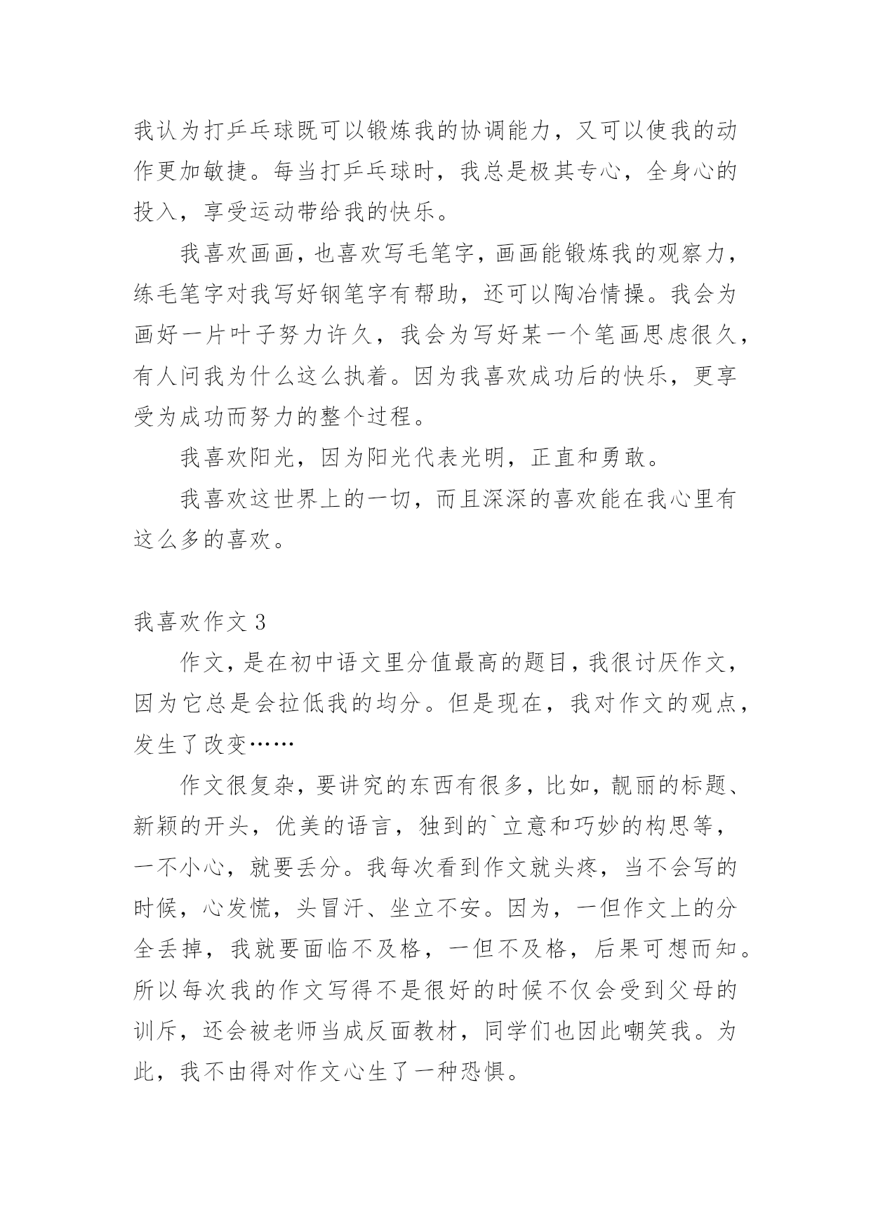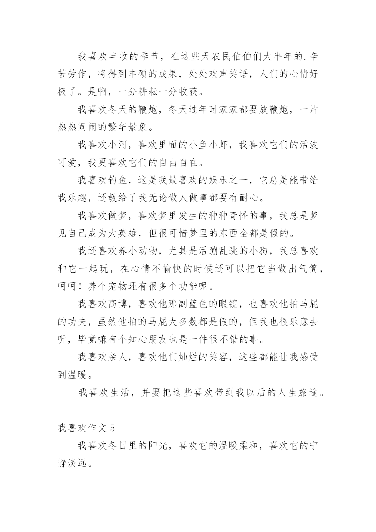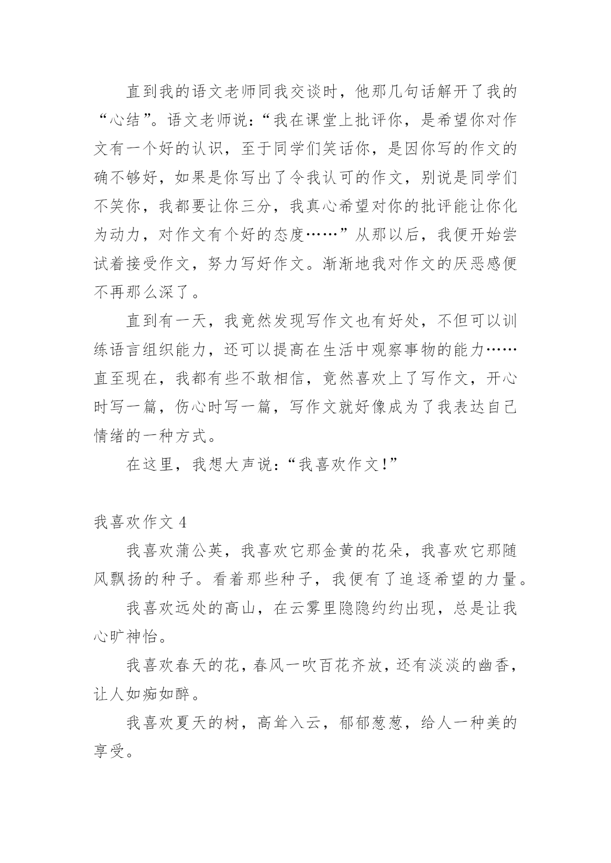 我喜欢作文 [优选]我喜欢作文15篇无论是在学校还是在社会中,大家对作文都再熟悉不过了吧,作文一定要做到主题集中,围绕同一主题作深入阐述,切忌东拉西扯,主题涣散甚至无主题。你写作文时总是无从下笔?下面是小编为大家整理的我喜欢作文,欢迎阅读与收藏。我喜欢作文1我喜欢让春风吹着我,走在充满阳光的小路上。我喜欢她的桃红柳绿,喜欢她的春意盎然,喜欢她的鸟语花香。我喜欢夏夜的蝉鸣。我也喜欢他的绿树成荫,他的枝繁叶茂,他的荷香四溢。我喜欢秋天枫林里的`一片火红。我喜欢她的五谷丰登,喜欢她的绵绵秋雨,喜欢她的秋高气爽。我喜欢冬天的瑞雪普降。我还喜欢她的银装素裹,喜欢她的大雪纷飞,喜欢她的白雪皑皑。我还喜欢花,不管是哪一种。我喜欢盛开的牡丹、绯红的玫瑰、雨中的菊花,我更喜欢牵牛花,因为始终努力的向上攀,永远不放弃。我更喜欢另一种花儿。是由辛勤的“园丁”培育出的祖国的花朵。只有经过一番挫折、风雨飘摇之后,才能绽放。成为建设国家的主力军。我也喜欢朋友。有了朋友,就有了友情。友情,是逆境中一句关切的话语;友情也是跌倒是一次真诚的扶持。朋友,就是第二个自己。我喜欢时间和生命。如果生命是一本书,那么时间就是一支笔,书写着人生;如果生命是一幅画,那么时间则是色彩、颜料,描绘着人生;如果生命是音乐,那么时间则是五线谱,歌唱着人生。如果没有时间,生命也变得毫无意义…………生活充满着许多喜欢,只要你有一颗喜欢生活的心,,那么你就能发现你真正的喜欢!我喜欢作文2我喜欢春天的小草,我喜欢夏天的白杨,我喜欢金秋的枫树,我喜欢冬日的雪松。我喜欢看书,不管是哪一类。我喜欢惊险的探险故事,奇妙的`科学书,蕴藏历史故事的文化古籍,记载人文地里的书籍,我也喜欢那些有真情实感的小说和令人们感到悬疑的侦探故事,它们能带给我各种各样的知识。在我心情不好时,拿起一本《笑猫日记》津津有味的读起来,我就像喝着美味的心灵鸡汤,使我忘记了忧愁和烦恼。书将会成为我一生的伙伴。我喜欢运动,在种类繁多的运动中,我最喜欢打乒乓球。我认为打乒乓球既可以锻炼我的协调能力,又可以使我的动作更加敏捷。每当打乒乓球时,我总是极其专心,全身心的投入,享受运动带给我的快乐。我喜欢画画,也喜欢写毛笔字,画画能锻炼我的观察力,练毛笔字对我写好钢笔字有帮助,还可以陶冶情操。我会为画好一片叶子努力许久,我会为写好某一个笔画思虑很久,有人问我为什么这么执着。因为我喜欢成功后的快乐,更享受为成功而努力的整个过程。我喜欢阳光,因为阳光代表光明,正直和勇敢。我喜欢这世界上的一切,而且深深的喜欢能在我心里有这么多的喜欢。我喜欢作文3作文,是在初中语文里分值最高的题目,我很讨厌作文,因为它总是会拉低我的均分。但是现在,我对作文的观点,发生了改变……作文很复杂,要讲究的东西有很多,比如,靓丽的标题、新颖的开头,优美的语言,独到的`立意和巧妙的构思等,一不小心,就要丢分。我每次看到作文就头疼,当不会写的时候,心发慌,头冒汗、坐立不安。因为,一但作文上的分全丢掉,我就要面临不及格,一但不及格,后果可想而知。所以每次我的作文写得不是很好的时候不仅会受到父母的训斥,还会被老师当成反面教材,同学们也因此嘲笑我。为此,我不由得对作文心生了一种恐惧。直到我的语文老师同我交谈时,他那几句话解开了我的“心结”。语文老师说:“我在课堂上批评你,是希望你对作文有一个好的认识,至于同学们笑话你,是因你写的作文的确不够好,如果是你写出了令我认可的作文,别说是同学们不笑你,我都要让你三分,我真心希望对你的批评能让你化为动力,对作文有个好的态度……”从那以后,我便开始尝试着接受作文,努力写好作文。渐渐地我对作文的厌恶感便不再那么深了。直到有一天,我竟然发现写作文也有好处,不但可以训练语言组织能力,还可以提高在生活中观察事物的能力……直至现在,我都有些不敢相信,竟然喜欢上了写作文,开心时写一篇,伤心时写一篇,写作文就好像成为了我表达自己情绪的一种方式。在这里,我想大声说:“我喜欢作文!”我喜欢作文4我喜欢蒲公英,我喜欢它那金黄的花朵,我喜欢它那随风飘扬的种子。看着那些种子,我便有了追逐希望的力量。我喜欢远处的高山,在云雾里隐隐约约出现,总是让我心旷神怡。我喜欢春天的花,春风一吹百花齐放,还有淡淡的幽香,让人如痴如醉。我喜欢夏天的树,高耸入云,郁郁葱葱,给人一种美的享受。我喜欢丰收的季节,在这些天农民伯伯们大半年的.辛苦劳作,将得到丰硕的成果,处处欢声笑语,人们的心情好极了。是啊,一分耕耘一分收获。我喜欢冬天的鞭炮,冬天过年时家家都要放鞭炮,一片热热闹闹的繁华景象。我喜欢小河,喜欢里面的小鱼小虾,我喜欢它们的活波可爱,我更喜欢它们的自由自在。我喜欢钓鱼,这是我最喜欢的娱乐之一,它总是能带给我乐趣,还教给了我无论做人做事都要有耐心。我喜欢做梦,喜欢梦里发生的种种奇怪的