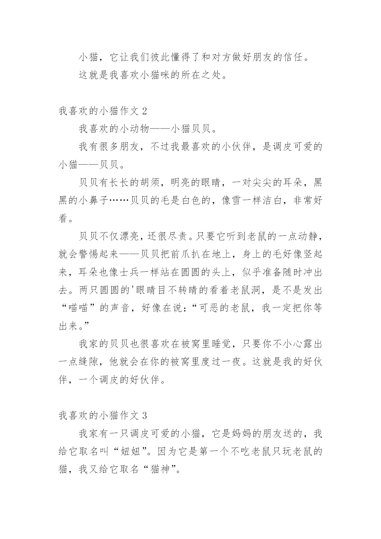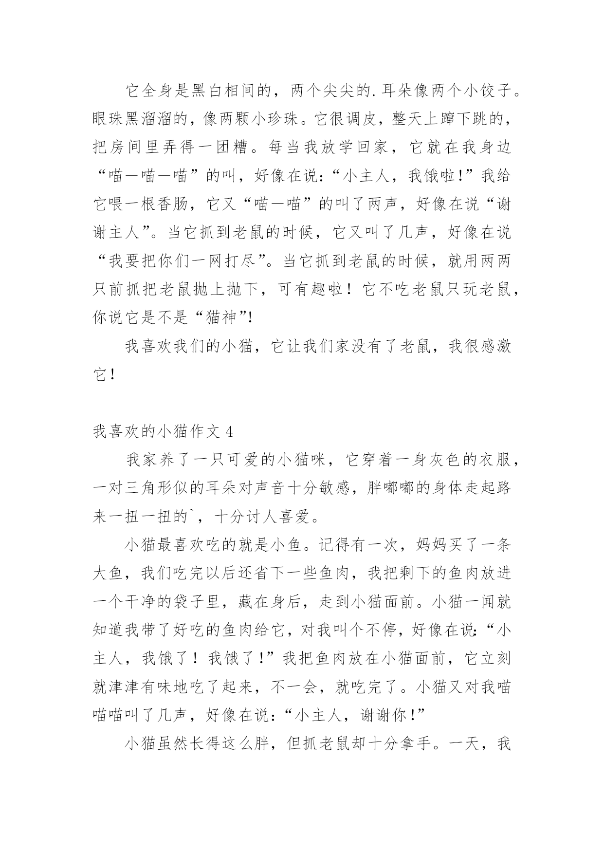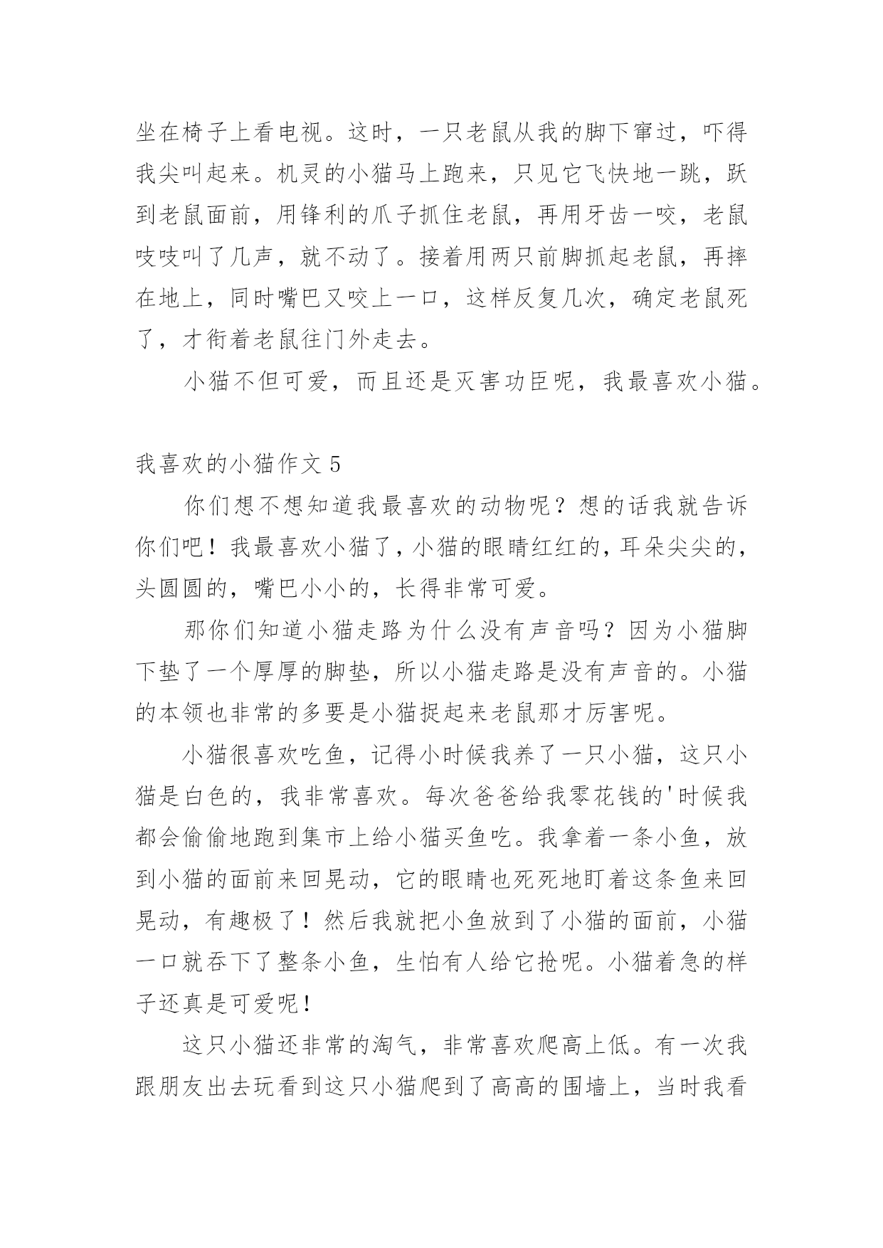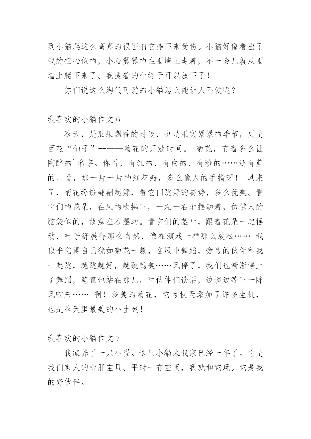 我喜欢的小猫作文 [通用]我喜欢的小猫作文在我们平凡的日常里,大家都跟作文打过交道吧,根据写作命题的特点,作文可以分为命题作文和非命题作文。你知道作文怎样才能写的好吗?下面是小编为大家收集的我喜欢的小猫作文,欢迎大家分享。我喜欢的小猫作文1我们都有自己喜欢的小动物,每个人喜欢的小动物都不一样。你喜欢仓鼠;他喜欢小狗;她又喜欢笨笨而又可爱的小猪;而我喜欢非常可爱的小猫咪。在我刚上幼儿园的时候,奶奶家抱来一只可爱的小猫咪,我给它起了个名字叫逗逗。是因为它刚抱来的时候,在我伤心时是他逗我开心的。他长得黑黑的,只有手和尾巴,还有嘴是白色的.,其他都是黑色的。那一次,是小猫咪抱来满一年的时候。那是一个冬天,也是小猫咪的生日。我们为小猫咪准备了香肠,鸡肉,鱼等一些食物。看!小猫咪吃得多开心,好像在说:“谢谢你们为我准备大餐。”它摇了摇尾巴并把脸贴在我们的手上,舔了舔我的手心,我感觉到了痒,那种痒是它在向我们亲切的问候。在这里,不仅是小猫快乐,而我们却得到了小猫的信赖。这样,即使是小猫不知道,而我们却感觉得到。小猫,它让我们彼此懂得了和对方做好朋友的信任。这就是我喜欢小猫咪的所在之处。我喜欢的小猫作文2我喜欢的小动物——小猫贝贝。我有很多朋友,不过我最喜欢的小伙伴,是调皮可爱的小猫——贝贝。贝贝有长长的胡须,明亮的眼睛,一对尖尖的耳朵,黑黑的小鼻子……贝贝的毛是白色的,像雪一样洁白,非常好看。贝贝不仅漂亮,还很尽责。只要它听到老鼠的一点动静,就会警惕起来——贝贝把前爪扒在地上,身上的毛好像竖起来,耳朵也像士兵一样站在圆圆的头上,似乎准备随时冲出去。两只圆圆的'眼睛目不转睛的看着老鼠洞,是不是发出“喵喵”的声音,好像在说:“可恶的老鼠,我一定把你等出来。”我家的贝贝也很喜欢在被窝里睡觉,只要你不小心露出一点缝隙,他就会在你的被窝里度过一夜。这就是我的好伙伴,一个调皮的好伙伴。我喜欢的小猫作文3我家有一只调皮可爱的小猫,它是妈妈的朋友送的,我给它取名叫“妞妞”。因为它是第一个不吃老鼠只玩老鼠的猫,我又给它取名“猫神”。它全身是黑白相间的,两个尖尖的.耳朵像两个小饺子。眼珠黑溜溜的,像两颗小珍珠。它很调皮,整天上蹿下跳的,把房间里弄得一团糟。每当我放学回家,它就在我身边“喵―喵―喵”的叫,好像在说:“小主人,我饿啦!”我给它喂一根香肠,它又“喵―喵”的叫了两声,好像在说“谢谢主人”。当它抓到老鼠的时候,它又叫了几声,好像在说“我要把你们一网打尽”。当它抓到老鼠的时候,就用两两只前抓把老鼠抛上抛下,可有趣啦!它不吃老鼠只玩老鼠,你说它是不是“猫神”!我喜欢我们的小猫,它让我们家没有了老鼠,我很感激它!我喜欢的小猫作文4我家养了一只可爱的小猫咪,它穿着一身灰色的衣服,一对三角形似的耳朵对声音十分敏感,胖嘟嘟的身体走起路来一扭一扭的`,十分讨人喜爱。小猫最喜欢吃的就是小鱼。记得有一次,妈妈买了一条大鱼,我们吃完以后还省下一些鱼肉,我把剩下的鱼肉放进一个干净的袋子里,藏在身后,走到小猫面前。小猫一闻就知道我带了好吃的鱼肉给它,对我叫个不停,好像在说:“小主人,我饿了!我饿了!”我把鱼肉放在小猫面前,它立刻就津津有味地吃了起来,不一会,就吃完了。小猫又对我喵喵喵叫了几声,好像在说:“小主人,谢谢你!”小猫虽然长得这么胖,但抓老鼠却十分拿手。一天,我坐在椅子上看电视。这时,一只老鼠从我的脚下窜过,吓得我尖叫起来。机灵的小猫马上跑来,只见它飞快地一跳,跃到老鼠面前,用锋利的爪子抓住老鼠,再用牙齿一咬,老鼠吱吱叫了几声,就不动了。接着用两只前脚抓起老鼠,再摔在地上,同时嘴巴又咬上一口,这样反复几次,确定老鼠死了,才衔着老鼠往门外走去。小猫不但可爱,而且还是灭害功臣呢,我最喜欢小猫。我喜欢的小猫作文5你们想不想知道我最喜欢的动物呢?想的话我就告诉你们吧!我最喜欢小猫了,小猫的眼睛红红的,耳朵尖尖的,头圆圆的,嘴巴小小的,长得非常可爱。那你们知道小猫走路为什么没有声音吗?因为小猫脚下垫了一个厚厚的脚垫,所以小猫走路是没有声音的。小猫的本领也非常的多要是小猫捉起来老鼠那才厉害呢。小猫很喜欢吃鱼,记得小时候我养了一只小猫,这只小猫是白色的,我非常喜欢。每次爸爸给我零花钱的'时候我都会偷偷地跑到集市上给小猫买鱼吃。我拿着一条小鱼,放到小猫的面前来回晃动,它的眼睛也死死地盯着这条鱼来回晃动,有趣极了!然后我就把小鱼放到了小猫的面前,小猫一口就吞下了整条小鱼,生怕有人给它抢呢。小猫着急的样子还真是可爱呢!这只小猫还非常的淘气,非常喜欢爬高上低。有一次我跟朋友出去玩看到这只小猫爬到了高高的围墙上,当时我看到小猫爬这么高真的很害怕它摔下来受伤。小猫好像看出了我的担心似的,小心翼翼的在围墙上走着,不一会儿就从围墙上爬下来了。我提着的心终于可以放下了!你们说这么淘气可爱的小猫怎么能