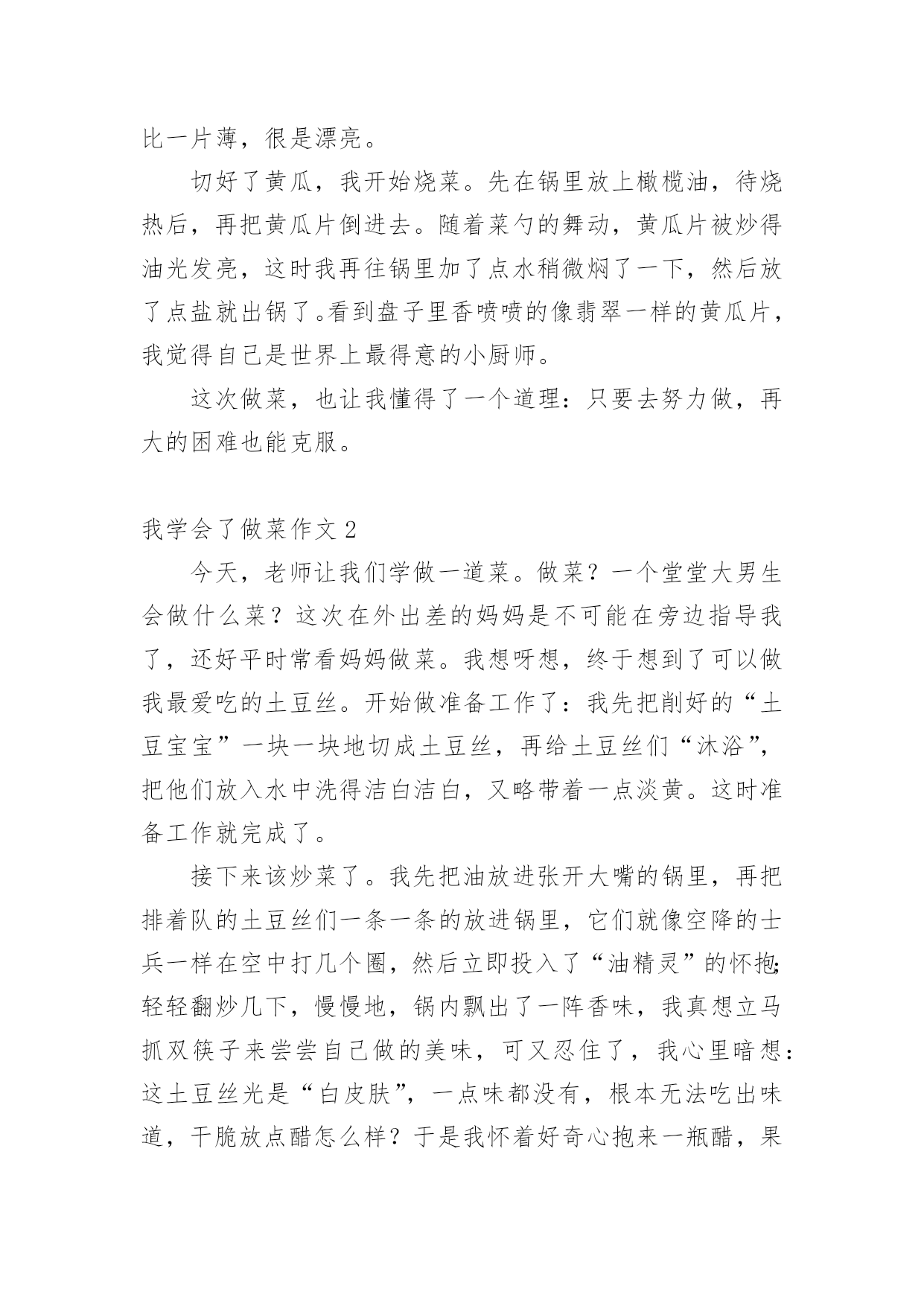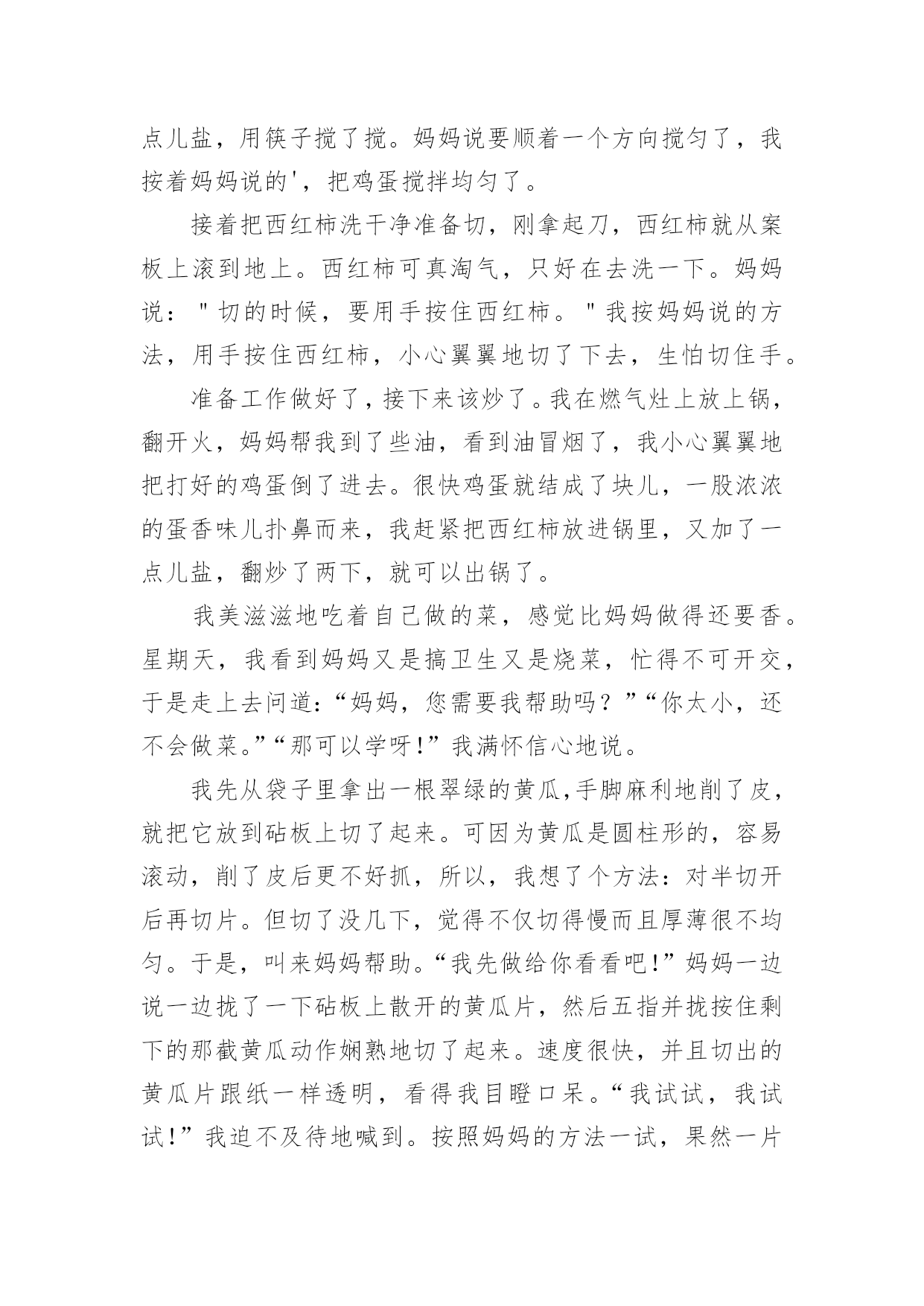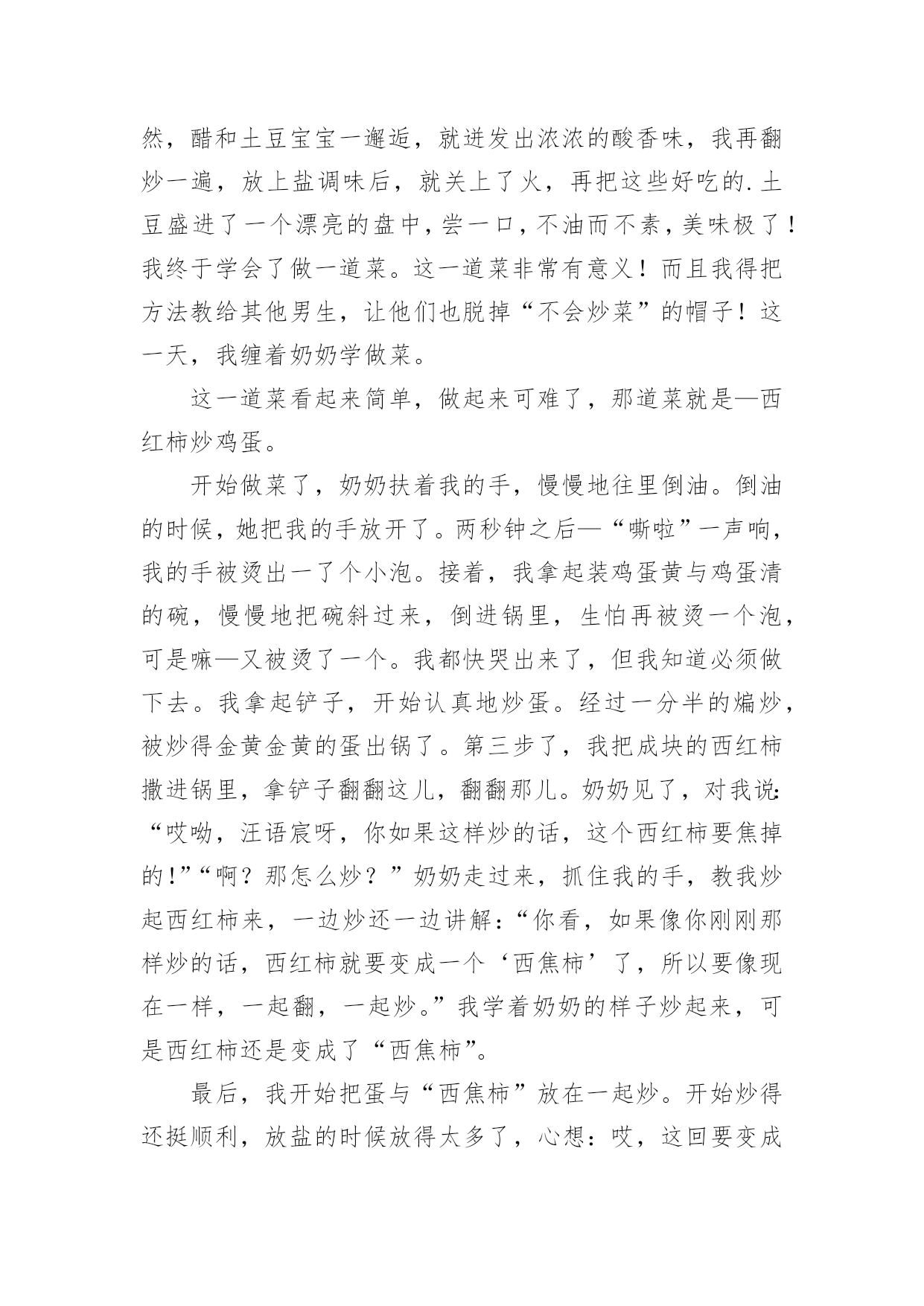我学会了做菜作文 我学会了做菜作文在平日的学习、工作和生活里,大家都有写作文的经历,对作文很是熟悉吧,根据写作命题的特点,作文可以分为命题作文和非命题作文。一篇什么样的作文才能称之为优秀作文呢?以下是小编精心整理的我学会了做菜作文,欢迎阅读,希望大家能够喜欢。我学会了做菜作文1星期天中午,妈妈做了大米饭,准备给我炒最喜欢的西红柿炒鸡蛋。我自己大了,连一样菜也不会做,于是,我央求妈妈教我做。妈妈让我从冰箱里拿了两个鸡蛋和一个西红柿,然后拿了一个碗。开始打鸡蛋了,妈妈先给我做了个示范,只见妈妈一只手拿着鸡蛋,在案台上轻轻磕了一下,然后两手一剥就开了。我想:往碗里打鸡蛋太简单了,我学着妈妈的样子,拿着鸡蛋在案子上轻轻的磕了一下,鸡蛋好似很结实的样子,一点儿变化也没有。妈妈说我用力太小。我拿起鸡蛋使劲一磕,鸡蛋破了,蛋清流了一地。唉,打鸡蛋可真是看起来简单做起来难!我只好在拿一个。这次有了刚刚失败的教训,我磕鸡蛋用力时不轻不重,终于把鸡蛋打进碗里了。我在碗里放了一点儿盐,用筷子搅了搅。妈妈说要顺着一个方向搅匀了,我按着妈妈说的',把鸡蛋搅拌均匀了。接着把西红柿洗干净准备切,刚拿起刀,西红柿就从案板上滚到地上。西红柿可真淘气,只好在去洗一下。妈妈说:"切的时候,要用手按住西红柿。"我按妈妈说的方法,用手按住西红柿,小心翼翼地切了下去,生怕切住手。准备工作做好了,接下来该炒了。我在燃气灶上放上锅,翻开火,妈妈帮我到了些油,看到油冒烟了,我小心翼翼地把打好的鸡蛋倒了进去。很快鸡蛋就结成了块儿,一股浓浓的蛋香味儿扑鼻而来,我赶紧把西红柿放进锅里,又加了一点儿盐,翻炒了两下,就可以出锅了。我美滋滋地吃着自己做的菜,感觉比妈妈做得还要香。星期天,我看到妈妈又是搞卫生又是烧菜,忙得不可开交,于是走上去问道:“妈妈,您需要我帮助吗?”“你太小,还不会做菜。”“那可以学呀!”我满怀信心地说。我先从袋子里拿出一根翠绿的黄瓜,手脚麻利地削了皮,就把它放到砧板上切了起来。可因为黄瓜是圆柱形的,容易滚动,削了皮后更不好抓,所以,我想了个方法:对半切开后再切片。但切了没几下,觉得不仅切得慢而且厚薄很不均匀。于是,叫来妈妈帮助。“我先做给你看看吧!”妈妈一边说一边拢了一下砧板上散开的黄瓜片,然后五指并拢按住剩下的那截黄瓜动作娴熟地切了起来。速度很快,并且切出的黄瓜片跟纸一样透明,看得我目瞪口呆。“我试试,我试试!”我迫不及待地喊到。按照妈妈的方法一试,果然一片比一片薄,很是漂亮。切好了黄瓜,我开始烧菜。先在锅里放上橄榄油,待烧热后,再把黄瓜片倒进去。随着菜勺的舞动,黄瓜片被炒得油光发亮,这时我再往锅里加了点水稍微焖了一下,然后放了点盐就出锅了。看到盘子里香喷喷的像翡翠一样的黄瓜片,我觉得自己是世界上最得意的小厨师。这次做菜,也让我懂得了一个道理:只要去努力做,再大的困难也能克服。我学会了做菜作文2今天,老师让我们学做一道菜。做菜?一个堂堂大男生会做什么菜?这次在外出差的妈妈是不可能在旁边指导我了,还好平时常看妈妈做菜。我想呀想,终于想到了可以做我最爱吃的土豆丝。开始做准备工作了:我先把削好的“土豆宝宝”一块一块地切成土豆丝,再给土豆丝们“沐浴”,把他们放入水中洗得洁白洁白,又略带着一点淡黄。这时准备工作就完成了。接下来该炒菜了。我先把油放进张开大嘴的锅里,再把排着队的土豆丝们一条一条的放进锅里,它们就像空降的士兵一样在空中打几个圈,然后立即投入了“油精灵”的怀抱;轻轻翻炒几下,慢慢地,锅内飘出了一阵香味,我真想立马抓双筷子来尝尝自己做的美味,可又忍住了,我心里暗想:这土豆丝光是“白皮肤”,一点味都没有,根本无法吃出味道,干脆放点醋怎么样?于是我怀着好奇心抱来一瓶醋,果然,醋和土豆宝宝一邂逅,就迸发出浓浓的酸香味,我再翻炒一遍,放上盐调味后,就关上了火,再把这些好吃的.土豆盛进了一个漂亮的盘中,尝一口,不油而不素,美味极了!我终于学会了做一道菜。这一道菜非常有意义!而且我得把方法教给其他男生,让他们也脱掉“不会炒菜”的帽子!这一天,我缠着奶奶学做菜。这一道菜看起来简单,做起来可难了,那道菜就是—西红柿炒鸡蛋。开始做菜了,奶奶扶着我的手,慢慢地往里倒油。倒油的时候,她把我的手放开了。两秒钟之后—“嘶啦”一声响,我的手被烫出一了个小泡。接着,我拿起装鸡蛋黄与鸡蛋清的碗,慢慢地把碗斜过来,倒进锅里,生怕再被烫一个泡,可是嘛—又被烫了一个。我都快哭出来了,但我知道必须做下去。我拿起铲子,开始认真地炒蛋。经过一分半的煸炒,被炒得金黄金黄的蛋出锅了。第三步了,我把成块的西红柿撒进锅里,拿铲子翻翻这儿,翻翻那儿。奶奶见了,对我说:“哎呦,汪语宸呀,你如果这样炒的话,这个西红柿要焦掉的!”“啊?那怎么炒?”奶奶走过来,抓住我的手,教我炒起西红柿来,一边炒还一边讲解:“你看,如果像