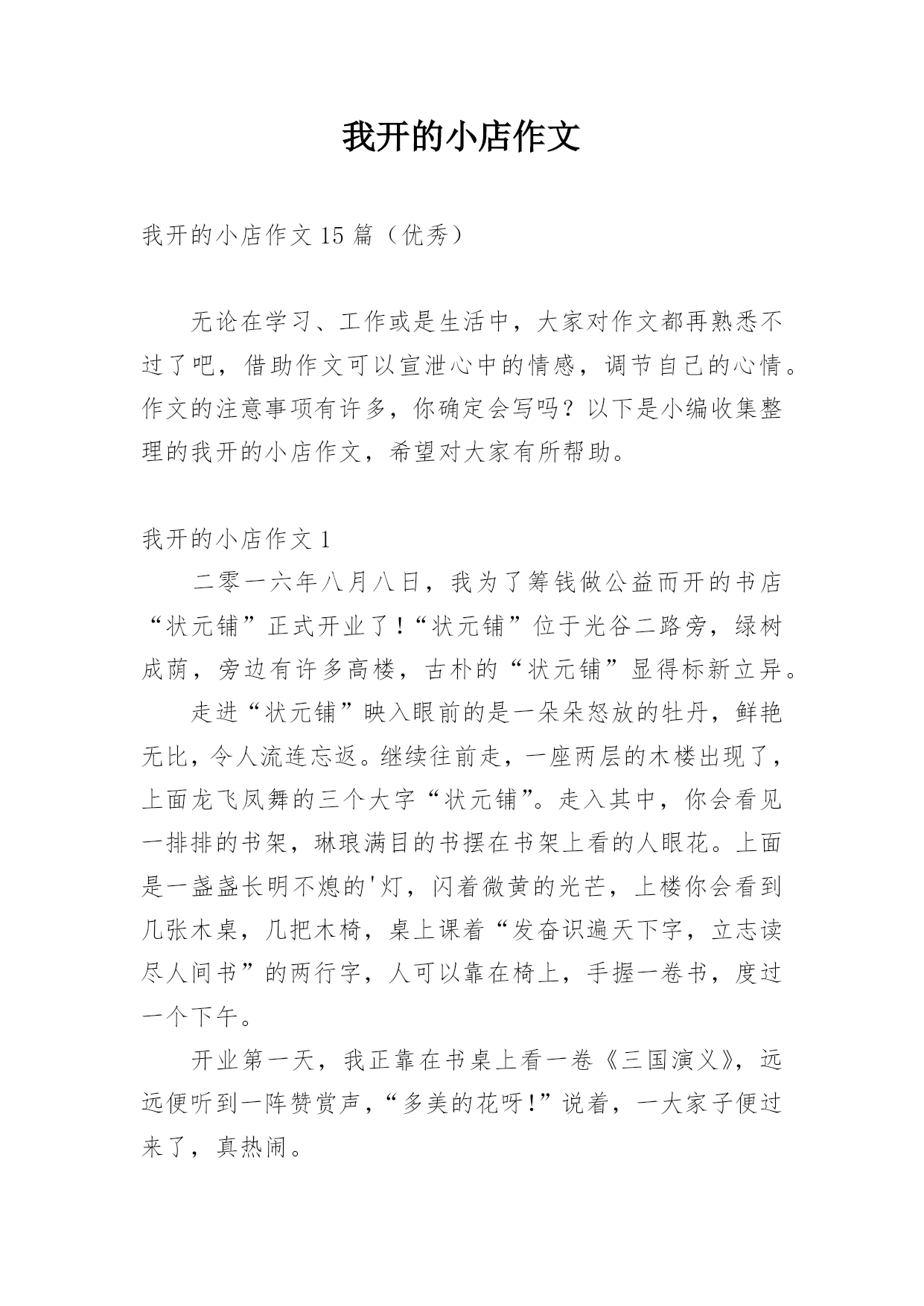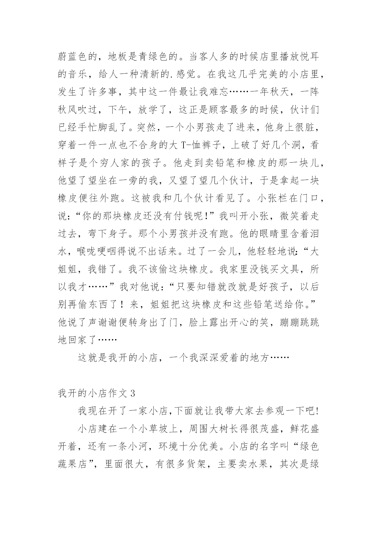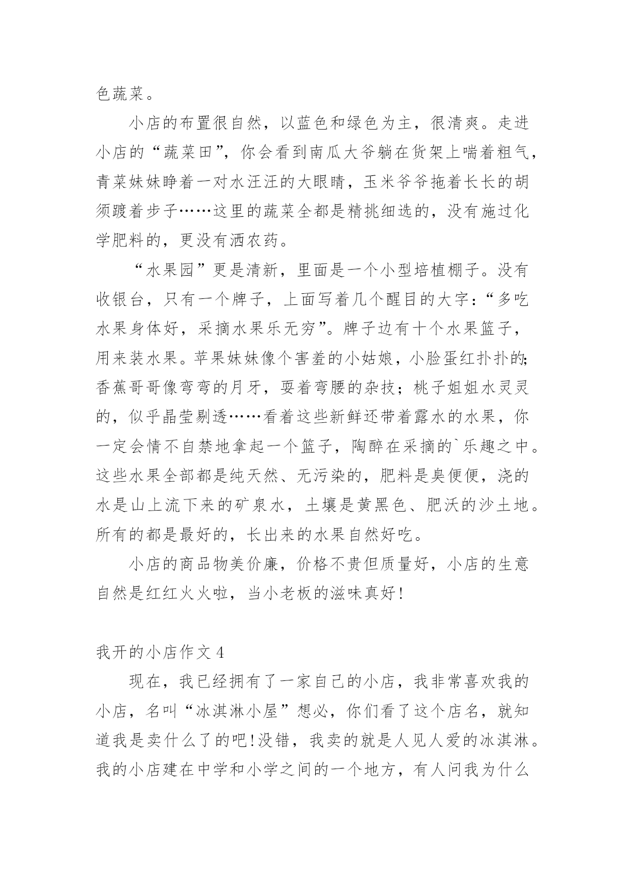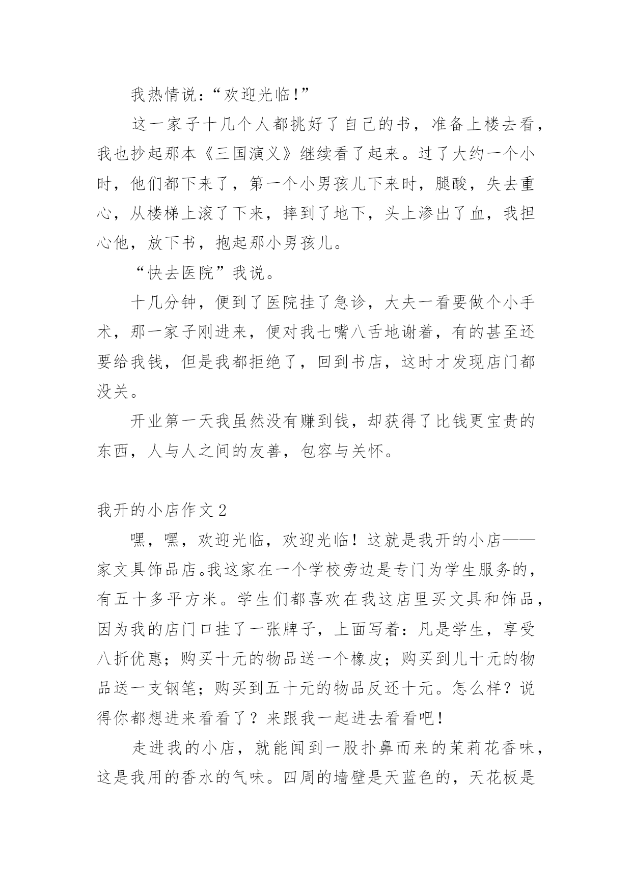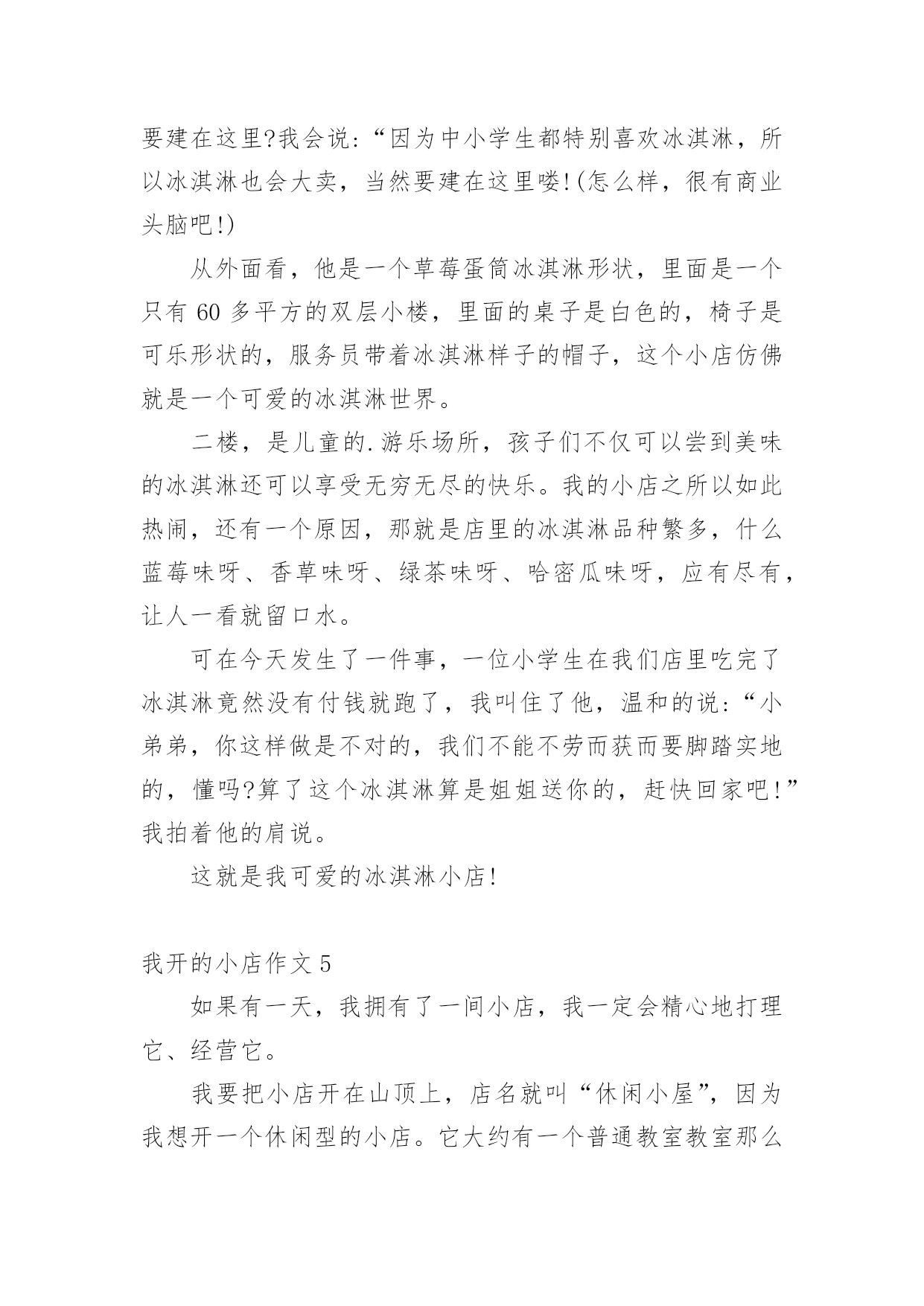 我开的小店作文 我开的小店作文15篇(优秀)无论在学习、工作或是生活中,大家对作文都再熟悉不过了吧,借助作文可以宣泄心中的情感,调节自己的心情。作文的注意事项有许多,你确定会写吗?以下是小编收集整理的我开的小店作文,希望对大家有所帮助。我开的小店作文1二零一六年八月八日,我为了筹钱做公益而开的书店“状元铺”正式开业了!“状元铺”位于光谷二路旁,绿树成荫,旁边有许多高楼,古朴的“状元铺”显得标新立异。走进“状元铺”映入眼前的是一朵朵怒放的牡丹,鲜艳无比,令人流连忘返。继续往前走,一座两层的木楼出现了,上面龙飞凤舞的三个大字“状元铺”。走入其中,你会看见一排排的书架,琳琅满目的书摆在书架上看的人眼花。上面是一盏盏长明不熄的'灯,闪着微黄的光芒,上楼你会看到几张木桌,几把木椅,桌上课着“发奋识遍天下字,立志读尽人间书”的两行字,人可以靠在椅上,手握一卷书,度过一个下午。开业第一天,我正靠在书桌上看一卷《三国演义》,远远便听到一阵赞赏声,“多美的花呀!”说着,一大家子便过来了,真热闹。我热情说:“欢迎光临!”这一家子十几个人都挑好了自己的书,准备上楼去看,我也抄起那本《三国演义》继续看了起来。过了大约一个小时,他们都下来了,第一个小男孩儿下来时,腿酸,失去重心,从楼梯上滚了下来,摔到了地下,头上渗出了血,我担心他,放下书,抱起那小男孩儿。“快去医院”我说。十几分钟,便到了医院挂了急诊,大夫一看要做个小手术,那一家子刚进来,便对我七嘴八舌地谢着,有的甚至还要给我钱,但是我都拒绝了,回到书店,这时才发现店门都没关。开业第一天我虽然没有赚到钱,却获得了比钱更宝贵的东西,人与人之间的友善,包容与关怀。我开的小店作文2嘿,嘿,欢迎光临,欢迎光临!这就是我开的小店——家文具饰品店。我这家在一个学校旁边是专门为学生服务的,有五十多平方米。学生们都喜欢在我这店里买文具和饰品,因为我的店门口挂了一张牌子,上面写着:凡是学生,享受八折优惠;购买十元的物品送一个橡皮;购买到儿十元的物品送一支钢笔;购买到五十元的物品反还十元。怎么样?说得你都想进来看看了?来跟我一起进去看看吧!走进我的小店,就能闻到一股扑鼻而来的茉莉花香味,这是我用的香水的气味。四周的墙壁是天蓝色的,天花板是蔚蓝色的,地板是青绿色的。当客人多的时候店里播放悦耳的音乐,给人一种清新的.感觉。在我这几乎完美的小店里,发生了许多事,其中这一件最让我难忘……一年秋天,一阵秋风吹过,下午,放学了,这正是顾客最多的时候,伙计们已经手忙脚乱了。突然,一个小男孩走了进来,他身上很脏,穿着一件一点也不合身的大T-恤裤子,上破了好几个洞,看样子是个穷人家的孩子。他走到卖铅笔和橡皮的那一块儿,他望了望坐在一旁的我,又望了望几个伙计,于是拿起一块橡皮便往外跑。这被我和几个伙计看见了。小张栏在门口,说:“你的那块橡皮还没有付钱呢!”我叫开小张,微笑着走过去,弯下身子。那个小男孩并没有跑。他的眼睛里含着泪水,喉咙哽咽得说不出话来。过了一会儿,他轻轻地说:“大姐姐,我错了。我不该偷这块橡皮。我家里没钱买文具,所以我才……”我对他说:“只要知错就改就是好孩子,以后别再偷东西了!来,姐姐把这块橡皮和这些铅笔送给你。”他说了声谢谢便转身出了门,脸上露出开心的笑,蹦蹦跳跳地回家了……这就是我开的小店,一个我深深爱着的地方……我开的小店作文3我现在开了一家小店,下面就让我带大家去参观一下吧!小店建在一个小草坡上,周围大树长得很茂盛,鲜花盛开着,还有一条小河,环境十分优美。小店的名字叫“绿色蔬果店”,里面很大,有很多货架,主要卖水果,其次是绿色蔬菜。小店的布置很自然,以蓝色和绿色为主,很清爽。走进小店的“蔬菜田”,你会看到南瓜大爷躺在货架上喘着粗气,青菜妹妹睁着一对水汪汪的大眼睛,玉米爷爷拖着长长的胡须踱着步子……这里的蔬菜全都是精挑细选的,没有施过化学肥料的,更没有洒农药。“水果园”更是清新,里面是一个小型培植棚子。没有收银台,只有一个牌子,上面写着几个醒目的大字:“多吃水果身体好,采摘水果乐无穷”。牌子边有十个水果篮子,用来装水果。苹果妹妹像个害羞的小姑娘,小脸蛋红扑扑的;香蕉哥哥像弯弯的月牙,耍着弯腰的杂技;桃子姐姐水灵灵的,似乎晶莹剔透……看着这些新鲜还带着露水的水果,你一定会情不自禁地拿起一个篮子,陶醉在采摘的`乐趣之中。这些水果全部都是纯天然、无污染的,肥料是臭便便,浇的水是山上流下来的矿泉水,土壤是黄黑色、肥沃的沙土地。所有的都是最好的,长出来的水果自然好吃。小店的商品物美价廉,价格不贵但质量好,小店的生意自然是红红火火啦,当小老板的滋味真好!我开的小店作文4现在,我已经拥有了一家自己的小店,我非常喜欢我的小店,名叫“冰淇淋小屋”想必,你们看了这个店名,就知道我是卖什么了的吧!没错,我卖的就是人见人爱的冰淇淋。我的小