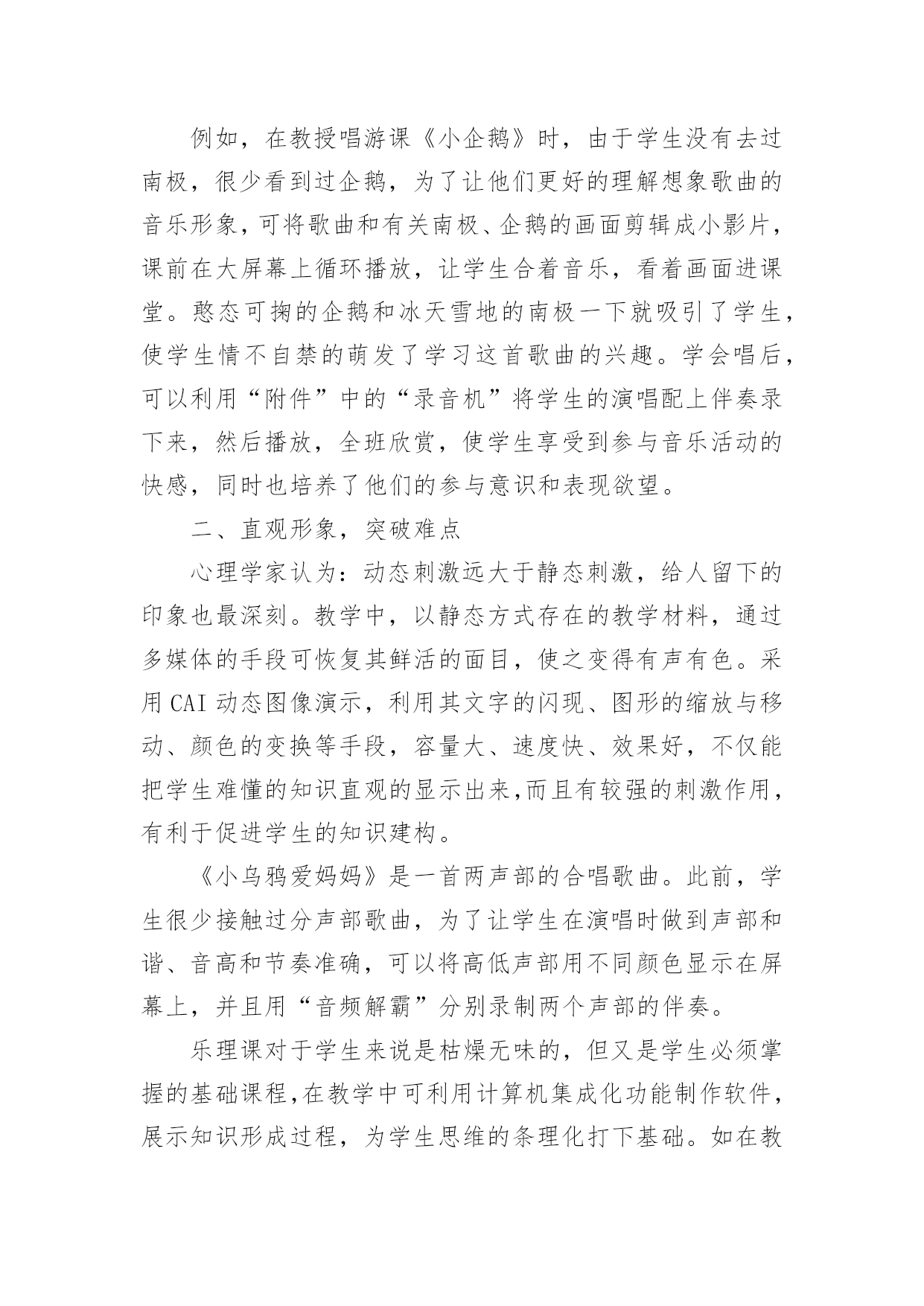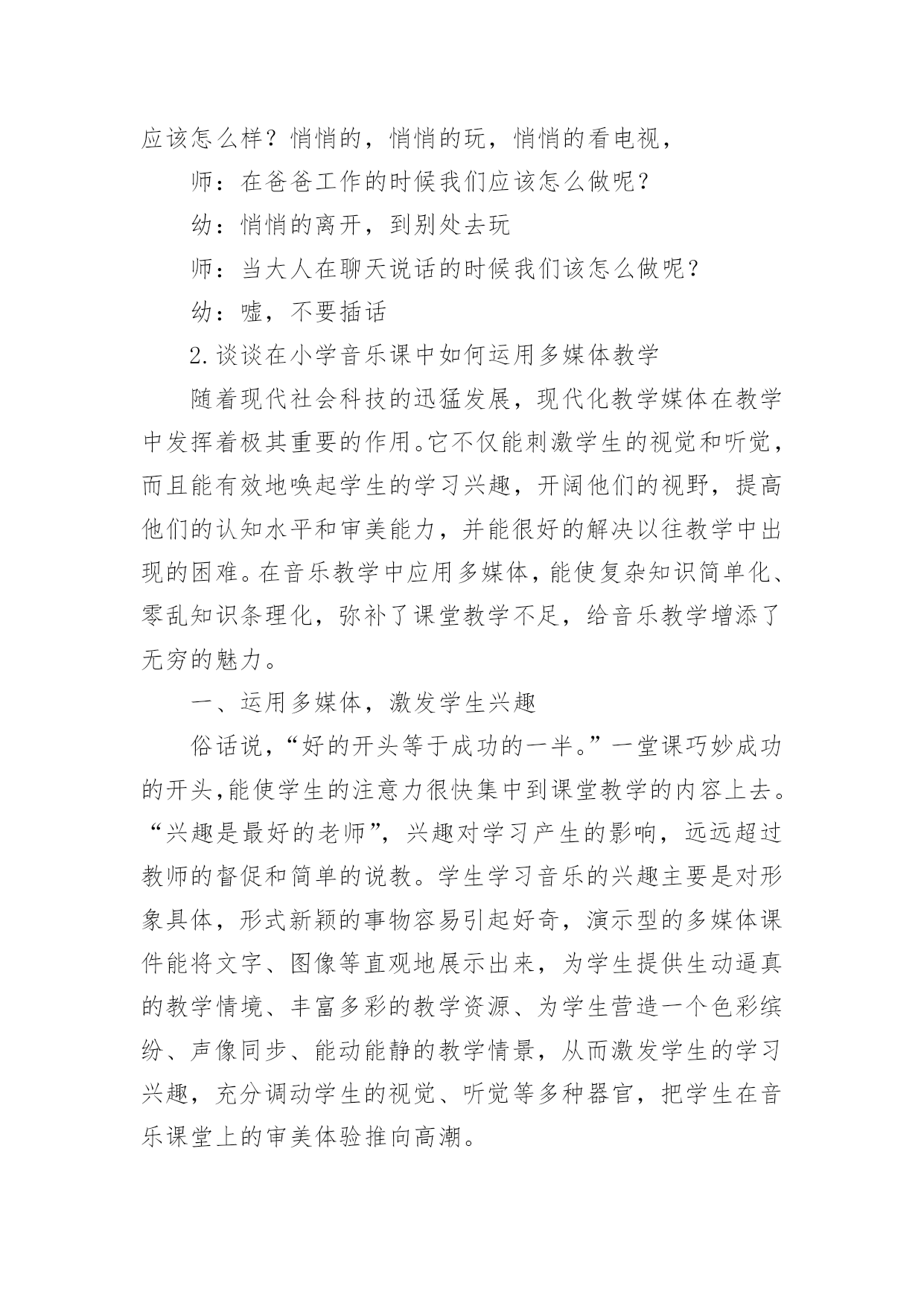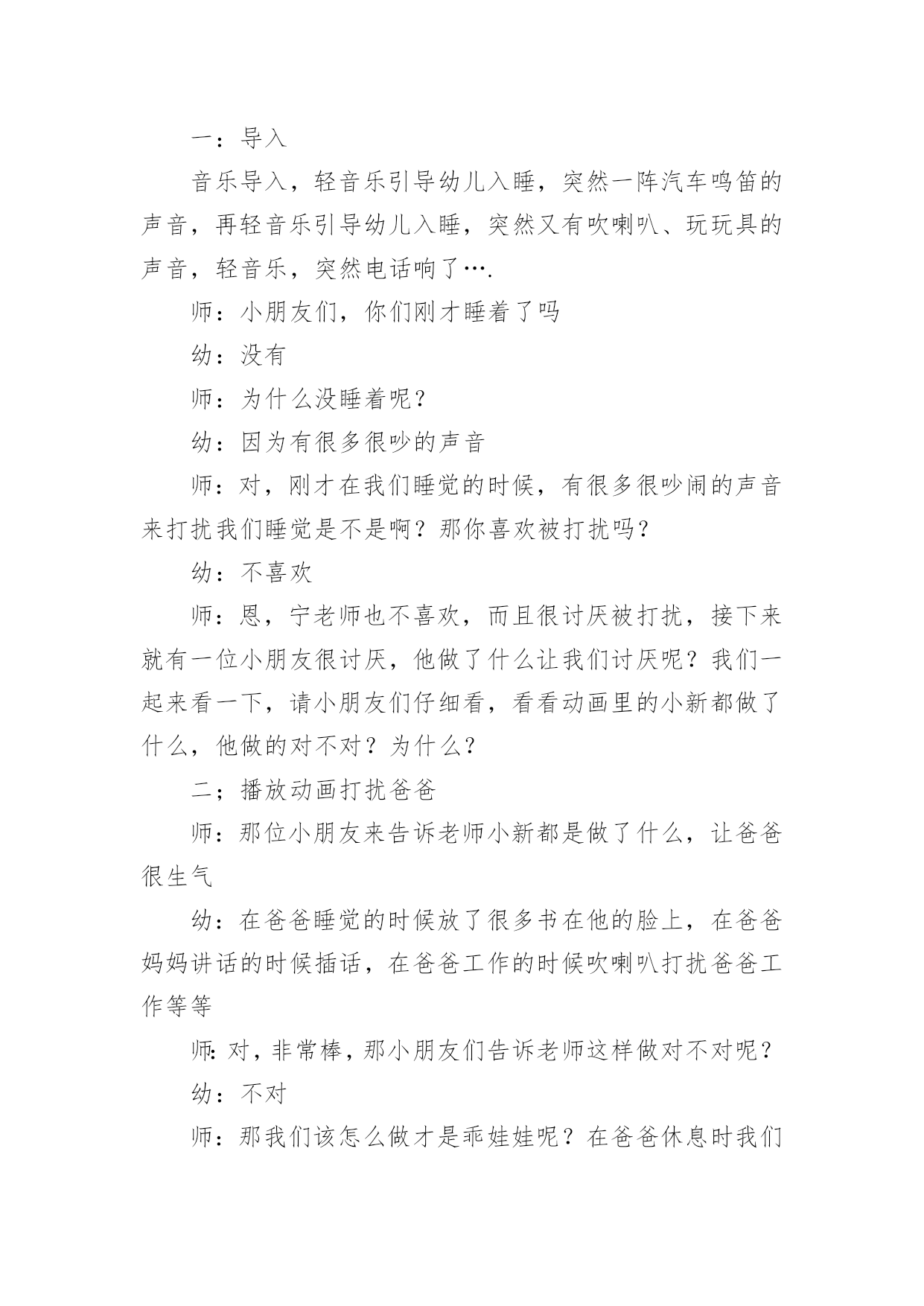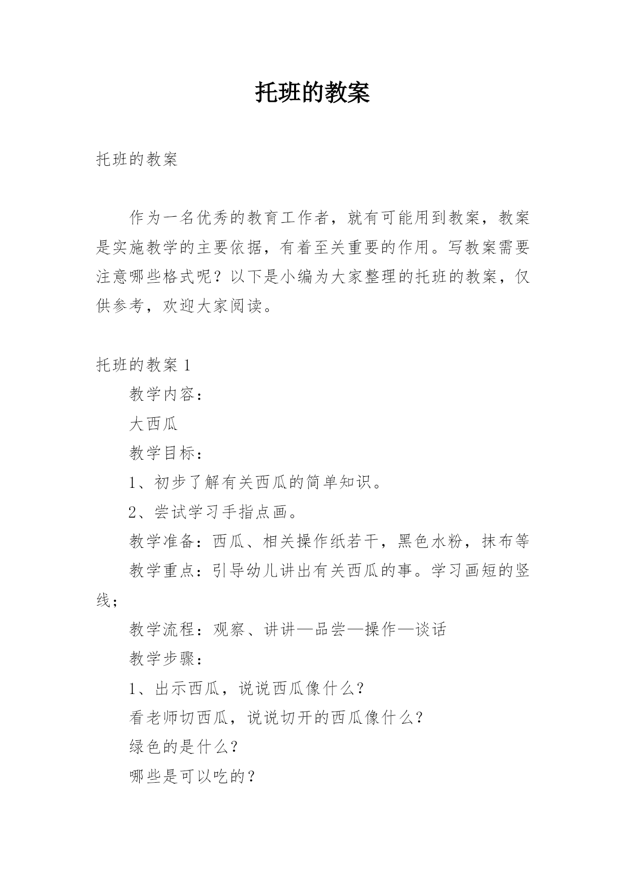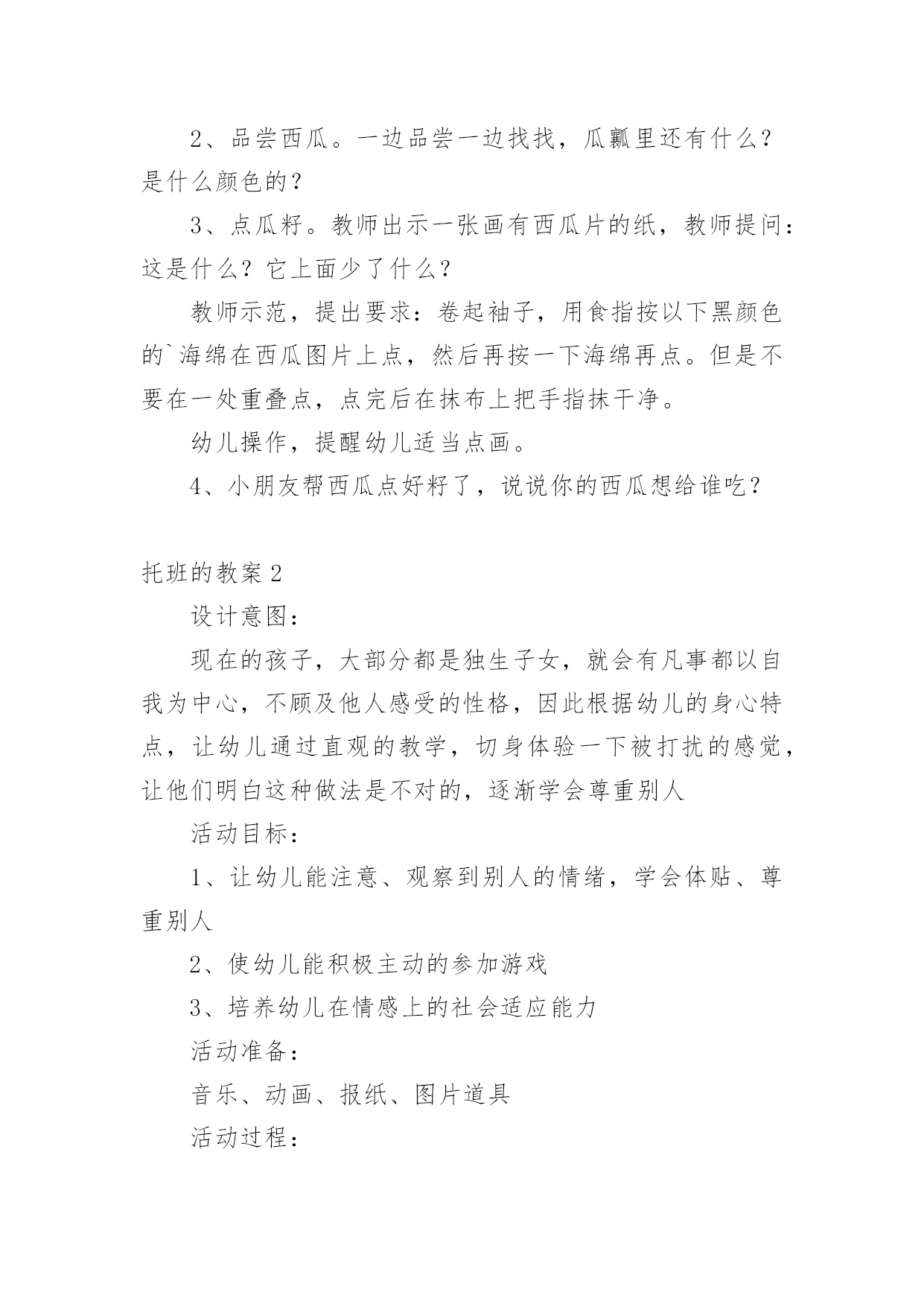 托班的教案 托班的教案作为一名优秀的教育工作者,就有可能用到教案,教案是实施教学的主要依据,有着至关重要的作用。写教案需要注意哪些格式呢?以下是小编为大家整理的托班的教案,仅供参考,欢迎大家阅读。托班的教案1教学内容:大西瓜教学目标:1、初步了解有关西瓜的简单知识。2、尝试学习手指点画。教学准备:西瓜、相关操作纸若干,黑色水粉,抹布等教学重点:引导幼儿讲出有关西瓜的事。学习画短的竖线;教学流程:观察、讲讲—品尝—操作—谈话教学步骤:1、出示西瓜,说说西瓜像什么?看老师切西瓜,说说切开的西瓜像什么?绿色的是什么?哪些是可以吃的?2、品尝西瓜。一边品尝一边找找,瓜瓤里还有什么?是什么颜色的?3、点瓜籽。教师出示一张画有西瓜片的纸,教师提问:这是什么?它上面少了什么?教师示范,提出要求:卷起袖子,用食指按以下黑颜色的`海绵在西瓜图片上点,然后再按一下海绵再点。但是不要在一处重叠点,点完后在抹布上把手指抹干净。幼儿操作,提醒幼儿适当点画。4、小朋友帮西瓜点好籽了,说说你的西瓜想给谁吃?托班的教案2设计意图:现在的孩子,大部分都是独生子女,就会有凡事都以自我为中心,不顾及他人感受的性格,因此根据幼儿的身心特点,让幼儿通过直观的教学,切身体验一下被打扰的感觉,让他们明白这种做法是不对的,逐渐学会尊重别人活动目标:1、让幼儿能注意、观察到别人的情绪,学会体贴、尊重别人2、使幼儿能积极主动的参加游戏3、培养幼儿在情感上的社会适应能力活动准备:音乐、动画、报纸、图片道具活动过程:一:导入音乐导入,轻音乐引导幼儿入睡,突然一阵汽车鸣笛的声音,再轻音乐引导幼儿入睡,突然又有吹喇叭、玩玩具的声音,轻音乐,突然电话响了….师:小朋友们,你们刚才睡着了吗幼:没有师:为什么没睡着呢?幼:因为有很多很吵的声音师:对,刚才在我们睡觉的时候,有很多很吵闹的声音来打扰我们睡觉是不是啊?那你喜欢被打扰吗?幼:不喜欢师:恩,宁老师也不喜欢,而且很讨厌被打扰,接下来就有一位小朋友很讨厌,他做了什么让我们讨厌呢?我们一起来看一下,请小朋友们仔细看,看看动画里的小新都做了什么,他做的对不对?为什么?二;播放动画打扰爸爸师:那位小朋友来告诉老师小新都是做了什么,让爸爸很生气幼:在爸爸睡觉的时候放了很多书在他的脸上,在爸爸妈妈讲话的时候插话,在爸爸工作的时候吹喇叭打扰爸爸工作等等师:对,非常棒,那小朋友们告诉老师这样做对不对呢?幼:不对师:那我们该怎么做才是乖娃娃呢?在爸爸休息时我们应该怎么样?悄悄的,悄悄的玩,悄悄的看电视,师:在爸爸工作的时候我们应该怎么做呢?幼:悄悄的离开,到别处去玩师:当大人在聊天说话的时候我们该怎么做呢?幼:嘘,不要插话2.谈谈在小学音乐课中如何运用多媒体教学随着现代社会科技的迅猛发展,现代化教学媒体在教学中发挥着极其重要的作用。它不仅能刺激学生的视觉和听觉,而且能有效地唤起学生的学习兴趣,开阔他们的视野,提高他们的认知水平和审美能力,并能很好的解决以往教学中出现的困难。在音乐教学中应用多媒体,能使复杂知识简单化、零乱知识条理化,弥补了课堂教学不足,给音乐教学增添了无穷的魅力。一、运用多媒体,激发学生兴趣俗话说,“好的开头等于成功的一半。”一堂课巧妙成功的开头,能使学生的注意力很快集中到课堂教学的内容上去。“兴趣是最好的老师”,兴趣对学习产生的影响,远远超过教师的督促和简单的说教。学生学习音乐的兴趣主要是对形象具体,形式新颖的事物容易引起好奇,演示型的多媒体课件能将文字、图像等直观地展示出来,为学生提供生动逼真的教学情境、丰富多彩的教学资源、为学生营造一个色彩缤纷、声像同步、能动能静的教学情景,从而激发学生的学习兴趣,充分调动学生的视觉、听觉等多种器官,把学生在音乐课堂上的审美体验推向高潮。例如,在教授唱游课《小企鹅》时,由于学生没有去过南极,很少看到过企鹅,为了让他们更好的理解想象歌曲的音乐形象,可将歌曲和有关南极、企鹅的画面剪辑成小影片,课前在大屏幕上循环播放,让学生合着音乐,看着画面进课堂。憨态可掬的企鹅和冰天雪地的南极一下就吸引了学生,使学生情不自禁的萌发了学习这首歌曲的兴趣。学会唱后,可以利用“附件”中的“录音机”将学生的演唱配上伴奏录下来,然后播放,全班欣赏,使学生享受到参与音乐活动的快感,同时也培养了他们的参与意识和表现欲望。二、直观形象,突破难点心理学家认为:动态刺激远大于静态刺激,给人留下的印象也最深刻。教学中,以静态方式存在的教学材料,通过多媒体的手段可恢复其鲜活的面目,使之变得有声有色。采用CAI动态图像演示,利用其文字的闪现、图形的缩放与移动、颜色的变换等手段,容量大、速度快、效果好,不仅能把学生难懂的知识直观的显示出来,而且有较强的刺激作用,有利于促进学生的知识建构。《小乌鸦爱妈妈》是一首两声部的合唱歌曲。此前,学生很少接触