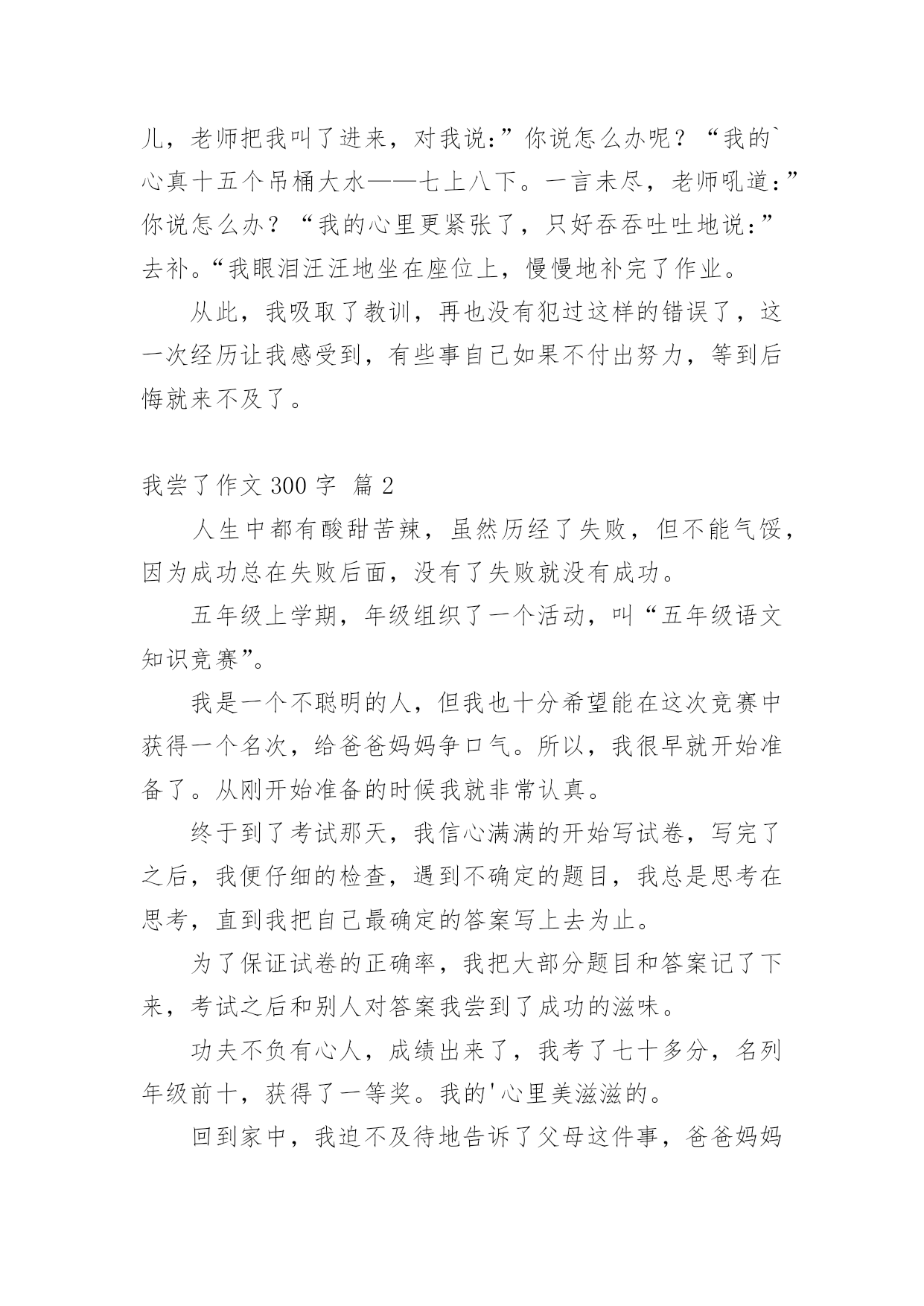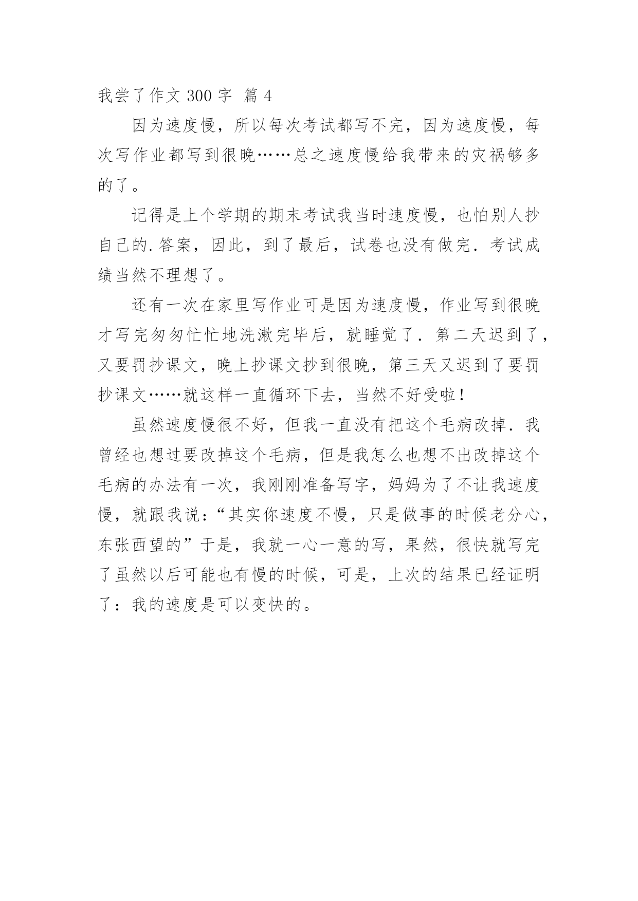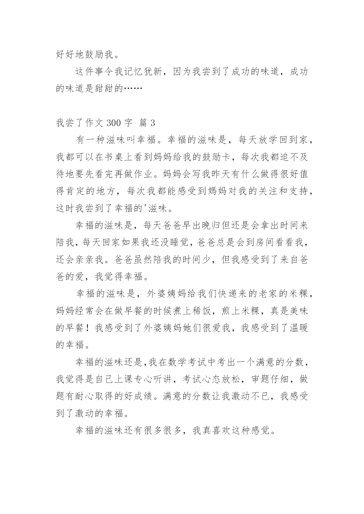 我尝了作文300字 精选我尝了作文300字四篇在我们平凡的日常里,许多人都有过写作文的经历,对作文都不陌生吧,写作文是培养人们的观察力、联想力、想象力、思考力和记忆力的重要手段。那么,怎么去写作文呢?以下是小编收集整理的我尝了作文300字4篇,仅供参考,希望能够帮助到大家。我尝了作文300字篇1在学习中,我们要有良好的状态,这样才能迎接每个挑战,而我总是贪玩,一下课就出去玩了,因此,终有一次,我尝到了后悔的滋味。有一次,我在家做回家作业,做完后,立即装进了书包。第二天,我把作文交了上去。发现数学老师对着我的作业本皱了皱眉头,我只当无所谓。第二天晚上,我心里总是有份不安。第三题,我起得很早,背上书包,背向学校。刚走入班级,数学老师就把我拉到办公室,问我:“怎么空了一页没做呢?”我一看,支支吾吾地说:“我,我不知道。“老师再一次疑问地说:”这可是昨天我布置的作业,就两页,你怎么可能不知道呢?“我的眼睛渐渐湿润了,老师罚我在走廊好好想想该怎么办。这时的我已经说不出话了,我的内心十分紧张,不知道怎么回答老师对我说的问题。过了好一会儿,老师把我叫了进来,对我说:”你说怎么办呢?“我的`心真十五个吊桶大水——七上八下。一言未尽,老师吼道:”你说怎么办?“我的心里更紧张了,只好吞吞吐吐地说:”去补。“我眼泪汪汪地坐在座位上,慢慢地补完了作业。从此,我吸取了教训,再也没有犯过这样的错误了,这一次经历让我感受到,有些事自己如果不付出努力,等到后悔就来不及了。我尝了作文300字篇2人生中都有酸甜苦辣,虽然历经了失败,但不能气馁,因为成功总在失败后面,没有了失败就没有成功。五年级上学期,年级组织了一个活动,叫“五年级语文知识竞赛”。我是一个不聪明的人,但我也十分希望能在这次竞赛中获得一个名次,给爸爸妈妈争口气。所以,我很早就开始准备了。从刚开始准备的时候我就非常认真。终于到了考试那天,我信心满满的开始写试卷,写完了之后,我便仔细的检查,遇到不确定的题目,我总是思考在思考,直到我把自己最确定的答案写上去为止。为了保证试卷的正确率,我把大部分题目和答案记了下来,考试之后和别人对答案我尝到了成功的滋味。功夫不负有心人,成绩出来了,我考了七十多分,名列年级前十,获得了一等奖。我的'心里美滋滋的。回到家中,我迫不及待地告诉了父母这件事,爸爸妈妈好好地鼓励我。这件事令我记忆犹新,因为我尝到了成功的味道,成功的味道是甜甜的……我尝了作文300字篇3有一种滋味叫幸福。幸福的滋味是,每天放学回到家,我都可以在书桌上看到妈妈给我的鼓励卡,每次我都迫不及待地要先看完再做作业。妈妈会写我昨天有什么做得很好值得肯定的地方,每次我都能感受到媽妈对我的关注和支持,这时我尝到了幸福的'滋味。幸福的滋味是,每天爸爸早出晚归但还是会拿出时间来陪我,每天回家如果我还没睡觉,爸爸总是会到房间看看我,还会亲亲我。爸爸虽然陪我的时间少,但我感受到了来自爸爸的爱,我觉得幸福。幸福的滋味是,外婆姨妈给我们快递来的老家的米粿,妈妈经常会在做早餐的时候煮上稀饭,煎上米粿,真是美味的早餐!我感受到了外婆姨妈她们很爱我,我感受到了温暖的幸福。幸福的滋味还是,我在数学考试中考出一个满意的分数,我觉得是自己上课专心听讲,考试心态放松,审题仔细,做题有耐心取得的好成绩。满意的分数让我激动不已,我感受到了激动的幸福。幸福的滋味还有很多很多,我真喜欢这种感觉。我尝了作文300字篇4因为速度慢,所以每次考试都写不完,因为速度慢,每次写作业都写到很晚……总之速度慢给我带来的灾祸够多的了。记得是上个学期的期末考试我当时速度慢,也怕别人抄自己的.答案,因此,到了最后,试卷也没有做完.考试成绩当然不理想了。还有一次在家里写作业可是因为速度慢,作业写到很晚才写完匆匆忙忙地洗漱完毕后,就睡觉了.第二天迟到了,又要罚抄课文,晚上抄课文抄到很晚,第三天又迟到了要罚抄课文……就这样一直循环下去,当然不好受啦!虽然速度慢很不好,但我一直没有把这个毛病改掉.我曾经也想过要改掉这个毛病,但是我怎么也想不出改掉这个毛病的办法有一次,我刚刚准备写字,妈妈为了不让我速度慢,就跟我说:“其实你速度不慢,只是做事的时候老分心,东张西望的”于是,我就一心一意的写,果然,很快就写完了虽然以后可能也有慢的时候,可是,上次的结果已经证明了:我的速度是可以变快的。