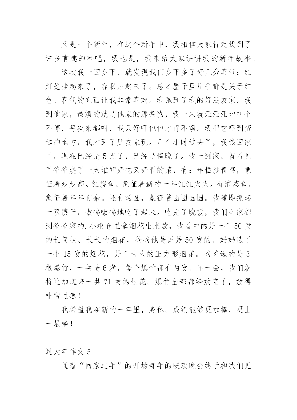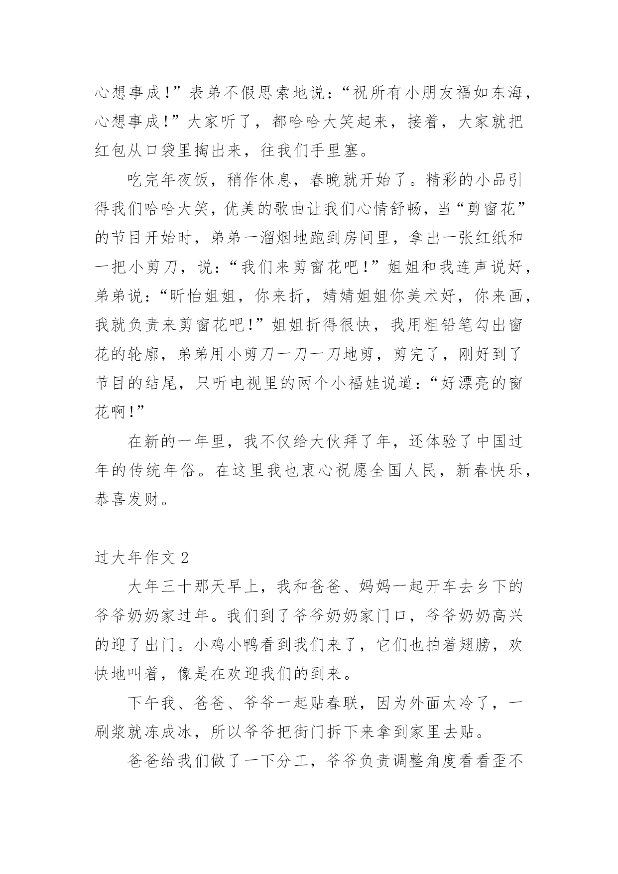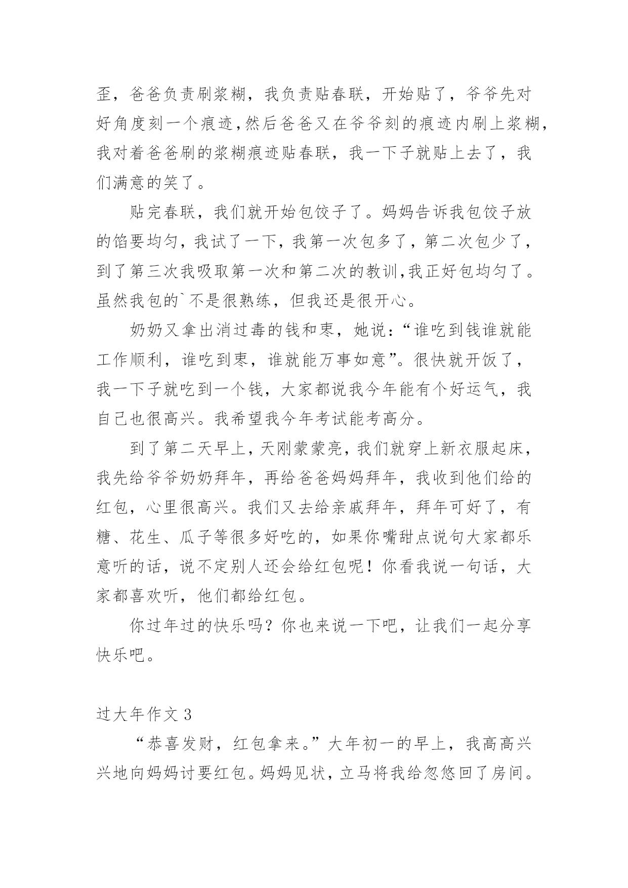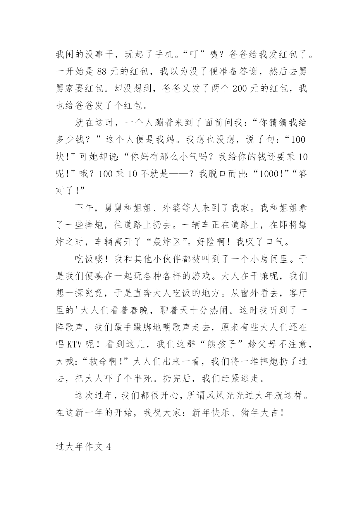 过大年作文 过大年作文在生活、工作和学习中,大家都经常接触到作文吧,通过作文可以把我们那些零零散散的思想,聚集在一块。你写作文时总是无从下笔?下面是小编精心整理的过大年作文,欢迎大家借鉴与参考,希望对大家有所帮助。过大年作文1随着噼里啪啦的爆竹在耳畔响起,整个中国都洋溢在浓浓的年味中。从2月9日起,回家过年的人就多了起来。孩子们都换上了漂亮的新衣,他们笑得格外灿烂,就像一朵火红的牡丹花;大人们都拎着大包小包的水果、保健品、礼物走亲访友。我也穿着鲜红的新衣服,和爸爸妈妈一起去小姨家拜年,姑姑从上海赶过来,家住衢州的表姐,还有开化的.弟弟,他们都带着家乡的特产和温馨的祝福,一起来到杭州过年。年夜饭的餐桌已经布置好了,小姨说:“开饭咯!”我们三个来到饭桌前,菜很丰富,小姨向我们解释道:“过年吃鱼,因为年年有余;吃年糕,因为年年高;吃蜜枣,要甜甜蜜蜜……”大家都入座了,我们便大吃起来。忽然,姐姐提出:“我们给大家拜年吧!”她先说:“祝爷爷奶奶、外公外婆福如东海,寿比南山!”我想了想:“祝阿姨姨夫工作顺利,心想事成!”表弟不假思索地说:“祝所有小朋友福如东海,心想事成!”大家听了,都哈哈大笑起来,接着,大家就把红包从口袋里掏出来,往我们手里塞。吃完年夜饭,稍作休息,春晚就开始了。精彩的小品引得我们哈哈大笑,优美的歌曲让我们心情舒畅,当“剪窗花”的节目开始时,弟弟一溜烟地跑到房间里,拿出一张红纸和一把小剪刀,说:“我们来剪窗花吧!”姐姐和我连声说好,弟弟说:“昕怡姐姐,你来折,婧婧姐姐你美术好,你来画,我就负责来剪窗花吧!”姐姐折得很快,我用粗铅笔勾出窗花的轮廓,弟弟用小剪刀一刀一刀地剪,剪完了,刚好到了节目的结尾,只听电视里的两个小福娃说道:“好漂亮的窗花啊!”在新的一年里,我不仅给大伙拜了年,还体验了中国过年的传统年俗。在这里我也衷心祝愿全国人民,新春快乐,恭喜发财。过大年作文2大年三十那天早上,我和爸爸、妈妈一起开车去乡下的爷爷奶奶家过年。我们到了爷爷奶奶家门口,爷爷奶奶高兴的迎了出门。小鸡小鸭看到我们来了,它们也拍着翅膀,欢快地叫着,像是在欢迎我们的到来。下午我、爸爸、爷爷一起贴春联,因为外面太冷了,一刷浆就冻成冰,所以爷爷把街门拆下来拿到家里去贴。爸爸给我们做了一下分工,爷爷负责调整角度看看歪不歪,爸爸负责刷浆糊,我负责贴春联,开始贴了,爷爷先对好角度刻一个痕迹,然后爸爸又在爷爷刻的痕迹内刷上浆糊,我对着爸爸刷的浆糊痕迹贴春联,我一下子就贴上去了,我们满意的笑了。贴完春联,我们就开始包饺子了。妈妈告诉我包饺子放的馅要均匀,我试了一下,我第一次包多了,第二次包少了,到了第三次我吸取第一次和第二次的教训,我正好包均匀了。虽然我包的`不是很熟练,但我还是很开心。奶奶又拿出消过毒的钱和栆,她说:“谁吃到钱谁就能工作顺利,谁吃到栆,谁就能万事如意”。很快就开饭了,我一下子就吃到一个钱,大家都说我今年能有个好运气,我自己也很高兴。我希望我今年考试能考高分。到了第二天早上,天刚蒙蒙亮,我们就穿上新衣服起床,我先给爷爷奶奶拜年,再给爸爸妈妈拜年,我收到他们给的红包,心里很高兴。我们又去给亲戚拜年,拜年可好了,有糖、花生、瓜子等很多好吃的,如果你嘴甜点说句大家都乐意听的话,说不定别人还会给红包呢!你看我说一句话,大家都喜欢听,他们都给红包。你过年过的快乐吗?你也来说一下吧,让我们一起分享快乐吧。过大年作文3“恭喜发财,红包拿来。”大年初一的早上,我高高兴兴地向妈妈讨要红包。妈妈见状,立马将我给忽悠回了房间。我闲的没事干,玩起了手机。“叮”咦?爸爸给我发红包了。一开始是88元的红包,我以为没了便准备答谢,然后去舅舅家要红包。却没想到,爸爸又发了两个200元的红包,我也给爸爸发了个红包。就在这时,一个人蹦着来到了面前问我:“你猜猜我给多少钱?”这个人便是我妈。我想也没想,说了句:“100块!”可她却说:“你妈有那么小气吗?我给你的钱还要乘10呢!”哦?100乘10不就是——?我脱口而出:“1000!”“答对了!”下午,舅舅和姐姐、外婆等人来到了我家。我和姐姐拿了一些摔炮,往道路上扔去。一辆车正在道路上,在即将爆炸之时,车辆离开了“轰炸区”。好险啊!我叹了口气。吃饭喽!我和其他小伙伴都被叫到了一个小房间里。于是我们便凑在一起玩各种各样的游戏。大人在干嘛呢,我们想一探究竟,于是直奔大人吃饭的地方。从窗外看去,客厅里的'大人们看着春晚,聊着天十分热闹。这时我听到了一阵歌声,我们蹑手蹑脚地朝歌声走去,原来有些大人们还在唱KTV呢!看到这儿,我们这群“熊孩子”趁父母不注意,大喊:“救命啊!”大人们出来一看,我们将一堆摔炮扔了过去,把大人吓了个半死。扔完后,我们赶紧逃走。这次过年,我们都很开心,所谓风风光光过大年就这样。在这新一年的开始,我祝大家:新年快乐、猪