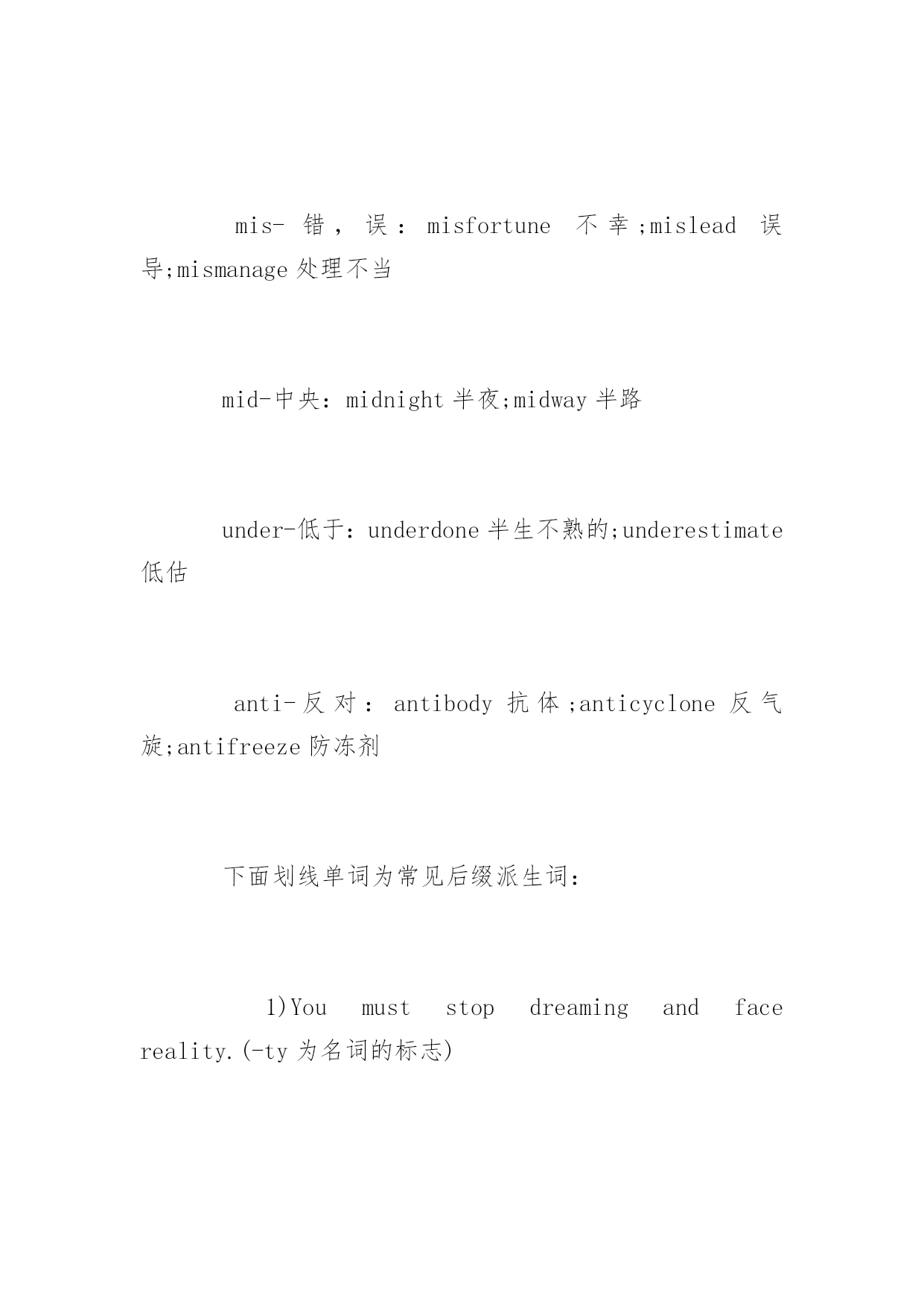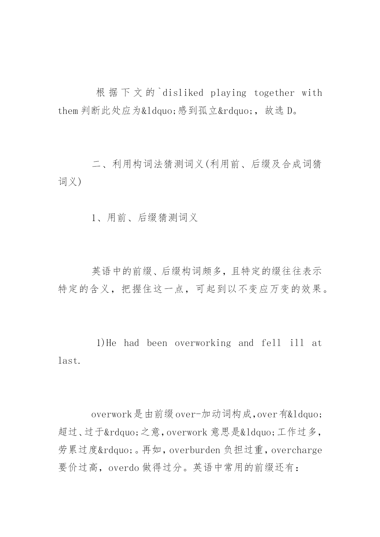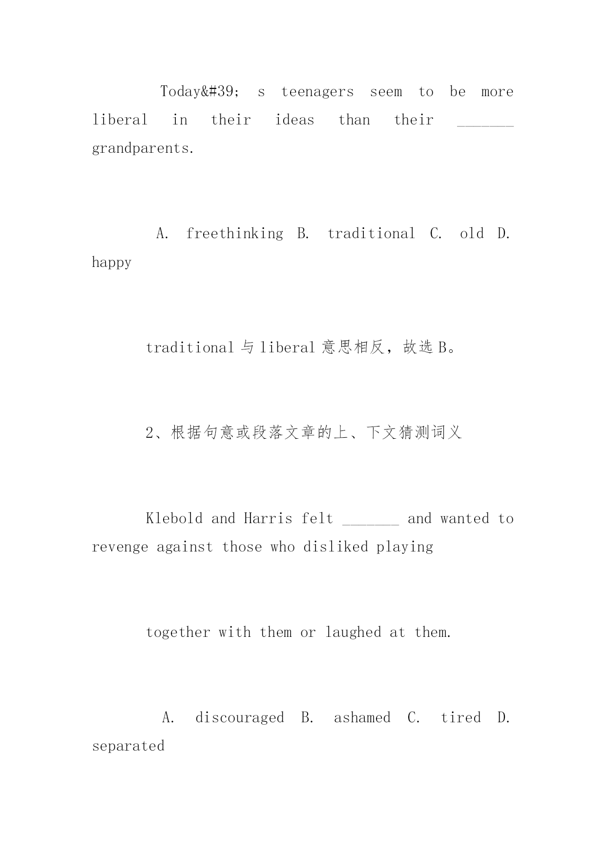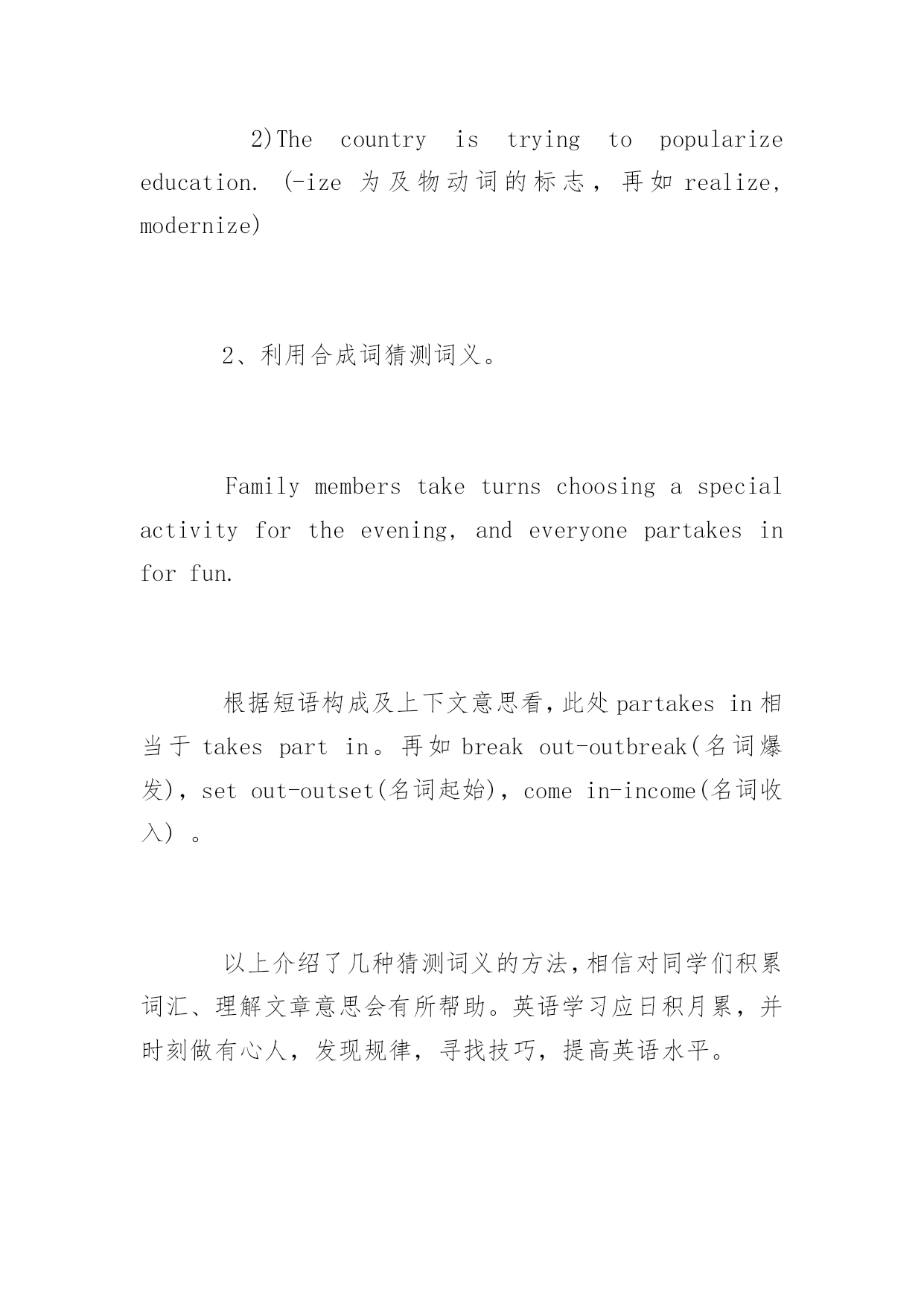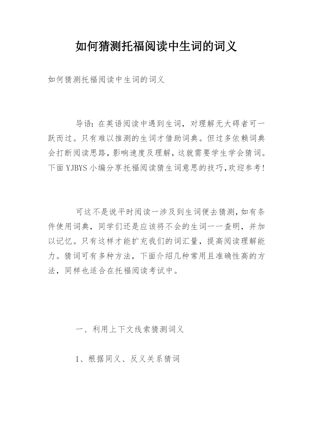 如何猜测托福阅读中生词的词义 如何猜测托福阅读中生词的词义 导语:在英语阅读中遇到生词,对理解无大碍者可一跃而过。只有难以推测的生词才借助词典。但过多依赖词典会打断阅读思路,影响速度及理解,这就需要学生学会猜词。下面YJBYS小编分享托福阅读猜生词意思的技巧,欢迎参考! 可这不是说平时阅读一涉及到生词便去猜测,如有条件使用词典,同学们还是应该将不会的生词一一查明,并加以记忆。只有这样才能扩充我们的词汇量,提高阅读理解能力。猜词可有多种方法,下面介绍几种常用且准确性高的方法,同样也适合在托福阅读考试中。 一、利用上下文线索猜测词义 1、根据同义、反义关系猜词 Today'steenagersseemtobemoreliberalintheirideasthantheir_______grandparents. A.freethinkingB.traditionalC.oldD.happy traditional与liberal意思相反,故选B。 2、根据句意或段落文章的上、下文猜测词义 KleboldandHarrisfelt_______andwantedtorevengeagainstthosewhodislikedplaying togetherwiththemorlaughedatthem. A.discouragedB.ashamedC.tiredD.separated 根据下文的`dislikedplayingtogetherwiththem判断此处应为“感到孤立”,故选D。 二、利用构词法猜测词义(利用前、后缀及合成词猜词义) 1、用前、后缀猜测词义 英语中的前缀、后缀构词颇多,且特定的缀往往表示特定的含义,把握住这一点,可起到以不变应万变的效果。 1)Hehadbeenoverworkingandfellillatlast. overwork是由前缀over-加动词构成,over有“超过、过于”之意,overwork意思是“工作过多,劳累过度”。再如,overburden负担过重,overcharge要价过高,overdo做得过分。英语中常用的前缀还有: mis-错,误:misfortune不幸;mislead误导;mismanage处理不当 mid-中央:midnight半夜;midway半路 under-低于:underdone半生不熟的;underestimate低估 anti-反对:antibody抗体;anticyclone反气旋;antifreeze防冻剂 下面划线单词为常见后缀派生词: 1)Youmuststopdreamingandfacereality.(-ty为名词的标志) 2)Thecountryistryingtopopularizeeducation.(-ize为及物动词的标志,再如realize,modernize) 2、利用合成词猜测词义。 Familymemberstaketurnschoosingaspecialactivityfortheevening,andeveryonepartakesinforfun. 根据短语构成及上下文意思看,此处partakesin相当于takespartin。再如breakout-outbreak(名词爆发),setout-outset(名词起始),comein-income(名词收入)。 以上介绍了几种猜测词义的方法,相信对同学们积累词汇、理解文章意思会有所帮助。英语学习应日积月累,并时刻做有心人,发现规律,寻找技巧,提高英语水平。