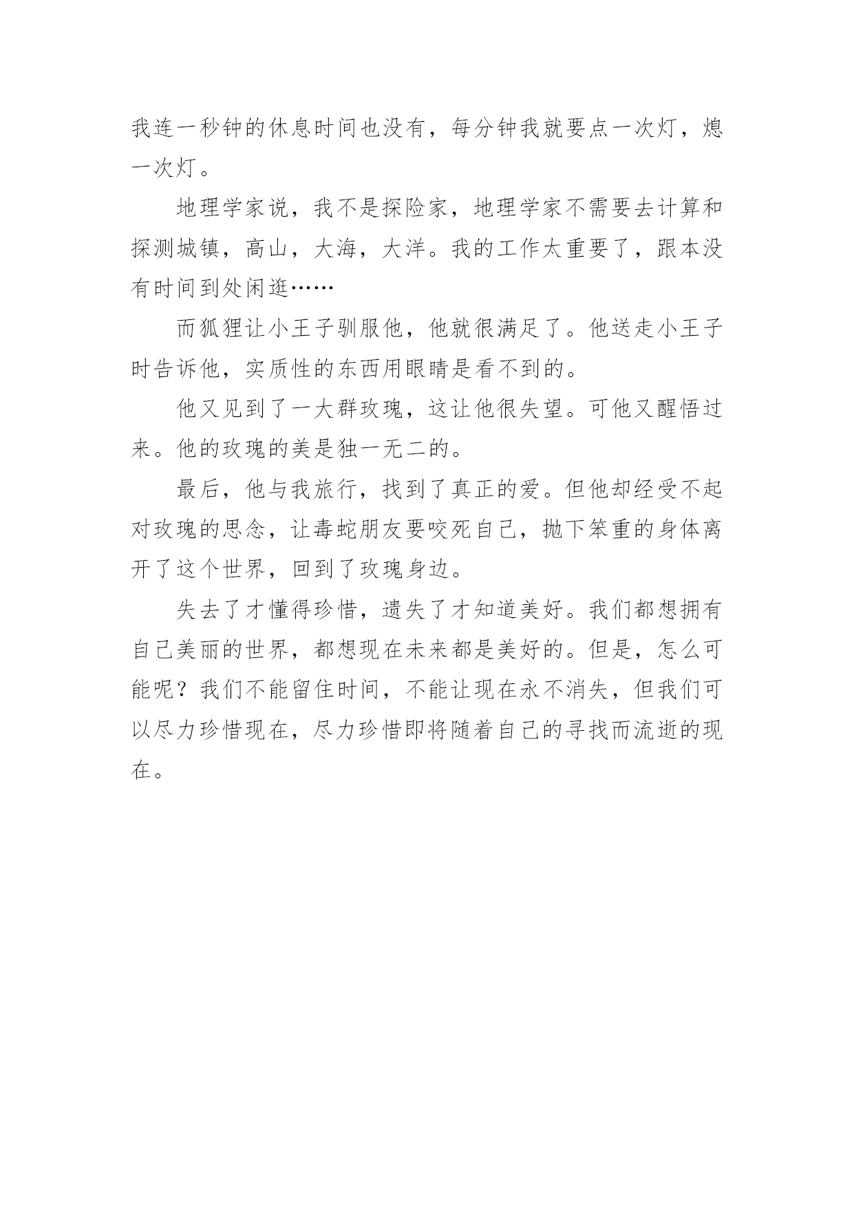 小王子高三读后感700字 小王子高三读后感范文700字这个寒假里,我读了《小王子》这本书。这本书对我深有感触。它很感人,时不时地想让人感动得流泪。主人公小王子住在B612星球。这个星球小的让人不可思议。它只住得下两座小火山、一朵玫瑰和一个人。他勤勉地疏通火山口,拔着猴面包树的幼苗,还一直照顾着他心爱的玫瑰。但因为一次与玫瑰的感情纠纷,他把他的星球打扫得干干净净之便离开了这个星球。他走之前用了罩子玫瑰保护起来。他拜访了周围的几个星球。上面住着一些无聊的大人。国王说:我的星球上有一只爱叫的老鼠,我偶尔会判它死刑。可我每次又不得不赦免它,因为它是这个星球上唯一的一个老鼠。爱慕虚荣的人对小王子说:我是这个星球上最帅,最会穿衣服,最有钱,最聪明的人,虽然这个星球上只有他一个人。酒鬼说,他喝酒为了忘却,忘却一切羞耻,而羞耻的内容恰恰是因为喝酒。商人说,他数星星数了44年,这些天上的`星星都属于他,拥有这些星星,他就会变得更富有,而富有,又会买更多的星星。灯夫说。行星一年转得比一年快,现在每分钟转一圈,我连一秒钟的休息时间也没有,每分钟我就要点一次灯,熄一次灯。地理学家说,我不是探险家,地理学家不需要去计算和探测城镇,高山,大海,大洋。我的工作太重要了,跟本没有时间到处闲逛……而狐狸让小王子驯服他,他就很满足了。他送走小王子时告诉他,实质性的东西用眼睛是看不到的。他又见到了一大群玫瑰,这让他很失望。可他又醒悟过来。他的玫瑰的美是独一无二的。最后,他与我旅行,找到了真正的爱。但他却经受不起对玫瑰的思念,让毒蛇朋友要咬死自己,抛下笨重的身体离开了这个世界,回到了玫瑰身边。失去了才懂得珍惜,遗失了才知道美好。我们都想拥有自己美丽的世界,都想现在未来都是美好的。但是,怎么可能呢?我们不能留住时间,不能让现在永不消失,但我们可以尽力珍惜现在,尽力珍惜即将随着自己的寻找而流逝的现在。