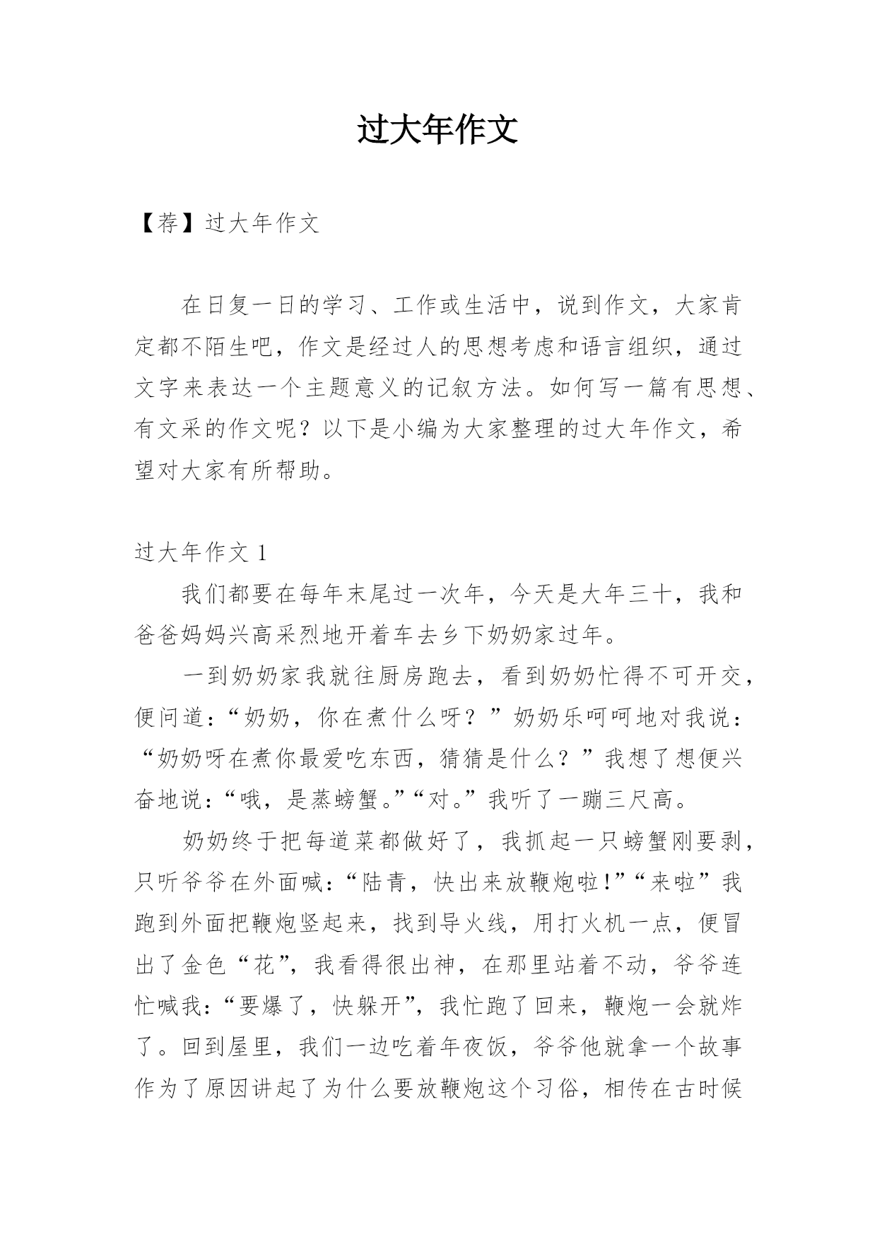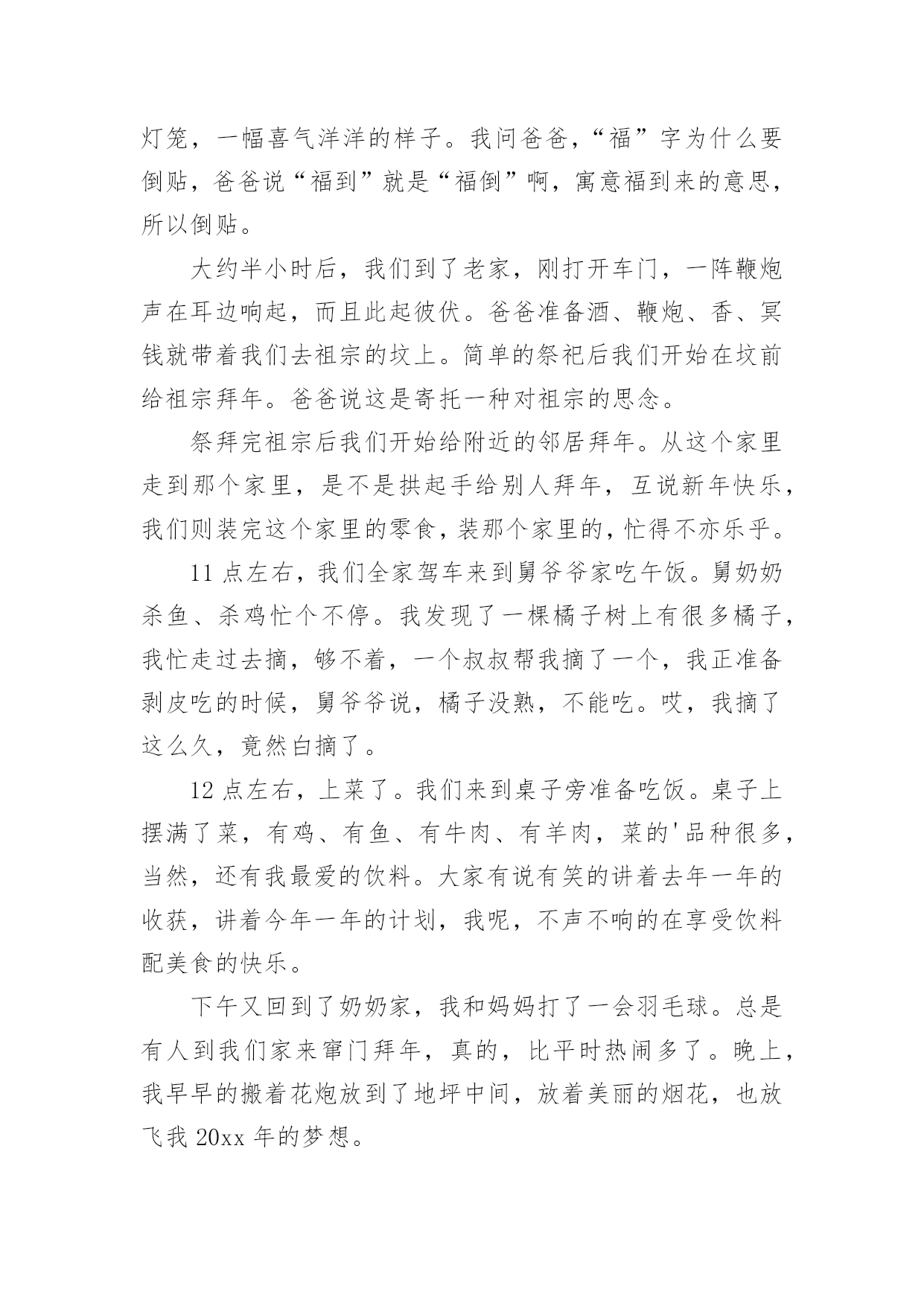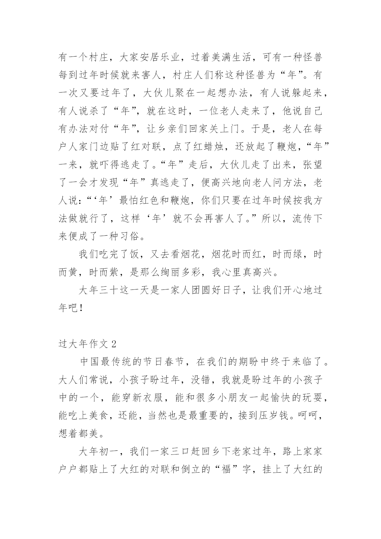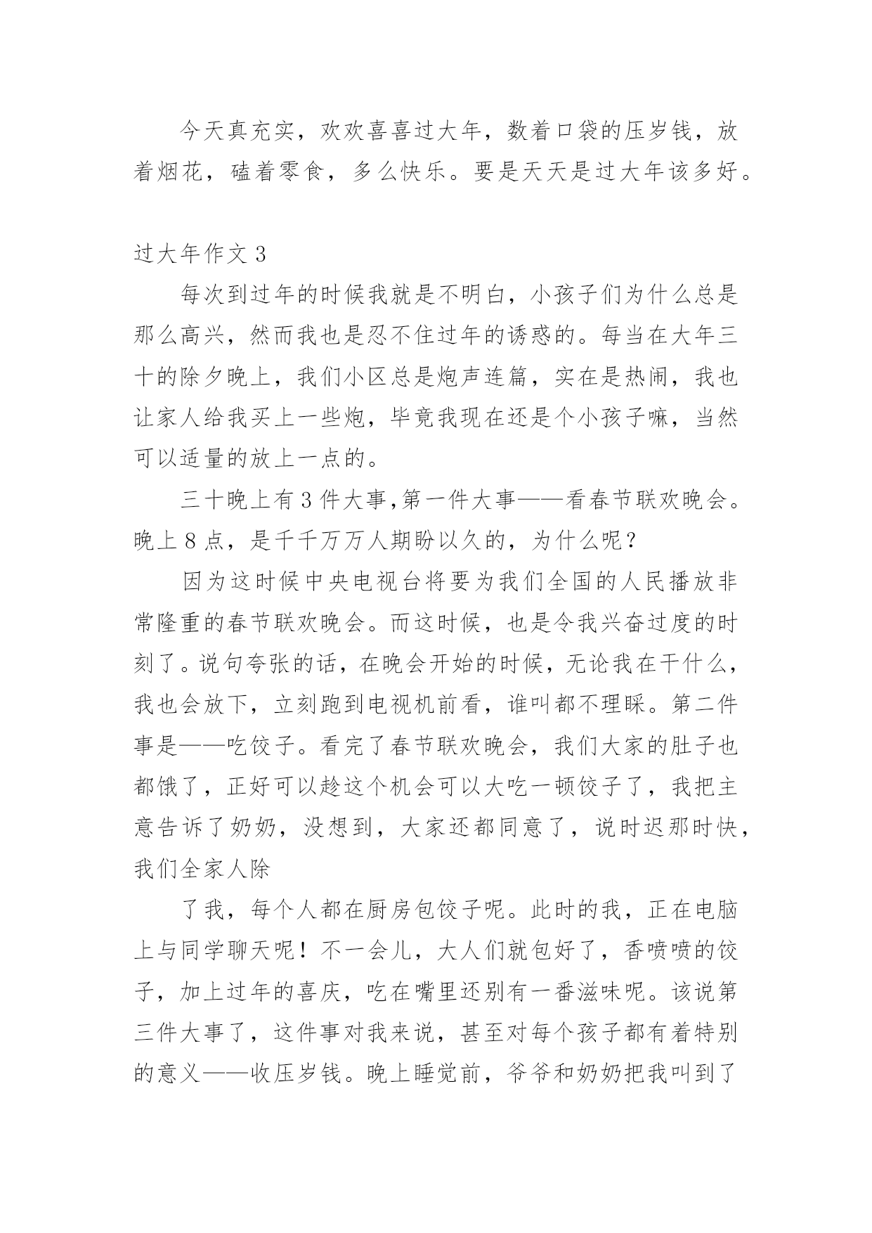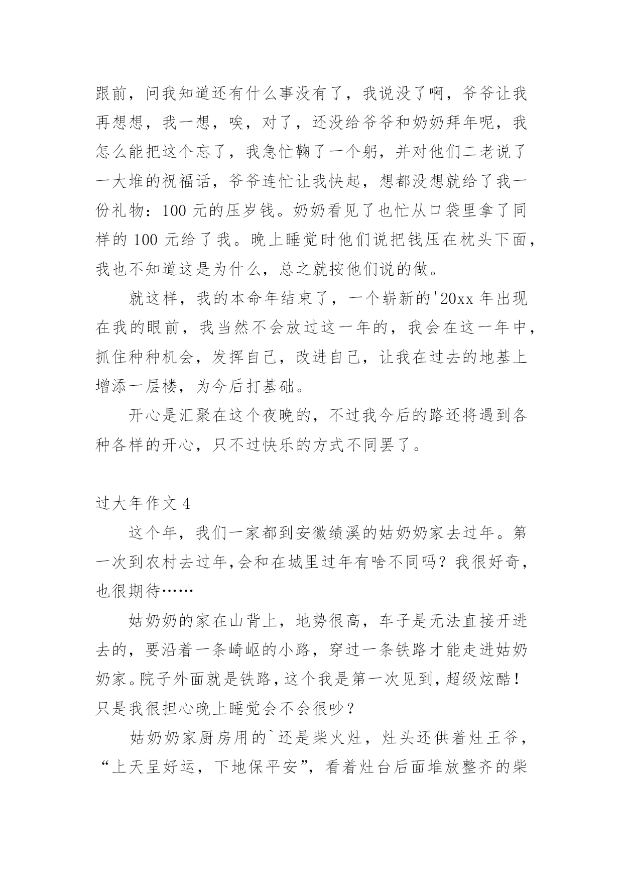 过大年作文 【荐】过大年作文在日复一日的学习、工作或生活中,说到作文,大家肯定都不陌生吧,作文是经过人的思想考虑和语言组织,通过文字来表达一个主题意义的记叙方法。如何写一篇有思想、有文采的作文呢?以下是小编为大家整理的过大年作文,希望对大家有所帮助。过大年作文1我们都要在每年末尾过一次年,今天是大年三十,我和爸爸妈妈兴高采烈地开着车去乡下奶奶家过年。一到奶奶家我就往厨房跑去,看到奶奶忙得不可开交,便问道:“奶奶,你在煮什么呀?”奶奶乐呵呵地对我说:“奶奶呀在煮你最爱吃东西,猜猜是什么?”我想了想便兴奋地说:“哦,是蒸螃蟹。”“对。”我听了一蹦三尺高。奶奶终于把每道菜都做好了,我抓起一只螃蟹刚要剥,只听爷爷在外面喊:“陆青,快出来放鞭炮啦!”“来啦”我跑到外面把鞭炮竖起来,找到导火线,用打火机一点,便冒出了金色“花”,我看得很出神,在那里站着不动,爷爷连忙喊我:“要爆了,快躲开”,我忙跑了回来,鞭炮一会就炸了。回到屋里,我们一边吃着年夜饭,爷爷他就拿一个故事作为了原因讲起了为什么要放鞭炮这个习俗,相传在古时候有一个村庄,大家安居乐业,过着美满生活,可有一种怪兽每到过年时候就来害人,村庄人们称这种怪兽为“年”。有一次又要过年了,大伙儿聚在一起想办法,有人说躲起来,有人说杀了“年”,就在这时,一位老人走来了,他说自己有办法对付“年”,让乡亲们回家关上门。于是,老人在每户人家门边贴了红对联,点了红蜡烛,还放起了鞭炮,“年”一来,就吓得逃走了。“年”走后,大伙儿走了出来,张望了一会才发现“年”真逃走了,便高兴地向老人问方法,老人说:“‘年’最怕红色和鞭炮,你们只要在过年时候按我方法做就行了,这样‘年’就不会再害人了。”所以,流传下来便成了一种习俗。我们吃完了饭,又去看烟花,烟花时而红,时而绿,时而黄,时而紫,是那么绚丽多彩,我心里真高兴。大年三十这一天是一家人团圆好日子,让我们开心地过年吧!过大年作文2中国最传统的节日春节,在我们的期盼中终于来临了。大人们常说,小孩子盼过年,没错,我就是盼过年的小孩子中的一个,能穿新衣服,能和很多小朋友一起愉快的玩耍,能吃上美食,还能,当然也是最重要的,接到压岁钱。呵呵,想着都美。大年初一,我们一家三口赶回乡下老家过年,路上家家户户都贴上了大红的对联和倒立的“福”字,挂上了大红的灯笼,一幅喜气洋洋的样子。我问爸爸,“福”字为什么要倒贴,爸爸说“福到”就是“福倒”啊,寓意福到来的意思,所以倒贴。大约半小时后,我们到了老家,刚打开车门,一阵鞭炮声在耳边响起,而且此起彼伏。爸爸准备酒、鞭炮、香、冥钱就带着我们去祖宗的坟上。简单的祭祀后我们开始在坟前给祖宗拜年。爸爸说这是寄托一种对祖宗的思念。祭拜完祖宗后我们开始给附近的邻居拜年。从这个家里走到那个家里,是不是拱起手给别人拜年,互说新年快乐,我们则装完这个家里的零食,装那个家里的,忙得不亦乐乎。11点左右,我们全家驾车来到舅爷爷家吃午饭。舅奶奶杀鱼、杀鸡忙个不停。我发现了一棵橘子树上有很多橘子,我忙走过去摘,够不着,一个叔叔帮我摘了一个,我正准备剥皮吃的时候,舅爷爷说,橘子没熟,不能吃。哎,我摘了这么久,竟然白摘了。12点左右,上菜了。我们来到桌子旁准备吃饭。桌子上摆满了菜,有鸡、有鱼、有牛肉、有羊肉,菜的'品种很多,当然,还有我最爱的饮料。大家有说有笑的讲着去年一年的收获,讲着今年一年的计划,我呢,不声不响的在享受饮料配美食的快乐。下午又回到了奶奶家,我和妈妈打了一会羽毛球。总是有人到我们家来窜门拜年,真的,比平时热闹多了。晚上,我早早的搬着花炮放到了地坪中间,放着美丽的烟花,也放飞我20xx年的梦想。今天真充实,欢欢喜喜过大年,数着口袋的压岁钱,放着烟花,磕着零食,多么快乐。要是天天是过大年该多好。过大年作文3每次到过年的时候我就是不明白,小孩子们为什么总是那么高兴,然而我也是忍不住过年的诱惑的。每当在大年三十的除夕晚上,我们小区总是炮声连篇,实在是热闹,我也让家人给我买上一些炮,毕竟我现在还是个小孩子嘛,当然可以适量的放上一点的。三十晚上有3件大事,第一件大事——看春节联欢晚会。晚上8点,是千千万万人期盼以久的,为什么呢?因为这时候中央电视台将要为我们全国的人民播放非常隆重的春节联欢晚会。而这时候,也是令我兴奋过度的时刻了。说句夸张的话,在晚会开始的时候,无论我在干什么,我也会放下,立刻跑到电视机前看,谁叫都不理睬。第二件事是——吃饺子。看完了春节联欢晚会,我们大家的肚子也都饿了,正好可以趁这个机会可以大吃一顿饺子了,我把主意告诉了奶奶,没想到,大家还都同意了,说时迟那时快,我们全家人除了我,每个人都在厨房包饺子呢。此时的我,正在电脑上与同学聊天呢!不一会儿,大人们就包好了,香喷喷的饺子,加上过年的喜庆,吃在嘴里还别有一番滋味呢。该说第三件大事了,这件事