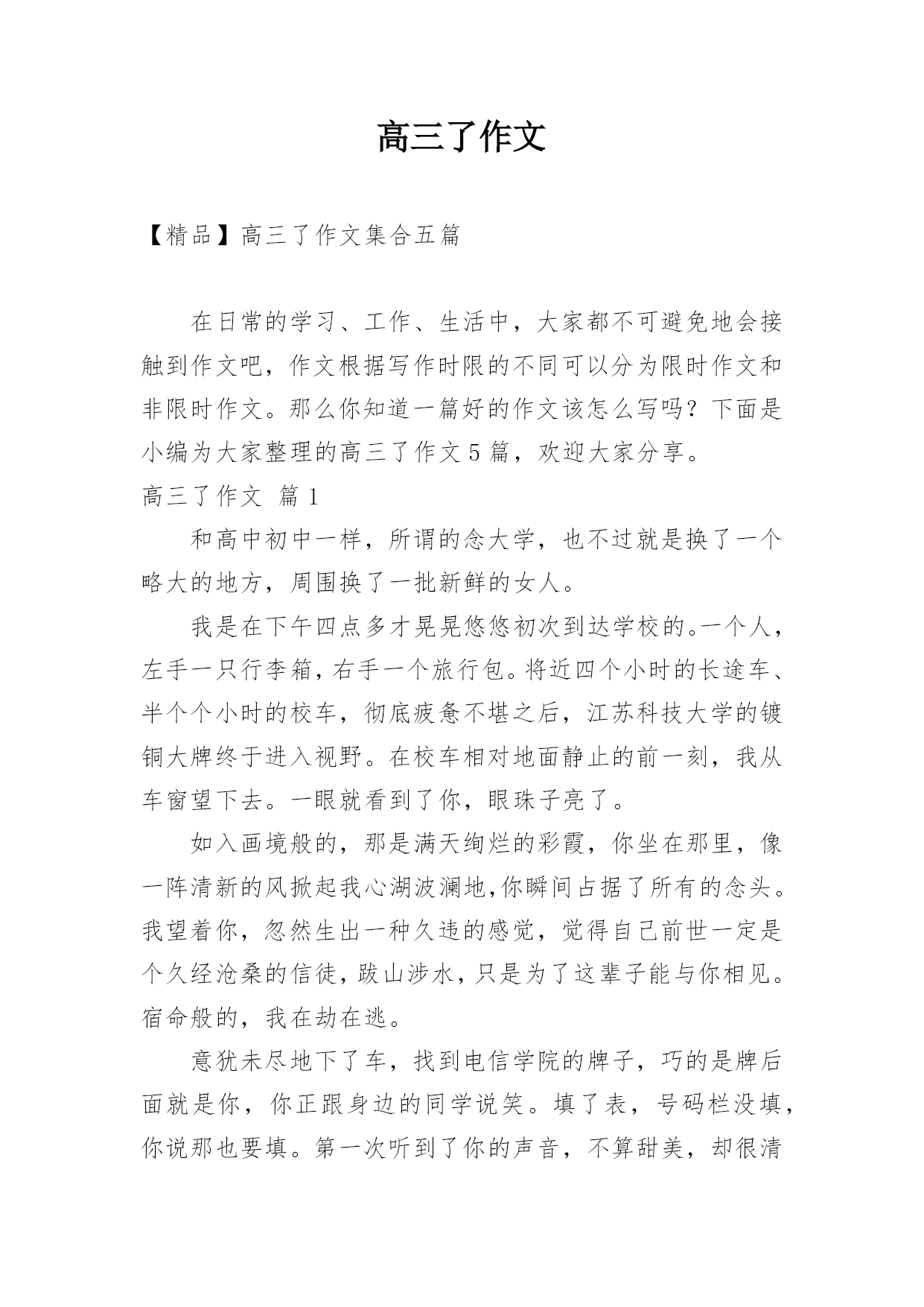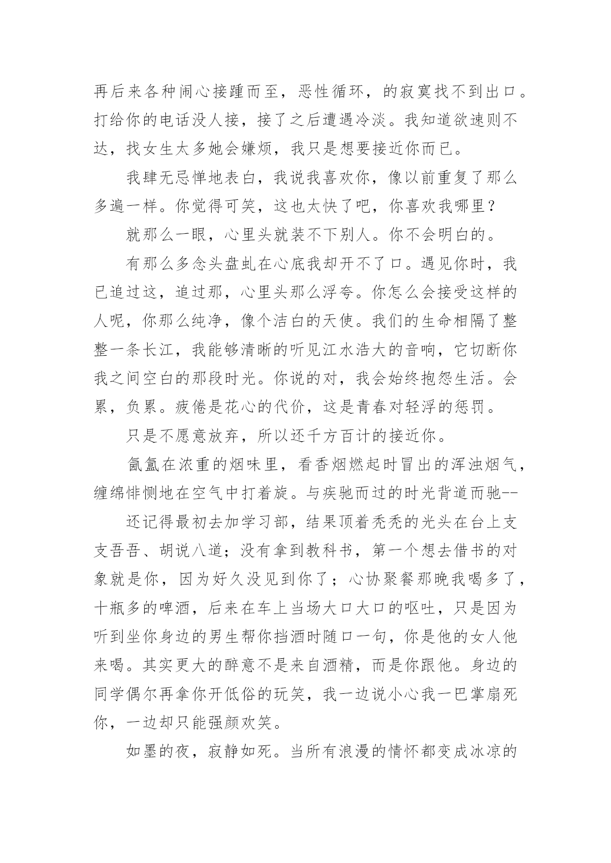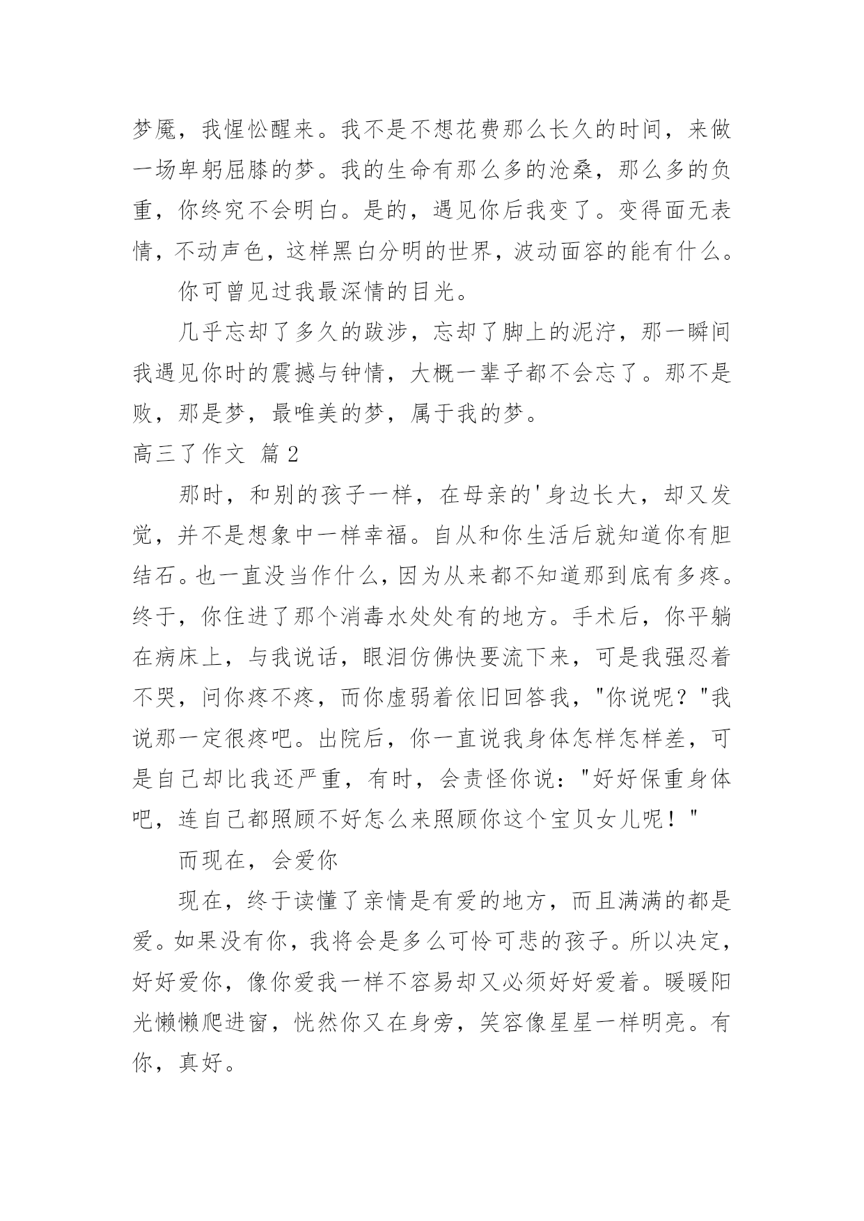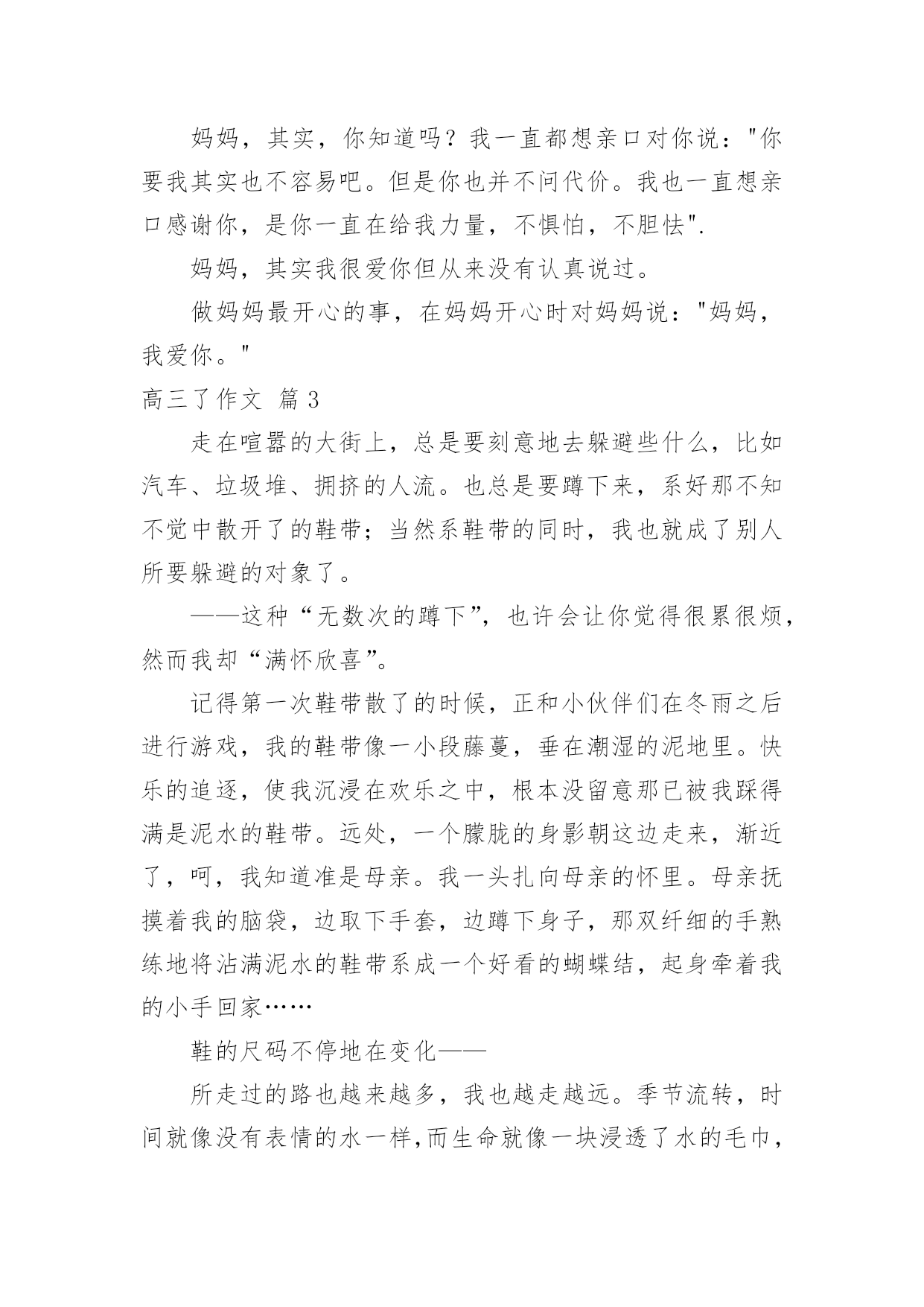 高三了作文 【精品】高三了作文集合五篇在日常的学习、工作、生活中,大家都不可避免地会接触到作文吧,作文根据写作时限的不同可以分为限时作文和非限时作文。那么你知道一篇好的作文该怎么写吗?下面是小编为大家整理的高三了作文5篇,欢迎大家分享。高三了作文篇1和高中初中一样,所谓的念大学,也不过就是换了一个略大的地方,周围换了一批新鲜的女人。我是在下午四点多才晃晃悠悠初次到达学校的。一个人,左手一只行李箱,右手一个旅行包。将近四个小时的长途车、半个个小时的校车,彻底疲惫不堪之后,江苏科技大学的镀铜大牌终于进入视野。在校车相对地面静止的前一刻,我从车窗望下去。一眼就看到了你,眼珠子亮了。如入画境般的,那是满天绚烂的彩霞,你坐在那里,像一阵清新的风掀起我心湖波澜地,你瞬间占据了所有的念头。我望着你,忽然生出一种久违的感觉,觉得自己前世一定是个久经沧桑的信徒,跋山涉水,只是为了这辈子能与你相见。宿命般的,我在劫在逃。意犹未尽地下了车,找到电信学院的牌子,巧的是牌后面就是你,你正跟身边的同学说笑。填了表,号码栏没填,你说那也要填。第一次听到了你的声音,不算甜美,却很清新,一如你的容颜。后来才想起竟忘记回答你,我忘了。脑海中一片空白,什么都没有。只有大脑控制着眼球,发出痴痴的望。烧,脸烧得厉害,那一刻的火辣感觉,你不会明白的。就这样冠冕堂皇地得到了你号码,匆匆跟着学长去了宿舍。宿舍一共安排了六个人,开始以为会挤,渐渐也就习惯。那个时候温度适宜,清风荡漾,学校到处是浓郁的树木,撇开学校的蚂蚁块头实在是太大不谈,应该是个不错的学校了。何况还遇见了你。我只能说,可惜我只是一个花心的人。惊鸿一瞥的的也只是你的清纯外表。我们是不同的人,我该怎样接近你呢。那个夜晚,还是摁下了信息,约你出来“带我参观学校”。现在已经彻底忘了到底跟你说了些什么,但那个时刻里,在无边的夜色下,我的心里仿佛揣了只兔子,具体表现就是语无伦次毫无章法,说出来的又总是首尾纠结自相矛盾,一个彻底的'大**。亏我之前还一直自我感觉良好,觉得自己从来不是个拖泥带水的人,遇见了你一下子就废了。回来反省第一感觉就是,宋志杰,约见个女生你怎么还会紧张……走到最后渐渐无话可讲,还是坚持着有一句没一句的瞎扯。走到没灯的地方去,脸上却还是发烧,夜幕下我的表现让人彻底失望。像是断裂的东非大裂谷,那晚睡觉时无尽的失落和膨胀的虚无能将我埋葬。你的优秀也不需要我来说什么,事实有目共睹。这是大学的第一次约会,难免放不下心,所以回宿舍立即画蛇添足地打了个电话。唯一庆幸的是,那时的你还是及时接听了的。再后来各种闹心接踵而至,恶性循环,的寂寞找不到出口。打给你的电话没人接,接了之后遭遇冷淡。我知道欲速则不达,找女生太多她会嫌烦,我只是想要接近你而已。我肆无忌惮地表白,我说我喜欢你,像以前重复了那么多遍一样。你觉得可笑,这也太快了吧,你喜欢我哪里?就那么一眼,心里头就装不下别人。你不会明白的。有那么多念头盘虬在心底我却开不了口。遇见你时,我已追过这,追过那,心里头那么浮夸。你怎么会接受这样的人呢,你那么纯净,像个洁白的天使。我们的生命相隔了整整一条长江,我能够清晰的听见江水浩大的音响,它切断你我之间空白的那段时光。你说的对,我会始终抱怨生活。会累,负累。疲倦是花心的代价,这是青春对轻浮的惩罚。只是不愿意放弃,所以还千方百计的接近你。氤氲在浓重的烟味里,看香烟燃起时冒出的浑浊烟气,缠绵悱恻地在空气中打着旋。与疾驰而过的时光背道而驰--还记得最初去加学习部,结果顶着秃秃的光头在台上支支吾吾、胡说八道;没有拿到教科书,第一个想去借书的对象就是你,因为好久没见到你了;心协聚餐那晚我喝多了,十瓶多的啤酒,后来在车上当场大口大口的呕吐,只是因为听到坐你身边的男生帮你挡酒时随口一句,你是他的女人他来喝。其实更大的醉意不是来自酒精,而是你跟他。身边的同学偶尔再拿你开低俗的玩笑,我一边说小心我一巴掌扇死你,一边却只能强颜欢笑。如墨的夜,寂静如死。当所有浪漫的情怀都变成冰凉的梦魇,我惺忪醒来。我不是不想花费那么长久的时间,来做一场卑躬屈膝的梦。我的生命有那么多的沧桑,那么多的负重,你终究不会明白。是的,遇见你后我变了。变得面无表情,不动声色,这样黑白分明的世界,波动面容的能有什么。你可曾见过我最深情的目光。几乎忘却了多久的跋涉,忘却了脚上的泥泞,那一瞬间我遇见你时的震撼与钟情,大概一辈子都不会忘了。那不是败,那是梦,最唯美的梦,属于我的梦。高三了作文篇2那时,和别的孩子一样,在母亲的'身边长大,却又发觉,并不是想象中一样幸福。自从和你生活后就知道你有胆结石。也一直没当作什么,因为从来都不知道那到底有多疼。终于,你住进了那个消毒水处处有的地方。手术后,你平躺在病床上,与我说话,眼泪仿佛快要流下来,可是我强忍着不哭,问你疼不疼,而你虚弱着依旧回
