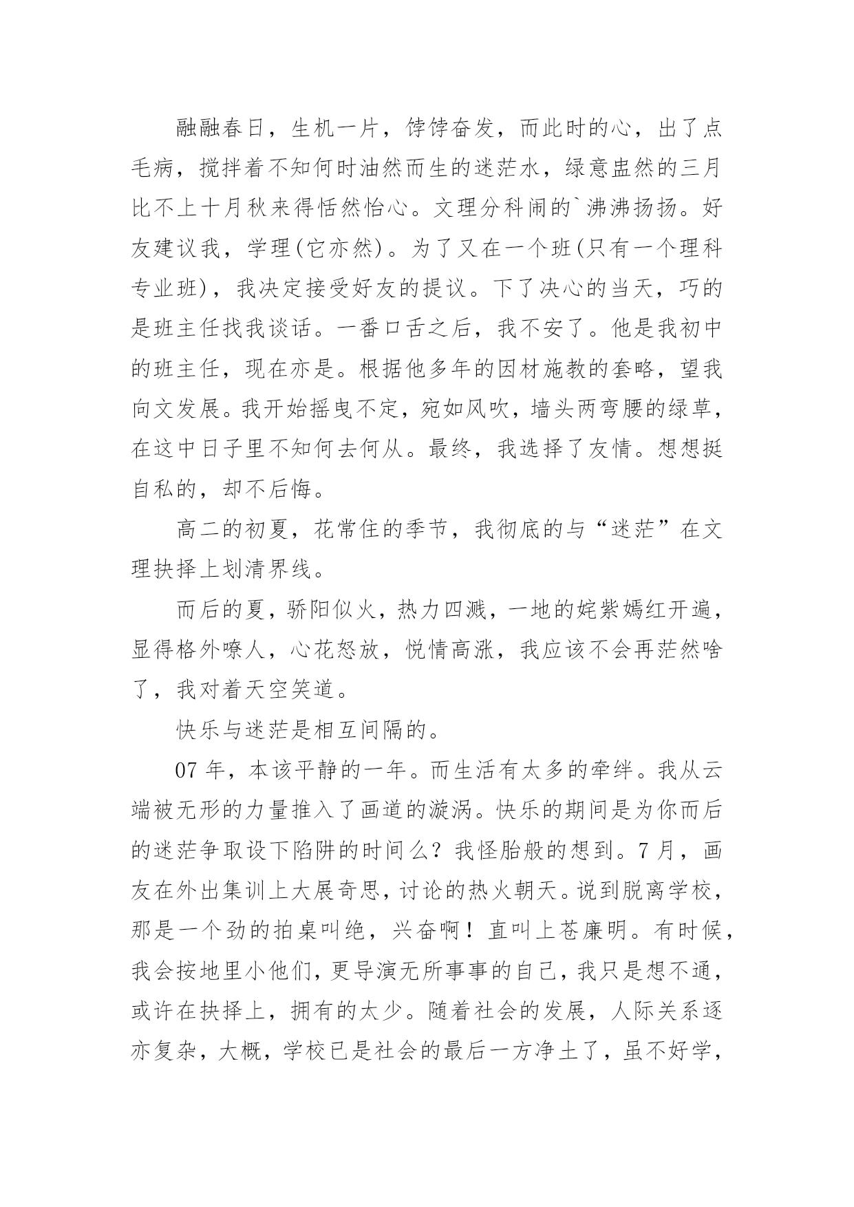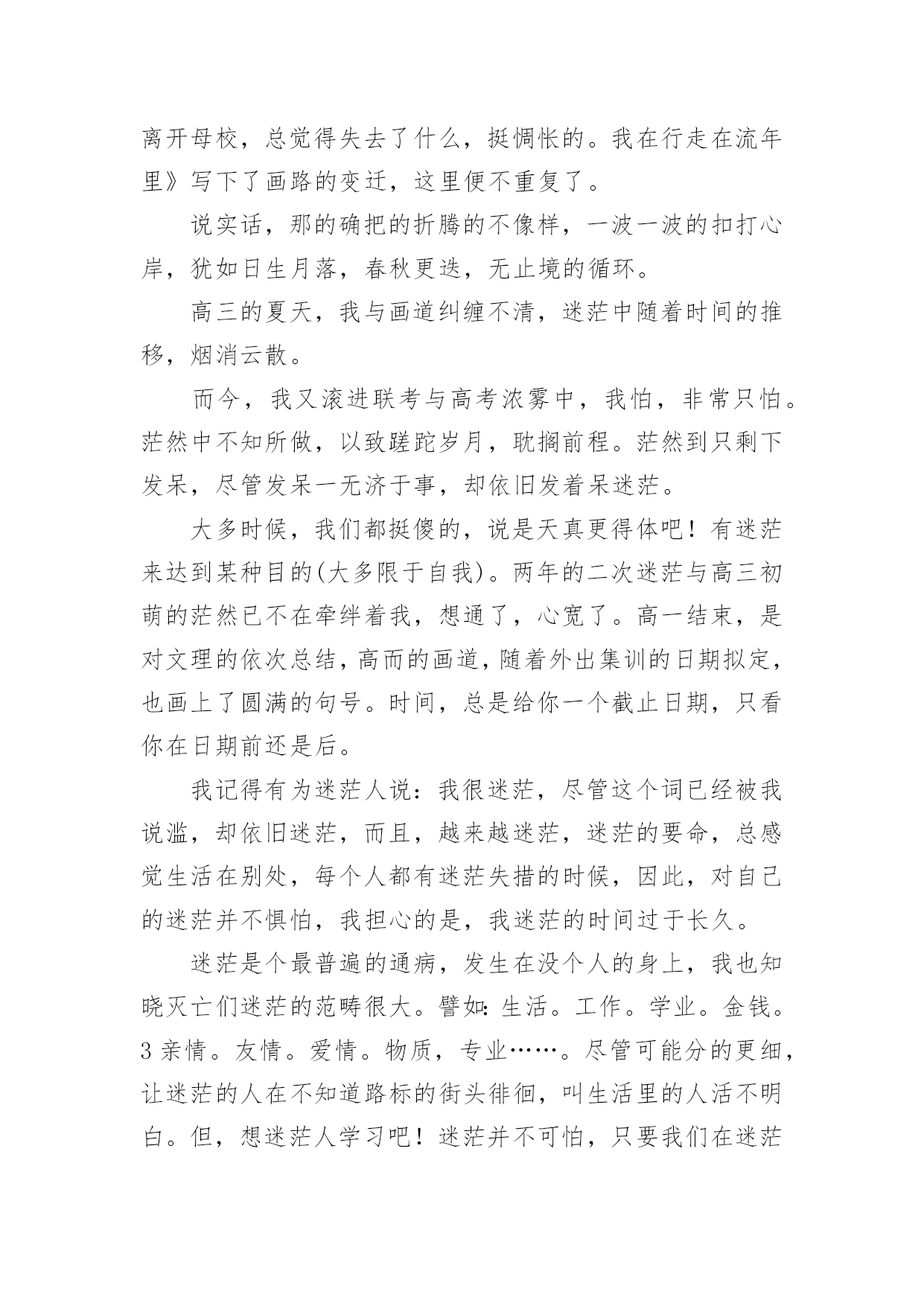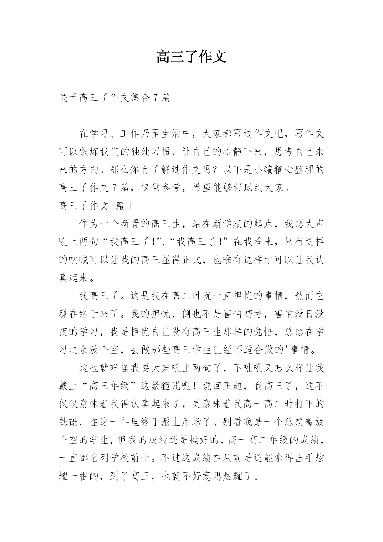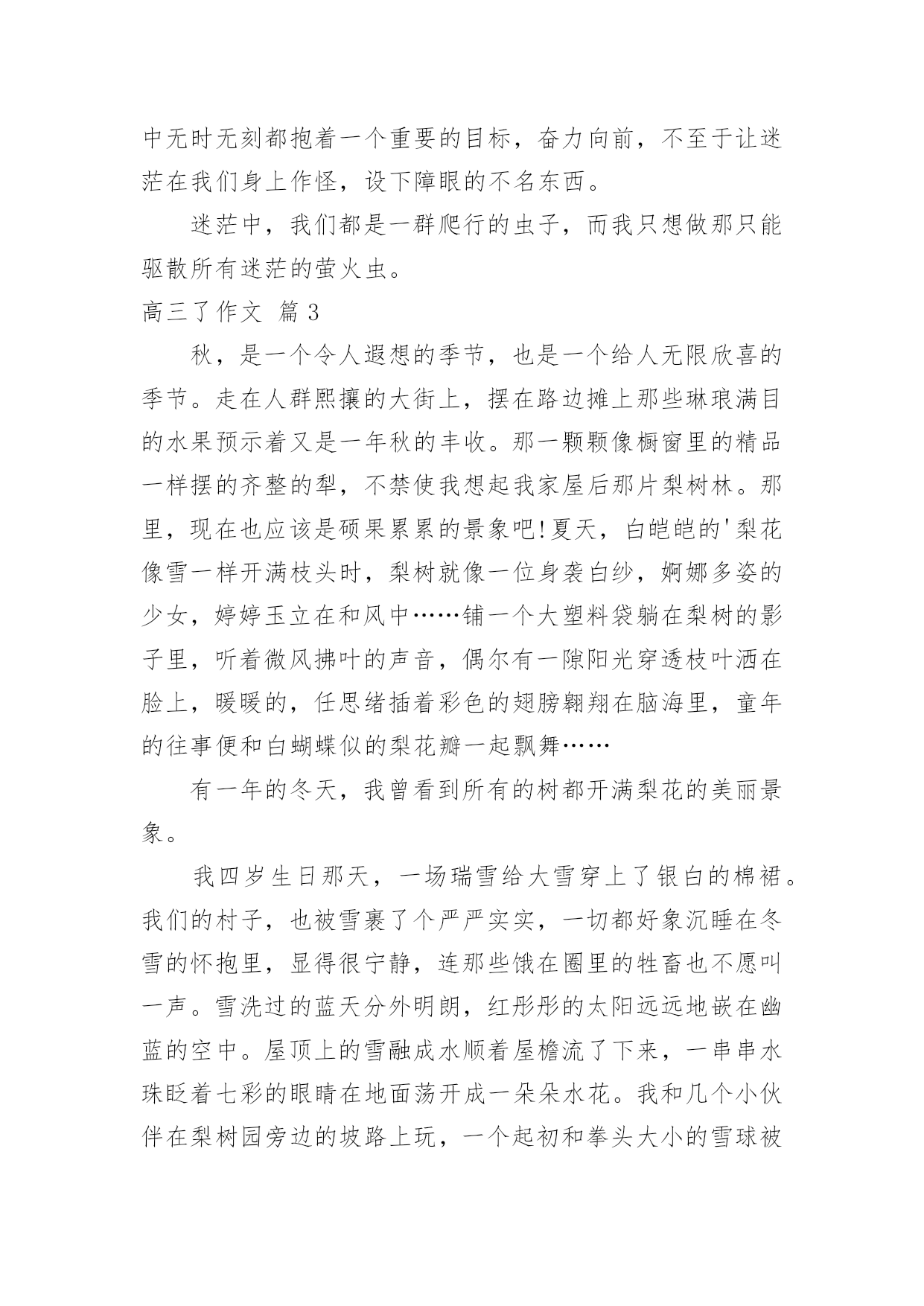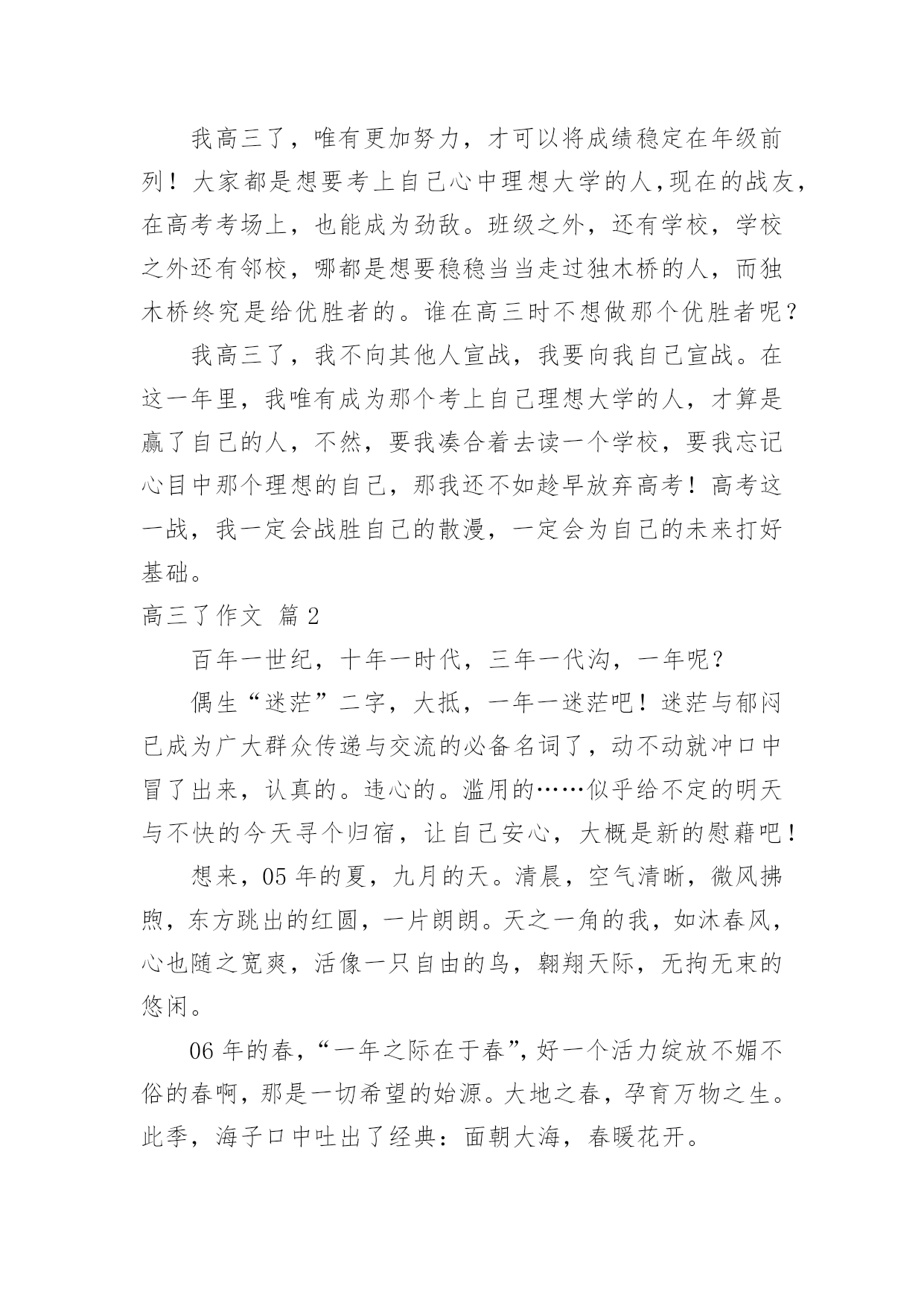 高三了作文 关于高三了作文集合7篇在学习、工作乃至生活中,大家都写过作文吧,写作文可以锻炼我们的独处习惯,让自己的心静下来,思考自己未来的方向。那么你有了解过作文吗?以下是小编精心整理的高三了作文7篇,仅供参考,希望能够帮助到大家。高三了作文篇1作为一个新晋的高三生,站在新学期的起点,我想大声吼上两句“我高三了!”、“我高三了!”在我看来,只有这样的呐喊可以让我的高三显得正式,也唯有这样才可以让我认真起来。我高三了。这是我在高二时就一直担忧的事情,然而它现在终于来了。我的担忧,倒也不是害怕高考,害怕没日没夜的学习,我是担忧自己没有高三生那样的觉悟,总想在学习之余放个空,去做那些高三学生已经不适合做的'事情。这也就难怪我要大声吼上两句了,不吼吼又怎么样让我戴上“高三年级”这紧箍咒呢!说回正题,我高三了,这不仅仅意味着我得认真起来了,更意味着我高一高二时打下的基础,在这一年里终于派上用场了。别看我是一个总想着放个空的学生,但我的成绩还是挺好的,高一高二年级的成绩,一直都名列学校前十。不过这成绩在从前是还能拿得出手炫耀一番的,到了高三,也就不好意思炫耀了。我高三了,唯有更加努力,才可以将成绩稳定在年级前列!大家都是想要考上自己心中理想大学的人,现在的战友,在高考考场上,也能成为劲敌。班级之外,还有学校,学校之外还有邻校,哪都是想要稳稳当当走过独木桥的人,而独木桥终究是给优胜者的。谁在高三时不想做那个优胜者呢?我高三了,我不向其他人宣战,我要向我自己宣战。在这一年里,我唯有成为那个考上自己理想大学的人,才算是赢了自己的人,不然,要我凑合着去读一个学校,要我忘记心目中那个理想的自己,那我还不如趁早放弃高考!高考这一战,我一定会战胜自己的散漫,一定会为自己的未来打好基础。高三了作文篇2百年一世纪,十年一时代,三年一代沟,一年呢?偶生“迷茫”二字,大抵,一年一迷茫吧!迷茫与郁闷已成为广大群众传递与交流的必备名词了,动不动就冲口中冒了出来,认真的。违心的。滥用的……似乎给不定的明天与不快的今天寻个归宿,让自己安心,大概是新的慰藉吧!想来,05年的夏,九月的天。清晨,空气清晰,微风拂煦,东方跳出的红圆,一片朗朗。天之一角的我,如沐春风,心也随之宽爽,活像一只自由的鸟,翱翔天际,无拘无束的悠闲。06年的春,“一年之际在于春”,好一个活力绽放不媚不俗的春啊,那是一切希望的始源。大地之春,孕育万物之生。此季,海子口中吐出了经典:面朝大海,春暖花开。融融春日,生机一片,饽饽奋发,而此时的心,出了点毛病,搅拌着不知何时油然而生的迷茫水,绿意盅然的三月比不上十月秋来得恬然怡心。文理分科闹的`沸沸扬扬。好友建议我,学理(它亦然)。为了又在一个班(只有一个理科专业班),我决定接受好友的提议。下了决心的当天,巧的是班主任找我谈话。一番口舌之后,我不安了。他是我初中的班主任,现在亦是。根据他多年的因材施教的套略,望我向文发展。我开始摇曳不定,宛如风吹,墙头两弯腰的绿草,在这中日子里不知何去何从。最终,我选择了友情。想想挺自私的,却不后悔。高二的初夏,花常住的季节,我彻底的与“迷茫”在文理抉择上划清界线。而后的夏,骄阳似火,热力四溅,一地的姹紫嫣红开遍,显得格外嘹人,心花怒放,悦情高涨,我应该不会再茫然啥了,我对着天空笑道。快乐与迷茫是相互间隔的。07年,本该平静的一年。而生活有太多的牵绊。我从云端被无形的力量推入了画道的漩涡。快乐的期间是为你而后的迷茫争取设下陷阱的时间么?我怪胎般的想到。7月,画友在外出集训上大展奇思,讨论的热火朝天。说到脱离学校,那是一个劲的拍桌叫绝,兴奋啊!直叫上苍廉明。有时候,我会按地里小他们,更导演无所事事的自己,我只是想不通,或许在抉择上,拥有的太少。随着社会的发展,人际关系逐亦复杂,大概,学校已是社会的最后一方净土了,虽不好学,离开母校,总觉得失去了什么,挺惆怅的。我在行走在流年里》写下了画路的变迁,这里便不重复了。说实话,那的确把的折腾的不像样,一波一波的扣打心岸,犹如日生月落,春秋更迭,无止境的循环。高三的夏天,我与画道纠缠不清,迷茫中随着时间的推移,烟消云散。而今,我又滚进联考与高考浓雾中,我怕,非常只怕。茫然中不知所做,以致蹉跎岁月,耽搁前程。茫然到只剩下发呆,尽管发呆一无济于事,却依旧发着呆迷茫。大多时候,我们都挺傻的,说是天真更得体吧!有迷茫来达到某种目的(大多限于自我)。两年的二次迷茫与高三初萌的茫然已不在牵绊着我,想通了,心宽了。高一结束,是对文理的依次总结,高而的画道,随着外出集训的日期拟定,也画上了圆满的句号。时间,总是给你一个截止日期,只看你在日期前还是后。我记得有为迷茫人说:我很迷茫,尽管这个词已经被我说滥,却依旧迷茫,而且,越来越迷茫,迷茫的要命,总感觉生活在别处,每个人都有迷茫失措的时候,因此,对自己的迷