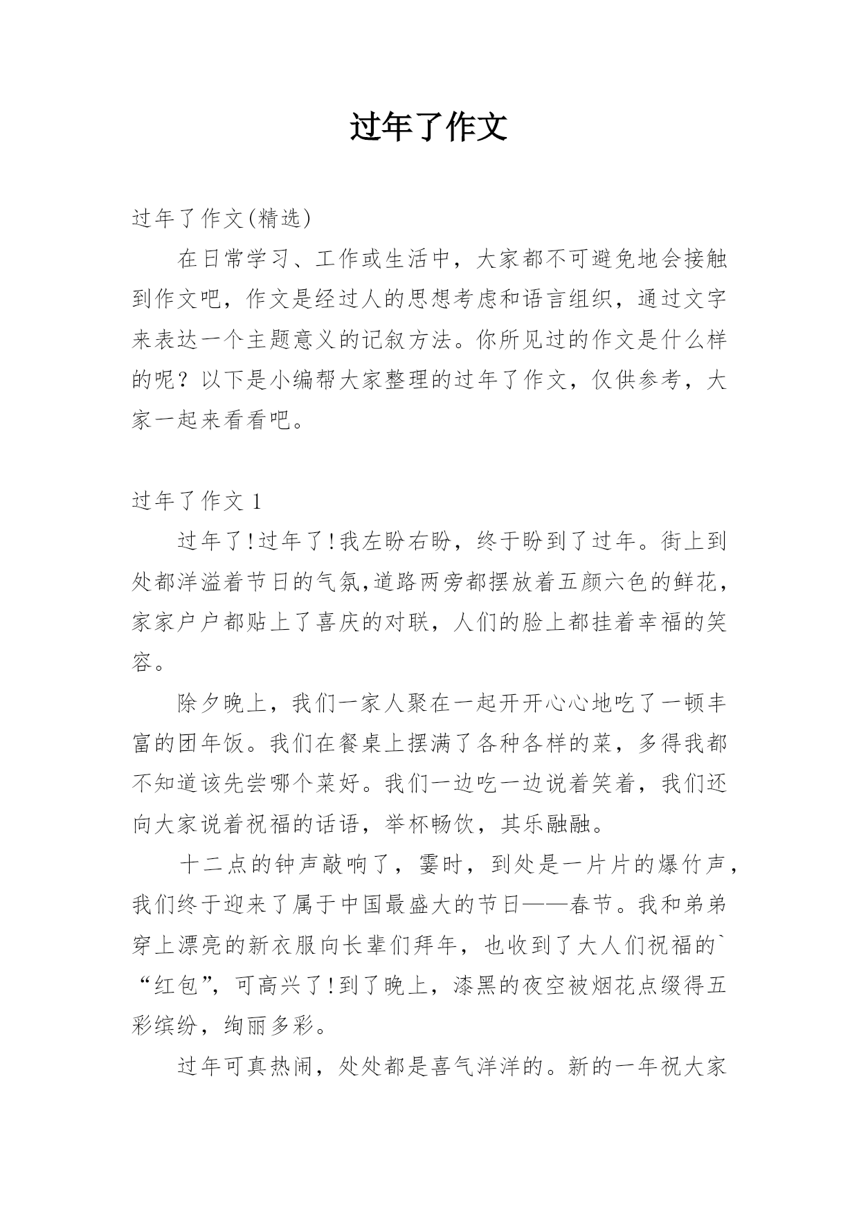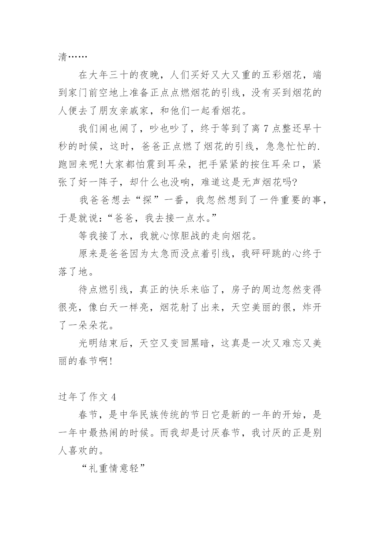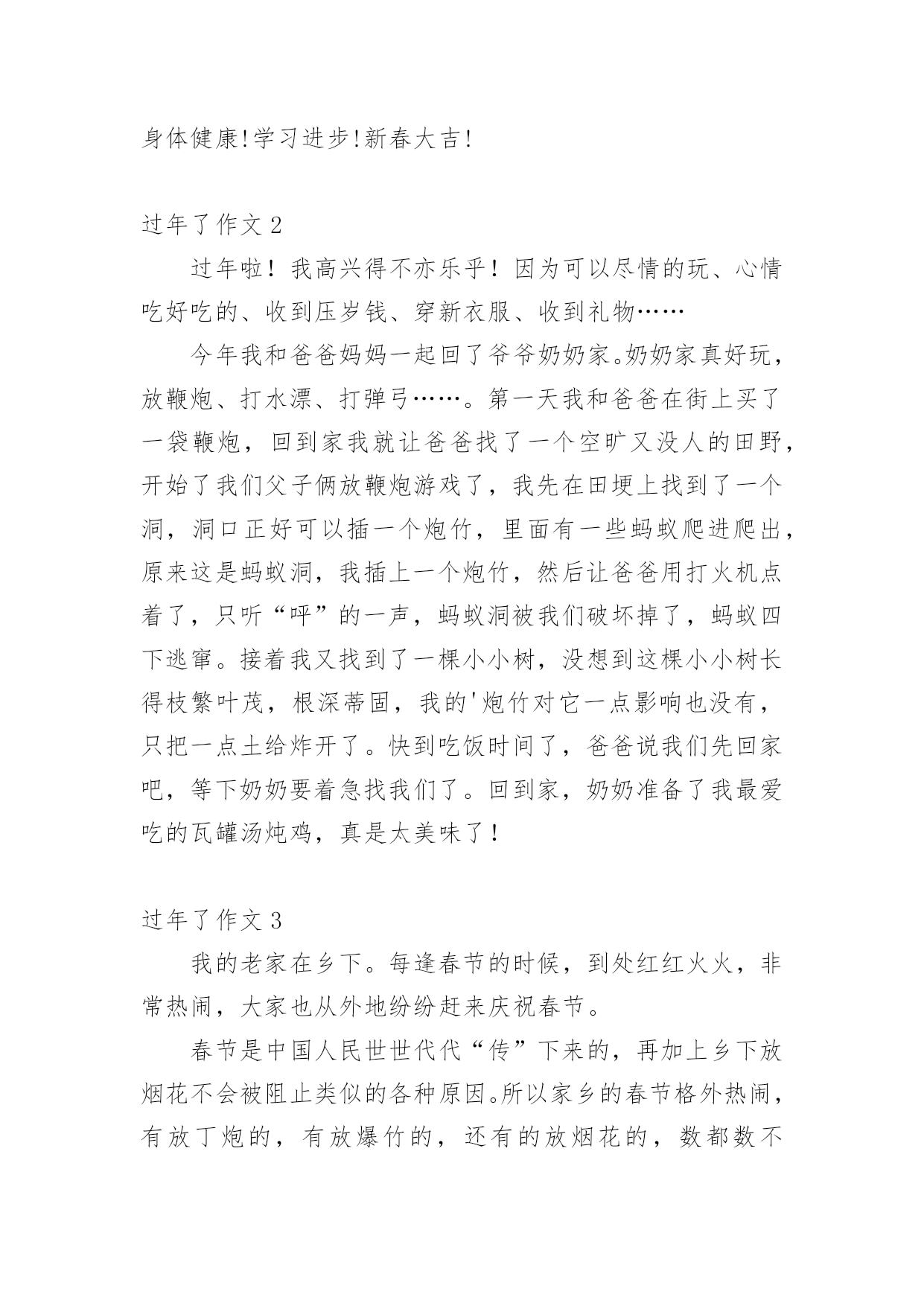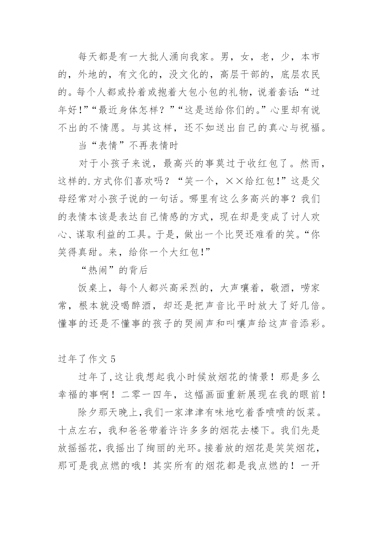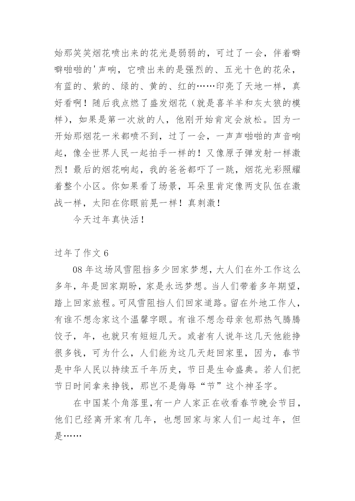 过年了作文 过年了作文(精选)在日常学习、工作或生活中,大家都不可避免地会接触到作文吧,作文是经过人的思想考虑和语言组织,通过文字来表达一个主题意义的记叙方法。你所见过的作文是什么样的呢?以下是小编帮大家整理的过年了作文,仅供参考,大家一起来看看吧。过年了作文1过年了!过年了!我左盼右盼,终于盼到了过年。街上到处都洋溢着节日的气氛,道路两旁都摆放着五颜六色的鲜花,家家户户都贴上了喜庆的对联,人们的脸上都挂着幸福的笑容。除夕晚上,我们一家人聚在一起开开心心地吃了一顿丰富的团年饭。我们在餐桌上摆满了各种各样的菜,多得我都不知道该先尝哪个菜好。我们一边吃一边说着笑着,我们还向大家说着祝福的话语,举杯畅饮,其乐融融。十二点的钟声敲响了,霎时,到处是一片片的爆竹声,我们终于迎来了属于中国最盛大的节日——春节。我和弟弟穿上漂亮的新衣服向长辈们拜年,也收到了大人们祝福的`“红包”,可高兴了!到了晚上,漆黑的夜空被烟花点缀得五彩缤纷,绚丽多彩。过年可真热闹,处处都是喜气洋洋的。新的一年祝大家身体健康!学习进步!新春大吉!过年了作文2过年啦!我高兴得不亦乐乎!因为可以尽情的玩、心情吃好吃的、收到压岁钱、穿新衣服、收到礼物……今年我和爸爸妈妈一起回了爷爷奶奶家。奶奶家真好玩,放鞭炮、打水漂、打弹弓……。第一天我和爸爸在街上买了一袋鞭炮,回到家我就让爸爸找了一个空旷又没人的田野,开始了我们父子俩放鞭炮游戏了,我先在田埂上找到了一个洞,洞口正好可以插一个炮竹,里面有一些蚂蚁爬进爬出,原来这是蚂蚁洞,我插上一个炮竹,然后让爸爸用打火机点着了,只听“呯”的一声,蚂蚁洞被我们破坏掉了,蚂蚁四下逃窜。接着我又找到了一棵小小树,没想到这棵小小树长得枝繁叶茂,根深蒂固,我的'炮竹对它一点影响也没有,只把一点土给炸开了。快到吃饭时间了,爸爸说我们先回家吧,等下奶奶要着急找我们了。回到家,奶奶准备了我最爱吃的瓦罐汤炖鸡,真是太美味了!过年了作文3我的老家在乡下。每逢春节的时候,到处红红火火,非常热闹,大家也从外地纷纷赶来庆祝春节。春节是中国人民世世代代“传”下来的,再加上乡下放烟花不会被阻止类似的各种原因。所以家乡的春节格外热闹,有放丁炮的,有放爆竹的,还有的放烟花的,数都数不清……在大年三十的夜晚,人们买好又大又重的五彩烟花,端到家门前空地上准备正点点燃烟花的引线,没有买到烟花的人便去了朋友亲戚家,和他们一起看烟花。我们闹也闹了,吵也吵了,终于等到了离7点整还早十秒的时候,这时,爸爸正点燃了烟花的引线,急急忙忙的.跑回来呢!大家都怕震到耳朵,把手紧紧的按住耳朵口,紧张了好一阵子,却什么也没响,难道这是无声烟花吗?我爸爸想去“探”一番,我忽然想到了一件重要的事,于是就说:“爸爸,我去接一点水。”等我接了水,我就心惊胆战的走向烟花。原来是爸爸因为太急而没点着引线,我砰砰跳的心终于落了地。待点燃引线,真正的快乐来临了,房子的周边忽然变得很亮,像白天一样亮,烟花射了出来,天空美丽的很,炸开了一朵朵花。光明结束后,天空又变回黑暗,这真是一次又难忘又美丽的春节啊!过年了作文4春节,是中华民族传统的节日它是新的一年的开始,是一年中最热闹的时候。而我却是讨厌春节,我讨厌的正是别人喜欢的。“礼重情意轻”每天都是有一大批人涌向我家。男,女,老,少,本市的,外地的,有文化的,没文化的,高层干部的,底层农民的。每个人都或拎着或抱着大包小包的礼物,说着套话:“过年好!”“最近身体怎样?”“这是送给你们的。”心里却有说不出的不情愿。与其这样,还不如送出自己的真心与祝福。当“表情”不再表情时对于小孩子来说,最高兴的事莫过于收红包了。然而,这样的.方式你们喜欢吗?“笑一个,××给红包!”这是父母经常对小孩子说的一句话。哪里有这么多高兴的事?我们的表情本该是表达自己情感的方式,现在却是变成了讨人欢心、谋取利益的工具。于是,做出一个比哭还难看的笑。“你笑得真甜。来,给你一个大红包!”“热闹”的背后饭桌上,每个人都兴高采烈的,大声嚷着,敬酒,唠家常,根本就没喝醉酒,却还是把声音比平时放大了好几倍。懂事的还是不懂事的孩子的哭闹声和叫嚷声给这声音添彩。过年了作文5过年了,这让我想起我小时候放烟花的情景!那是多么幸福的事啊!二零一四年,这幅画面重新展现在我的眼前!除夕那天晚上,我们一家津津有味地吃着香喷喷的饭菜。十点左右,我和爸爸带着许许多多的烟花去楼下。我们先是放摇摇花,我摇出了绚丽的光环。接着放的烟花是笑笑烟花,那可是我点燃的哦!其实所有的烟花都是我点燃的!一开始那笑笑烟花喷出来的花光是弱弱的,可过了一会,伴着噼噼啪啪的'声响,它喷出来的是强烈的、五光十色的花朵,有蓝的、紫的、绿的、黄的、红的……印亮了天地一样,真好看啊!随后我点燃了盛发烟花(就是喜羊羊和灰太狼的模样),如果是第一次放的人,他刚开始肯