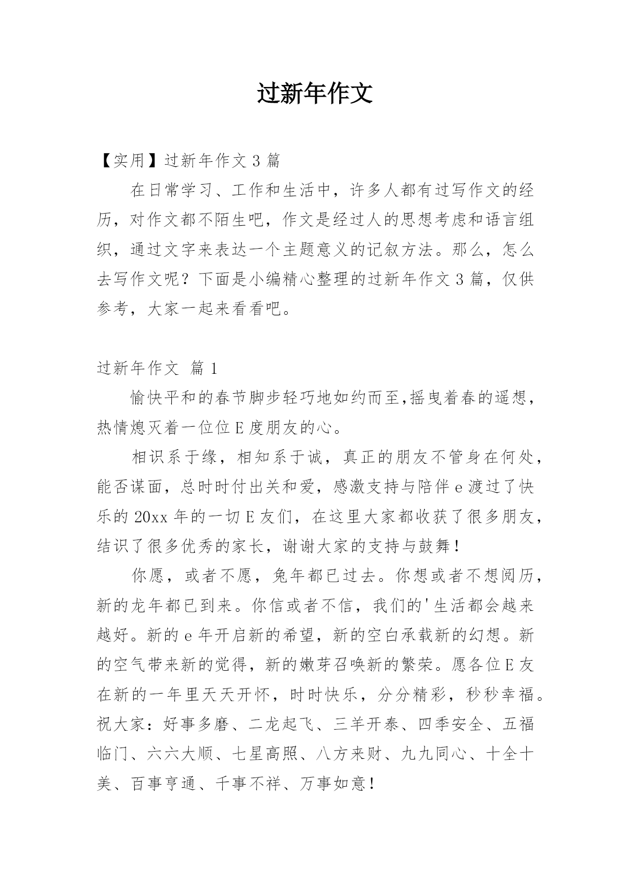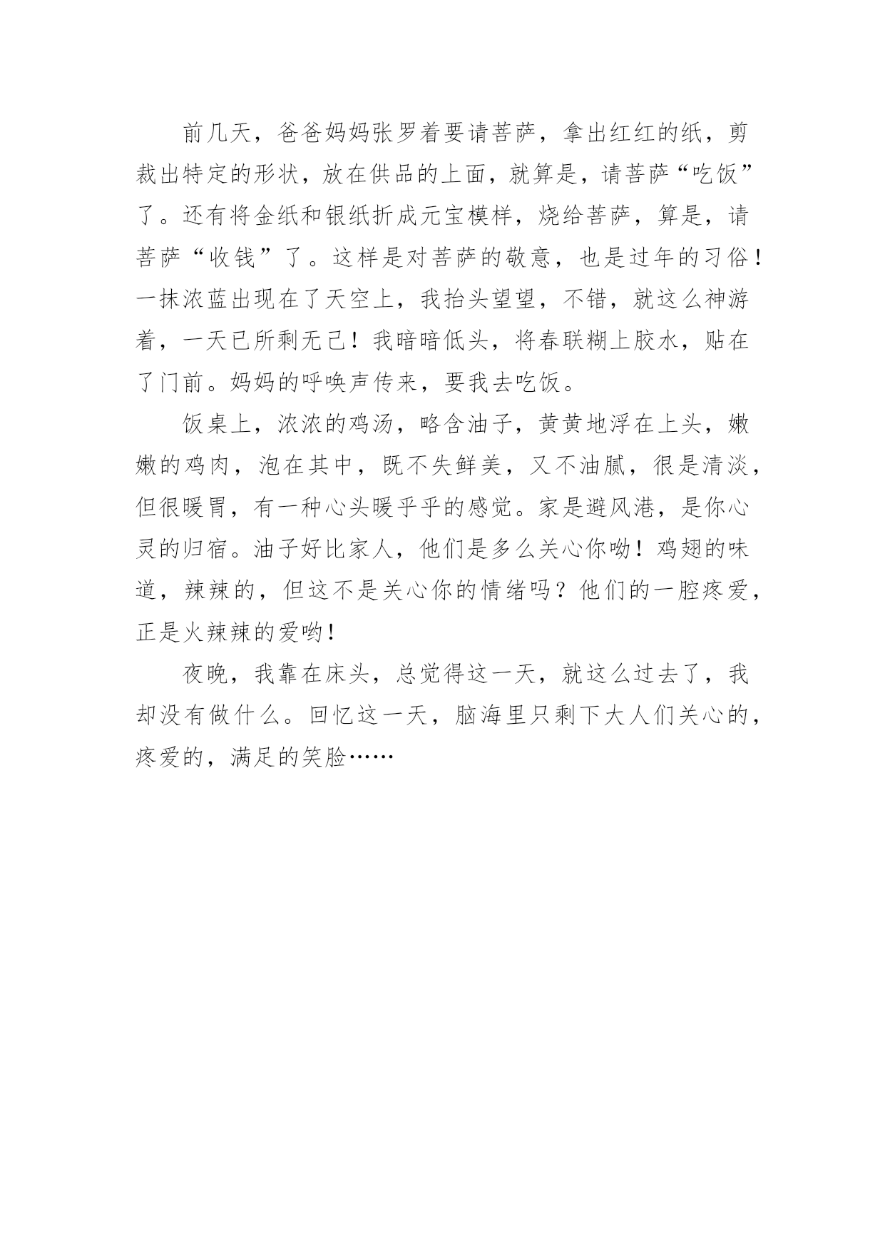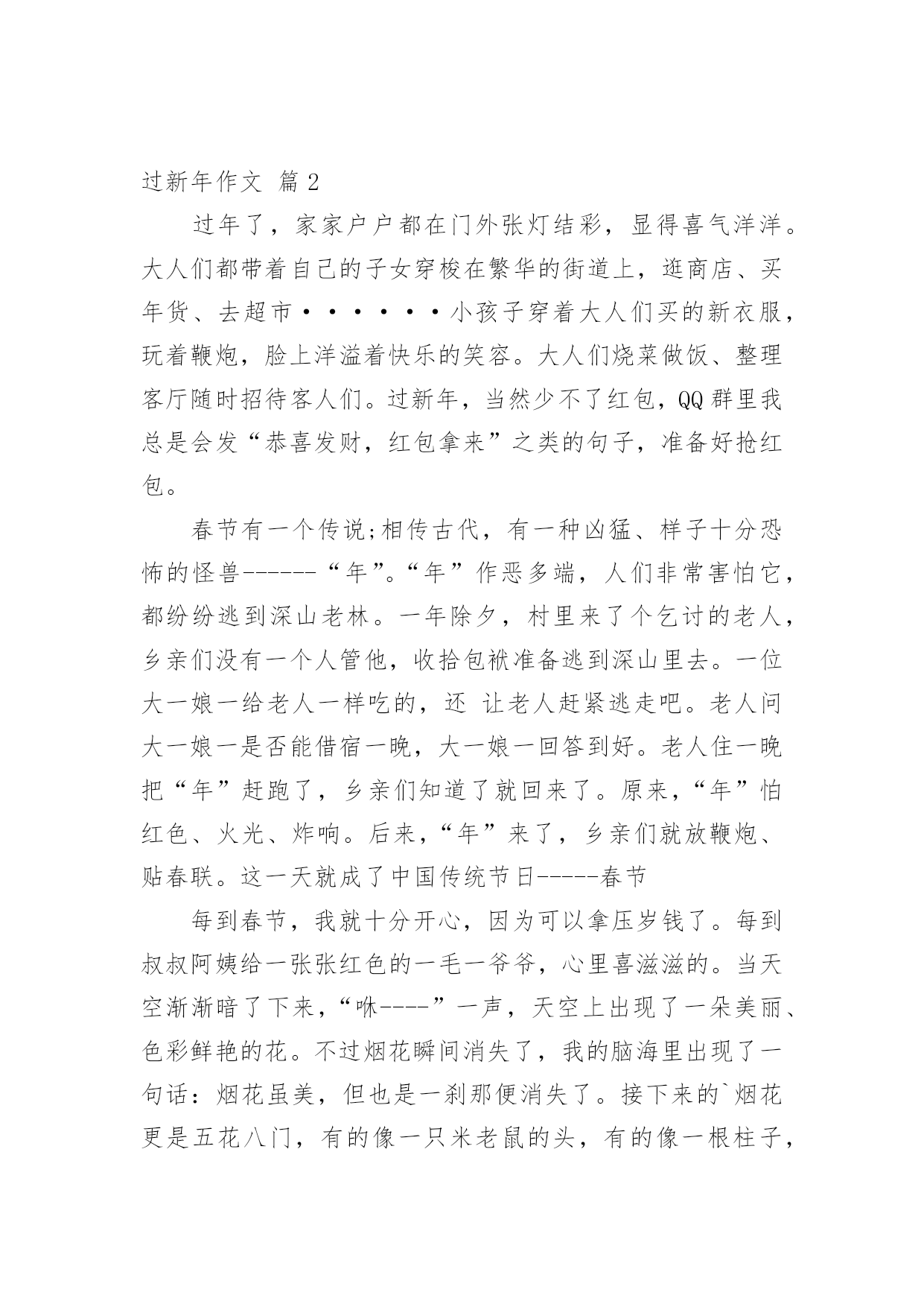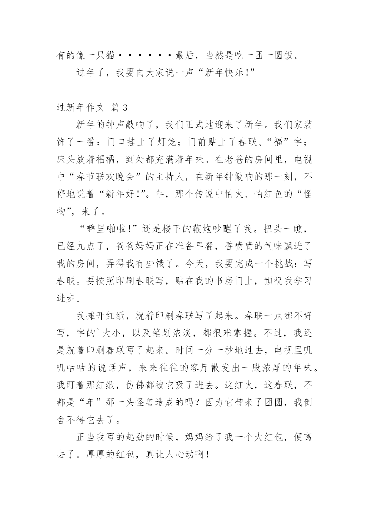过新年作文 【实用】过新年作文3篇在日常学习、工作和生活中,许多人都有过写作文的经历,对作文都不陌生吧,作文是经过人的思想考虑和语言组织,通过文字来表达一个主题意义的记叙方法。那么,怎么去写作文呢?下面是小编精心整理的过新年作文3篇,仅供参考,大家一起来看看吧。过新年作文篇1愉快平和的春节脚步轻巧地如约而至,摇曳着春的遥想,热情熄灭着一位位E度朋友的心。相识系于缘,相知系于诚,真正的朋友不管身在何处,能否谋面,总时时付出关和爱,感激支持与陪伴e渡过了快乐的20xx年的一切E友们,在这里大家都收获了很多朋友,结识了很多优秀的家长,谢谢大家的支持与鼓舞!你愿,或者不愿,兔年都已过去。你想或者不想阅历,新的龙年都已到来。你信或者不信,我们的'生活都会越来越好。新的e年开启新的希望,新的空白承载新的幻想。新的空气带来新的觉得,新的嫩芽召唤新的繁荣。愿各位E友在新的一年里天天开怀,时时快乐,分分精彩,秒秒幸福。祝大家:好事多磨、二龙起飞、三羊开泰、四季安全、五福临门、六六大顺、七星高照、八方来财、九九同心、十全十美、百事亨通、千事不祥、万事如意!过新年作文篇2过年了,家家户户都在门外张灯结彩,显得喜气洋洋。大人们都带着自己的子女穿梭在繁华的街道上,逛商店、买年货、去超市······小孩子穿着大人们买的新衣服,玩着鞭炮,脸上洋溢着快乐的笑容。大人们烧菜做饭、整理客厅随时招待客人们。过新年,当然少不了红包,QQ群里我总是会发“恭喜发财,红包拿来”之类的句子,准备好抢红包。春节有一个传说;相传古代,有一种凶猛、样子十分恐怖的怪兽------“年”。“年”作恶多端,人们非常害怕它,都纷纷逃到深山老林。一年除夕,村里来了个乞讨的老人,乡亲们没有一个人管他,收拾包袱准备逃到深山里去。一位大一娘一给老人一样吃的,还让老人赶紧逃走吧。老人问大一娘一是否能借宿一晚,大一娘一回答到好。老人住一晚把“年”赶跑了,乡亲们知道了就回来了。原来,“年”怕红色、火光、炸响。后来,“年”来了,乡亲们就放鞭炮、贴春联。这一天就成了中国传统节日-----春节每到春节,我就十分开心,因为可以拿压岁钱了。每到叔叔阿姨给一张张红色的一毛一爷爷,心里喜滋滋的。当天空渐渐暗了下来,“咻----”一声,天空上出现了一朵美丽、色彩鲜艳的花。不过烟花瞬间消失了,我的脑海里出现了一句话:烟花虽美,但也是一刹那便消失了。接下来的`烟花更是五花八门,有的像一只米老鼠的头,有的像一根柱子,有的像一只猫······最后,当然是吃一团一圆饭。过年了,我要向大家说一声“新年快乐!”过新年作文篇3新年的钟声敲响了,我们正式地迎来了新年。我们家装饰了一番:门口挂上了灯笼;门前贴上了春联、“福”字;床头放着福橘,到处都充满着年味。在老爸的房间里,电视中“春节联欢晚会”的主持人,在新年钟敲响的那一刻,不停地说着“新年好!”。年,那个传说中怕火、怕红色的“怪物”,来了。“噼里啪啦!”还是楼下的鞭炮吵醒了我。扭头一瞧,已经九点了,爸爸妈妈正在准备早餐,香喷喷的气味飘进了我的房间,弄得我有些饿了。今天,我要完成一个挑战:写春联。要按照印刷春联写,贴在我的书房门上,预祝我学习进步。我摊开红纸,就着印刷春联写了起来。春联一点都不好写,字的`大小,以及笔划浓淡,都很难掌握。不过,我还是就着印刷春联写了起来。时间一分一秒地过去,电视里叽叽咕咕的说话声,来来往往的客厅散发出一股浓厚的年味。我盯着那红纸,仿佛都被它吸了进去。这红火,这春联,不都是“年”那一头怪兽造成的吗?因为它带来了团圆,我倒舍不得它去了。正当我写的起劲的时候,妈妈给了我一个大红包,便离去了。厚厚的红包,真让人心动啊!前几天,爸爸妈妈张罗着要请菩萨,拿出红红的纸,剪裁出特定的形状,放在供品的上面,就算是,请菩萨“吃饭”了。还有将金纸和银纸折成元宝模样,烧给菩萨,算是,请菩萨“收钱”了。这样是对菩萨的敬意,也是过年的习俗!一抹浓蓝出现在了天空上,我抬头望望,不错,就这么神游着,一天已所剩无己!我暗暗低头,将春联糊上胶水,贴在了门前。妈妈的呼唤声传来,要我去吃饭。饭桌上,浓浓的鸡汤,略含油子,黄黄地浮在上头,嫩嫩的鸡肉,泡在其中,既不失鲜美,又不油腻,很是清淡,但很暖胃,有一种心头暖乎乎的感觉。家是避风港,是你心灵的归宿。油子好比家人,他们是多么关心你呦!鸡翅的味道,辣辣的,但这不是关心你的情绪吗?他们的一腔疼爱,正是火辣辣的爱哟!夜晚,我靠在床头,总觉得这一天,就这么过去了,我却没有做什么。回忆这一天,脑海里只剩下大人们关心的,疼爱的,满足的笑脸……