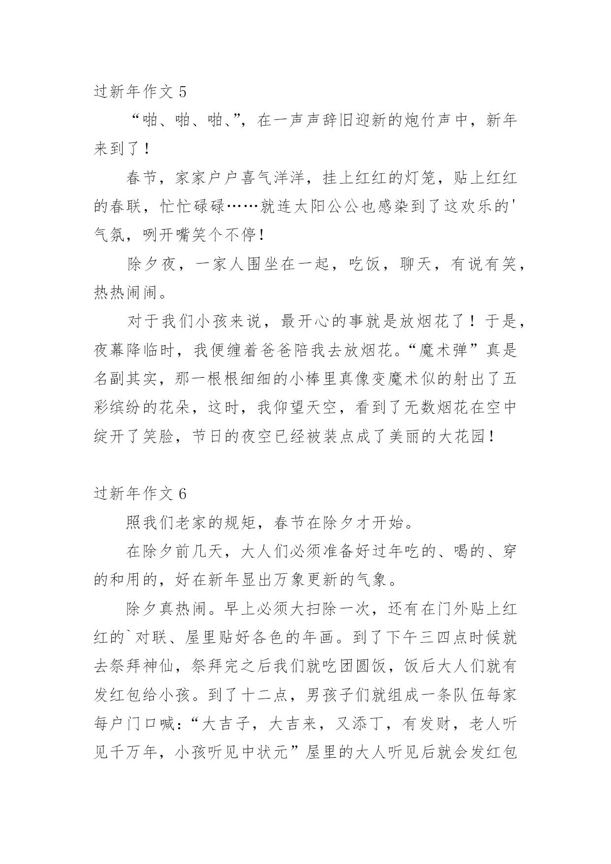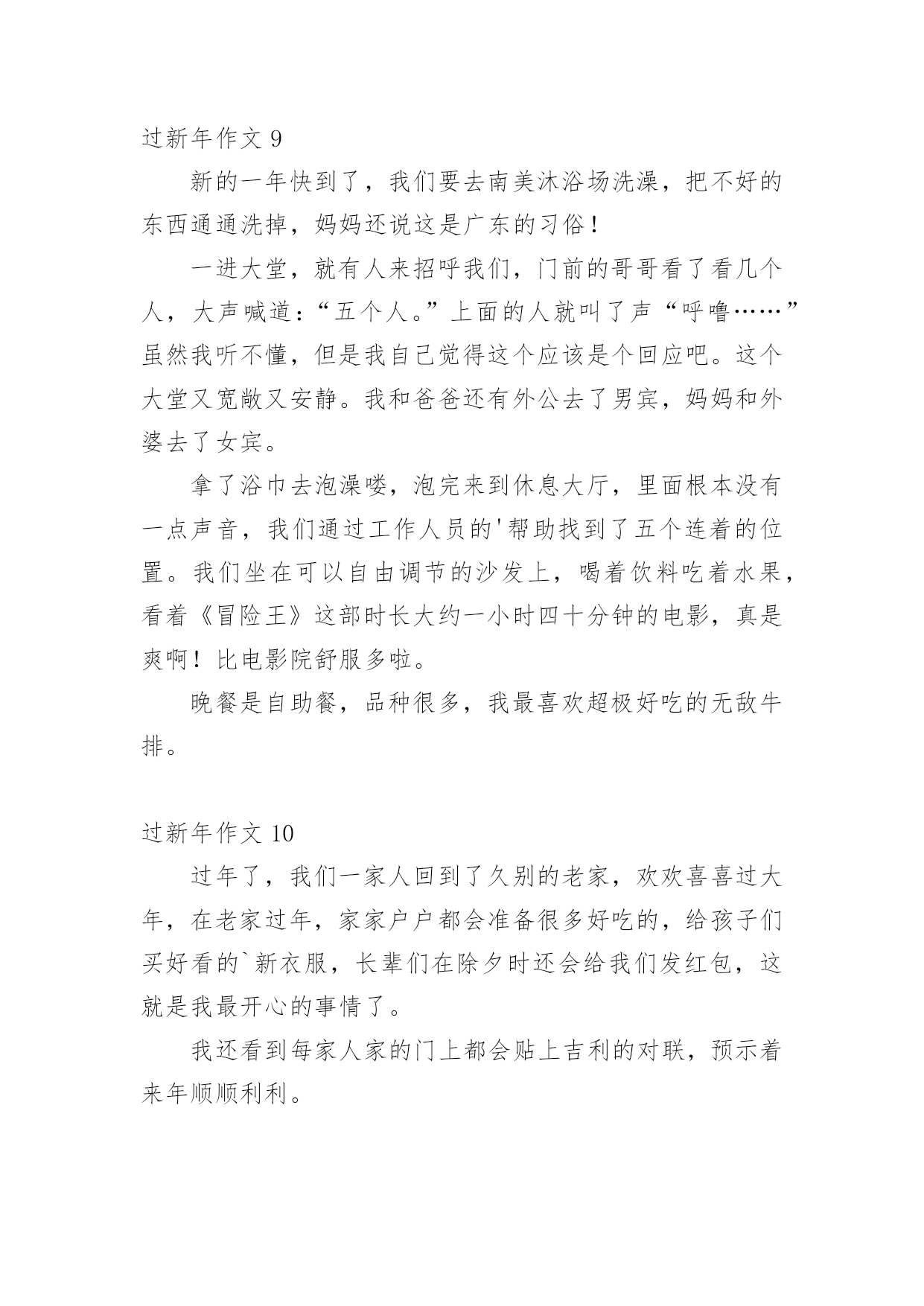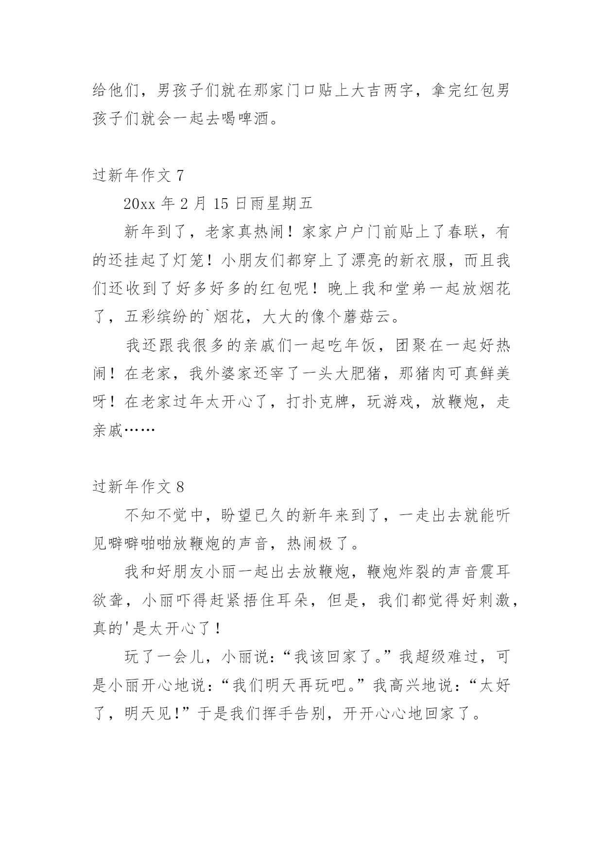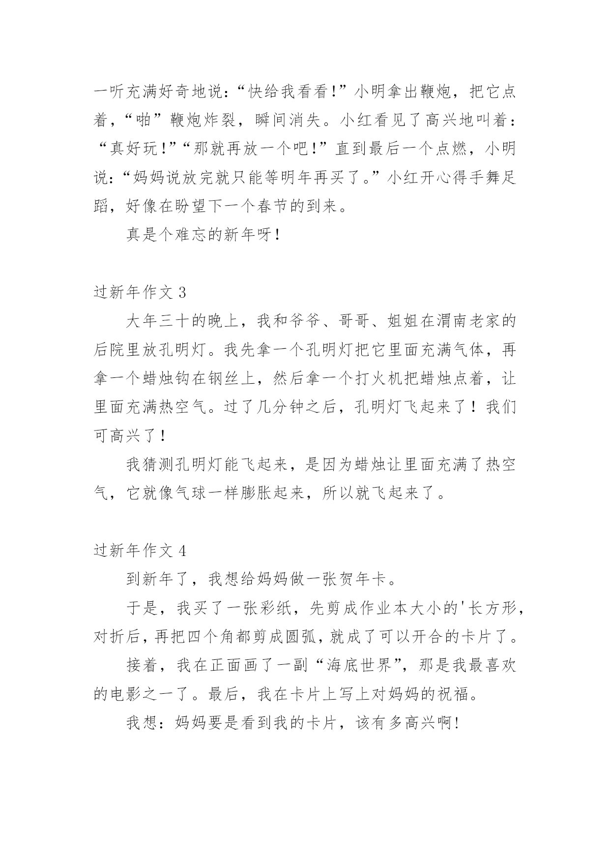 过新年作文 过新年作文必备【15篇】在平日的学习、工作和生活里,大家都经常看到作文的身影吧,作文要求篇章结构完整,一定要避免无结尾作文的出现。那么问题来了,到底应如何写一篇优秀的作文呢?下面是小编帮大家整理的过新年作文,仅供参考,希望能够帮助到大家。过新年作文1新年到了,新年到了。家家户户都在放鞭炮。有的像一朵花,有的像小船,还有的'像红艳艳的大苹果。我们过新年到哈尔宾。哈尔宾可冷了,零下19度到零下30度左右。第一天早上,我们看了东北虎林园,东北虎林园很大,分了好几个区域,参观的是东北虎园,幼小的东北虎就很大了,大老虎更不要说了。第一天晚上,我们去了冰雪大世界,参观冰雕。当然,里面也有玩的,里面还给你演了个故事。第二天早上,我们去登山,下午,我们去亚布力滑雪场滑雪。滑雪的时候双腿要弯曲,这样才滑得快。哈尔宾真是过新年的好地方。过新年作文2过年了!小红和小明相约来到屋子的后面玩耍。小明拿着鞭炮对小红说:“我给你看个好玩的.。”小红一听充满好奇地说:“快给我看看!”小明拿出鞭炮,把它点着,“啪”鞭炮炸裂,瞬间消失。小红看见了高兴地叫着:“真好玩!”“那就再放一个吧!”直到最后一个点燃,小明说:“妈妈说放完就只能等明年再买了。”小红开心得手舞足蹈,好像在盼望下一个春节的到来。真是个难忘的新年呀!过新年作文3大年三十的晚上,我和爷爷、哥哥、姐姐在渭南老家的后院里放孔明灯。我先拿一个孔明灯把它里面充满气体,再拿一个蜡烛钩在钢丝上,然后拿一个打火机把蜡烛点着,让里面充满热空气。过了几分钟之后,孔明灯飞起来了!我们可高兴了!我猜测孔明灯能飞起来,是因为蜡烛让里面充满了热空气,它就像气球一样膨胀起来,所以就飞起来了。过新年作文4到新年了,我想给妈妈做一张贺年卡。于是,我买了一张彩纸,先剪成作业本大小的'长方形,对折后,再把四个角都剪成圆弧,就成了可以开合的卡片了。接着,我在正面画了一副“海底世界”,那是我最喜欢的电影之一了。最后,我在卡片上写上对妈妈的祝福。我想:妈妈要是看到我的卡片,该有多高兴啊!过新年作文5“啪、啪、啪、”,在一声声辞旧迎新的炮竹声中,新年来到了!春节,家家户户喜气洋洋,挂上红红的灯笼,贴上红红的春联,忙忙碌碌……就连太阳公公也感染到了这欢乐的'气氛,咧开嘴笑个不停!除夕夜,一家人围坐在一起,吃饭,聊天,有说有笑,热热闹闹。对于我们小孩来说,最开心的事就是放烟花了!于是,夜幕降临时,我便缠着爸爸陪我去放烟花。“魔术弹”真是名副其实,那一根根细细的小棒里真像变魔术似的射出了五彩缤纷的花朵,这时,我仰望天空,看到了无数烟花在空中绽开了笑脸,节日的夜空已经被装点成了美丽的大花园!过新年作文6照我们老家的规矩,春节在除夕才开始。在除夕前几天,大人们必须准备好过年吃的、喝的、穿的和用的,好在新年显出万象更新的气象。除夕真热闹。早上必须大扫除一次,还有在门外贴上红红的`对联、屋里贴好各色的年画。到了下午三四点时候就去祭拜神仙,祭拜完之后我们就吃团圆饭,饭后大人们就有发红包给小孩。到了十二点,男孩子们就组成一条队伍每家每户门口喊:“大吉子,大吉来,又添丁,有发财,老人听见千万年,小孩听见中状元”屋里的大人听见后就会发红包给他们,男孩子们就在那家门口贴上大吉两字,拿完红包男孩子们就会一起去喝啤酒。过新年作文720xx年2月15日雨星期五新年到了,老家真热闹!家家户户门前贴上了春联,有的还挂起了灯笼!小朋友们都穿上了漂亮的新衣服,而且我们还收到了好多好多的红包呢!晚上我和堂弟一起放烟花了,五彩缤纷的`烟花,大大的像个蘑菇云。我还跟我很多的亲戚们一起吃年饭,团聚在一起好热闹!在老家,我外婆家还宰了一头大肥猪,那猪肉可真鲜美呀!在老家过年太开心了,打扑克牌,玩游戏,放鞭炮,走亲戚……过新年作文8不知不觉中,盼望已久的新年来到了,一走出去就能听见噼噼啪啪放鞭炮的声音,热闹极了。我和好朋友小丽一起出去放鞭炮,鞭炮炸裂的声音震耳欲聋,小丽吓得赶紧捂住耳朵,但是,我们都觉得好刺激,真的'是太开心了!玩了一会儿,小丽说:“我该回家了。”我超级难过,可是小丽开心地说:“我们明天再玩吧。”我高兴地说:“太好了,明天见!”于是我们挥手告别,开开心心地回家了。过新年作文9新的一年快到了,我们要去南美沐浴场洗澡,把不好的东西通通洗掉,妈妈还说这是广东的习俗!一进大堂,就有人来招呼我们,门前的哥哥看了看几个人,大声喊道:“五个人。”上面的人就叫了声“呼噜……”虽然我听不懂,但是我自己觉得这个应该是个回应吧。这个大堂又宽敞又安静。我和爸爸还有外公去了男宾,妈妈和外婆去了女宾。拿了浴巾去泡澡喽,泡完来到休息大厅,里面根本没有一点声音,我们通过工作人员的'帮助找到了五个连着的位置。我们坐在可以自由调节的沙发上,喝着饮料吃着水果,看着《冒险王》这部时长大约一小时四十分钟