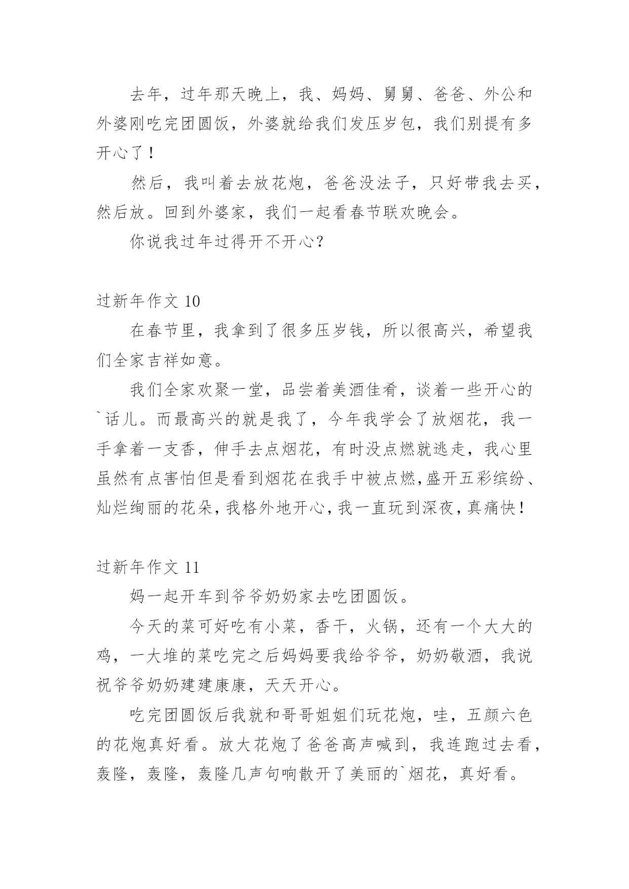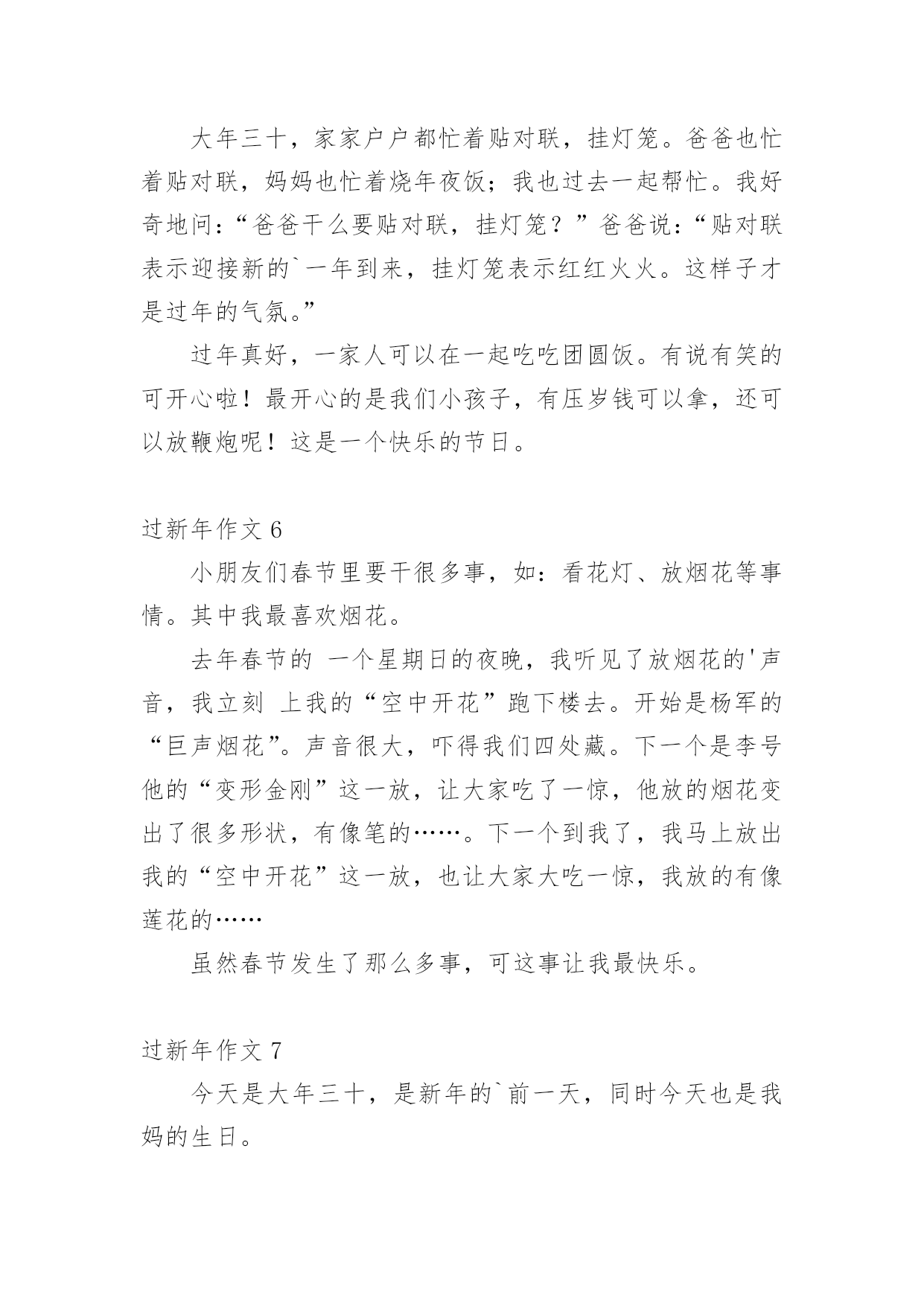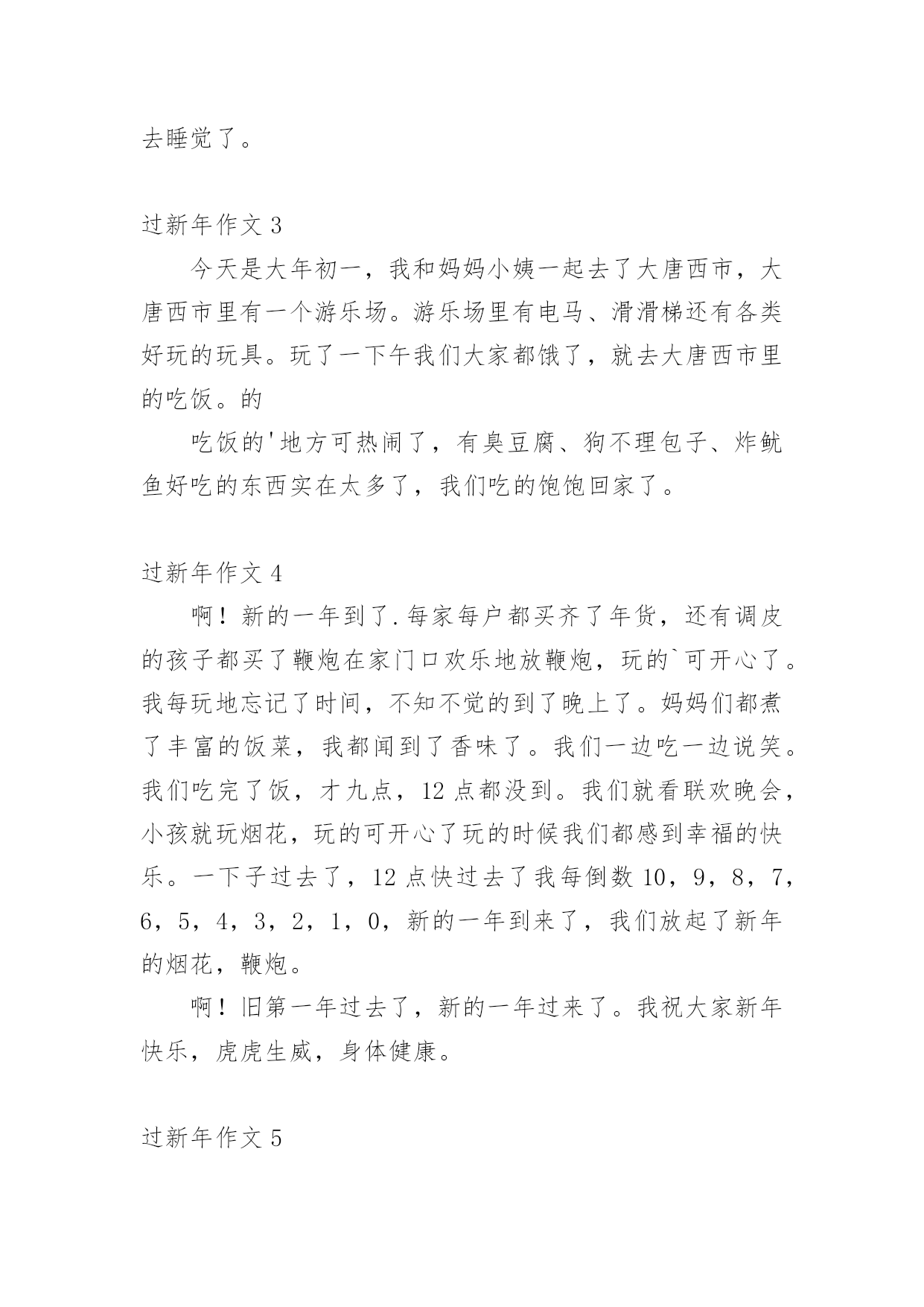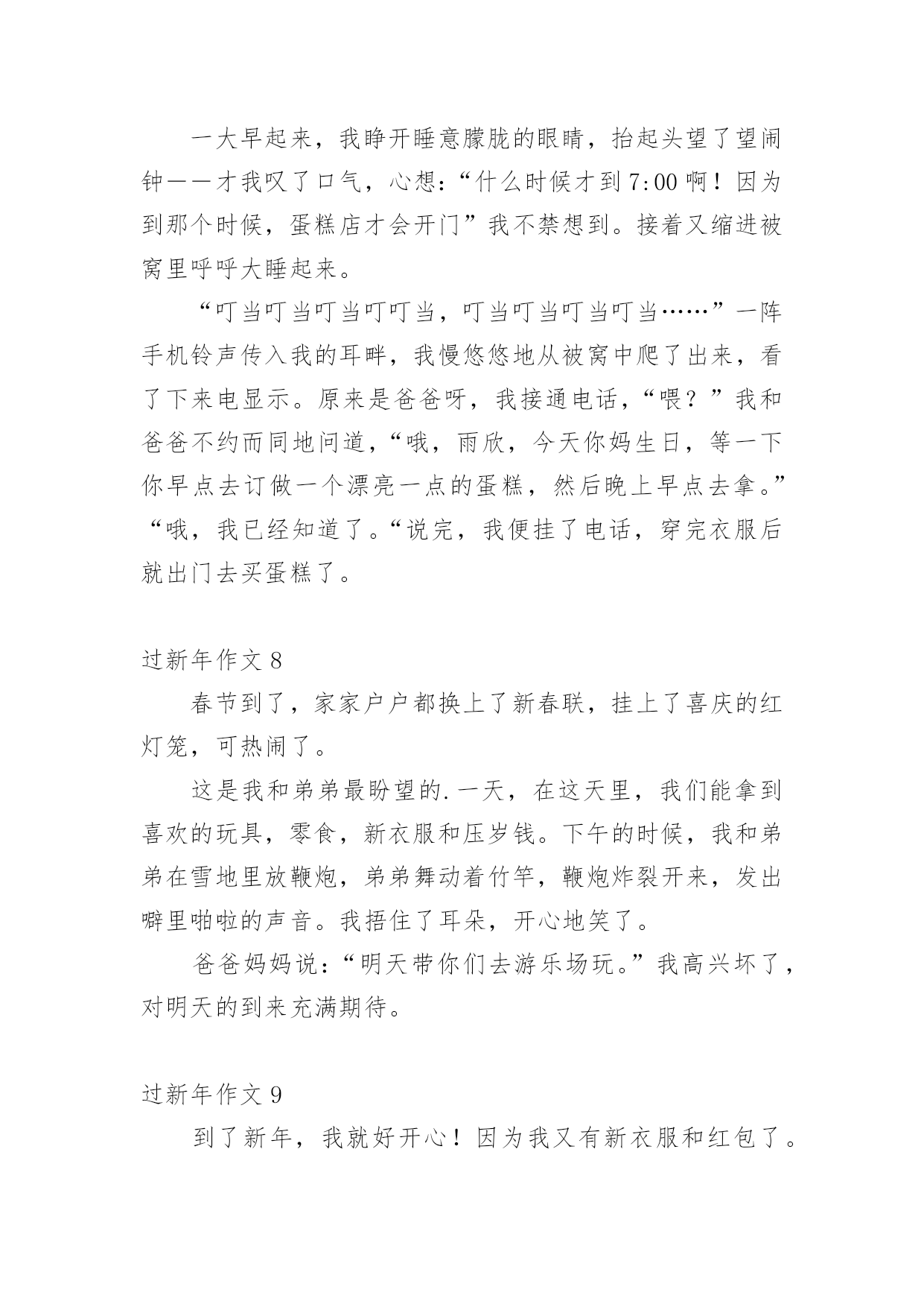 过新年作文 过新年作文(集合15篇)在学习、工作或生活中,大家或多或少都会接触过作文吧,作文根据写作时限的不同可以分为限时作文和非限时作文。怎么写作文才能避免踩雷呢?以下是小编整理的过新年作文,欢迎大家借鉴与参考,希望对大家有所帮助。过新年作文1我和爸爸妈妈一起回老家过新年,老家的新年真是热闹。早早的就听见外面噼噼啪啪的鞭炮声,然后我下楼就看见爸爸妈妈在忙着贴对联,挂红灯笼,打扫卫生。奶奶和姑姑在厨房炒菜,蒸包子,炸面团,忙的不亦乐乎。奶奶的`这顿饭做的时间可长了,我肚子早都饿了,等菜做好拿到桌子上时,就像刮龙卷风一样。不一会就把很多的饭菜卷进了肚子里。新年的饭真香呀!过新年作文2年终于要来了,我高兴极了。我们立即打开电视机,收看春节联欢晚会。今年的春节联欢晚会的内容多了,有艺术表演、唱歌表演、小品表演、魔术表演,我们全家人看得津津有味,目不转睛。晚会演完了,我们还没睡。我们又出去拜老祖宗了,我把水果放在台子上,然后烧纸,拜完了老祖宗,我们终于回去睡觉了。过新年作文3今天是大年初一,我和妈妈小姨一起去了大唐西市,大唐西市里有一个游乐场。游乐场里有电马、滑滑梯还有各类好玩的玩具。玩了一下午我们大家都饿了,就去大唐西市里的吃饭。的吃饭的'地方可热闹了,有臭豆腐、狗不理包子、炸鱿鱼好吃的东西实在太多了,我们吃的饱饱回家了。过新年作文4啊!新的一年到了.每家每户都买齐了年货,还有调皮的孩子都买了鞭炮在家门口欢乐地放鞭炮,玩的`可开心了。我每玩地忘记了时间,不知不觉的到了晚上了。妈妈们都煮了丰富的饭菜,我都闻到了香味了。我们一边吃一边说笑。我们吃完了饭,才九点,12点都没到。我们就看联欢晚会,小孩就玩烟花,玩的可开心了玩的时候我们都感到幸福的快乐。一下子过去了,12点快过去了我每倒数10,9,8,7,6,5,4,3,2,1,0,新的一年到来了,我们放起了新年的烟花,鞭炮。啊!旧第一年过去了,新的一年过来了。我祝大家新年快乐,虎虎生威,身体健康。过新年作文5大年三十,家家户户都忙着贴对联,挂灯笼。爸爸也忙着贴对联,妈妈也忙着烧年夜饭;我也过去一起帮忙。我好奇地问:“爸爸干么要贴对联,挂灯笼?”爸爸说:“贴对联表示迎接新的`一年到来,挂灯笼表示红红火火。这样子才是过年的气氛。”过年真好,一家人可以在一起吃吃团圆饭。有说有笑的可开心啦!最开心的是我们小孩子,有压岁钱可以拿,还可以放鞭炮呢!这是一个快乐的节日。过新年作文6小朋友们春节里要干很多事,如:看花灯、放烟花等事情。其中我最喜欢烟花。去年春节的一个星期日的夜晚,我听见了放烟花的'声音,我立刻上我的“空中开花”跑下楼去。开始是杨军的“巨声烟花”。声音很大,吓得我们四处藏。下一个是李号他的“变形金刚”这一放,让大家吃了一惊,他放的烟花变出了很多形状,有像笔的……。下一个到我了,我马上放出我的“空中开花”这一放,也让大家大吃一惊,我放的有像莲花的……虽然春节发生了那么多事,可这事让我最快乐。过新年作文7今天是大年三十,是新年的`前一天,同时今天也是我妈的生日。一大早起来,我睁开睡意朦胧的眼睛,抬起头望了望闹钟――才我叹了口气,心想:“什么时候才到7:00啊!因为到那个时候,蛋糕店才会开门”我不禁想到。接着又缩进被窝里呼呼大睡起来。“叮当叮当叮当叮叮当,叮当叮当叮当叮当……”一阵手机铃声传入我的耳畔,我慢悠悠地从被窝中爬了出来,看了下来电显示。原来是爸爸呀,我接通电话,“喂?”我和爸爸不约而同地问道,“哦,雨欣,今天你妈生日,等一下你早点去订做一个漂亮一点的蛋糕,然后晚上早点去拿。”“哦,我已经知道了。“说完,我便挂了电话,穿完衣服后就出门去买蛋糕了。过新年作文8春节到了,家家户户都换上了新春联,挂上了喜庆的红灯笼,可热闹了。这是我和弟弟最盼望的.一天,在这天里,我们能拿到喜欢的玩具,零食,新衣服和压岁钱。下午的时候,我和弟弟在雪地里放鞭炮,弟弟舞动着竹竿,鞭炮炸裂开来,发出噼里啪啦的声音。我捂住了耳朵,开心地笑了。爸爸妈妈说:“明天带你们去游乐场玩。”我高兴坏了,对明天的到来充满期待。过新年作文9到了新年,我就好开心!因为我又有新衣服和红包了。去年,过年那天晚上,我、妈妈、舅舅、爸爸、外公和外婆刚吃完团圆饭,外婆就给我们发压岁包,我们别提有多开心了!然后,我叫着去放花炮,爸爸没法子,只好带我去买,然后放。回到外婆家,我们一起看春节联欢晚会。你说我过年过得开不开心?过新年作文10在春节里,我拿到了很多压岁钱,所以很高兴,希望我们全家吉祥如意。我们全家欢聚一堂,品尝着美酒佳肴,谈着一些开心的`话儿。而最高兴的就是我了,今年我学会了放烟花,我一手拿着一支香,伸手去点烟花,有时没点燃就逃走,我心里虽然有点害怕但是看到烟花在我手中被点燃,盛开五彩缤纷、灿烂绚丽的花朵,我格外地开心,我一直玩到深夜,真痛