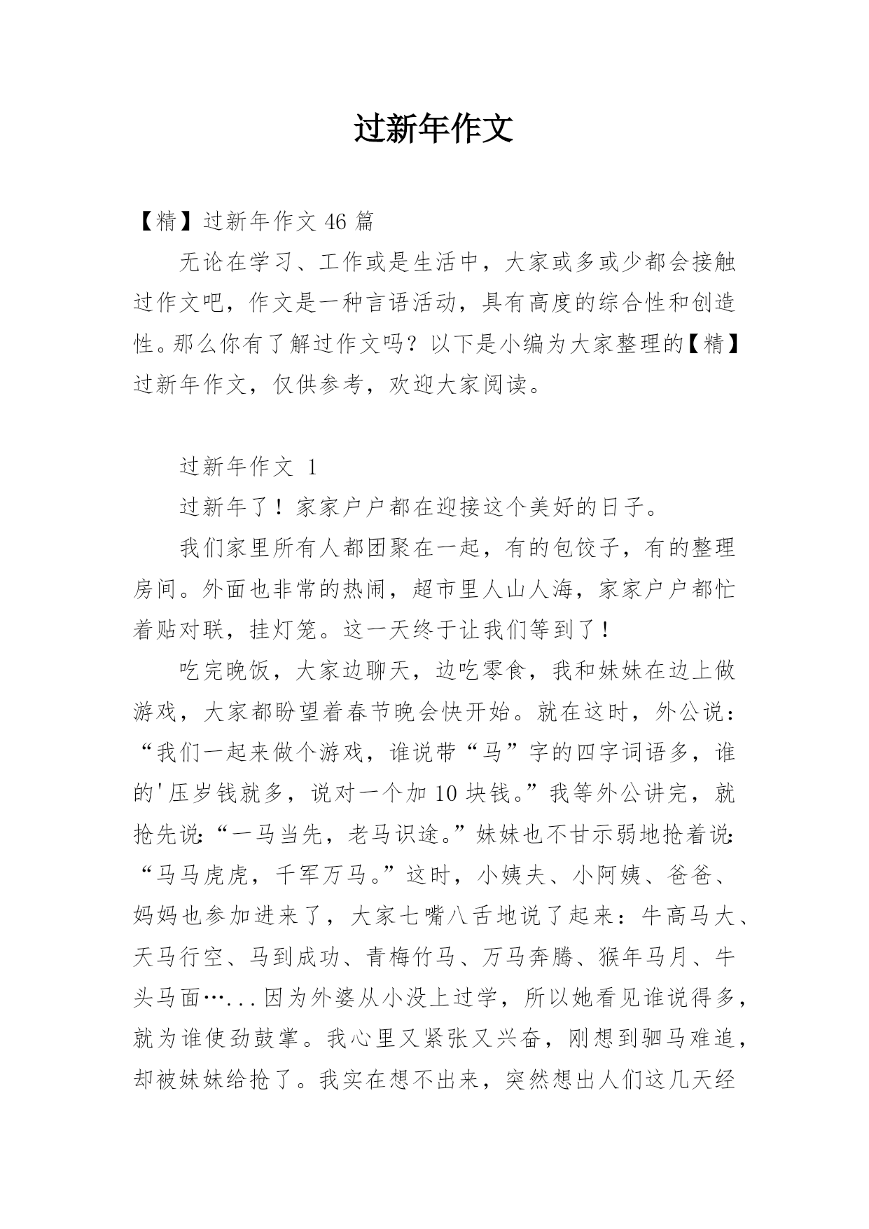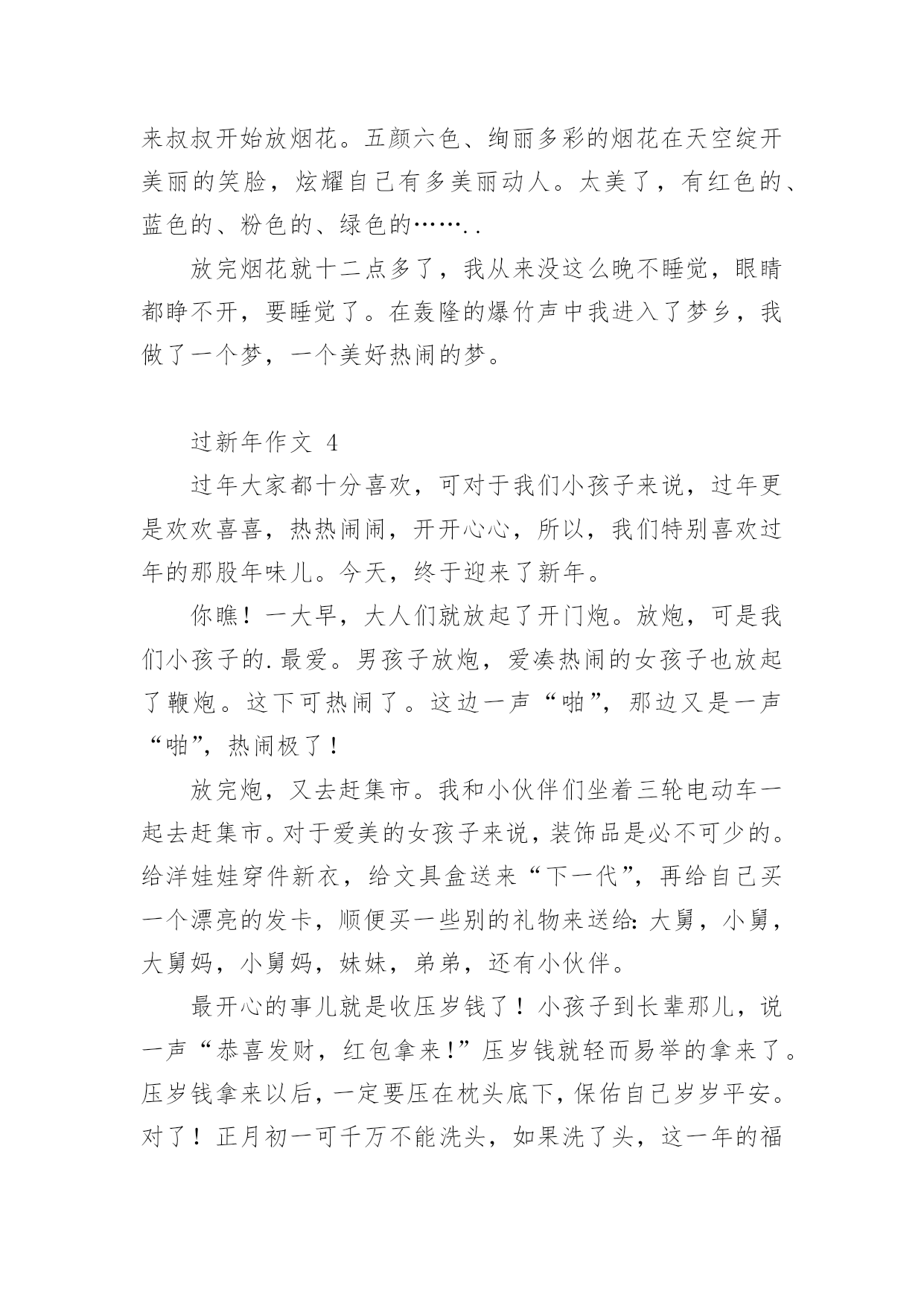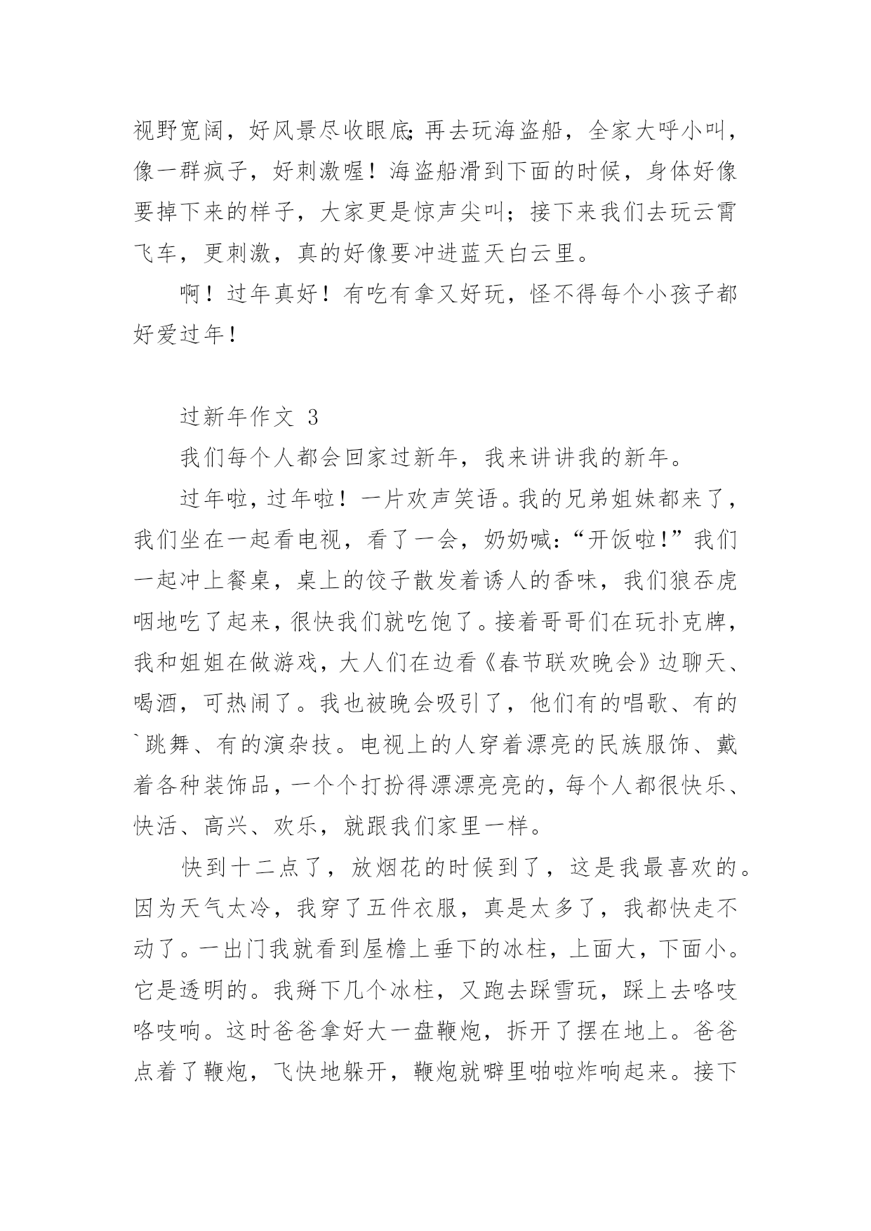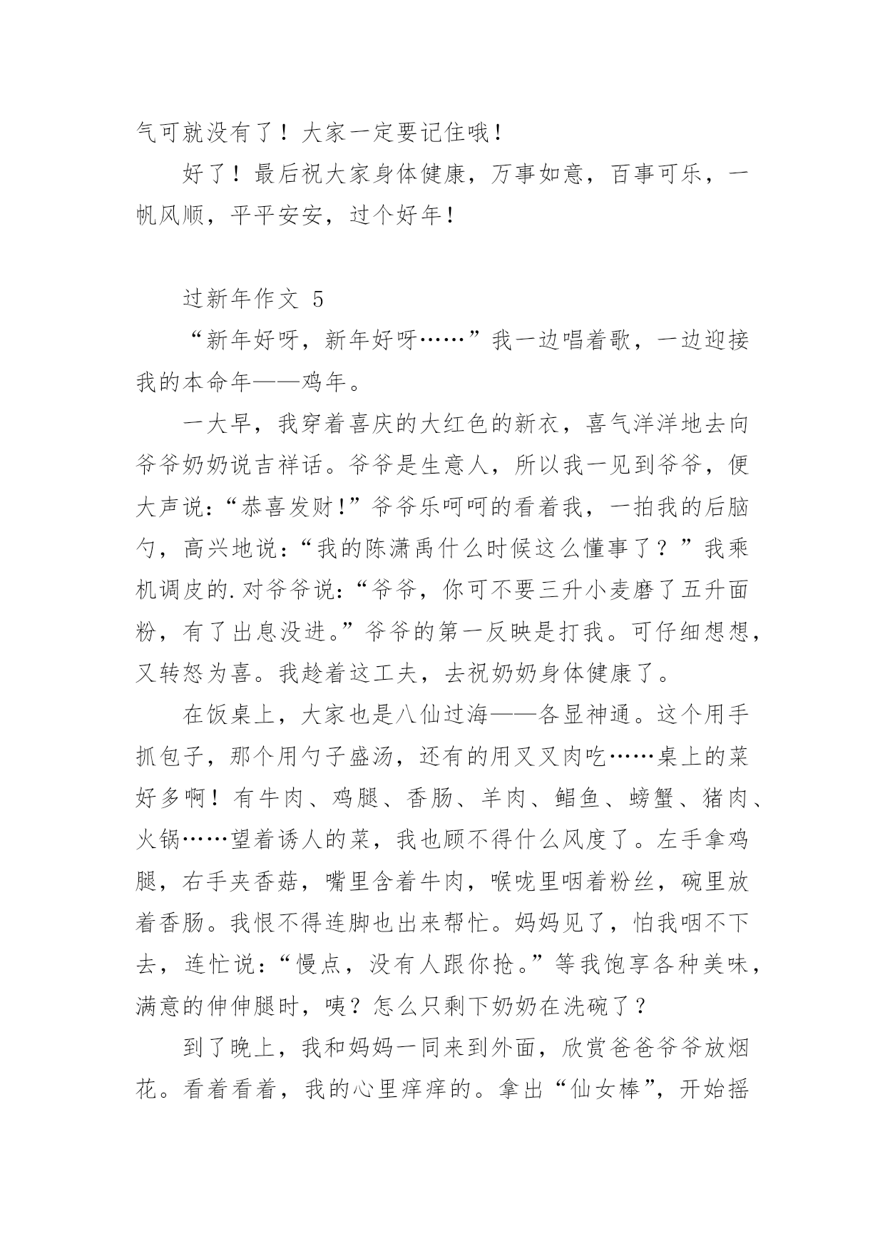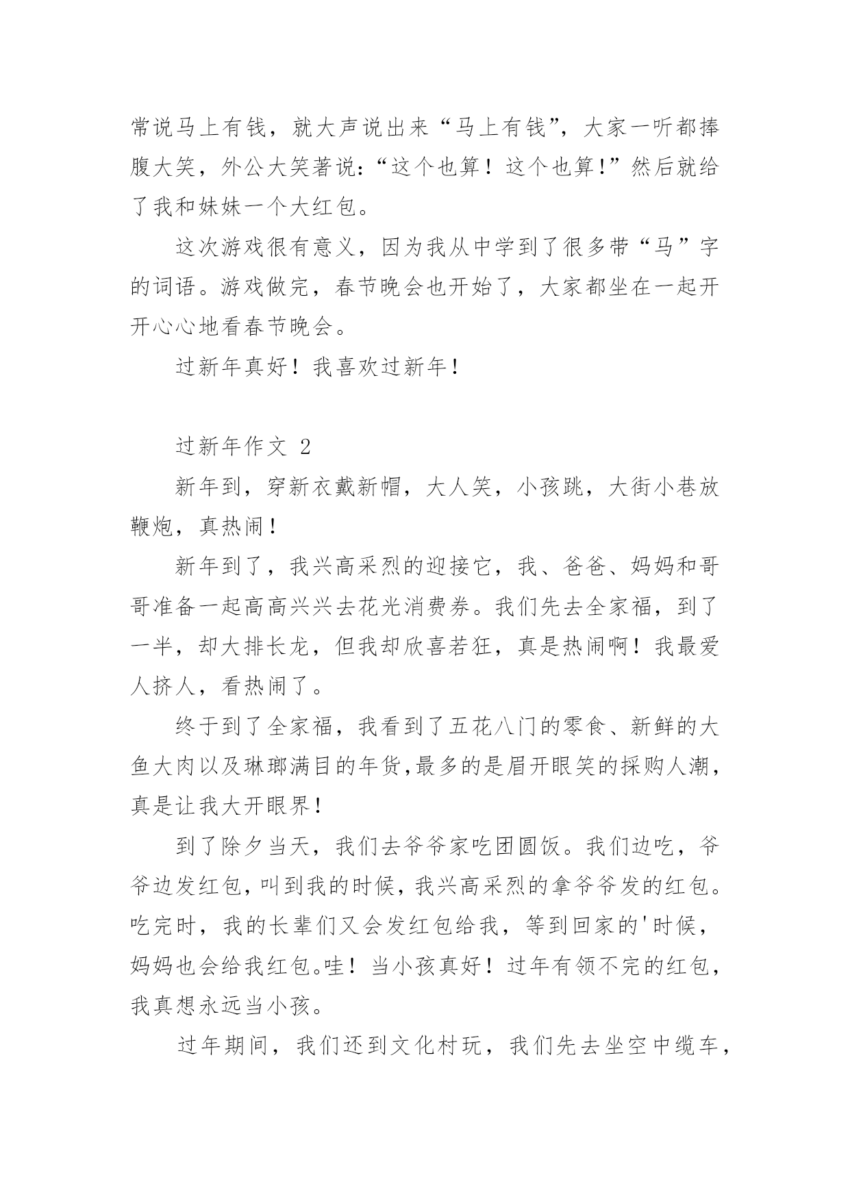 过新年作文 【精】过新年作文46篇无论在学习、工作或是生活中,大家或多或少都会接触过作文吧,作文是一种言语活动,具有高度的综合性和创造性。那么你有了解过作文吗?以下是小编为大家整理的【精】过新年作文,仅供参考,欢迎大家阅读。过新年作文1过新年了!家家户户都在迎接这个美好的日子。我们家里所有人都团聚在一起,有的包饺子,有的整理房间。外面也非常的热闹,超市里人山人海,家家户户都忙着贴对联,挂灯笼。这一天终于让我们等到了!吃完晚饭,大家边聊天,边吃零食,我和妹妹在边上做游戏,大家都盼望着春节晚会快开始。就在这时,外公说:“我们一起来做个游戏,谁说带“马”字的四字词语多,谁的'压岁钱就多,说对一个加10块钱。”我等外公讲完,就抢先说:“一马当先,老马识途。”妹妹也不甘示弱地抢着说:“马马虎虎,千军万马。”这时,小姨夫、小阿姨、爸爸、妈妈也参加进来了,大家七嘴八舌地说了起来:牛高马大、天马行空、马到成功、青梅竹马、万马奔腾、猴年马月、牛头马面…...因为外婆从小没上过学,所以她看见谁说得多,就为谁使劲鼓掌。我心里又紧张又兴奋,刚想到驷马难追,却被妹妹给抢了。我实在想不出来,突然想出人们这几天经常说马上有钱,就大声说出来“马上有钱”,大家一听都捧腹大笑,外公大笑著说:“这个也算!这个也算!”然后就给了我和妹妹一个大红包。这次游戏很有意义,因为我从中学到了很多带“马”字的词语。游戏做完,春节晚会也开始了,大家都坐在一起开开心心地看春节晚会。过新年真好!我喜欢过新年!过新年作文2新年到,穿新衣戴新帽,大人笑,小孩跳,大街小巷放鞭炮,真热闹!新年到了,我兴高采烈的迎接它,我、爸爸、妈妈和哥哥准备一起高高兴兴去花光消费券。我们先去全家福,到了一半,却大排长龙,但我却欣喜若狂,真是热闹啊!我最爱人挤人,看热闹了。终于到了全家福,我看到了五花八门的零食、新鲜的大鱼大肉以及琳瑯满目的年货,最多的是眉开眼笑的採购人潮,真是让我大开眼界!到了除夕当天,我们去爷爷家吃团圆饭。我们边吃,爷爷边发红包,叫到我的时候,我兴高采烈的拿爷爷发的红包。吃完时,我的长辈们又会发红包给我,等到回家的'时候,妈妈也会给我红包。哇!当小孩真好!过年有领不完的红包,我真想永远当小孩。过年期间,我们还到文化村玩,我们先去坐空中缆车,视野宽阔,好风景尽收眼底;再去玩海盗船,全家大呼小叫,像一群疯子,好刺激喔!海盗船滑到下面的时候,身体好像要掉下来的样子,大家更是惊声尖叫;接下来我们去玩云霄飞车,更刺激,真的好像要冲进蓝天白云里。啊!过年真好!有吃有拿又好玩,怪不得每个小孩子都好爱过年!过新年作文3我们每个人都会回家过新年,我来讲讲我的新年。过年啦,过年啦!一片欢声笑语。我的兄弟姐妹都来了,我们坐在一起看电视,看了一会,奶奶喊:“开饭啦!”我们一起冲上餐桌,桌上的饺子散发着诱人的香味,我们狼吞虎咽地吃了起来,很快我们就吃饱了。接着哥哥们在玩扑克牌,我和姐姐在做游戏,大人们在边看《春节联欢晚会》边聊天、喝酒,可热闹了。我也被晚会吸引了,他们有的唱歌、有的`跳舞、有的演杂技。电视上的人穿着漂亮的民族服饰、戴着各种装饰品,一个个打扮得漂漂亮亮的,每个人都很快乐、快活、高兴、欢乐,就跟我们家里一样。快到十二点了,放烟花的时候到了,这是我最喜欢的。因为天气太冷,我穿了五件衣服,真是太多了,我都快走不动了。一出门我就看到屋檐上垂下的冰柱,上面大,下面小。它是透明的。我掰下几个冰柱,又跑去踩雪玩,踩上去咯吱咯吱响。这时爸爸拿好大一盘鞭炮,拆开了摆在地上。爸爸点着了鞭炮,飞快地躲开,鞭炮就噼里啪啦炸响起来。接下来叔叔开始放烟花。五颜六色、绚丽多彩的烟花在天空绽开美丽的笑脸,炫耀自己有多美丽动人。太美了,有红色的、蓝色的、粉色的、绿色的……..放完烟花就十二点多了,我从来没这么晚不睡觉,眼睛都睁不开,要睡觉了。在轰隆的爆竹声中我进入了梦乡,我做了一个梦,一个美好热闹的梦。过新年作文4过年大家都十分喜欢,可对于我们小孩子来说,过年更是欢欢喜喜,热热闹闹,开开心心,所以,我们特别喜欢过年的那股年味儿。今天,终于迎来了新年。你瞧!一大早,大人们就放起了开门炮。放炮,可是我们小孩子的.最爱。男孩子放炮,爱凑热闹的女孩子也放起了鞭炮。这下可热闹了。这边一声“啪”,那边又是一声“啪”,热闹极了!放完炮,又去赶集市。我和小伙伴们坐着三轮电动车一起去赶集市。对于爱美的女孩子来说,装饰品是必不可少的。给洋娃娃穿件新衣,给文具盒送来“下一代”,再给自己买一个漂亮的发卡,顺便买一些别的礼物来送给:大舅,小舅,大舅妈,小舅妈,妹妹,弟弟,还有小伙伴。最开心的事儿就是收压岁钱了!小孩子到长辈那儿,说一声“恭喜发财,红包拿来!”压岁钱就轻而易举的拿来了。压岁钱拿来以后,一定要压在枕头底下,保佑自己岁岁平安。对了!正月初一可千万不
