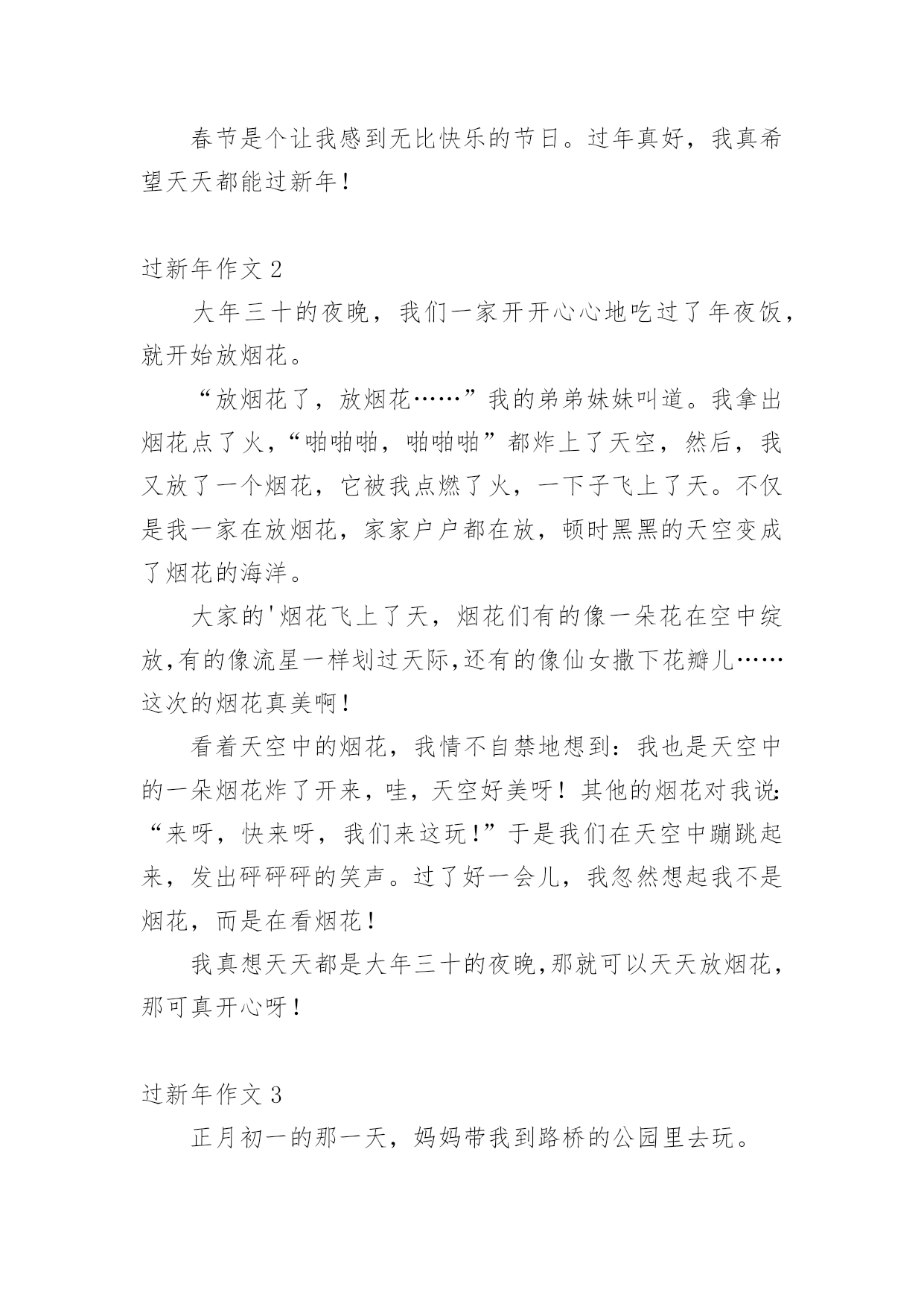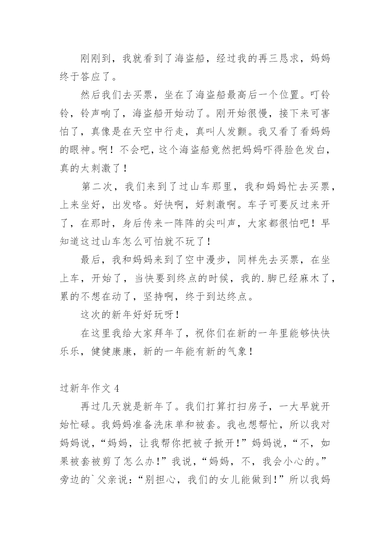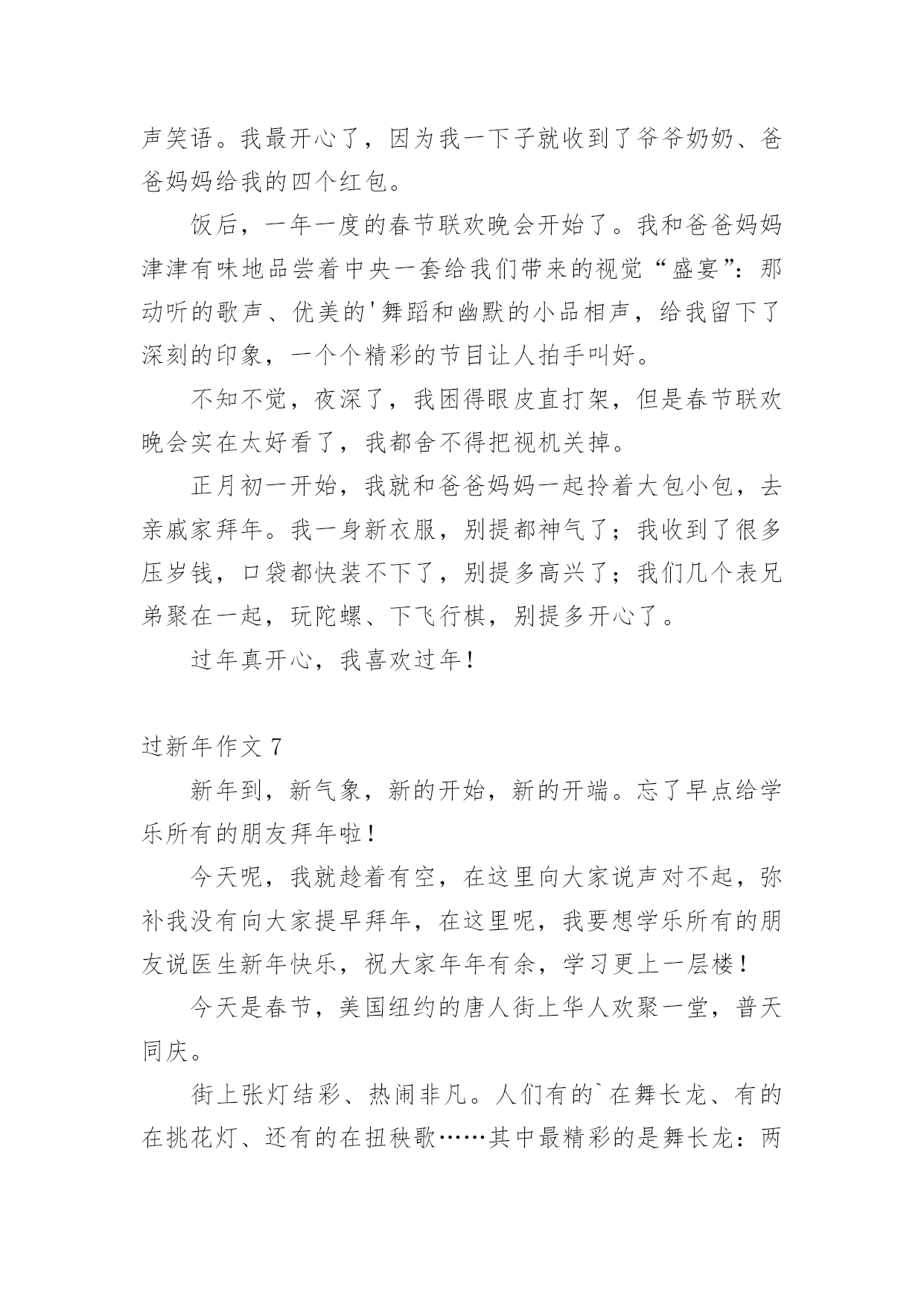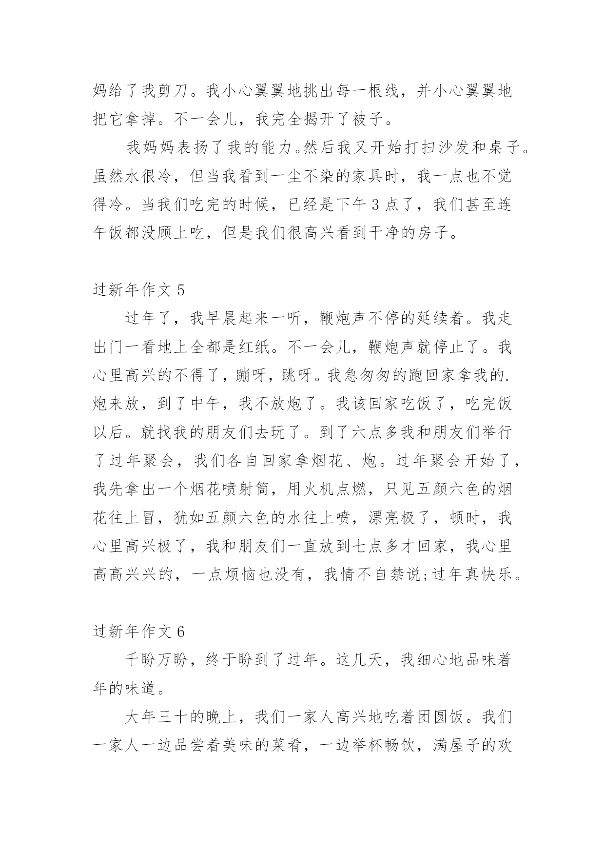 过新年作文 (精品)过新年作文在平凡的学习、工作、生活中,大家都经常接触到作文吧,借助作文可以宣泄心中的情感,调节自己的心情。为了让您在写作文时更加简单方便,以下是小编为大家收集的过新年作文,仅供参考,希望能够帮助到大家。过新年作文1春节前几天,爸爸妈妈都忙着打扫卫生,准备新年吃的食品。而我最喜欢做的事就是贴春联。我真盼望新年早点来临。在我的期盼中,新年终于到了。大年三十晚上,我们全家坐在一起吃团团饭。妈妈烧了一桌丰盛可口的饭菜,我们一起举杯互相祝福。每年吃年夜饭,爸爸都会说:“我们先敬妈妈,妈妈很辛苦。”这时,妈妈就会露出甜蜜的笑容。爸爸妈妈还包压岁钱给我呢。我拿着压岁钱心里美滋滋的。吃完团圆饭,我们就兴高彩烈地去放烟花。只听“啪”的一声,美丽的烟花在夜空中绽放了,五彩缤纷,好看极了!放完烟花,我们依依不舍的回家了。回到家中,我们一边吃东西,一边看着精彩的春节晚会,这种感觉真幸福啊!大年初一,我穿上新衣新鞋,和爸爸妈妈一起去亲戚家拜年。一天下来,我说了许多祝福的话,也吃了许多好吃的.美食,还收到了很多红包呢!真是开心的一天。春节是个让我感到无比快乐的节日。过年真好,我真希望天天都能过新年!过新年作文2大年三十的夜晚,我们一家开开心心地吃过了年夜饭,就开始放烟花。“放烟花了,放烟花……”我的弟弟妹妹叫道。我拿出烟花点了火,“啪啪啪,啪啪啪”都炸上了天空,然后,我又放了一个烟花,它被我点燃了火,一下子飞上了天。不仅是我一家在放烟花,家家户户都在放,顿时黑黑的天空变成了烟花的海洋。大家的'烟花飞上了天,烟花们有的像一朵花在空中绽放,有的像流星一样划过天际,还有的像仙女撒下花瓣儿……这次的烟花真美啊!看着天空中的烟花,我情不自禁地想到:我也是天空中的一朵烟花炸了开来,哇,天空好美呀!其他的烟花对我说:“来呀,快来呀,我们来这玩!”于是我们在天空中蹦跳起来,发出砰砰砰的笑声。过了好一会儿,我忽然想起我不是烟花,而是在看烟花!我真想天天都是大年三十的夜晚,那就可以天天放烟花,那可真开心呀!过新年作文3正月初一的那一天,妈妈带我到路桥的公园里去玩。刚刚到,我就看到了海盗船,经过我的再三恳求,妈妈终于答应了。然后我们去买票,坐在了海盗船最高后一个位置。叮铃铃,铃声响了,海盗船开始动了。刚开始很慢,接下来可害怕了,真像是在天空中行走,真叫人发颤。我又看了看妈妈的眼神。啊!不会吧,这个海盗船竟然把妈妈吓得脸色发白,真的太刺激了!第二次,我们来到了过山车那里,我和妈妈忙去买票,上来坐好,出发咯。好快啊,好刺激啊。车子可要反过来开了,在那时,身后传来一阵阵的尖叫声,大家都很怕吧!早知道这过山车怎么可怕就不玩了!最后,我和妈妈来到了空中漫步,同样先去买票,在坐上车,开始了,当快要到终点的时候,我的.脚已经麻木了,累的不想在动了,坚持啊,终于到达终点。这次的新年好好玩呀!在这里我给大家拜年了,祝你们在新的一年里能够快快乐乐,健健康康,新的一年能有新的气象!过新年作文4再过几天就是新年了。我们打算打扫房子,一大早就开始忙碌。我妈妈准备洗床单和被套。我也想帮忙,所以我对妈妈说,“妈妈,让我帮你把被子掀开!”妈妈说,“不,如果被套被剪了怎么办!”我说,“妈妈,不,我会小心的。”旁边的`父亲说:“别担心,我们的女儿能做到!”所以我妈妈给了我剪刀。我小心翼翼地挑出每一根线,并小心翼翼地把它拿掉。不一会儿,我完全揭开了被子。我妈妈表扬了我的能力。然后我又开始打扫沙发和桌子。虽然水很冷,但当我看到一尘不染的家具时,我一点也不觉得冷。当我们吃完的时候,已经是下午3点了,我们甚至连午饭都没顾上吃,但是我们很高兴看到干净的房子。过新年作文5过年了,我早晨起来一听,鞭炮声不停的延续着。我走出门一看地上全都是红纸。不一会儿,鞭炮声就停止了。我心里高兴的不得了,蹦呀,跳呀。我急匆匆的跑回家拿我的.炮来放,到了中午,我不放炮了。我该回家吃饭了,吃完饭以后。就找我的朋友们去玩了。到了六点多我和朋友们举行了过年聚会,我们各自回家拿烟花、炮。过年聚会开始了,我先拿出一个烟花喷射筒,用火机点燃,只见五颜六色的烟花往上冒,犹如五颜六色的水往上喷,漂亮极了,顿时,我心里高兴极了,我和朋友们一直放到七点多才回家,我心里高高兴兴的,一点烦恼也没有,我情不自禁说;过年真快乐。过新年作文6千盼万盼,终于盼到了过年。这几天,我细心地品味着年的味道。大年三十的晚上,我们一家人高兴地吃着团圆饭。我们一家人一边品尝着美味的菜肴,一边举杯畅饮,满屋子的欢声笑语。我最开心了,因为我一下子就收到了爷爷奶奶、爸爸妈妈给我的四个红包。饭后,一年一度的春节联欢晚会开始了。我和爸爸妈妈津津有味地品尝着中央一套给我们带来的视觉“盛宴”:那动听的歌声、优美的'舞蹈和幽默的小品相声,给我留下了深刻的印象,一个个精彩的节目让人