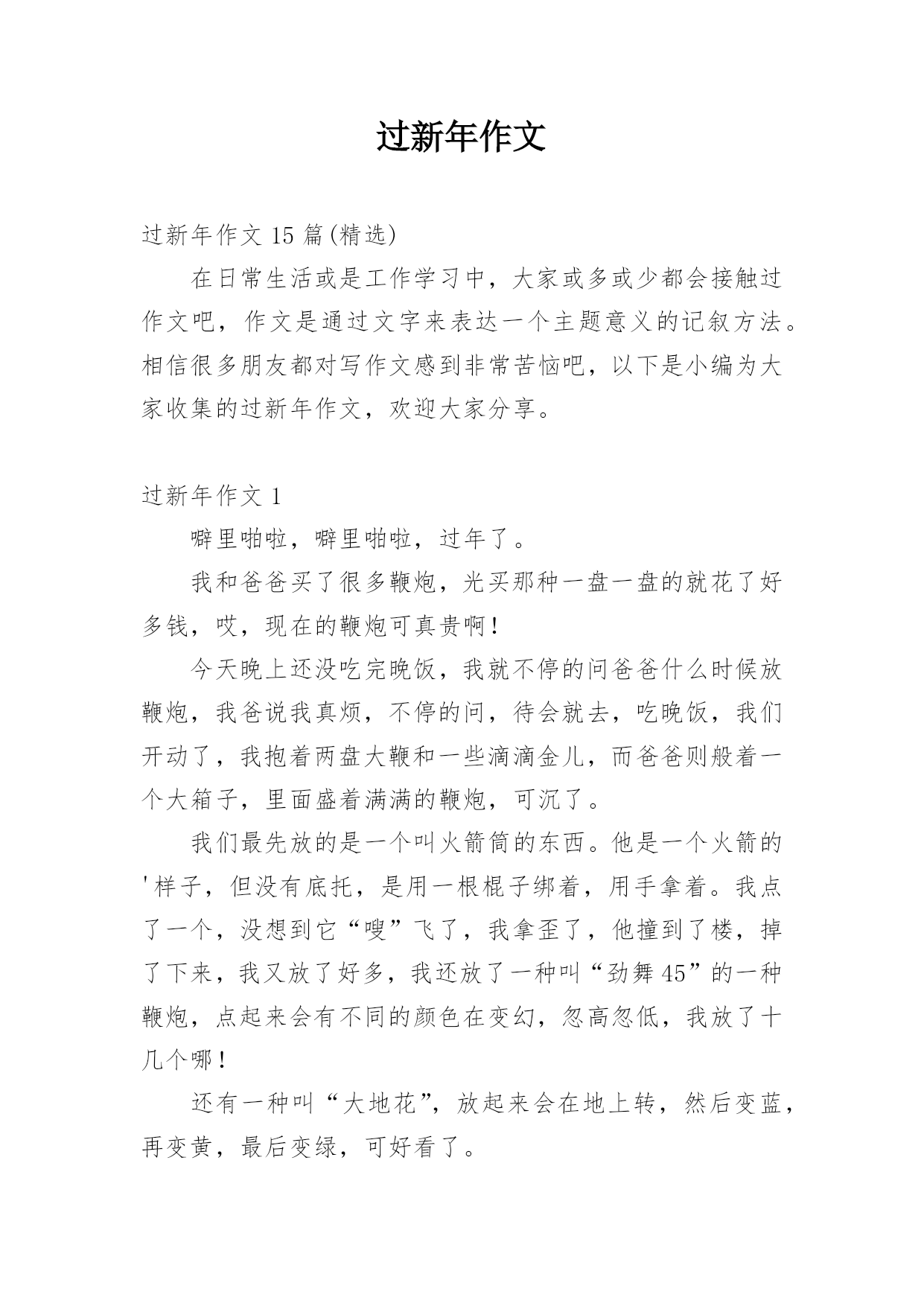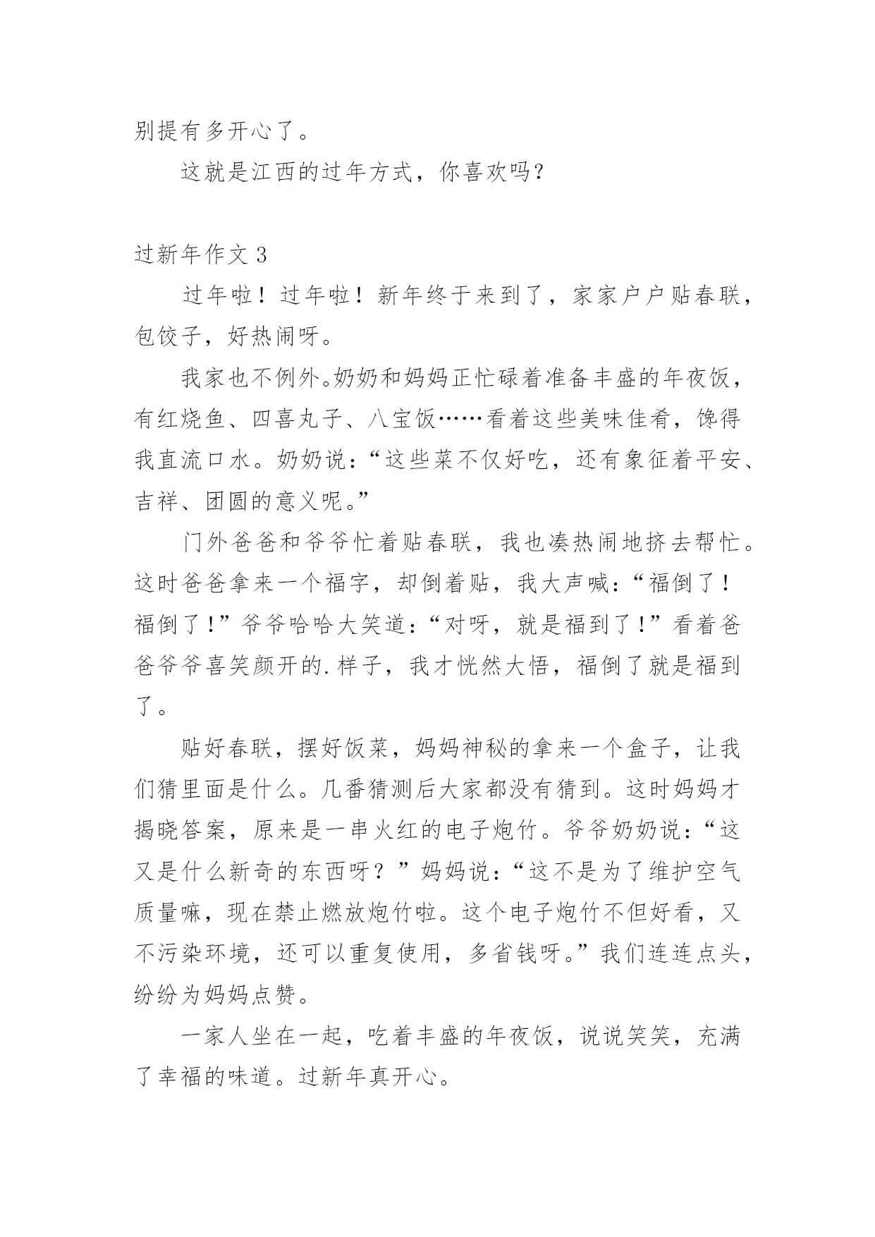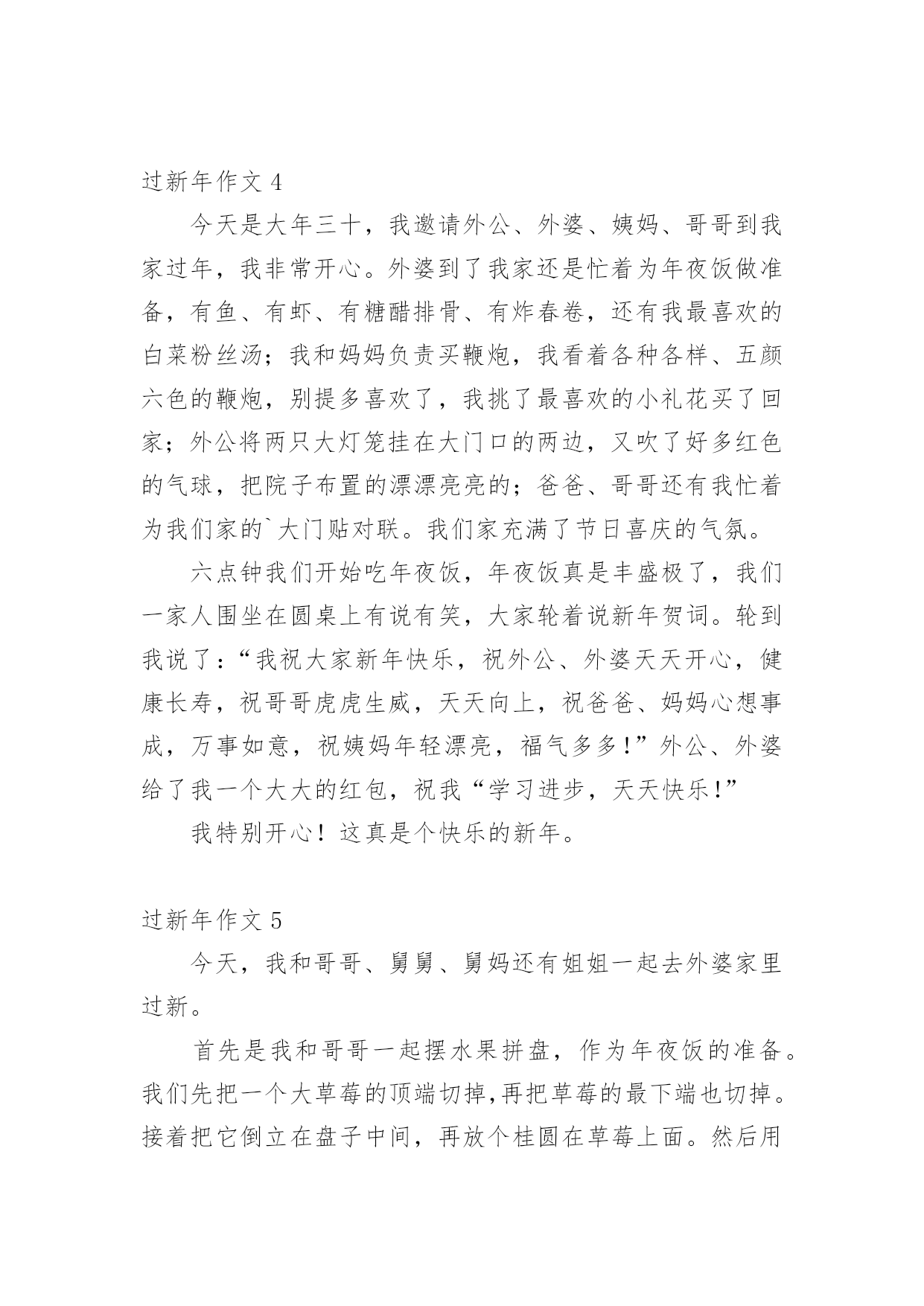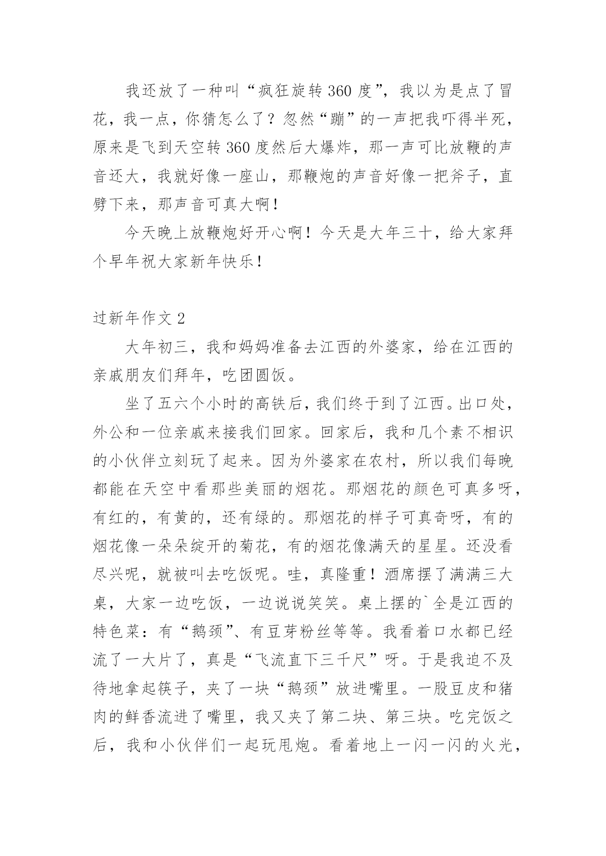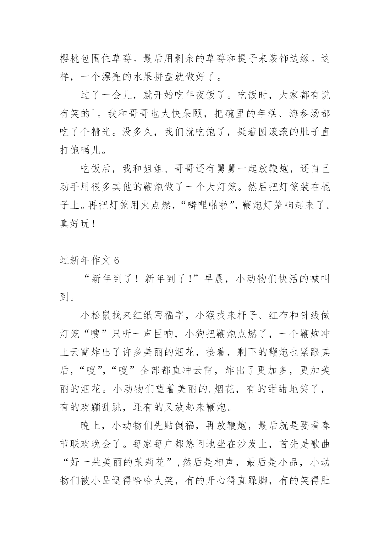 过新年作文 过新年作文15篇(精选)在日常生活或是工作学习中,大家或多或少都会接触过作文吧,作文是通过文字来表达一个主题意义的记叙方法。相信很多朋友都对写作文感到非常苦恼吧,以下是小编为大家收集的过新年作文,欢迎大家分享。过新年作文1噼里啪啦,噼里啪啦,过年了。我和爸爸买了很多鞭炮,光买那种一盘一盘的就花了好多钱,哎,现在的鞭炮可真贵啊!今天晚上还没吃完晚饭,我就不停的问爸爸什么时候放鞭炮,我爸说我真烦,不停的问,待会就去,吃晚饭,我们开动了,我抱着两盘大鞭和一些滴滴金儿,而爸爸则般着一个大箱子,里面盛着满满的鞭炮,可沉了。我们最先放的是一个叫火箭筒的东西。他是一个火箭的'样子,但没有底托,是用一根棍子绑着,用手拿着。我点了一个,没想到它“嗖”飞了,我拿歪了,他撞到了楼,掉了下来,我又放了好多,我还放了一种叫“劲舞45”的一种鞭炮,点起来会有不同的颜色在变幻,忽高忽低,我放了十几个哪!还有一种叫“大地花”,放起来会在地上转,然后变蓝,再变黄,最后变绿,可好看了。我还放了一种叫“疯狂旋转360度”,我以为是点了冒花,我一点,你猜怎么了?忽然“蹦”的一声把我吓得半死,原来是飞到天空转360度然后大爆炸,那一声可比放鞭的声音还大,我就好像一座山,那鞭炮的声音好像一把斧子,直劈下来,那声音可真大啊!今天晚上放鞭炮好开心啊!今天是大年三十,给大家拜个早年祝大家新年快乐!过新年作文2大年初三,我和妈妈准备去江西的外婆家,给在江西的亲戚朋友们拜年,吃团圆饭。坐了五六个小时的高铁后,我们终于到了江西。出口处,外公和一位亲戚来接我们回家。回家后,我和几个素不相识的小伙伴立刻玩了起来。因为外婆家在农村,所以我们每晚都能在天空中看那些美丽的烟花。那烟花的颜色可真多呀,有红的,有黄的,还有绿的。那烟花的样子可真奇呀,有的烟花像一朵朵绽开的菊花,有的烟花像满天的星星。还没看尽兴呢,就被叫去吃饭呢。哇,真隆重!酒席摆了满满三大桌,大家一边吃饭,一边说说笑笑。桌上摆的`全是江西的特色菜:有“鹅颈”、有豆芽粉丝等等。我看着口水都已经流了一大片了,真是“飞流直下三千尺”呀。于是我迫不及待地拿起筷子,夹了一块“鹅颈”放进嘴里。一股豆皮和猪肉的鲜香流进了嘴里,我又夹了第二块、第三块。吃完饭之后,我和小伙伴们一起玩甩炮。看着地上一闪一闪的火光,别提有多开心了。这就是江西的过年方式,你喜欢吗?过新年作文3过年啦!过年啦!新年终于来到了,家家户户贴春联,包饺子,好热闹呀。我家也不例外。奶奶和妈妈正忙碌着准备丰盛的年夜饭,有红烧鱼、四喜丸子、八宝饭……看着这些美味佳肴,馋得我直流口水。奶奶说:“这些菜不仅好吃,还有象征着平安、吉祥、团圆的意义呢。”门外爸爸和爷爷忙着贴春联,我也凑热闹地挤去帮忙。这时爸爸拿来一个福字,却倒着贴,我大声喊:“福倒了!福倒了!”爷爷哈哈大笑道:“对呀,就是福到了!”看着爸爸爷爷喜笑颜开的.样子,我才恍然大悟,福倒了就是福到了。贴好春联,摆好饭菜,妈妈神秘的拿来一个盒子,让我们猜里面是什么。几番猜测后大家都没有猜到。这时妈妈才揭晓答案,原来是一串火红的电子炮竹。爷爷奶奶说:“这又是什么新奇的东西呀?”妈妈说:“这不是为了维护空气质量嘛,现在禁止燃放炮竹啦。这个电子炮竹不但好看,又不污染环境,还可以重复使用,多省钱呀。”我们连连点头,纷纷为妈妈点赞。一家人坐在一起,吃着丰盛的年夜饭,说说笑笑,充满了幸福的味道。过新年真开心。过新年作文4今天是大年三十,我邀请外公、外婆、姨妈、哥哥到我家过年,我非常开心。外婆到了我家还是忙着为年夜饭做准备,有鱼、有虾、有糖醋排骨、有炸春卷,还有我最喜欢的白菜粉丝汤;我和妈妈负责买鞭炮,我看着各种各样、五颜六色的鞭炮,别提多喜欢了,我挑了最喜欢的小礼花买了回家;外公将两只大灯笼挂在大门口的两边,又吹了好多红色的气球,把院子布置的漂漂亮亮的;爸爸、哥哥还有我忙着为我们家的`大门贴对联。我们家充满了节日喜庆的气氛。六点钟我们开始吃年夜饭,年夜饭真是丰盛极了,我们一家人围坐在圆桌上有说有笑,大家轮着说新年贺词。轮到我说了:“我祝大家新年快乐,祝外公、外婆天天开心,健康长寿,祝哥哥虎虎生威,天天向上,祝爸爸、妈妈心想事成,万事如意,祝姨妈年轻漂亮,福气多多!”外公、外婆给了我一个大大的红包,祝我“学习进步,天天快乐!”我特别开心!这真是个快乐的新年。过新年作文5今天,我和哥哥、舅舅、舅妈还有姐姐一起去外婆家里过新。首先是我和哥哥一起摆水果拼盘,作为年夜饭的准备。我们先把一个大草莓的顶端切掉,再把草莓的最下端也切掉。接着把它倒立在盘子中间,再放个桂圆在草莓上面。然后用樱桃包围住草莓。最后用剩余的草莓和提子来装饰边缘。这样,一个漂亮的水果拼盘就做好了。过了一会儿,就开始吃年夜饭了。吃饭时,大家都有说有笑的`。我和哥哥也大快朵颐,