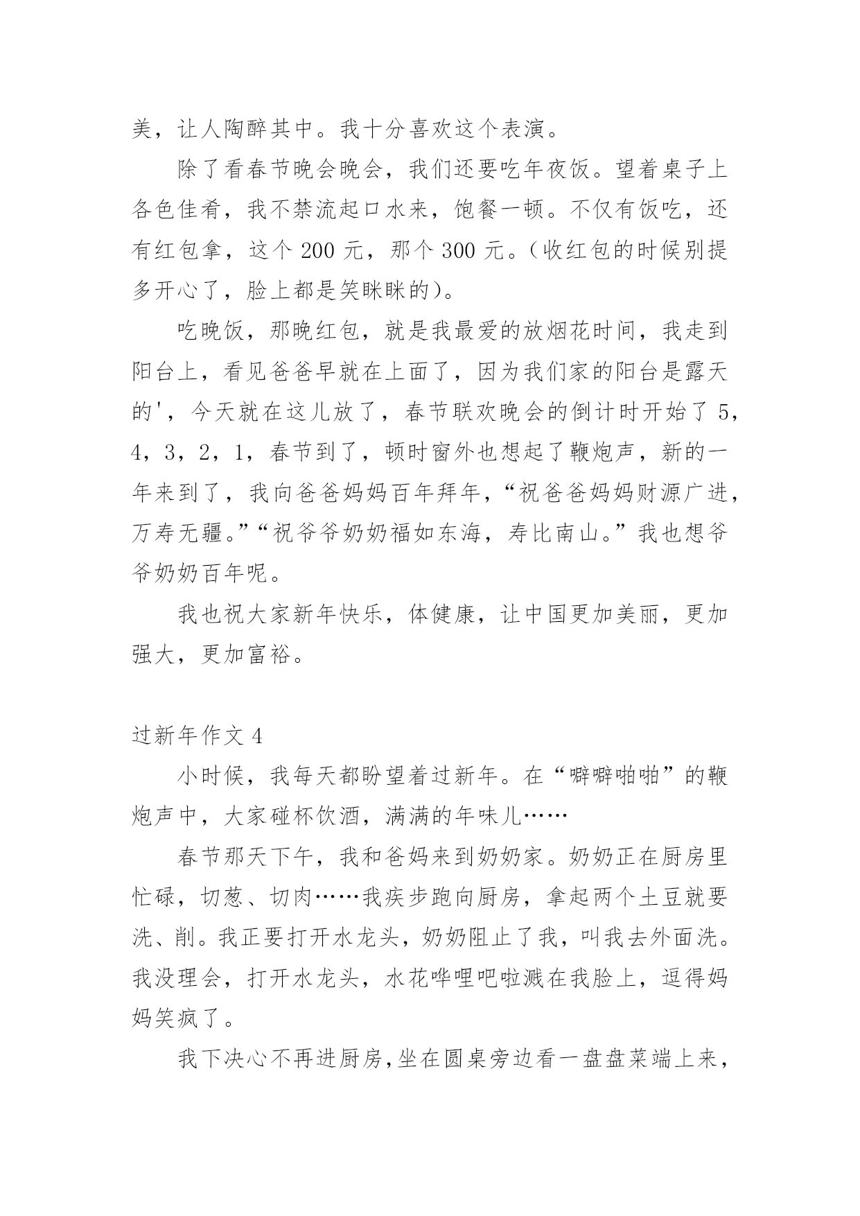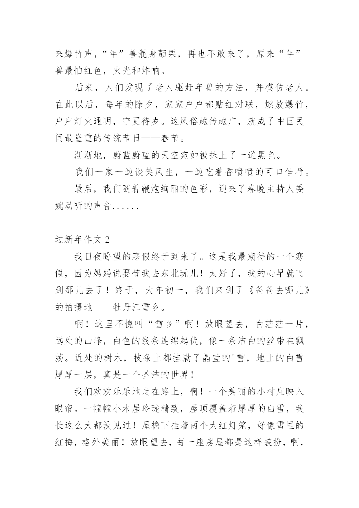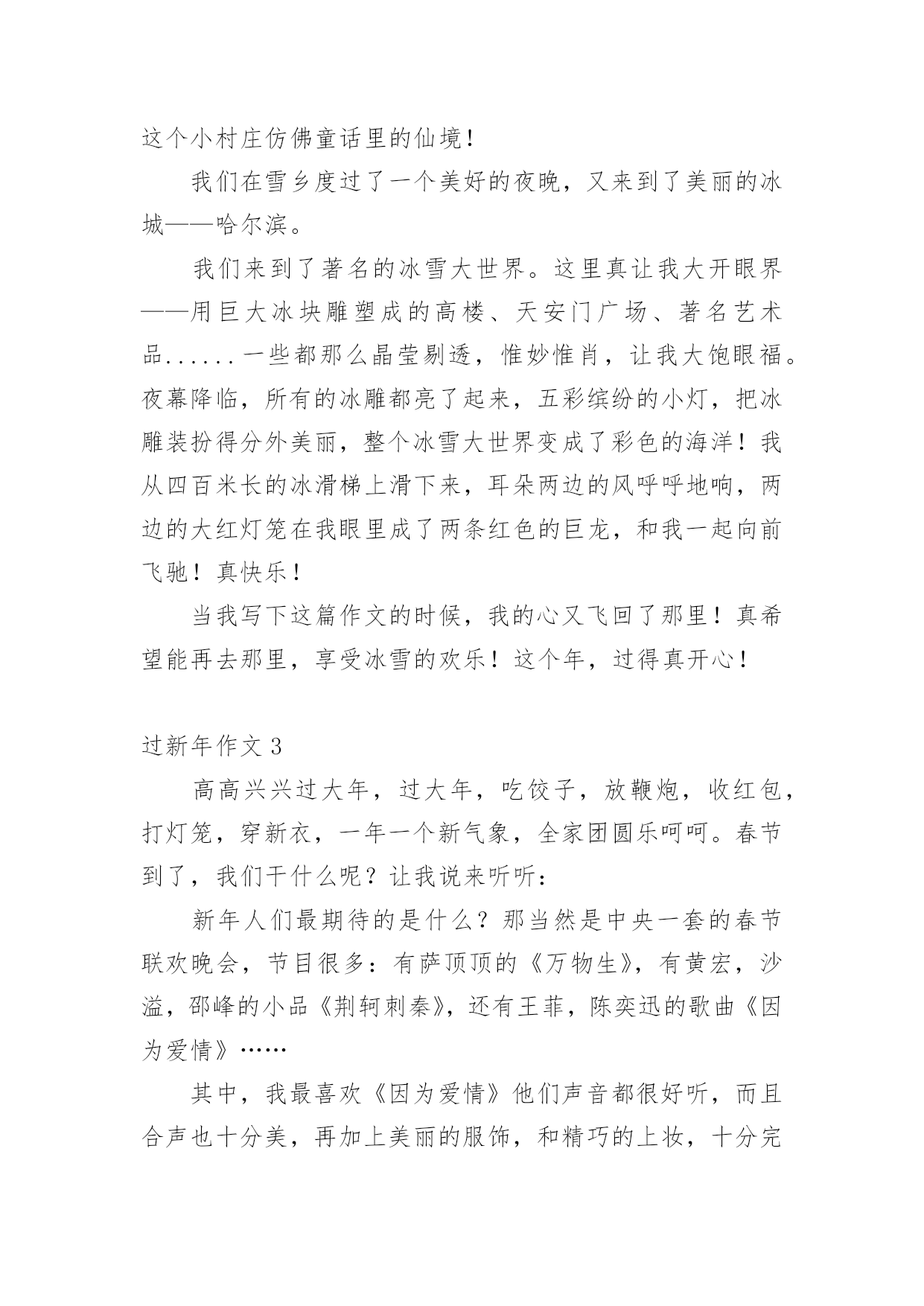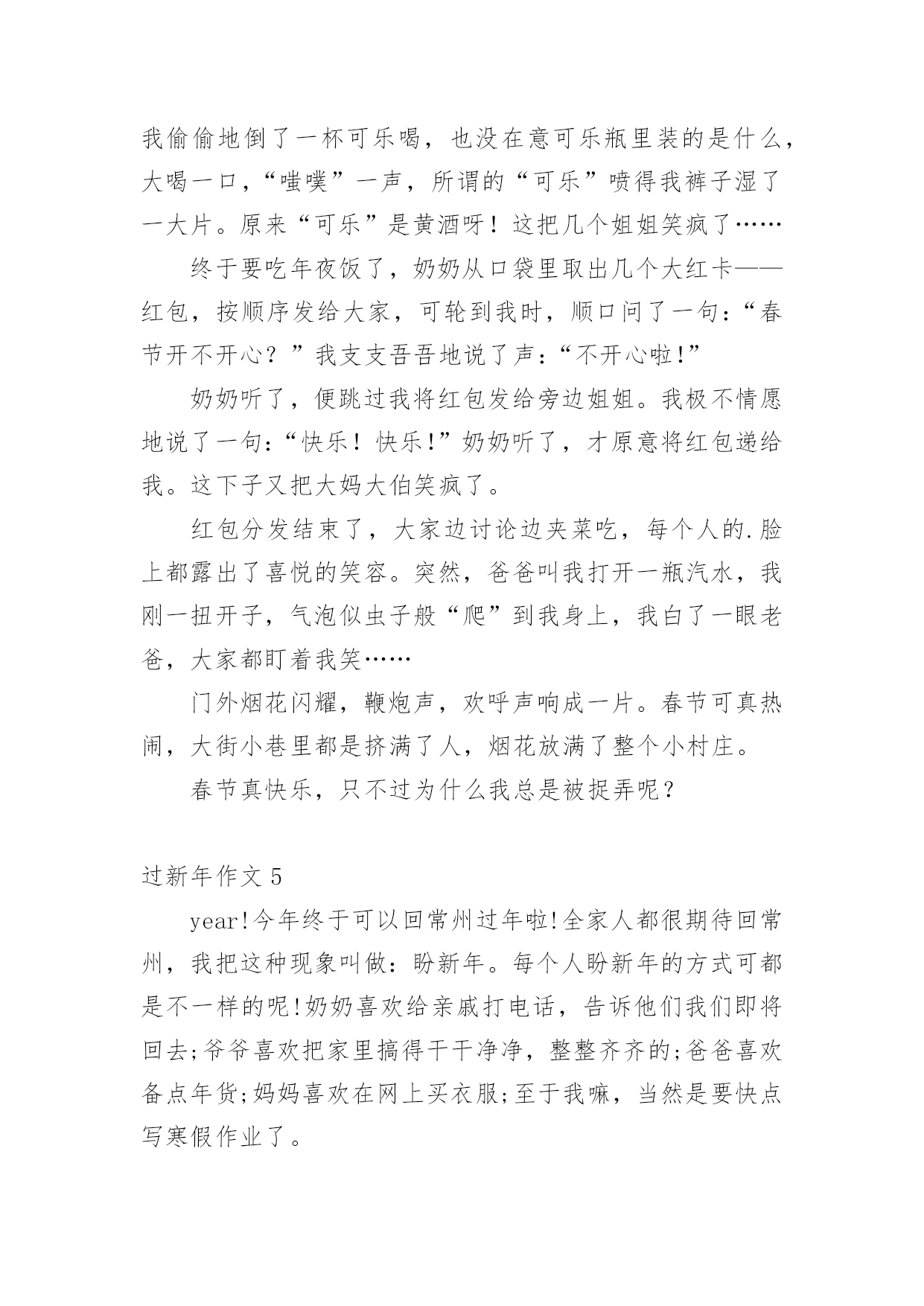 过新年作文 过新年作文15篇【集合】在平平淡淡的日常中,大家都经常看到作文的身影吧,作文是人们以书面形式表情达意的言语活动。那么你有了解过作文吗?下面是小编收集整理的过新年作文,希望能够帮助到大家。过新年作文1期盼已久的新年终于到了,团圆的欢乐如同百合的芳香弥漫着世界各地。家家户户有的`在包饺子;有的在贴春联和“福”字。大街上张灯结彩、喜气洋洋,金灿灿的阳光普照大地,照耀在红灯笼上,格外耀眼。大人们脸上洋溢着快乐,孩子们脸上洋溢着童真。说到年,我想到了年的传说:传说中国古时侯有一种叫“年”的怪兽,每到除夕,爬上岸来吞食牲畜伤害人命,因此每到除夕,村村寨寨的人们扶老携幼,逃往深山,以躲避“年”的伤害。又到了一年的除夕,乡亲们像往年都忙着收拾东西准备逃往深山,这时候村东头来了一个白发老人,白发老人对一户老婆婆说只要让他在她家住一晚,他定能将“年”驱赶走.众人不信,老婆婆劝他离开,但老人坚持留下。当“年”兽像以往一样准备闯进村肆虐的时候,突然传来爆竹声,“年”兽混身颤栗,再也不敢来了,原来“年”兽最怕红色,火光和炸响。后来,人们发现了老人驱赶年兽的方法,并模仿老人。在此以后,每年的除夕,家家户户都贴红对联,燃放爆竹,户户灯火通明,守更待岁。这风俗越传越广,就成了中国民间最隆重的传统节日——春节。渐渐地,蔚蓝蔚蓝的天空宛如被抹上了一道黑色。我们一家一边谈笑风生,一边吃着香喷喷的可口佳肴。最后,我们随着鞭炮绚丽的色彩,迎来了春晚主持人委婉动听的声音......过新年作文2我日夜盼望的寒假终于到来了。这是我最期待的一个寒假,因为妈妈说要带我去东北玩儿!太好了,我的心早就飞到那儿去了!终于,大年初一,我们来到了《爸爸去哪儿》的拍摄地——牡丹江雪乡。啊!这里不愧叫“雪乡”啊!放眼望去,白茫茫一片,远处的山峰,白色的线条连绵起伏,像一条洁白的丝带在飘荡。近处的树木,枝条上都挂满了晶莹的'雪,地上的白雪厚厚一层,真是一个圣洁的世界!我们欢欢乐乐地走在路上,啊!一个美丽的小村庄映入眼帘。一幢幢小木屋玲珑精致,屋顶覆盖着厚厚的白雪,我长这么大都没见过!屋檐下挂着两个大红灯笼,好像雪里的红梅,格外美丽!放眼望去,每一座房屋都是这样装扮,啊,这个小村庄仿佛童话里的仙境!我们在雪乡度过了一个美好的夜晚,又来到了美丽的冰城——哈尔滨。我们来到了著名的冰雪大世界。这里真让我大开眼界——用巨大冰块雕塑成的高楼、天安门广场、著名艺术品......一些都那么晶莹剔透,惟妙惟肖,让我大饱眼福。夜幕降临,所有的冰雕都亮了起来,五彩缤纷的小灯,把冰雕装扮得分外美丽,整个冰雪大世界变成了彩色的海洋!我从四百米长的冰滑梯上滑下来,耳朵两边的风呼呼地响,两边的大红灯笼在我眼里成了两条红色的巨龙,和我一起向前飞驰!真快乐!当我写下这篇作文的时候,我的心又飞回了那里!真希望能再去那里,享受冰雪的欢乐!这个年,过得真开心!过新年作文3高高兴兴过大年,过大年,吃饺子,放鞭炮,收红包,打灯笼,穿新衣,一年一个新气象,全家团圆乐呵呵。春节到了,我们干什么呢?让我说来听听:新年人们最期待的是什么?那当然是中央一套的春节联欢晚会,节目很多:有萨顶顶的《万物生》,有黄宏,沙溢,邵峰的小品《荆轲刺秦》,还有王菲,陈奕迅的歌曲《因为爱情》……其中,我最喜欢《因为爱情》他们声音都很好听,而且合声也十分美,再加上美丽的服饰,和精巧的上妆,十分完美,让人陶醉其中。我十分喜欢这个表演。除了看春节晚会晚会,我们还要吃年夜饭。望着桌子上各色佳肴,我不禁流起口水来,饱餐一顿。不仅有饭吃,还有红包拿,这个200元,那个300元。(收红包的时候别提多开心了,脸上都是笑眯眯的)。吃晚饭,那晚红包,就是我最爱的放烟花时间,我走到阳台上,看见爸爸早就在上面了,因为我们家的阳台是露天的',今天就在这儿放了,春节联欢晚会的倒计时开始了5,4,3,2,1,春节到了,顿时窗外也想起了鞭炮声,新的一年来到了,我向爸爸妈妈百年拜年,“祝爸爸妈妈财源广进,万寿无疆。”“祝爷爷奶奶福如东海,寿比南山。”我也想爷爷奶奶百年呢。我也祝大家新年快乐,体健康,让中国更加美丽,更加强大,更加富裕。过新年作文4小时候,我每天都盼望着过新年。在“噼噼啪啪”的鞭炮声中,大家碰杯饮酒,满满的年味儿……春节那天下午,我和爸妈来到奶奶家。奶奶正在厨房里忙碌,切葱、切肉……我疾步跑向厨房,拿起两个土豆就要洗、削。我正要打开水龙头,奶奶阻止了我,叫我去外面洗。我没理会,打开水龙头,水花哗哩吧啦溅在我脸上,逗得妈妈笑疯了。我下决心不再进厨房,坐在圆桌旁边看一盘盘菜端上来,我偷偷地倒了一杯可乐喝,也没在意可乐瓶里装的是什么,大喝一口,“嗤噗”一声,所谓的“可乐”喷得我裤子湿了一大片。原来“可乐”是黄酒呀!这把几个姐姐笑疯了……终于要吃年夜饭了,奶奶从口袋里取出几个大