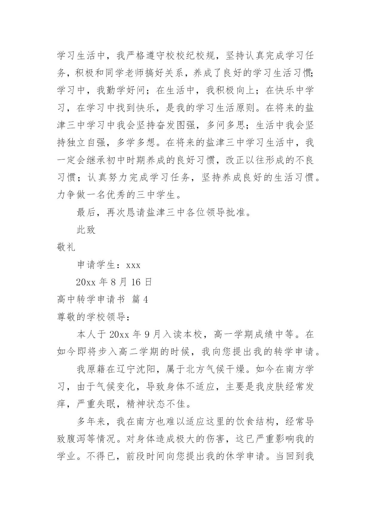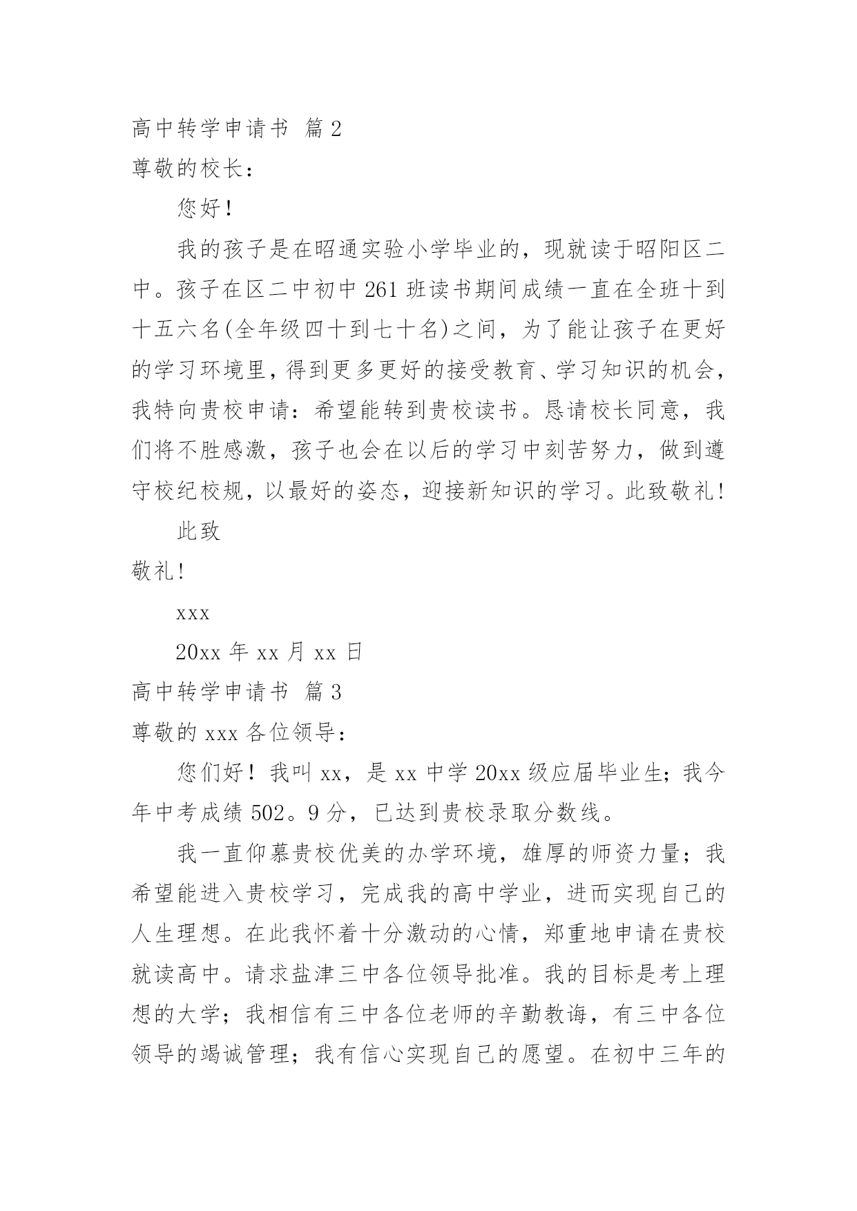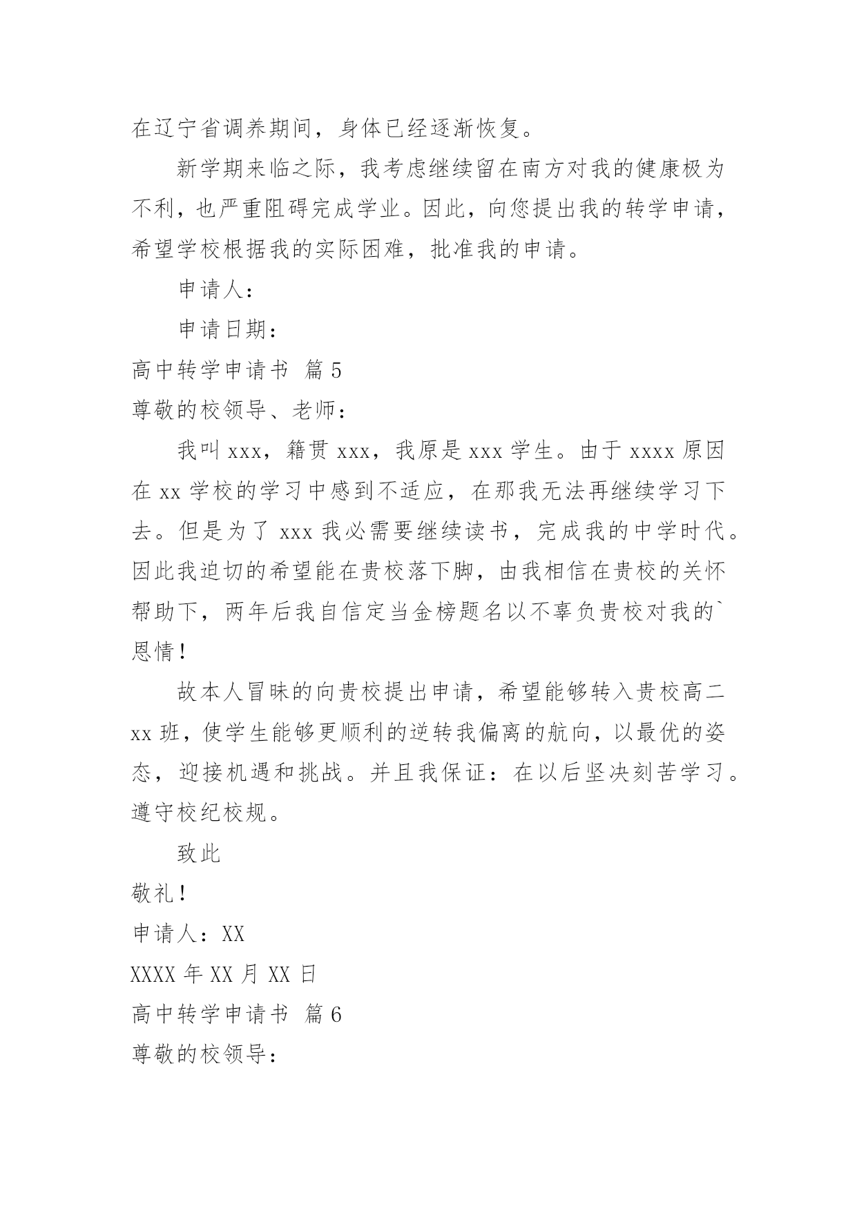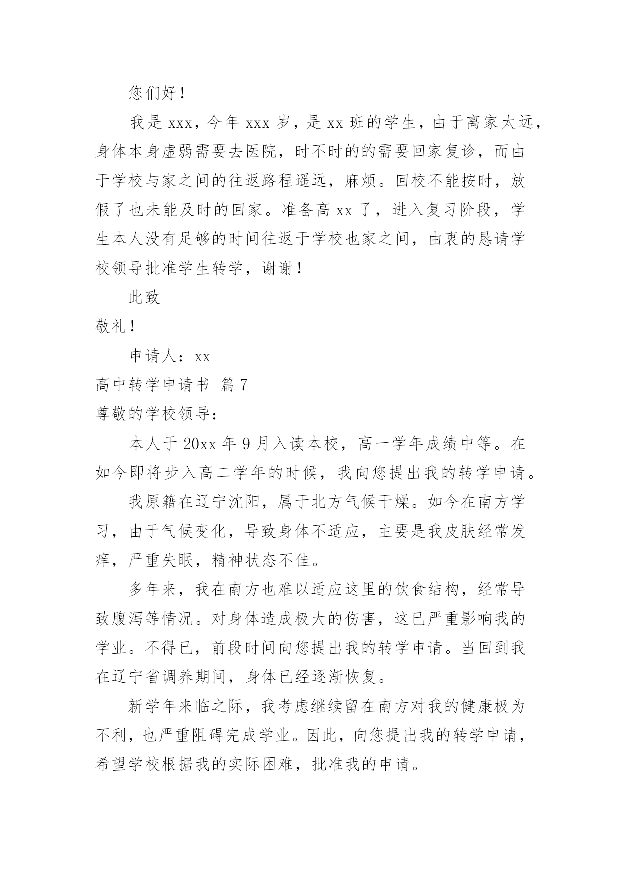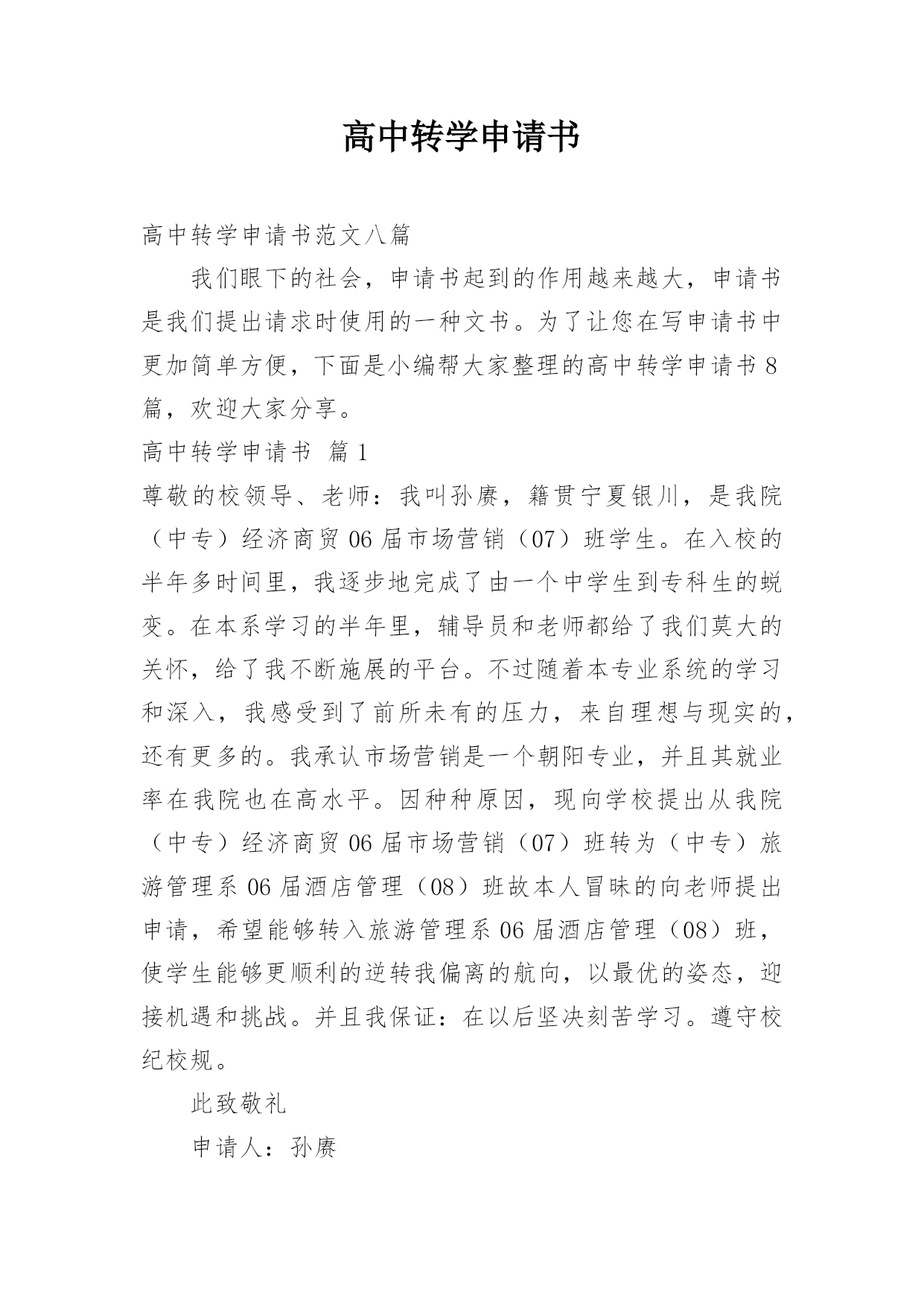 高中转学申请书 高中转学申请书范文八篇我们眼下的社会,申请书起到的作用越来越大,申请书是我们提出请求时使用的一种文书。为了让您在写申请书中更加简单方便,下面是小编帮大家整理的高中转学申请书8篇,欢迎大家分享。高中转学申请书篇1尊敬的校领导、老师:我叫孙赓,籍贯宁夏银川,是我院(中专)经济商贸06届市场营销(07)班学生。在入校的半年多时间里,我逐步地完成了由一个中学生到专科生的蜕变。在本系学习的半年里,辅导员和老师都给了我们莫大的关怀,给了我不断施展的平台。不过随着本专业系统的学习和深入,我感受到了前所未有的压力,来自理想与现实的,还有更多的。我承认市场营销是一个朝阳专业,并且其就业率在我院也在高水平。因种种原因,现向学校提出从我院(中专)经济商贸06届市场营销(07)班转为(中专)旅游管理系06届酒店管理(08)班故本人冒昧的向老师提出申请,希望能够转入旅游管理系06届酒店管理(08)班,使学生能够更顺利的逆转我偏离的航向,以最优的姿态,迎接机遇和挑战。并且我保证:在以后坚决刻苦学习。遵守校纪校规。此致敬礼申请人:孙赓高中转学申请书篇2尊敬的校长:您好!我的孩子是在昭通实验小学毕业的,现就读于昭阳区二中。孩子在区二中初中261班读书期间成绩一直在全班十到十五六名(全年级四十到七十名)之间,为了能让孩子在更好的学习环境里,得到更多更好的接受教育、学习知识的机会,我特向贵校申请:希望能转到贵校读书。恳请校长同意,我们将不胜感激,孩子也会在以后的学习中刻苦努力,做到遵守校纪校规,以最好的姿态,迎接新知识的学习。此致敬礼!此致敬礼!xxx20xx年xx月xx日高中转学申请书篇3尊敬的xxx各位领导:您们好!我叫xx,是xx中学20xx级应届毕业生;我今年中考成绩502。9分,已达到贵校录取分数线。我一直仰慕贵校优美的办学环境,雄厚的师资力量;我希望能进入贵校学习,完成我的高中学业,进而实现自己的人生理想。在此我怀着十分激动的心情,郑重地申请在贵校就读高中。请求盐津三中各位领导批准。我的目标是考上理想的大学;我相信有三中各位老师的辛勤教诲,有三中各位领导的竭诚管理;我有信心实现自己的愿望。在初中三年的学习生活中,我严格遵守校校纪校规,坚持认真完成学习任务,积极和同学老师搞好关系,养成了良好的学习生活习惯;学习中,我勤学好问;在生活中,我积极向上;在快乐中学习,在学习中找到快乐,是我的学习生活原则。在将来的盐津三中学习中我会坚持奋发图强,多问多思;生活中我会坚持独立自强,多学多想。在将来的盐津三中学习生活中,我一定会继承初中时期养成的良好习惯,改正以往形成的不良习惯;认真努力完成学习任务,坚持养成良好的生活习惯。力争做一名优秀的三中学生。最后,再次恳请盐津三中各位领导批准。此致敬礼申请学生:xxx20xx年8月16日高中转学申请书篇4尊敬的学校领导:本人于20xx年9月入读本校,高一学期成绩中等。在如今即将步入高二学期的时候,我向您提出我的转学申请。我原籍在辽宁沈阳,属于北方气候干燥。如今在南方学习,由于气候变化,导致身体不适应,主要是我皮肤经常发痒,严重失眠,精神状态不佳。多年来,我在南方也难以适应这里的饮食结构,经常导致腹泻等情况。对身体造成极大的伤害,这已严重影响我的学业。不得已,前段时间向您提出我的休学申请。当回到我在辽宁省调养期间,身体已经逐渐恢复。新学期来临之际,我考虑继续留在南方对我的健康极为不利,也严重阻碍完成学业。因此,向您提出我的转学申请,希望学校根据我的实际困难,批准我的申请。申请人:申请日期:高中转学申请书篇5尊敬的校领导、老师:我叫xxx,籍贯xxx,我原是xxx学生。由于xxxx原因在xx学校的学习中感到不适应,在那我无法再继续学习下去。但是为了xxx我必需要继续读书,完成我的中学时代。因此我迫切的希望能在贵校落下脚,由我相信在贵校的关怀帮助下,两年后我自信定当金榜题名以不辜负贵校对我的`恩情!故本人冒昧的向贵校提出申请,希望能够转入贵校高二xx班,使学生能够更顺利的逆转我偏离的航向,以最优的姿态,迎接机遇和挑战。并且我保证:在以后坚决刻苦学习。遵守校纪校规。致此敬礼!申请人:XXXXXX年XX月XX日高中转学申请书篇6尊敬的校领导:您们好!我是xxx,今年xxx岁,是xx班的学生,由于离家太远,身体本身虚弱需要去医院,时不时的的需要回家复诊,而由于学校与家之间的往返路程遥远,麻烦。回校不能按时,放假了也未能及时的回家。准备高xx了,进入复习阶段,学生本人没有足够的时间往返于学校也家之间,由衷的恳请学校领导批准学生转学,谢谢!此致敬礼!申请人:xx高中转学申请书篇7尊敬的学校领导:本人于20xx年9月入读本校,高一学年成绩中等。在如今即将步入高二学年的时候,我向您提出我的转学申请。我原籍在辽宁沈阳,属于北方