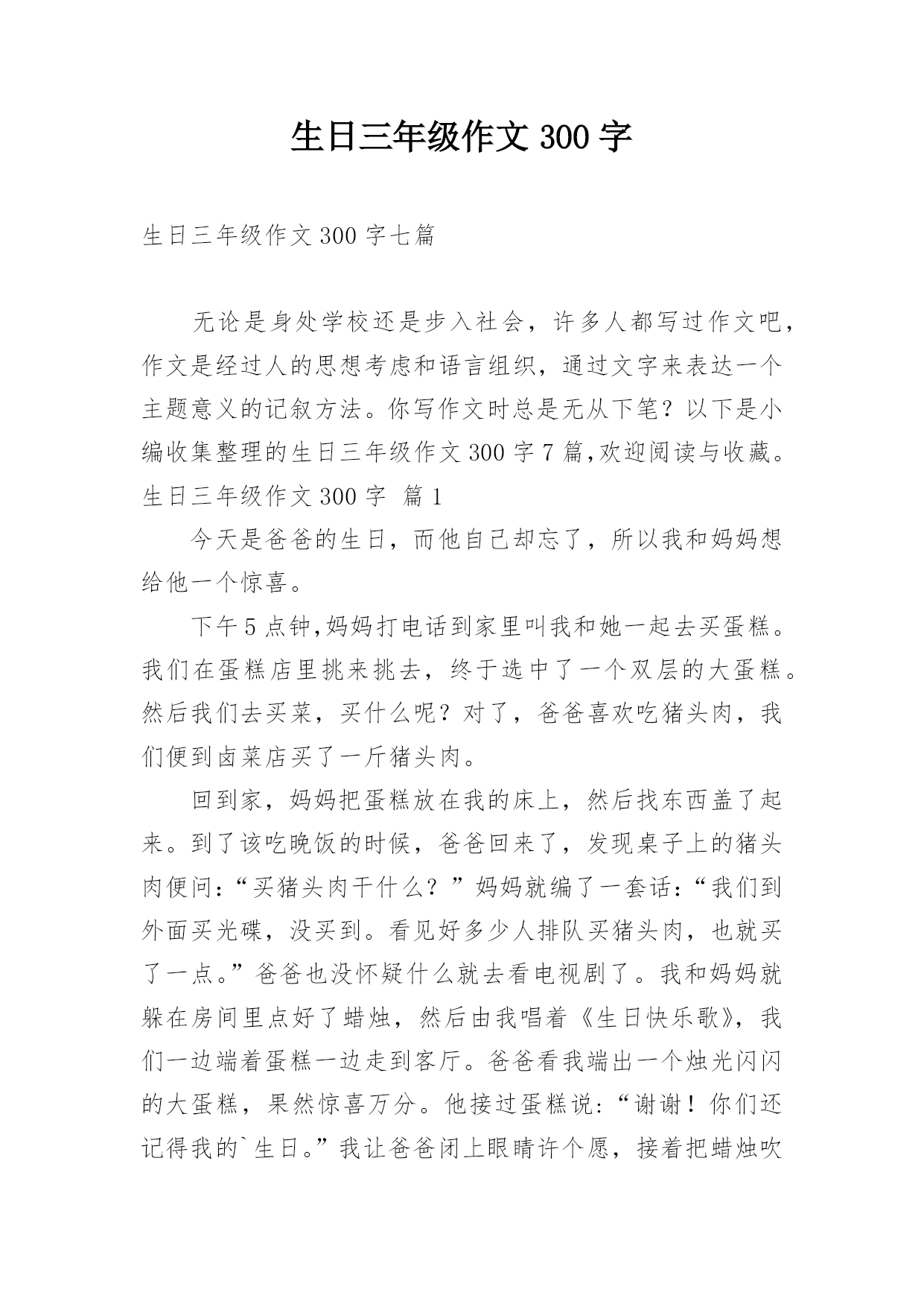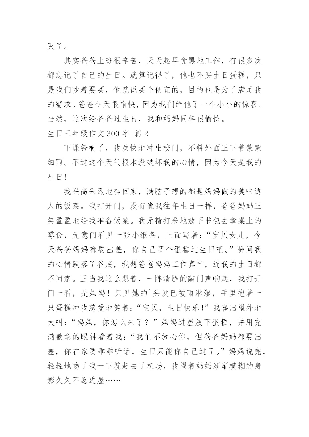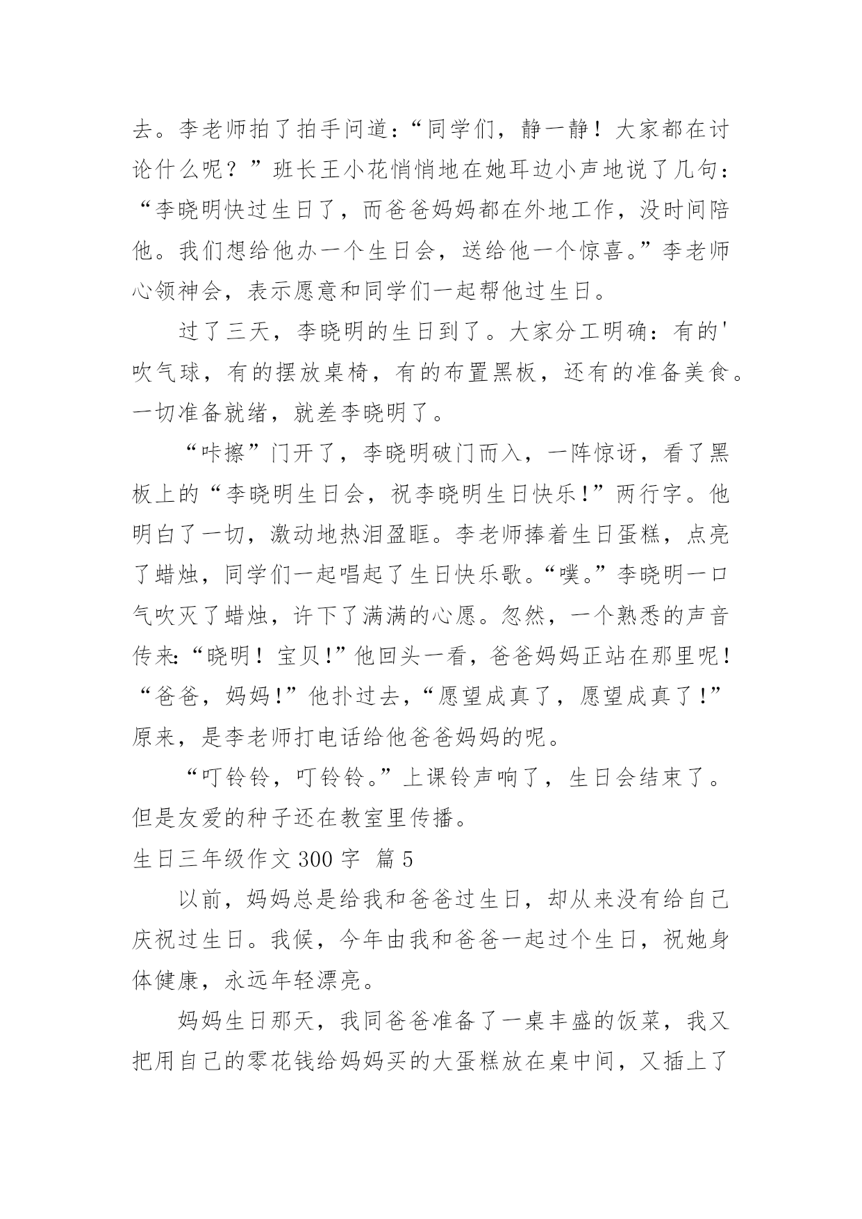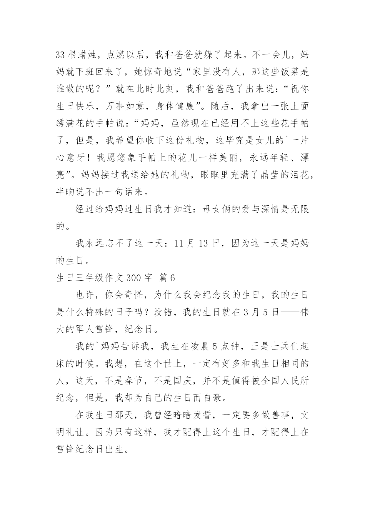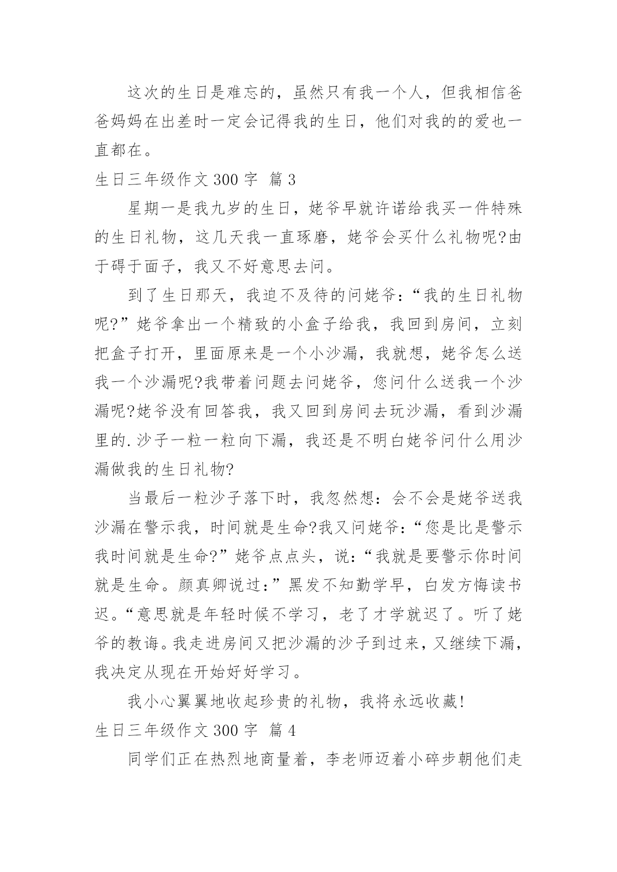 生日三年级作文300字 生日三年级作文300字七篇无论是身处学校还是步入社会,许多人都写过作文吧,作文是经过人的思想考虑和语言组织,通过文字来表达一个主题意义的记叙方法。你写作文时总是无从下笔?以下是小编收集整理的生日三年级作文300字7篇,欢迎阅读与收藏。生日三年级作文300字篇1今天是爸爸的生日,而他自己却忘了,所以我和妈妈想给他一个惊喜。下午5点钟,妈妈打电话到家里叫我和她一起去买蛋糕。我们在蛋糕店里挑来挑去,终于选中了一个双层的大蛋糕。然后我们去买菜,买什么呢?对了,爸爸喜欢吃猪头肉,我们便到卤菜店买了一斤猪头肉。回到家,妈妈把蛋糕放在我的床上,然后找东西盖了起来。到了该吃晚饭的时候,爸爸回来了,发现桌子上的猪头肉便问:“买猪头肉干什么?”妈妈就编了一套话:“我们到外面买光碟,没买到。看见好多少人排队买猪头肉,也就买了一点。”爸爸也没怀疑什么就去看电视剧了。我和妈妈就躲在房间里点好了蜡烛,然后由我唱着《生日快乐歌》,我们一边端着蛋糕一边走到客厅。爸爸看我端出一个烛光闪闪的大蛋糕,果然惊喜万分。他接过蛋糕说:“谢谢!你们还记得我的`生日。”我让爸爸闭上眼睛许个愿,接着把蜡烛吹灭了。其实爸爸上班很辛苦,天天起早贪黑地工作,有很多次都忘记了自己的生日。就算记得了,他也不买生日蛋糕,只是我们吵着要买,他就说买个便宜的,目的也是为了满足我的需求。爸爸今天很愉快,因为我们给他了一个小小的惊喜。当然,这次给爸爸过生日,我和妈妈同样很愉快。生日三年级作文300字篇2下课铃响了,我欢快地冲出校门,不料外面正下着蒙蒙细雨。不过这个天气根本没破坏我的心情,因为今天是我的生日!我兴高采烈地奔回家,满脑子想的都是妈妈做的美味诱人的饭菜。我打开门,没有像我往年生日一样,爸爸妈妈正笑盈盈地给我准备饭菜。我无精打采地放下书包去拿桌上的零食,无意间看见一张小纸条,上面写着:“宝贝女儿,今天爸爸妈妈都要出差,你自己买个蛋糕过生日吧。”瞬间我的心情跌落了谷底,我想爸爸妈妈工作真忙,连我的生日都不回家。正当我这么想着,一阵清脆的敲门声响起,我打开门一看,是妈妈!只见她的`头发已被雨淋湿,手里抱着一只蛋糕冲我慈爱地笑着:“宝贝,生日快乐!”我喜出望外地大叫:“妈妈,你怎么来了?”妈妈进屋放下蛋糕,并用充满歉意的眼神看着我:“我们不放心你,但爸爸妈妈都要出差,你在家要乖乖听话,生日只能你自己过了。”妈妈说完,轻轻地吻了我一下就赶去了机场,我望着妈妈渐渐模糊的身影久久不愿进屋……这次的生日是难忘的,虽然只有我一个人,但我相信爸爸妈妈在出差时一定会记得我的生日,他们对我的的爱也一直都在。生日三年级作文300字篇3星期一是我九岁的生日,姥爷早就许诺给我买一件特殊的生日礼物,这几天我一直琢磨,姥爷会买什么礼物呢?由于碍于面子,我又不好意思去问。到了生日那天,我迫不及待的问姥爷:“我的生日礼物呢?”姥爷拿出一个精致的小盒子给我,我回到房间,立刻把盒子打开,里面原来是一个小沙漏,我就想,姥爷怎么送我一个沙漏呢?我带着问题去问姥爷,您问什么送我一个沙漏呢?姥爷没有回答我,我又回到房间去玩沙漏,看到沙漏里的.沙子一粒一粒向下漏,我还是不明白姥爷问什么用沙漏做我的生日礼物?当最后一粒沙子落下时,我忽然想:会不会是姥爷送我沙漏在警示我,时间就是生命?我又问姥爷:“您是比是警示我时间就是生命?”姥爷点点头,说:“我就是要警示你时间就是生命。颜真卿说过:”黑发不知勤学早,白发方悔读书迟。“意思就是年轻时候不学习,老了才学就迟了。听了姥爷的教诲。我走进房间又把沙漏的沙子到过来,又继续下漏,我决定从现在开始好好学习。我小心翼翼地收起珍贵的礼物,我将永远收藏!生日三年级作文300字篇4同学们正在热烈地商量着,李老师迈着小碎步朝他们走去。李老师拍了拍手问道:“同学们,静一静!大家都在讨论什么呢?”班长王小花悄悄地在她耳边小声地说了几句:“李晓明快过生日了,而爸爸妈妈都在外地工作,没时间陪他。我们想给他办一个生日会,送给他一个惊喜。”李老师心领神会,表示愿意和同学们一起帮他过生日。过了三天,李晓明的生日到了。大家分工明确:有的'吹气球,有的摆放桌椅,有的布置黑板,还有的准备美食。一切准备就绪,就差李晓明了。“咔擦”门开了,李晓明破门而入,一阵惊讶,看了黑板上的“李晓明生日会,祝李晓明生日快乐!”两行字。他明白了一切,激动地热泪盈眶。李老师捧着生日蛋糕,点亮了蜡烛,同学们一起唱起了生日快乐歌。“噗。”李晓明一口气吹灭了蜡烛,许下了满满的心愿。忽然,一个熟悉的声音传来:“晓明!宝贝!”他回头一看,爸爸妈妈正站在那里呢!“爸爸,妈妈!”他扑过去,“愿望成真了,愿望成真了!”原来,是李老师打电话给他爸爸妈妈的呢。“叮铃铃,叮铃铃。”上课铃声响了,生日会结束了。但是友爱的种子还在教室里传播。生日三年级作