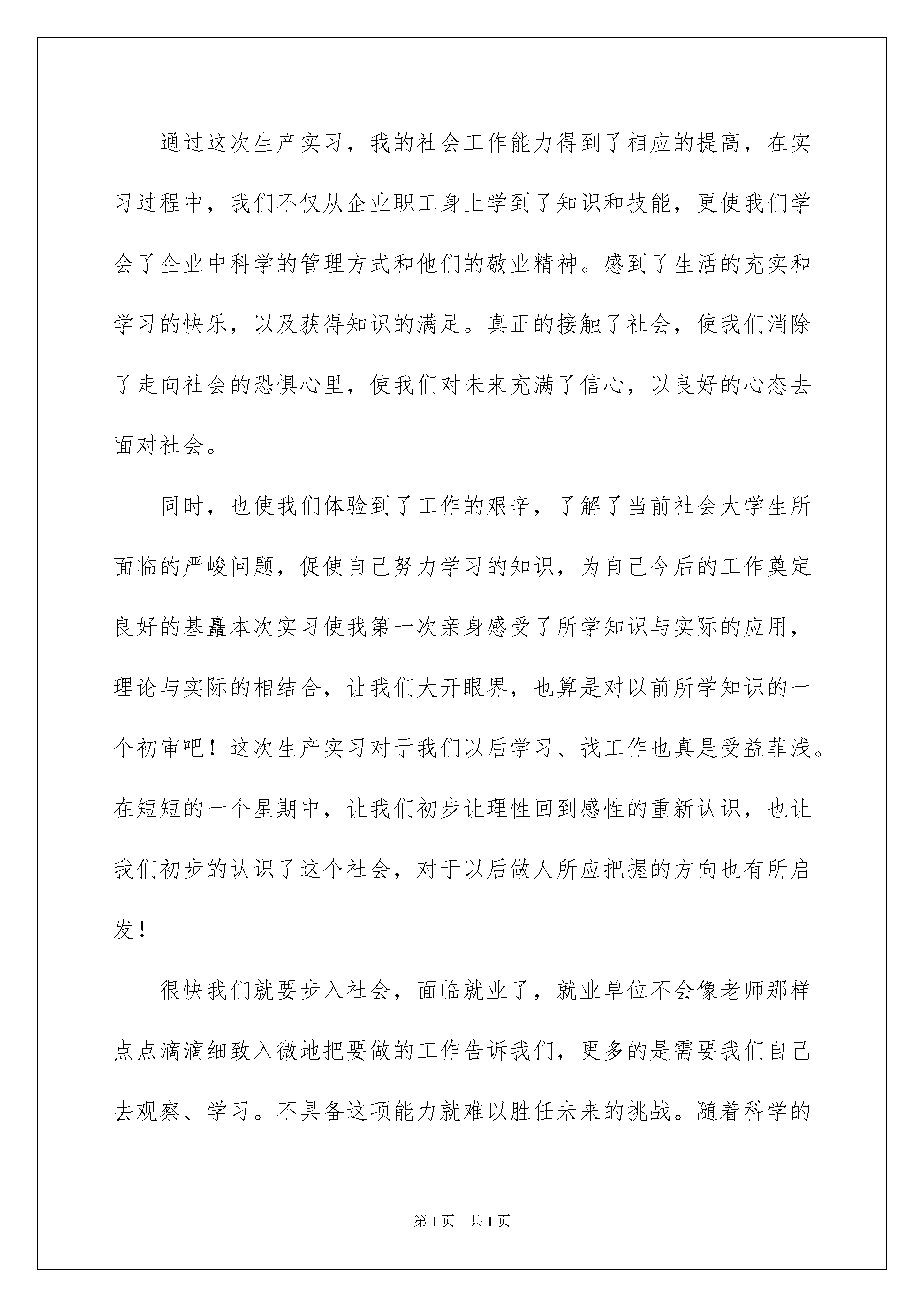 2022生产实习总结800字(通用5篇)生产实习总结800字(通用5篇)紧张又充实的实习生活又将谢下帷幕,你梳理过这段时间的实习生活吗?让我们好好总结一下,写一份实习总结吧。那么实习总结怎么写才能发挥它最大的作用呢?下面是我整理的生产实习总结800字(通用5篇),欢迎阅读,希望大家能够喜欢。生产实习总结1一周的生产实习对我来说,好处颇深!使我不仅仅熟悉了公司产品的生产流程,更让我体验到现代化作业的高效、快捷,尤其是公司良好的工作氛围,对我的人生观、价值观都产生了必须影响。在这短短地紧张而又繁忙的一周里,我学会了许多从未接触过的东西,受益匪浅!一、现代化作业手段一台台包装好了的产品不断的向外运送,送去的不单单是经过了千万道工序以后的产品,更是一种现代科技力量的凝练!从材料的采购、检验、测试,再到产品的装配、加工,到最终的整机调试、包装等,每一个环节都做的滴水不漏,不光有严密、科学的工艺流程,更有技艺精湛的技术人员的操作,不论是硬件的设施、设备,还是软件的技术力量,都体现了信息时代下的现代化作业的方式、方法,给企业带来了前所未有的经济效益。二、对产品的深刻认识虽然穿梭于繁忙而有序的生产车间的时间不是很长,但经过自我的多问、多动手、亲体验,在短短的一周里,使自我对公司的产品有了质的认识。不仅仅明白了产品的分类、系列、规格型号、作用特点及广泛的应用领域,并且掌握了变频器、起动器的工艺流程,还亲自操作了变频器的整个成产过程,加深了对产品的进一步的理解和认识。三、良好的工作氛围走进车间的那一刻,我被整个工作的场面震撼了,眼前的一切并非我想像的那样糟糕,整洁的工作环境;井然有序的设施、设备;忙碌而又节奏的身影,这一切使我摒弃了以前对车间那种凌乱不堪的印象。人与人配合的那种默契,并非每个公司都会具有的;人们之间团结协作的精神,使工作顺利的进展;互帮互助的良好作风,使人感到工作的简单和愉快。在那里,我学会了与人合作,工作要认真细心、负职责。四、自我认识的改变在装配过程中,小到拧紧每一个螺丝钉,大到整台机器的组装,每一个小细节的不慎都可能会造成最终调试的不成功,即就是产品不合格。这就要求我们每一个操作人员在工作中务必持续清醒的头脑,注意力高度集中,并且留意谨慎地做好每项工作,方能使大家的心血不付诸东流,不合格的产品进行返工胜过再次生产机器的功夫,所以,务必保证每个细节尽量完美无缺陷,否则,会给公司的经济效益造成必须影响。所以,我明白了,凡事都要心细,尽职尽责,尽善尽美。没有,但求更好,无论是在生活还是工作中,我们都要脚踏实际,一步一个脚印,稳扎稳打,不要眼高手低,好高骛远,否则,即使象上螺丝钉这么个小事,也未必做的漂亮。其实,人的一生也像一台机器的生成一样,人生的每一个阶段都要用心去经营,一招不慎,步步错,要想拥有一个成功的,有为的人生,就要像组装一台机器那样,认真、踏实、大胆、执着。生产实习总结2通过这次生产实习,我的社会工作能力得到了相应的提高,在实习过程中,我们不仅从企业职工身上学到了知识和技能,更使我们学会了企业中科学的管理方式和他们的敬业精神。感到了生活的充实和学习的快乐,以及获得知识的满足。真正的接触了社会,使我们消除了走向社会的恐惧心里,使我们对未来充满了信心,以良好的心态去面对社会。同时,也使我们体验到了工作的艰辛,了解了当前社会大学生所面临的严峻问题,促使自己努力学习的知识,为自己今后的工作奠定良好的基矗本次实习使我第一次亲身感受了所学知识与实际的应用,理论与实际的相结合,让我们大开眼界,也算是对以前所学知识的一个初审吧!这次生产实习对于我们以后学习、找工作也真是受益菲浅。在短短的一个星期中,让我们初步让理性回到感性的重新认识,也让我们初步的认识了这个社会,对于以后做人所应把握的方向也有所启发!很快我们就要步入社会,面临就业了,就业单位不会像老师那样点点滴滴细致入微地把要做的工作告诉我们,更多的是需要我们自己去观察、学习。不具备这项能力就难以胜任未来的挑战。随着科学的迅猛发展,新技术的广泛应用,会有很多领域是我们未曾接触过的,只有敢于去尝试才能有所突破,有所创新。就像我们接触到的车工,虽然它的危险性很大,但是要求每个同学都要去操作而且要做出成品,这样就锻炼了大家敢于尝试的勇气。三周的生产实习带给我们的,不全是我们所接触到的那些操作技能,也不仅仅是通过几项工种所要求我们锻炼的几种能力,更多的则需要我们每个人在实习结束后根据自己的情况去感悟,去反思,勤时自勉,有所收获,使这次实习达到了他的真正目的。在忙忙碌碌并在企业中师傅的精心指导和严格要求下,本次实习才得顺利结束。在整个生产