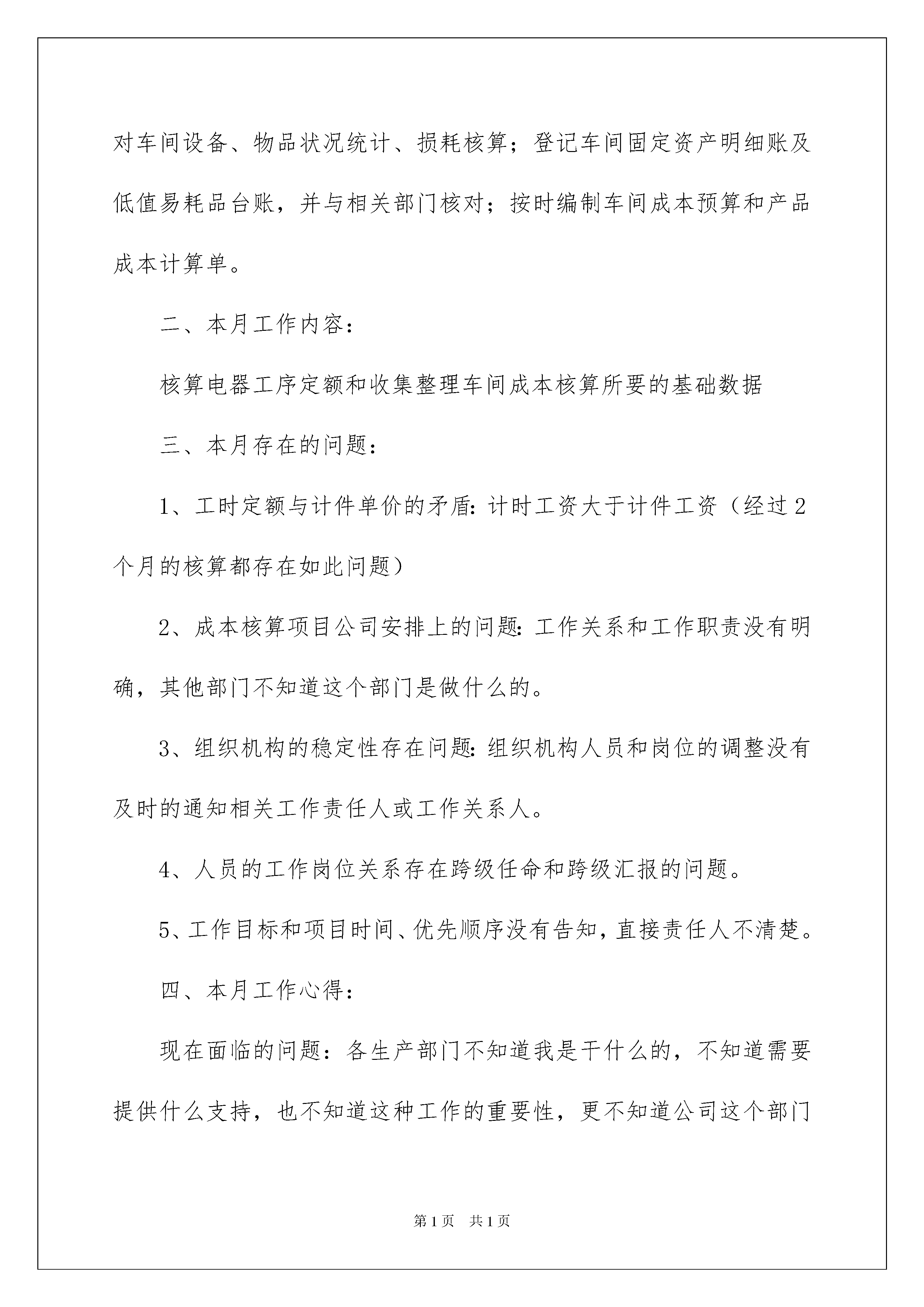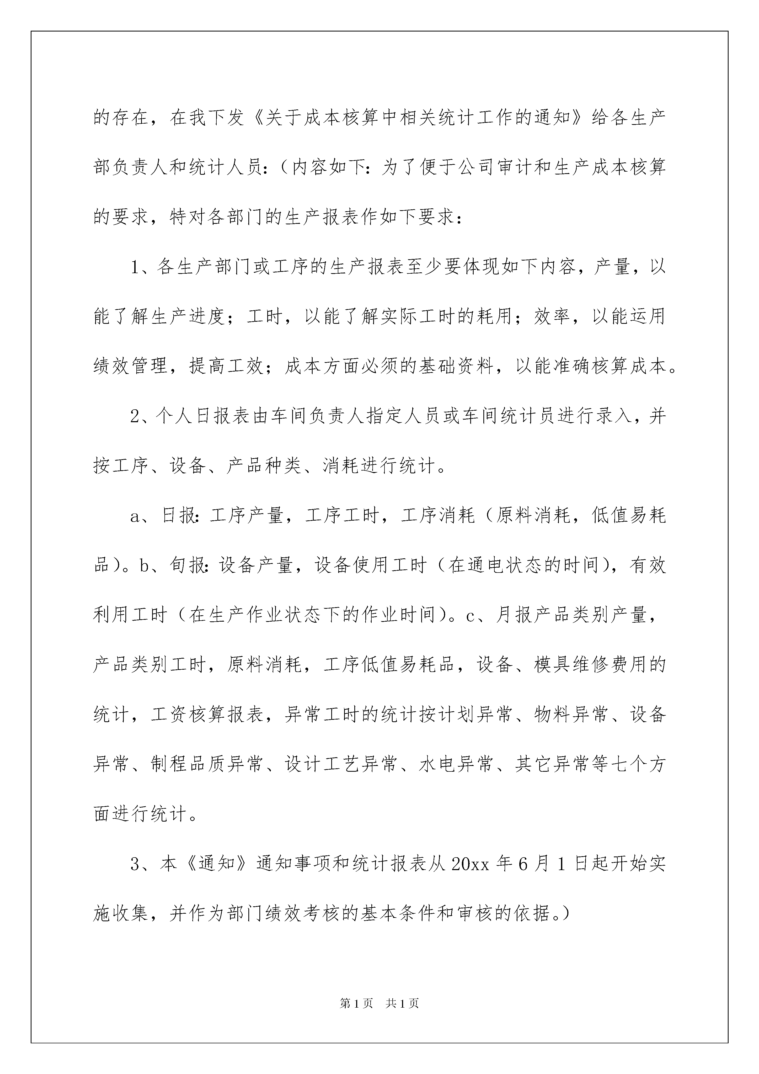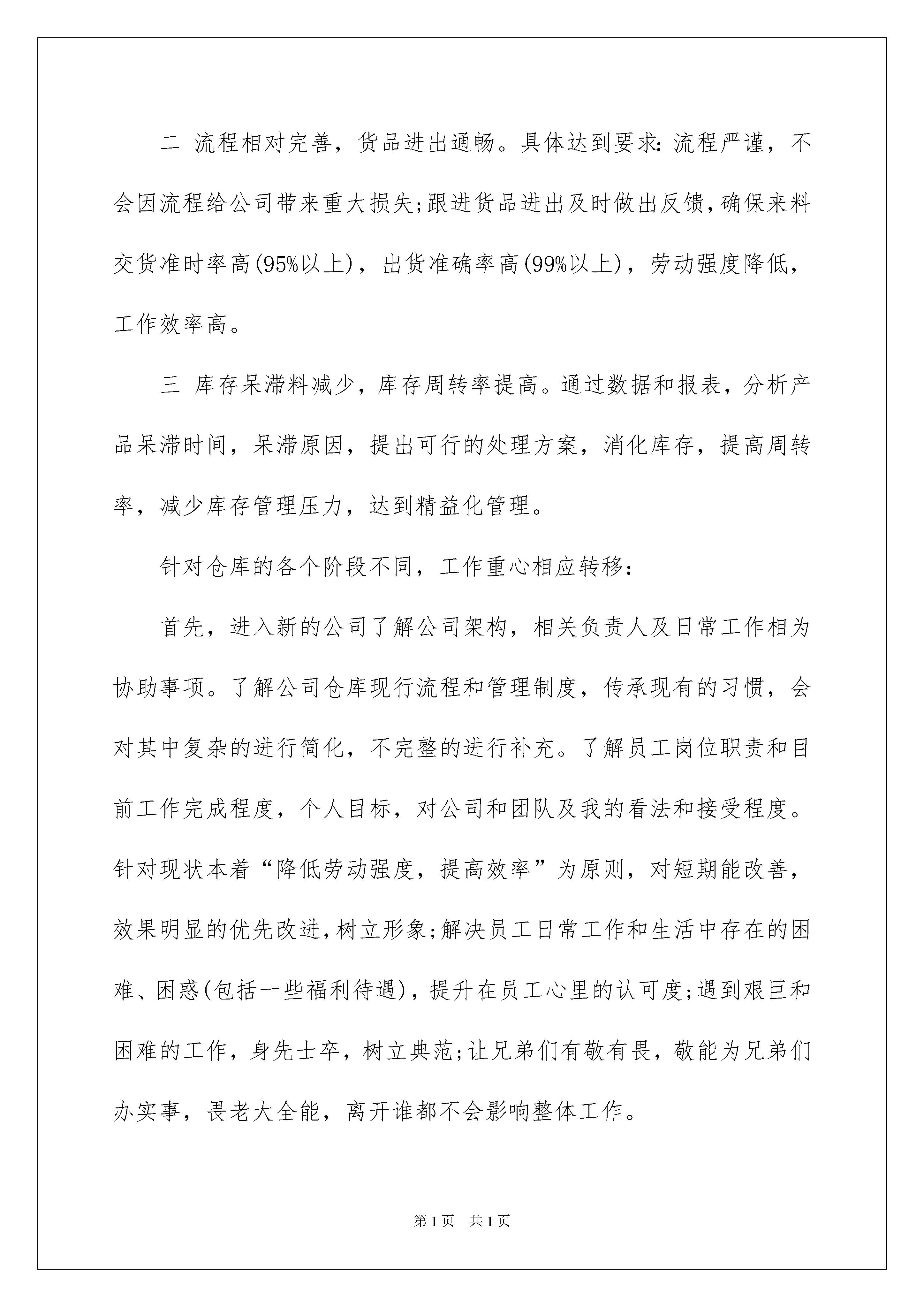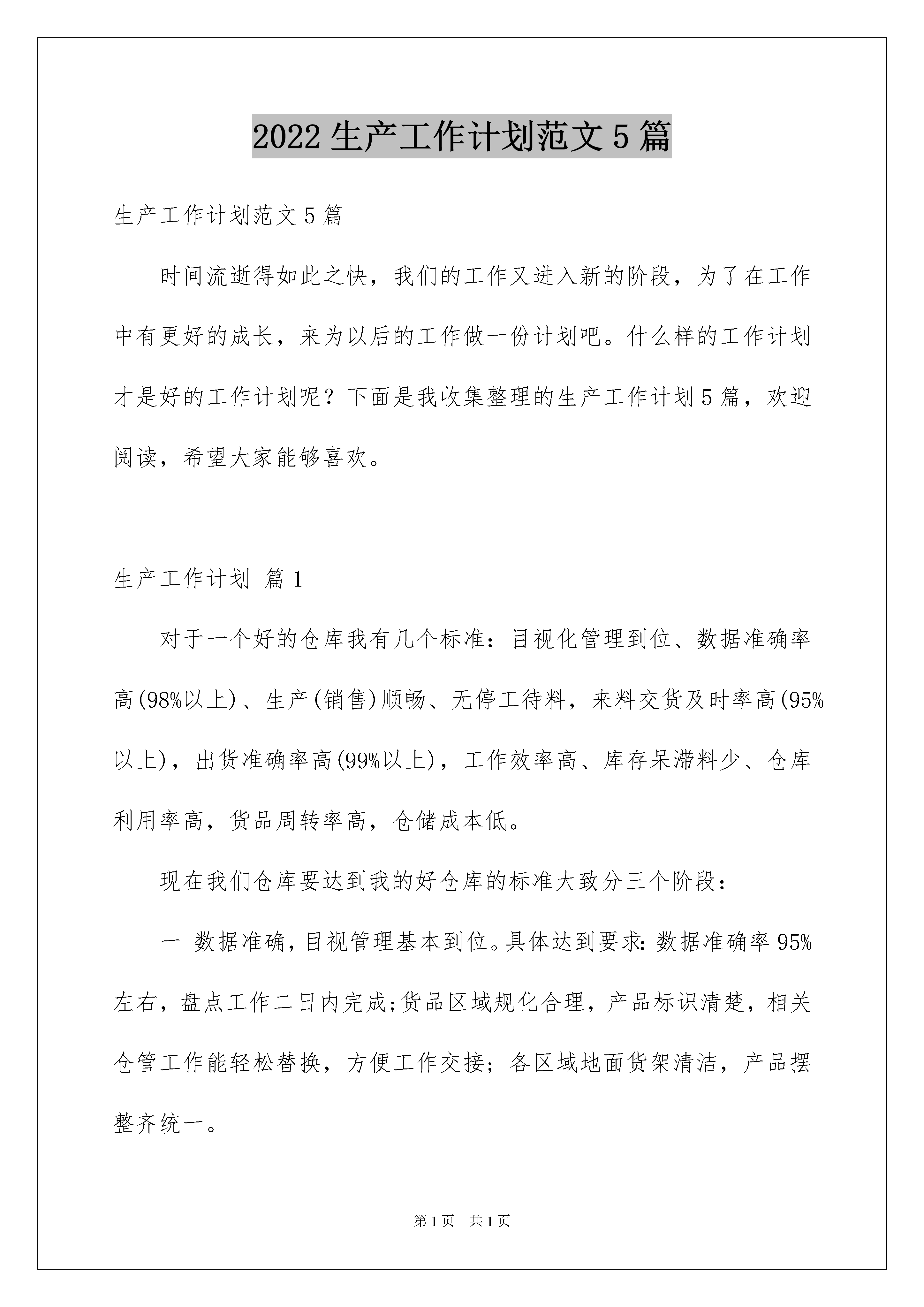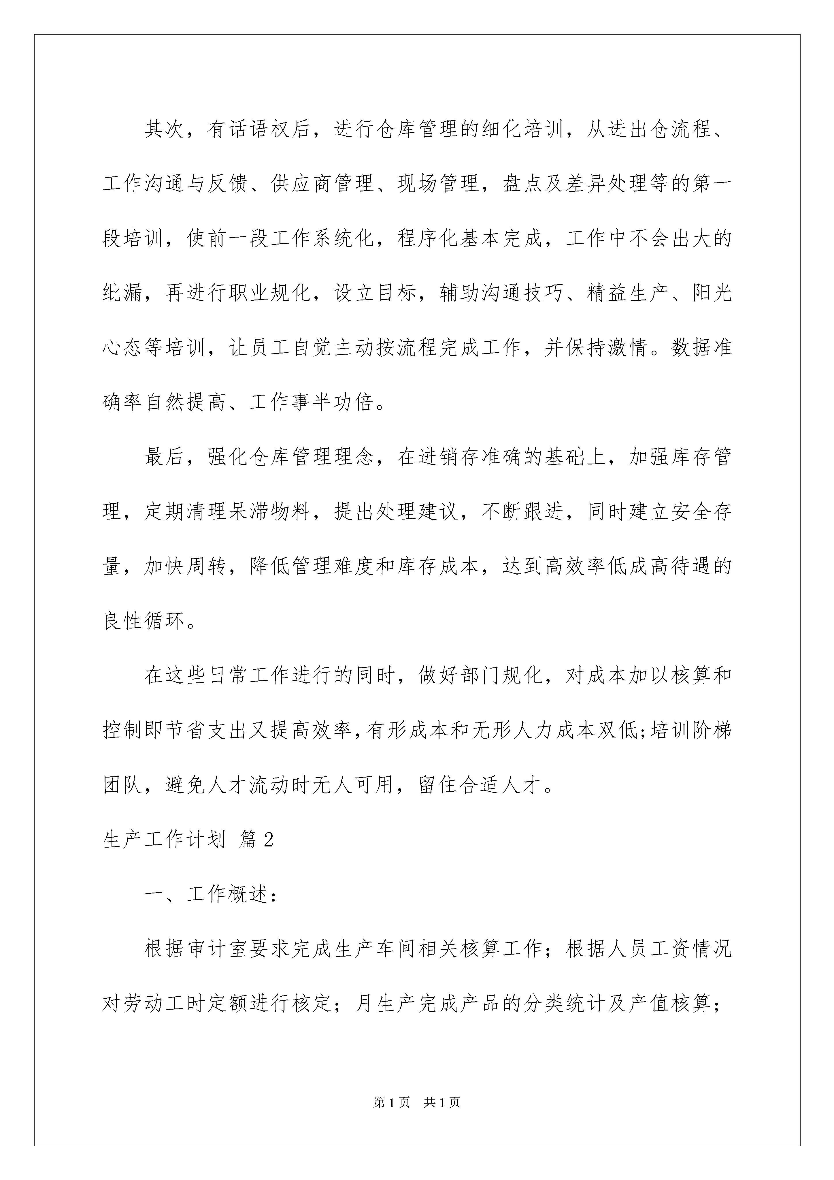 2022生产工作计划范文5篇生产工作计划范文5篇时间流逝得如此之快,我们的工作又进入新的阶段,为了在工作中有更好的成长,来为以后的工作做一份计划吧。什么样的工作计划才是好的工作计划呢?下面是我收集整理的生产工作计划5篇,欢迎阅读,希望大家能够喜欢。生产工作计划篇1对于一个好的仓库我有几个标准:目视化管理到位、数据准确率高(98%以上)、生产(销售)顺畅、无停工待料,来料交货及时率高(95%以上),出货准确率高(99%以上),工作效率高、库存呆滞料少、仓库利用率高,货品周转率高,仓储成本低。现在我们仓库要达到我的好仓库的标准大致分三个阶段:一数据准确,目视管理基本到位。具体达到要求:数据准确率95%左右,盘点工作二日内完成;货品区域规化合理,产品标识清楚,相关仓管工作能轻松替换,方便工作交接;各区域地面货架清洁,产品摆整齐统一。二流程相对完善,货品进出通畅。具体达到要求:流程严谨,不会因流程给公司带来重大损失;跟进货品进出及时做出反馈,确保来料交货准时率高(95%以上),出货准确率高(99%以上),劳动强度降低,工作效率高。三库存呆滞料减少,库存周转率提高。通过数据和报表,分析产品呆滞时间,呆滞原因,提出可行的处理方案,消化库存,提高周转率,减少库存管理压力,达到精益化管理。针对仓库的各个阶段不同,工作重心相应转移:首先,进入新的公司了解公司架构,相关负责人及日常工作相为协助事项。了解公司仓库现行流程和管理制度,传承现有的习惯,会对其中复杂的进行简化,不完整的进行补充。了解员工岗位职责和目前工作完成程度,个人目标,对公司和团队及我的看法和接受程度。针对现状本着“降低劳动强度,提高效率”为原则,对短期能改善,效果明显的优先改进,树立形象;解决员工日常工作和生活中存在的困难、困惑(包括一些福利待遇),提升在员工心里的认可度;遇到艰巨和困难的工作,身先士卒,树立典范;让兄弟们有敬有畏,敬能为兄弟们办实事,畏老大全能,离开谁都不会影响整体工作。其次,有话语权后,进行仓库管理的细化培训,从进出仓流程、工作沟通与反馈、供应商管理、现场管理,盘点及差异处理等的第一段培训,使前一段工作系统化,程序化基本完成,工作中不会出大的纰漏,再进行职业规化,设立目标,辅助沟通技巧、精益生产、阳光心态等培训,让员工自觉主动按流程完成工作,并保持激情。数据准确率自然提高、工作事半功倍。最后,强化仓库管理理念,在进销存准确的基础上,加强库存管理,定期清理呆滞物料,提出处理建议,不断跟进,同时建立安全存量,加快周转,降低管理难度和库存成本,达到高效率低成高待遇的良性循环。在这些日常工作进行的同时,做好部门规化,对成本加以核算和控制即节省支出又提高效率,有形成本和无形人力成本双低;培训阶梯团队,避免人才流动时无人可用,留住合适人才。生产工作计划篇2一、工作概述:根据审计室要求完成生产车间相关核算工作;根据人员工资情况对劳动工时定额进行核定;月生产完成产品的分类统计及产值核算;对车间设备、物品状况统计、损耗核算;登记车间固定资产明细账及低值易耗品台账,并与相关部门核对;按时编制车间成本预算和产品成本计算单。二、本月工作内容:核算电器工序定额和收集整理车间成本核算所要的基础数据三、本月存在的问题:1、工时定额与计件单价的矛盾:计时工资大于计件工资(经过2个月的核算都存在如此问题)2、成本核算项目公司安排上的问题:工作关系和工作职责没有明确,其他部门不知道这个部门是做什么的。3、组织机构的稳定性存在问题:组织机构人员和岗位的调整没有及时的通知相关工作责任人或工作关系人。4、人员的工作岗位关系存在跨级任命和跨级汇报的问题。5、工作目标和项目时间、优先顺序没有告知,直接责任人不清楚。四、本月工作心得:现在面临的问题:各生产部门不知道我是干什么的,不知道需要提供什么支持,也不知道这种工作的重要性,更不知道公司这个部门的存在,在我下发《关于成本核算中相关统计工作的通知》给各生产部负责人和统计人员:(内容如下:为了便于公司审计和生产成本核算的要求,特对各部门的生产报表作如下要求:1、各生产部门或工序的生产报表至少要体现如下内容,产量,以能了解生产进度;工时,以能了解实际工时的耗用;效率,以能运用绩效管理,提高工效;成本方面必须的基础资料,以能准确核算成本。2、个人日报表由车间负责人指定人员或车间统计员进行录入,并按工序、设备、产品种类、消耗进行统计。a、日报:工序产量,工序工时,工序消耗(原料消耗,低值易耗品)。b、旬报:设备产量,设备使用工时(在通电状态的时间),有效利用工时(在生产作业状态下的作业时间)。c、月报产品类别产