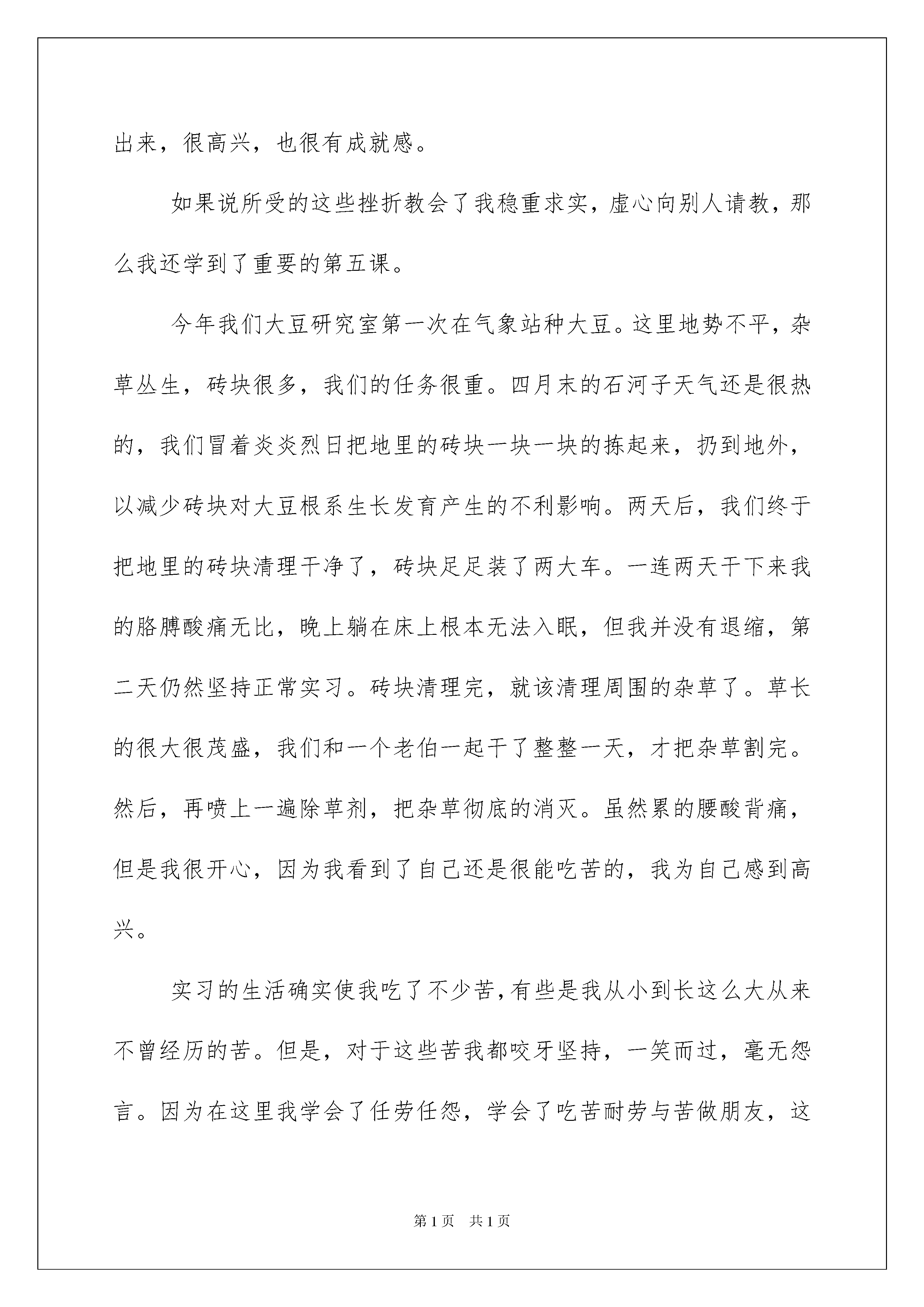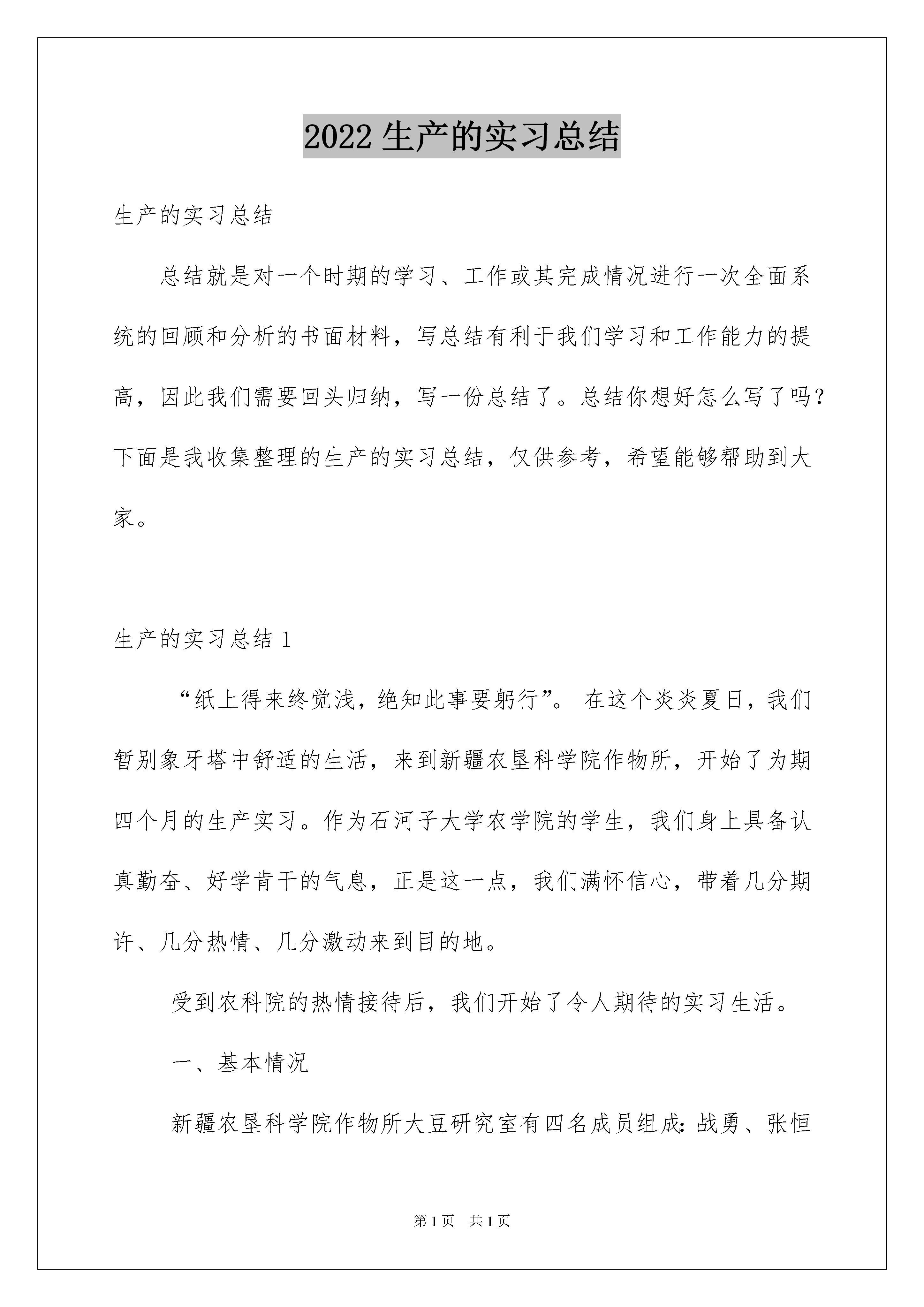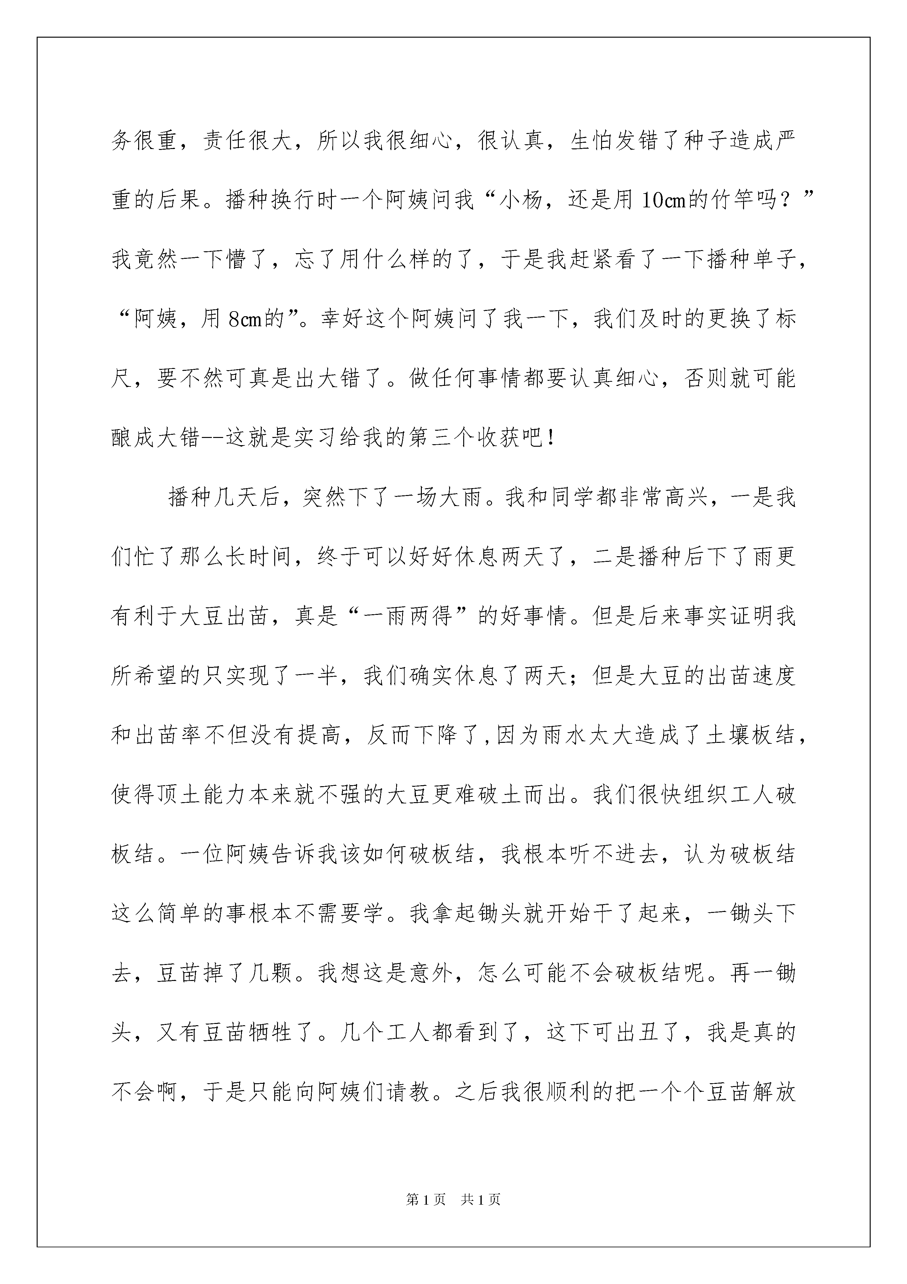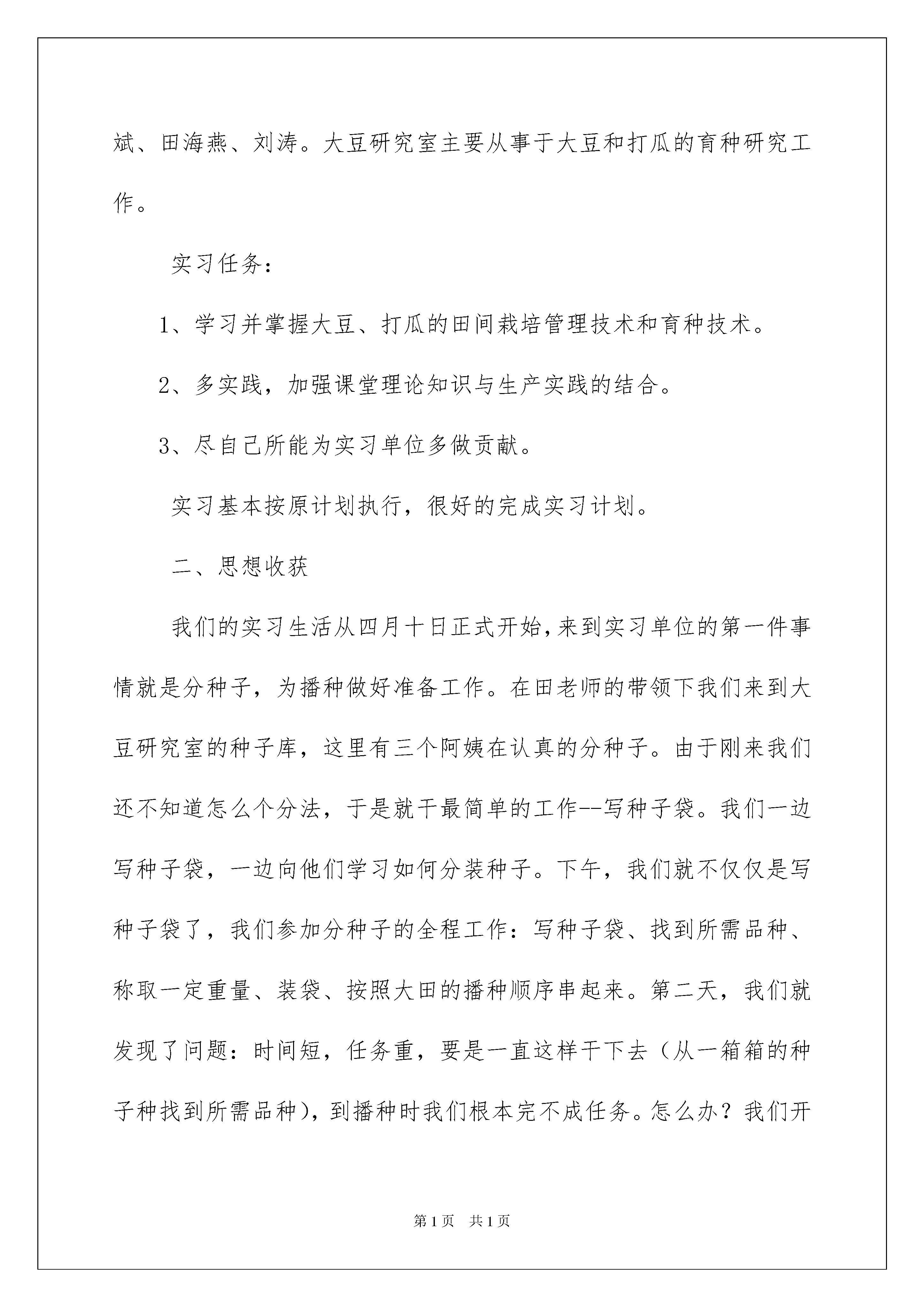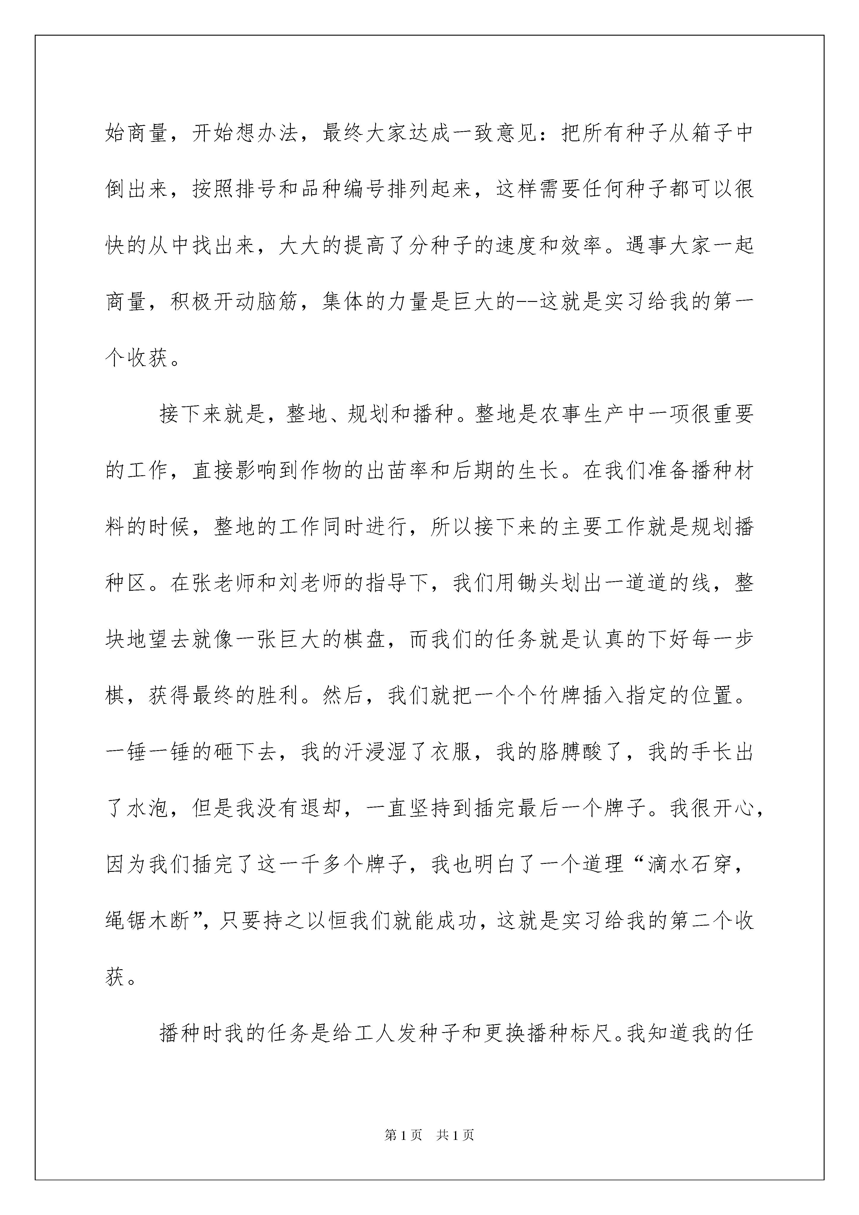 2022生产的实习总结生产的实习总结总结就是对一个时期的学习、工作或其完成情况进行一次全面系统的回顾和分析的书面材料,写总结有利于我们学习和工作能力的提高,因此我们需要回头归纳,写一份总结了。总结你想好怎么写了吗?下面是我收集整理的生产的实习总结,仅供参考,希望能够帮助到大家。生产的实习总结1“纸上得来终觉浅,绝知此事要躬行”。在这个炎炎夏日,我们暂别象牙塔中舒适的生活,来到新疆农垦科学院作物所,开始了为期四个月的生产实习。作为石河子大学农学院的学生,我们身上具备认真勤奋、好学肯干的气息,正是这一点,我们满怀信心,带着几分期许、几分热情、几分激动来到目的地。受到农科院的热情接待后,我们开始了令人期待的实习生活。一、基本情况新疆农垦科学院作物所大豆研究室有四名成员组成:战勇、张恒斌、田海燕、刘涛。大豆研究室主要从事于大豆和打瓜的育种研究工作。实习任务:1、学习并掌握大豆、打瓜的田间栽培管理技术和育种技术。2、多实践,加强课堂理论知识与生产实践的结合。3、尽自己所能为实习单位多做贡献。实习基本按原计划执行,很好的完成实习计划。二、思想收获我们的实习生活从四月十日正式开始,来到实习单位的第一件事情就是分种子,为播种做好准备工作。在田老师的带领下我们来到大豆研究室的种子库,这里有三个阿姨在认真的分种子。由于刚来我们还不知道怎么个分法,于是就干最简单的工作--写种子袋。我们一边写种子袋,一边向他们学习如何分装种子。下午,我们就不仅仅是写种子袋了,我们参加分种子的全程工作:写种子袋、找到所需品种、称取一定重量、装袋、按照大田的播种顺序串起来。第二天,我们就发现了问题:时间短,任务重,要是一直这样干下去(从一箱箱的种子种找到所需品种),到播种时我们根本完不成任务。怎么办?我们开始商量,开始想办法,最终大家达成一致意见:把所有种子从箱子中倒出来,按照排号和品种编号排列起来,这样需要任何种子都可以很快的从中找出来,大大的提高了分种子的速度和效率。遇事大家一起商量,积极开动脑筋,集体的力量是巨大的--这就是实习给我的第一个收获。接下来就是,整地、规划和播种。整地是农事生产中一项很重要的工作,直接影响到作物的出苗率和后期的生长。在我们准备播种材料的时候,整地的工作同时进行,所以接下来的主要工作就是规划播种区。在张老师和刘老师的指导下,我们用锄头划出一道道的线,整块地望去就像一张巨大的棋盘,而我们的任务就是认真的下好每一步棋,获得最终的胜利。然后,我们就把一个个竹牌插入指定的位置。一锤一锤的砸下去,我的汗浸湿了衣服,我的胳膊酸了,我的手长出了水泡,但是我没有退却,一直坚持到插完最后一个牌子。我很开心,因为我们插完了这一千多个牌子,我也明白了一个道理“滴水石穿,绳锯木断”,只要持之以恒我们就能成功,这就是实习给我的第二个收获。播种时我的任务是给工人发种子和更换播种标尺。我知道我的任务很重,责任很大,所以我很细心,很认真,生怕发错了种子造成严重的后果。播种换行时一个阿姨问我“小杨,还是用10㎝的竹竿吗?”我竟然一下懵了,忘了用什么样的了,于是我赶紧看了一下播种单子,“阿姨,用8㎝的”。幸好这个阿姨问了我一下,我们及时的更换了标尺,要不然可真是出大错了。做任何事情都要认真细心,否则就可能酿成大错--这就是实习给我的第三个收获吧!播种几天后,突然下了一场大雨。我和同学都非常高兴,一是我们忙了那么长时间,终于可以好好休息两天了,二是播种后下了雨更有利于大豆出苗,真是“一雨两得”的好事情。但是后来事实证明我所希望的只实现了一半,我们确实休息了两天;但是大豆的出苗速度和出苗率不但没有提高,反而下降了,因为雨水太大造成了土壤板结,使得顶土能力本来就不强的大豆更难破土而出。我们很快组织工人破板结。一位阿姨告诉我该如何破板结,我根本听不进去,认为破板结这么简单的事根本不需要学。我拿起锄头就开始干了起来,一锄头下去,豆苗掉了几颗。我想这是意外,怎么可能不会破板结呢。再一锄头,又有豆苗牺牲了。几个工人都看到了,这下可出丑了,我是真的不会啊,于是只能向阿姨们请教。之后我很顺利的把一个个豆苗解放出来,很高兴,也很有成就感。如果说所受的这些挫折教会了我稳重求实,虚心向别人请教,那么我还学到了重要的第五课。今年我们大豆研究室第一次在气象站种大豆。这里地势不平,杂草丛生,砖块很多,我们的任务很重。四月末的石河子天气还是很热的,我们冒着炎炎烈日把地里的砖块一块一块的拣起来,扔到地外,以减少砖块对大豆根系生长发育产生的不利影响。两天后,我们终于把地里的砖块清理干净了,砖块足足装了两大车。一连两天干下来我的胳膊酸痛无比,晚上躺在床上根