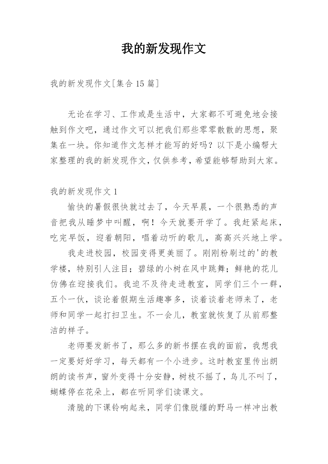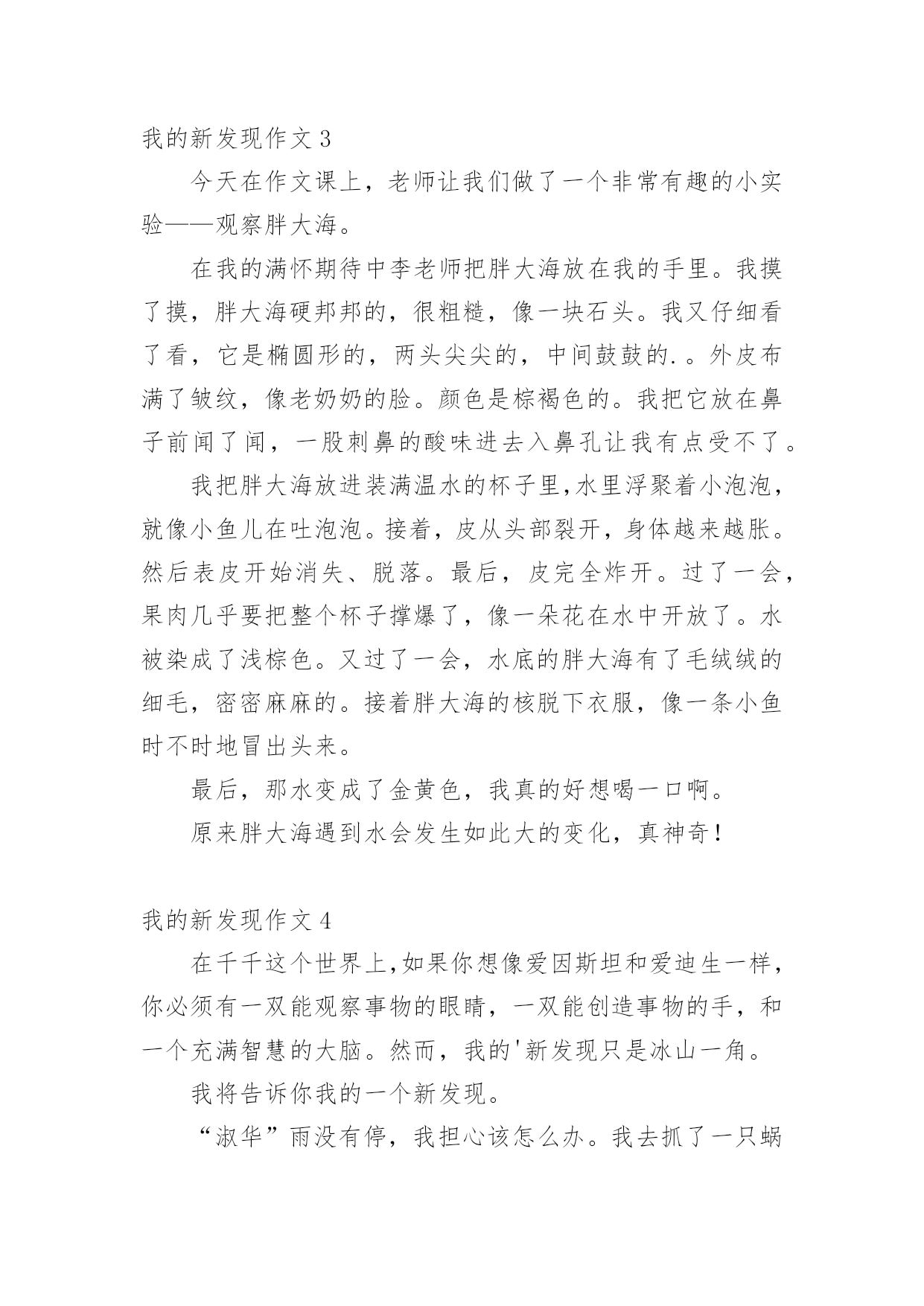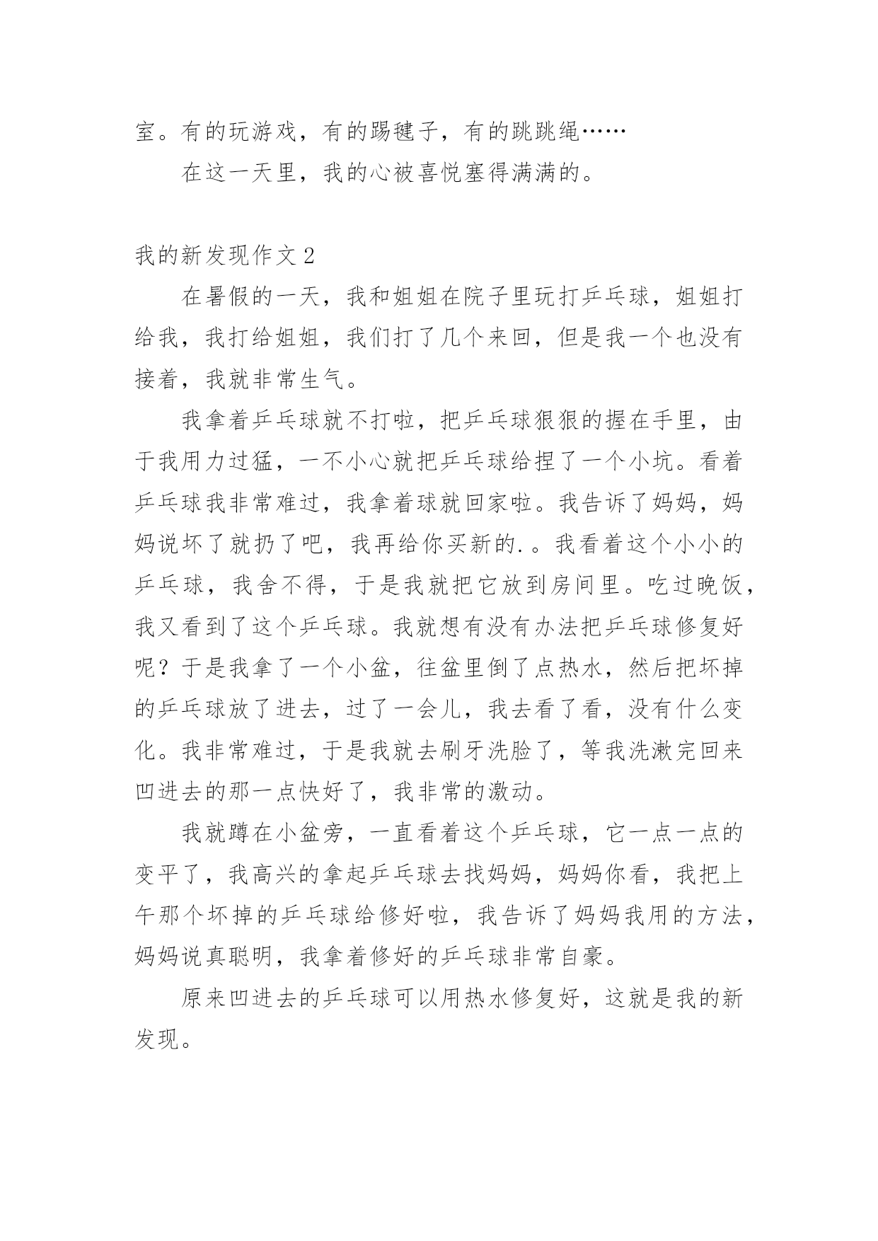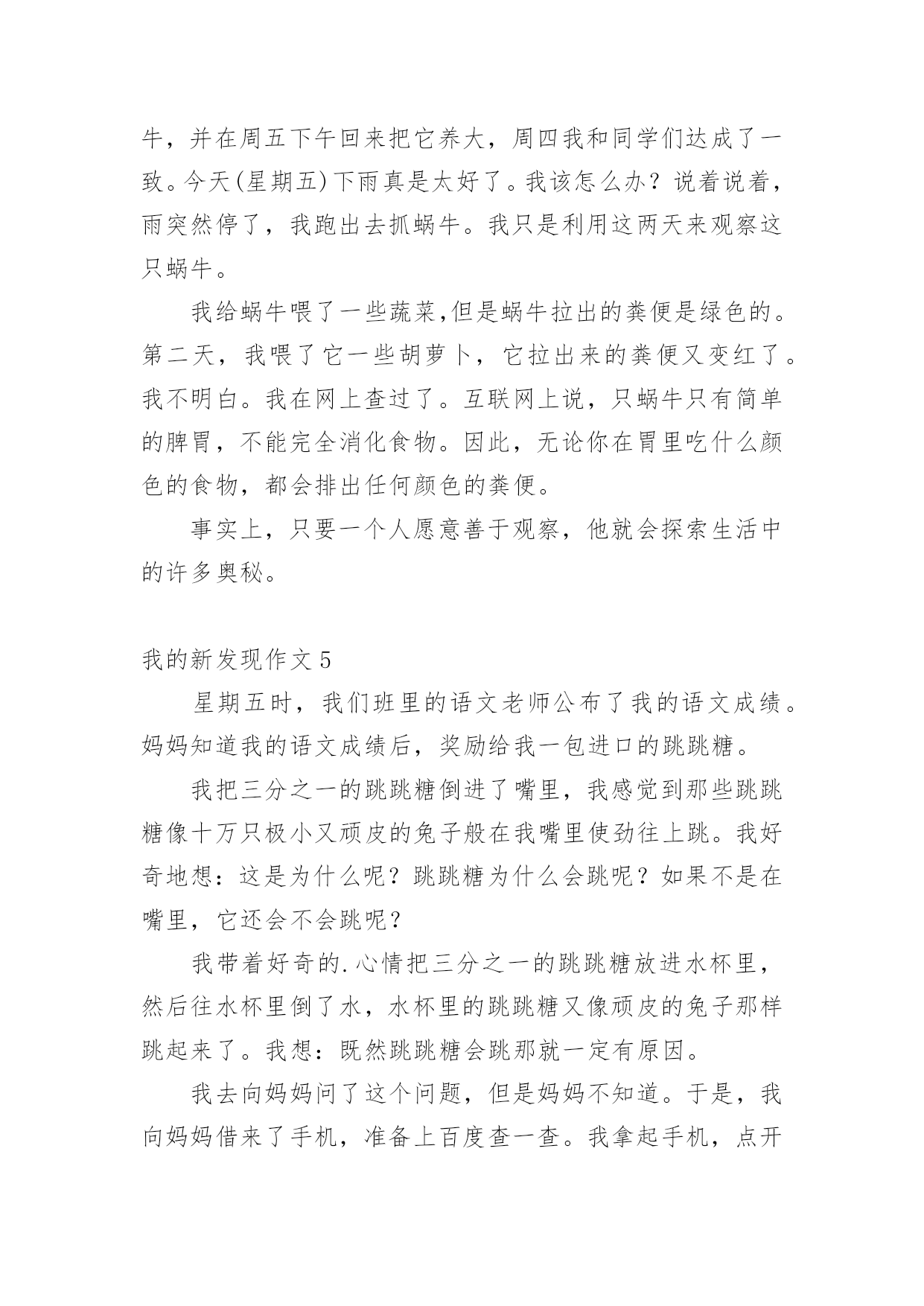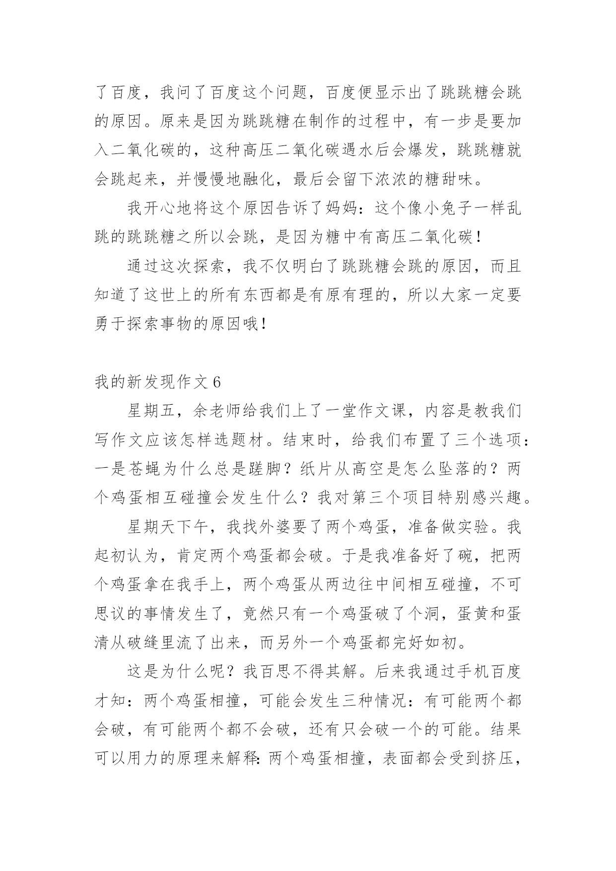 我的新发现作文 我的新发现作文[集合15篇]无论在学习、工作或是生活中,大家都不可避免地会接触到作文吧,通过作文可以把我们那些零零散散的思想,聚集在一块。你知道作文怎样才能写的好吗?以下是小编帮大家整理的我的新发现作文,仅供参考,希望能够帮助到大家。我的新发现作文1愉快的暑假很快就过去了,今天早晨,一个很熟悉的声音把我从睡梦中叫醒,啊!今天就要开学了。我赶紧起床,吃完早饭,迎着朝阳,唱着动听的歌儿,高高兴兴地上学。我走进校园,校园变得更美丽了。刚刚粉刷过的'的教学楼,特别引人注目;碧绿的小树在风中跳舞;鲜艳的花儿仿佛在迎接我们。我迫不及待走进教室,同学们三个一群,五个一伙,谈论着假期生活趣事多,谈着谈着老师来了,老师和同学一起打扫卫生。不一会儿,教室就恢复了从前那整洁的样子。老师要发新书了,那么多的新书摆在我的面前,我想我一定要好好学习,每天都有一个小进步。这时教室里传出朗朗的读书声,窗外变得十分安静,树枝不摇了,鸟儿不叫了,蝴蝶停在花朵上,都在听同学们读课文。清脆的下课铃响起来,同学们像脱缰的野马一样冲出教室。有的玩游戏,有的踢毽子,有的跳跳绳……在这一天里,我的心被喜悦塞得满满的。我的新发现作文2在暑假的一天,我和姐姐在院子里玩打乒乓球,姐姐打给我,我打给姐姐,我们打了几个来回,但是我一个也没有接着,我就非常生气。我拿着乒乓球就不打啦,把乒乓球狠狠的握在手里,由于我用力过猛,一不小心就把乒乓球给捏了一个小坑。看着乒乓球我非常难过,我拿着球就回家啦。我告诉了妈妈,妈妈说坏了就扔了吧,我再给你买新的.。我看着这个小小的乒乓球,我舍不得,于是我就把它放到房间里。吃过晚饭,我又看到了这个乒乓球。我就想有没有办法把乒乓球修复好呢?于是我拿了一个小盆,往盆里倒了点热水,然后把坏掉的乒乓球放了进去,过了一会儿,我去看了看,没有什么变化。我非常难过,于是我就去刷牙洗脸了,等我洗漱完回来凹进去的那一点快好了,我非常的激动。我就蹲在小盆旁,一直看着这个乒乓球,它一点一点的变平了,我高兴的拿起乒乓球去找妈妈,妈妈你看,我把上午那个坏掉的乒乓球给修好啦,我告诉了妈妈我用的方法,妈妈说真聪明,我拿着修好的乒乓球非常自豪。原来凹进去的乒乓球可以用热水修复好,这就是我的新发现。我的新发现作文3今天在作文课上,老师让我们做了一个非常有趣的小实验——观察胖大海。在我的满怀期待中李老师把胖大海放在我的手里。我摸了摸,胖大海硬邦邦的,很粗糙,像一块石头。我又仔细看了看,它是椭圆形的,两头尖尖的,中间鼓鼓的.。外皮布满了皱纹,像老奶奶的脸。颜色是棕褐色的。我把它放在鼻子前闻了闻,一股刺鼻的酸味进去入鼻孔让我有点受不了。我把胖大海放进装满温水的杯子里,水里浮聚着小泡泡,就像小鱼儿在吐泡泡。接着,皮从头部裂开,身体越来越胀。然后表皮开始消失、脱落。最后,皮完全炸开。过了一会,果肉几乎要把整个杯子撑爆了,像一朵花在水中开放了。水被染成了浅棕色。又过了一会,水底的胖大海有了毛绒绒的细毛,密密麻麻的。接着胖大海的核脱下衣服,像一条小鱼时不时地冒出头来。最后,那水变成了金黄色,我真的好想喝一口啊。原来胖大海遇到水会发生如此大的变化,真神奇!我的新发现作文4在千千这个世界上,如果你想像爱因斯坦和爱迪生一样,你必须有一双能观察事物的眼睛,一双能创造事物的手,和一个充满智慧的大脑。然而,我的'新发现只是冰山一角。我将告诉你我的一个新发现。“淑华”雨没有停,我担心该怎么办。我去抓了一只蜗牛,并在周五下午回来把它养大,周四我和同学们达成了一致。今天(星期五)下雨真是太好了。我该怎么办?说着说着,雨突然停了,我跑出去抓蜗牛。我只是利用这两天来观察这只蜗牛。我给蜗牛喂了一些蔬菜,但是蜗牛拉出的粪便是绿色的。第二天,我喂了它一些胡萝卜,它拉出来的粪便又变红了。我不明白。我在网上查过了。互联网上说,只蜗牛只有简单的脾胃,不能完全消化食物。因此,无论你在胃里吃什么颜色的食物,都会排出任何颜色的粪便。事实上,只要一个人愿意善于观察,他就会探索生活中的许多奥秘。我的新发现作文5星期五时,我们班里的语文老师公布了我的语文成绩。妈妈知道我的语文成绩后,奖励给我一包进口的跳跳糖。我把三分之一的跳跳糖倒进了嘴里,我感觉到那些跳跳糖像十万只极小又顽皮的兔子般在我嘴里使劲往上跳。我好奇地想:这是为什么呢?跳跳糖为什么会跳呢?如果不是在嘴里,它还会不会跳呢?我带着好奇的.心情把三分之一的跳跳糖放进水杯里,然后往水杯里倒了水,水杯里的跳跳糖又像顽皮的兔子那样跳起来了。我想:既然跳跳糖会跳那就一定有原因。我去向妈妈问了这个问题,但是妈妈不知道。于是,我向妈妈借来了手机,准备上百度查一查。我拿起手机,点开了百度,我问了百度这个问题,百度便显示出了跳跳糖会跳的原因。原来是因为跳跳糖在制作的过程中,有一步是要加入二氧化