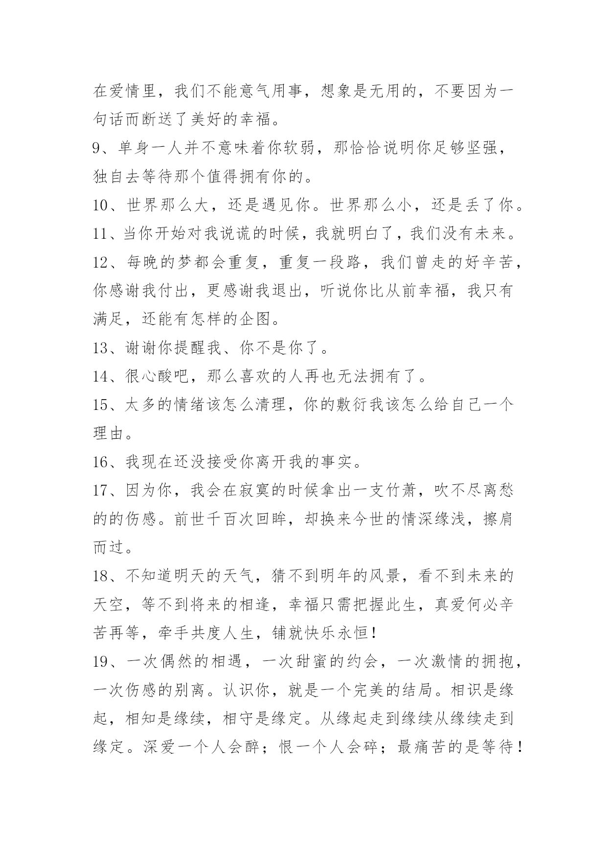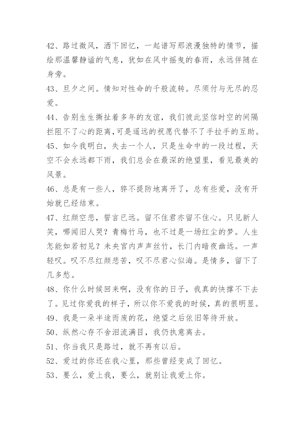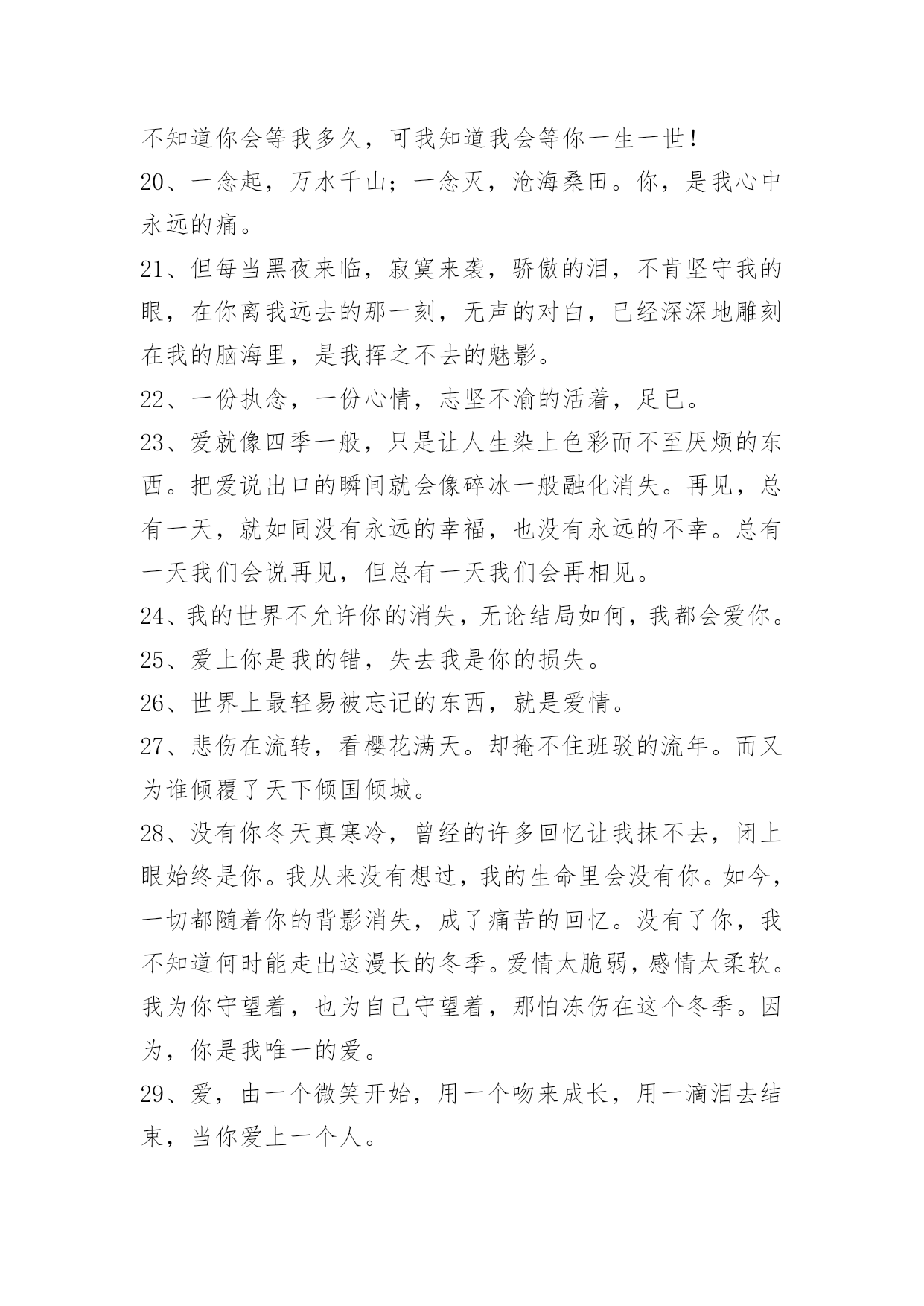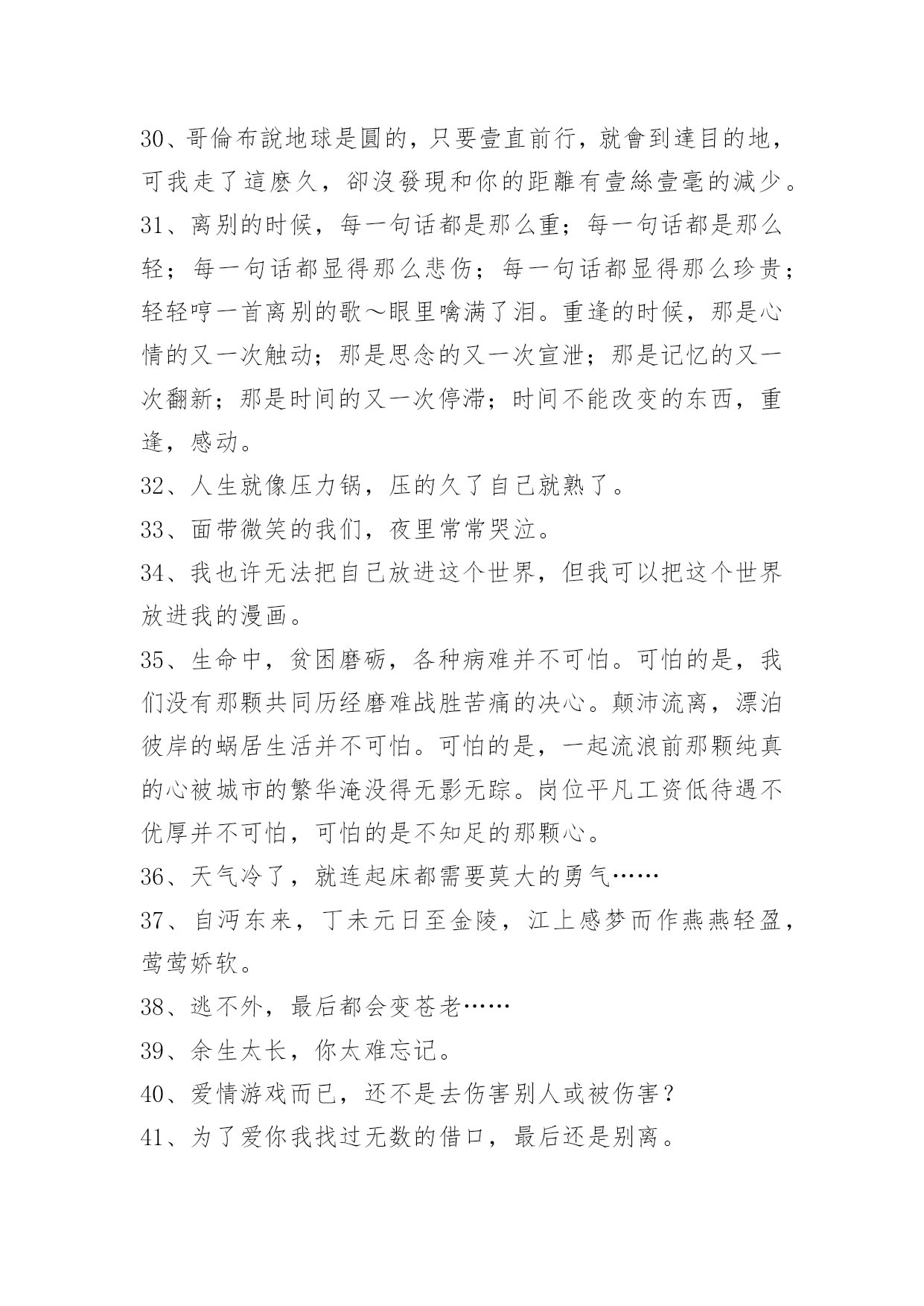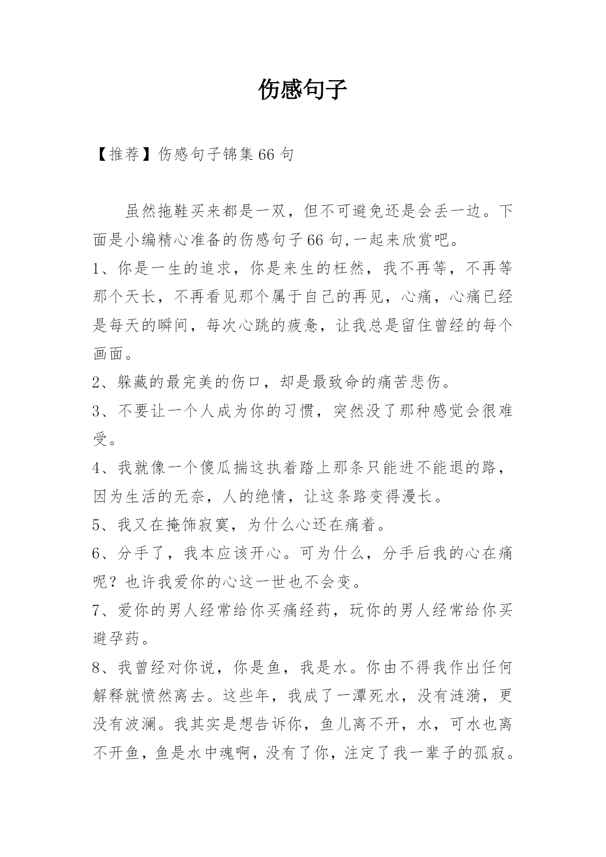 伤感句子 【推荐】伤感句子锦集66句虽然拖鞋买来都是一双,但不可避免还是会丢一边。下面是小编精心准备的伤感句子66句,一起来欣赏吧。1、你是一生的追求,你是来生的枉然,我不再等,不再等那个天长,不再看见那个属于自己的再见,心痛,心痛已经是每天的瞬间,每次心跳的疲惫,让我总是留住曾经的每个画面。2、躲藏的最完美的伤口,却是最致命的痛苦悲伤。3、不要让一个人成为你的习惯,突然没了那种感觉会很难受。4、我就像一个傻瓜揣这执着踏上那条只能进不能退的路,因为生活的无奈,人的绝情,让这条路变得漫长。5、我又在掩饰寂寞,为什么心还在痛着。6、分手了,我本应该开心。可为什么,分手后我的心在痛呢?也许我爱你的心这一世也不会变。7、爱你的男人经常给你买痛经药,玩你的男人经常给你买避孕药。8、我曾经对你说,你是鱼,我是水。你由不得我作出任何解释就愤然离去。这些年,我成了一潭死水,没有涟漪,更没有波澜。我其实是想告诉你,鱼儿离不开,水,可水也离不开鱼,鱼是水中魂啊,没有了你,注定了我一辈子的孤寂。在爱情里,我们不能意气用事,想象是无用的,不要因为一句话而断送了美好的幸福。9、单身一人并不意味着你软弱,那恰恰说明你足够坚强,独自去等待那个值得拥有你的。10、世界那么大,还是遇见你。世界那么小,还是丢了你。11、当你开始对我说谎的时候,我就明白了,我们没有未来。12、每晚的梦都会重复,重复一段路,我们曾走的好辛苦,你感谢我付出,更感谢我退出,听说你比从前幸福,我只有满足,还能有怎样的企图。13、谢谢你提醒我、你不是你了。14、很心酸吧,那么喜欢的人再也无法拥有了。15、太多的情绪该怎么清理,你的敷衍我该怎么给自己一个理由。16、我现在还没接受你离开我的事实。17、因为你,我会在寂寞的时候拿出一支竹萧,吹不尽离愁的的伤感。前世千百次回眸,却换来今世的情深缘浅,擦肩而过。18、不知道明天的天气,猜不到明年的风景,看不到未来的天空,等不到将来的相逢,幸福只需把握此生,真爱何必辛苦再等,牵手共度人生,铺就快乐永恒!19、一次偶然的相遇,一次甜蜜的约会,一次激情的拥抱,一次伤感的别离。认识你,就是一个完美的结局。相识是缘起,相知是缘续,相守是缘定。从缘起走到缘续从缘续走到缘定。深爱一个人会醉;恨一个人会碎;最痛苦的是等待!不知道你会等我多久,可我知道我会等你一生一世!20、一念起,万水千山;一念灭,沧海桑田。你,是我心中永远的痛。21、但每当黑夜来临,寂寞来袭,骄傲的泪,不肯坚守我的眼,在你离我远去的那一刻,无声的对白,已经深深地雕刻在我的脑海里,是我挥之不去的魅影。22、一份执念,一份心情,志坚不渝的活着,足已。23、爱就像四季一般,只是让人生染上色彩而不至厌烦的东西。把爱说出口的瞬间就会像碎冰一般融化消失。再见,总有一天,就如同没有永远的幸福,也没有永远的不幸。总有一天我们会说再见,但总有一天我们会再相见。24、我的世界不允许你的消失,无论结局如何,我都会爱你。25、爱上你是我的错,失去我是你的损失。26、世界上最轻易被忘记的东西,就是爱情。27、悲伤在流转,看樱花满天。却掩不住班驳的流年。而又为谁倾覆了天下倾国倾城。28、没有你冬天真寒冷,曾经的许多回忆让我抹不去,闭上眼始终是你。我从来没有想过,我的生命里会没有你。如今,一切都随着你的背影消失,成了痛苦的回忆。没有了你,我不知道何时能走出这漫长的冬季。爱情太脆弱,感情太柔软。我为你守望着,也为自己守望着,那怕冻伤在这个冬季。因为,你是我唯一的爱。29、爱,由一个微笑开始,用一个吻来成长,用一滴泪去结束,当你爱上一个人。30、哥倫布說地球是圓的,只要壹直前行,就會到達目的地,可我走了這麽久,卻沒發現和你的距離有壹絲壹毫的減少。31、离别的时候,每一句话都是那么重;每一句话都是那么轻;每一句话都显得那么悲伤;每一句话都显得那么珍贵;轻轻哼一首离别的歌~眼里噙满了泪。重逢的时候,那是心情的又一次触动;那是思念的又一次宣泄;那是记忆的又一次翻新;那是时间的又一次停滞;时间不能改变的东西,重逢,感动。32、人生就像压力锅,压的久了自己就熟了。33、面带微笑的我们,夜里常常哭泣。34、我也许无法把自己放进这个世界,但我可以把这个世界放进我的漫画。35、生命中,贫困磨砺,各种病难并不可怕。可怕的是,我们没有那颗共同历经磨难战胜苦痛的决心。颠沛流离,漂泊彼岸的蜗居生活并不可怕。可怕的是,一起流浪前那颗纯真的心被城市的繁华淹没得无影无踪。岗位平凡工资低待遇不优厚并不可怕,可怕的是不知足的那颗心。36、天气冷了,就连起床都需要莫大的勇气……37、自沔东来,丁未元日至金陵,江上感梦而作燕燕轻盈,莺莺娇软。38、逃不外,最后都会变苍老……39、余生太长,你太难忘记。40、爱情游戏而已,还不是去伤害别人或被伤害?41、为了爱你我找