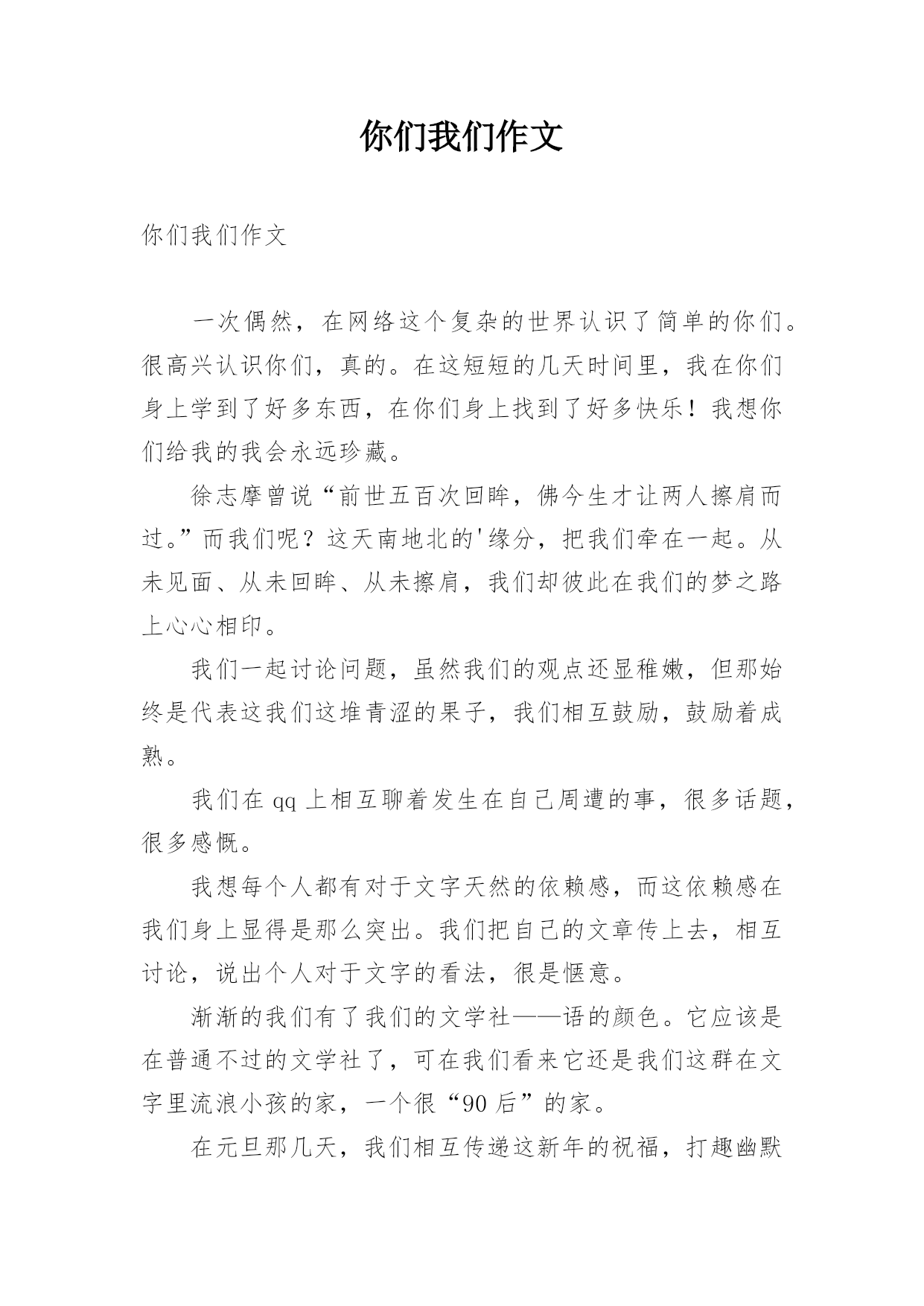 你们我们作文 你们我们作文一次偶然,在网络这个复杂的世界认识了简单的你们。很高兴认识你们,真的。在这短短的几天时间里,我在你们身上学到了好多东西,在你们身上找到了好多快乐!我想你们给我的我会永远珍藏。徐志摩曾说“前世五百次回眸,佛今生才让两人擦肩而过。”而我们呢?这天南地北的'缘分,把我们牵在一起。从未见面、从未回眸、从未擦肩,我们却彼此在我们的梦之路上心心相印。我们一起讨论问题,虽然我们的观点还显稚嫩,但那始终是代表这我们这堆青涩的果子,我们相互鼓励,鼓励着成熟。我们在qq上相互聊着发生在自己周遭的事,很多话题,很多感慨。我想每个人都有对于文字天然的依赖感,而这依赖感在我们身上显得是那么突出。我们把自己的文章传上去,相互讨论,说出个人对于文字的看法,很是惬意。渐渐的我们有了我们的文学社——语的颜色。它应该是在普通不过的文学社了,可在我们看来它还是我们这群在文字里流浪小孩的家,一个很“90后”的家。在元旦那几天,我们相互传递这新年的祝福,打趣幽默中我们是那样的幸福,我们这群“90后”人在张扬与真诚中展现我们的青春。这是一个90后的天空,积极向上,团结有爱,自由畅想,倔强坚强,快乐崇拜着自己所爱的生活。我们,这群可爱的孩子,打造着梦想的长空,也许我们在现实面前依旧苍白,也许我们只是“90后”这片海洋的一多小小的浪花,但我们坚信我们有着震撼海洋的力量。