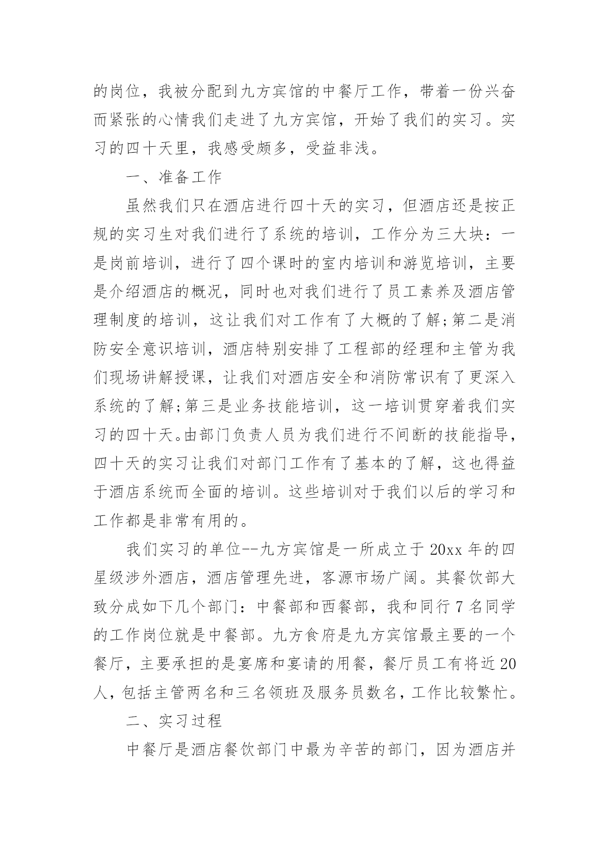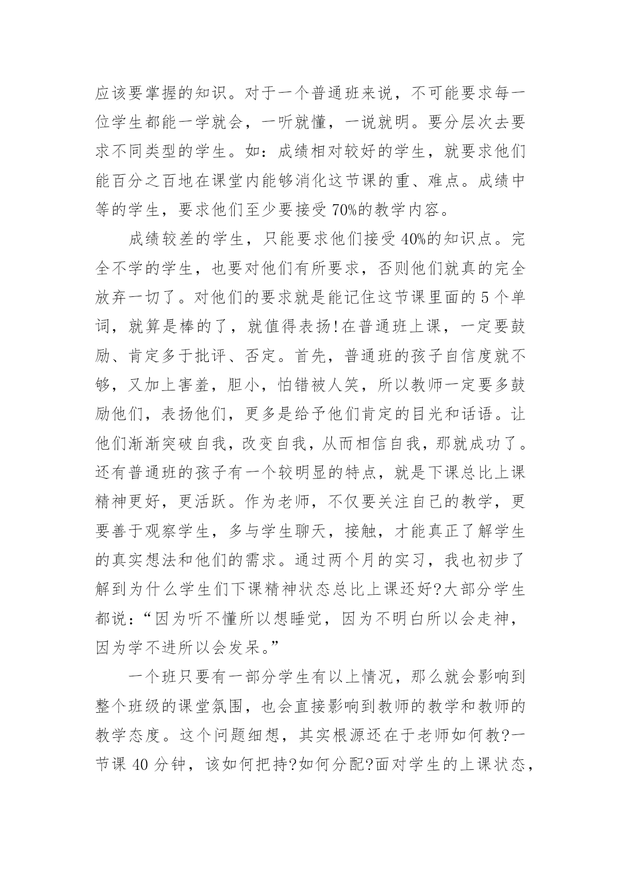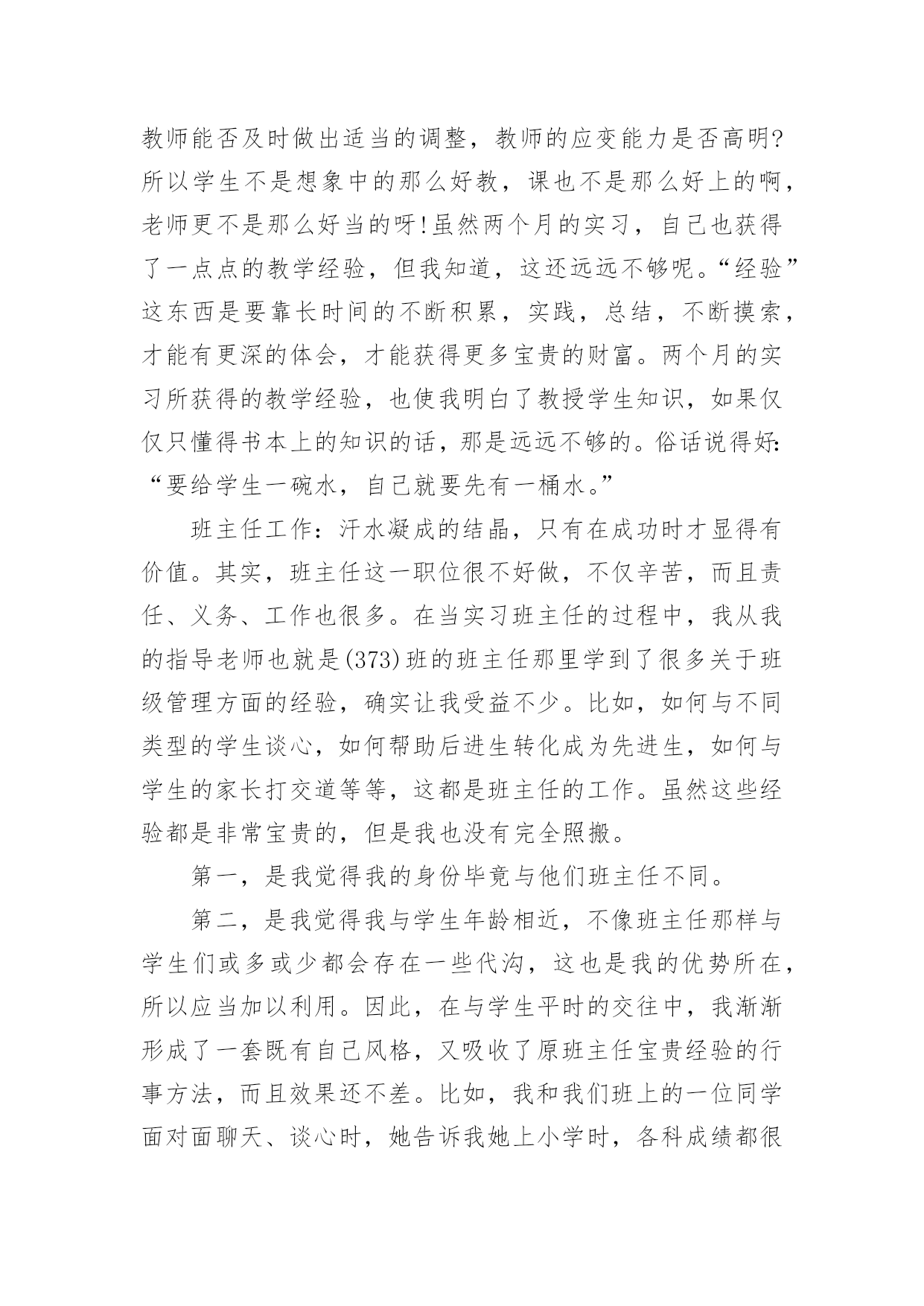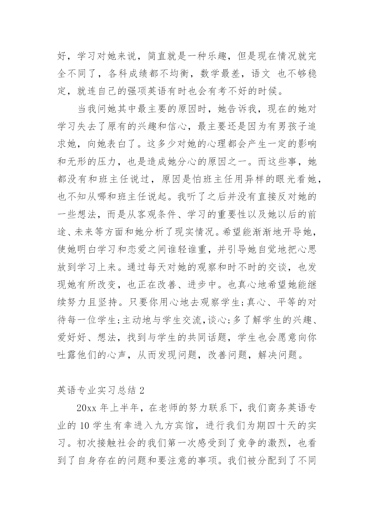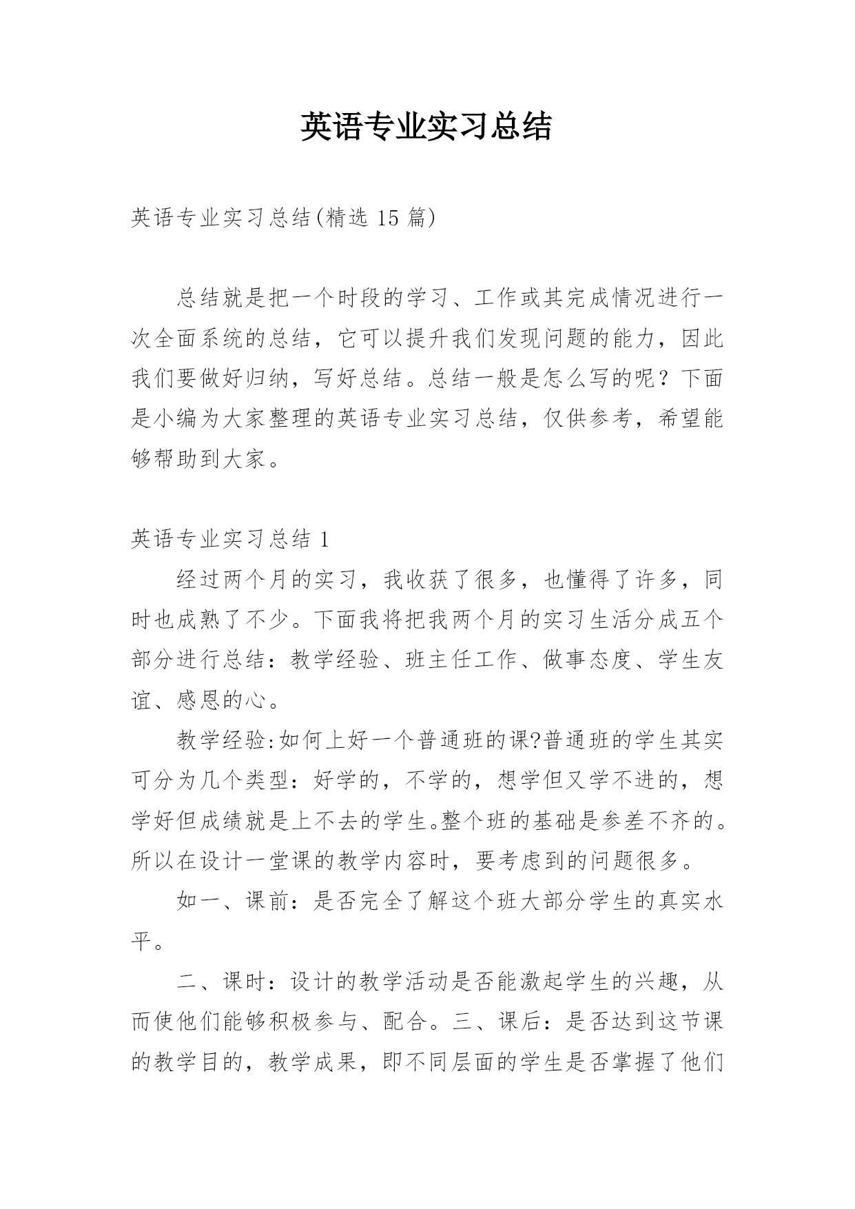 英语专业实习总结 英语专业实习总结(精选15篇)总结就是把一个时段的学习、工作或其完成情况进行一次全面系统的总结,它可以提升我们发现问题的能力,因此我们要做好归纳,写好总结。总结一般是怎么写的呢?下面是小编为大家整理的英语专业实习总结,仅供参考,希望能够帮助到大家。英语专业实习总结1经过两个月的实习,我收获了很多,也懂得了许多,同时也成熟了不少。下面我将把我两个月的实习生活分成五个部分进行总结:教学经验、班主任工作、做事态度、学生友谊、感恩的心。教学经验:如何上好一个普通班的课?普通班的学生其实可分为几个类型:好学的,不学的,想学但又学不进的,想学好但成绩就是上不去的学生。整个班的基础是参差不齐的。所以在设计一堂课的教学内容时,要考虑到的问题很多。如一、课前:是否完全了解这个班大部分学生的真实水平。二、课时:设计的教学活动是否能激起学生的兴趣,从而使他们能够积极参与、配合。三、课后:是否达到这节课的教学目的,教学成果,即不同层面的学生是否掌握了他们应该要掌握的知识。对于一个普通班来说,不可能要求每一位学生都能一学就会,一听就懂,一说就明。要分层次去要求不同类型的学生。如:成绩相对较好的学生,就要求他们能百分之百地在课堂内能够消化这节课的重、难点。成绩中等的学生,要求他们至少要接受70%的教学内容。成绩较差的学生,只能要求他们接受40%的知识点。完全不学的学生,也要对他们有所要求,否则他们就真的完全放弃一切了。对他们的要求就是能记住这节课里面的5个单词,就算是棒的了,就值得表扬!在普通班上课,一定要鼓励、肯定多于批评、否定。首先,普通班的孩子自信度就不够,又加上害羞,胆小,怕错被人笑,所以教师一定要多鼓励他们,表扬他们,更多是给予他们肯定的目光和话语。让他们渐渐突破自我,改变自我,从而相信自我,那就成功了。还有普通班的孩子有一个较明显的特点,就是下课总比上课精神更好,更活跃。作为老师,不仅要关注自己的教学,更要善于观察学生,多与学生聊天,接触,才能真正了解学生的真实想法和他们的需求。通过两个月的实习,我也初步了解到为什么学生们下课精神状态总比上课还好?大部分学生都说:“因为听不懂所以想睡觉,因为不明白所以会走神,因为学不进所以会发呆。”一个班只要有一部分学生有以上情况,那么就会影响到整个班级的课堂氛围,也会直接影响到教师的教学和教师的教学态度。这个问题细想,其实根源还在于老师如何教?一节课40分钟,该如何把持?如何分配?面对学生的上课状态,教师能否及时做出适当的调整,教师的应变能力是否高明?所以学生不是想象中的那么好教,课也不是那么好上的啊,老师更不是那么好当的呀!虽然两个月的实习,自己也获得了一点点的教学经验,但我知道,这还远远不够呢。“经验”这东西是要靠长时间的不断积累,实践,总结,不断摸索,才能有更深的体会,才能获得更多宝贵的财富。两个月的实习所获得的教学经验,也使我明白了教授学生知识,如果仅仅只懂得书本上的知识的话,那是远远不够的。俗话说得好:“要给学生一碗水,自己就要先有一桶水。”班主任工作:汗水凝成的结晶,只有在成功时才显得有价值。其实,班主任这一职位很不好做,不仅辛苦,而且责任、义务、工作也很多。在当实习班主任的过程中,我从我的指导老师也就是(373)班的班主任那里学到了很多关于班级管理方面的经验,确实让我受益不少。比如,如何与不同类型的学生谈心,如何帮助后进生转化成为先进生,如何与学生的家长打交道等等,这都是班主任的工作。虽然这些经验都是非常宝贵的,但是我也没有完全照搬。第一,是我觉得我的身份毕竟与他们班主任不同。第二,是我觉得我与学生年龄相近,不像班主任那样与学生们或多或少都会存在一些代沟,这也是我的优势所在,所以应当加以利用。因此,在与学生平时的交往中,我渐渐形成了一套既有自己风格,又吸收了原班主任宝贵经验的行事方法,而且效果还不差。比如,我和我们班上的一位同学面对面聊天、谈心时,她告诉我她上小学时,各科成绩都很好,学习对她来说,简直就是一种乐趣,但是现在情况就完全不同了,各科成绩都不均衡,数学最差,语文也不够稳定,就连自己的强项英语有时也会有考不好的时候。当我问她其中最主要的原因时,她告诉我,现在的她对学习失去了原有的兴趣和信心,最主要还是因为有男孩子追求她,向她表白了。这多少对她的心理都会产生一定的影响和无形的压力,也是造成她分心的原因之一。而这些事,她都没有和班主任说过,原因是怕班主任用异样的眼光看她,也不知从哪和班主任说起。我听了之后并没有直接反对她的一些想法,而是从客观条件、学习的重要性以及她以后的前途、未来等方面和她分析了现实情况。希望能渐渐地开导她,使她明白学习和恋爱之间谁轻谁重,并引导她自觉地把心思放到学习上来。通过每天对她的观察和时不时的交谈,也发现她有所改变,也正在改善、进步中。也真心地