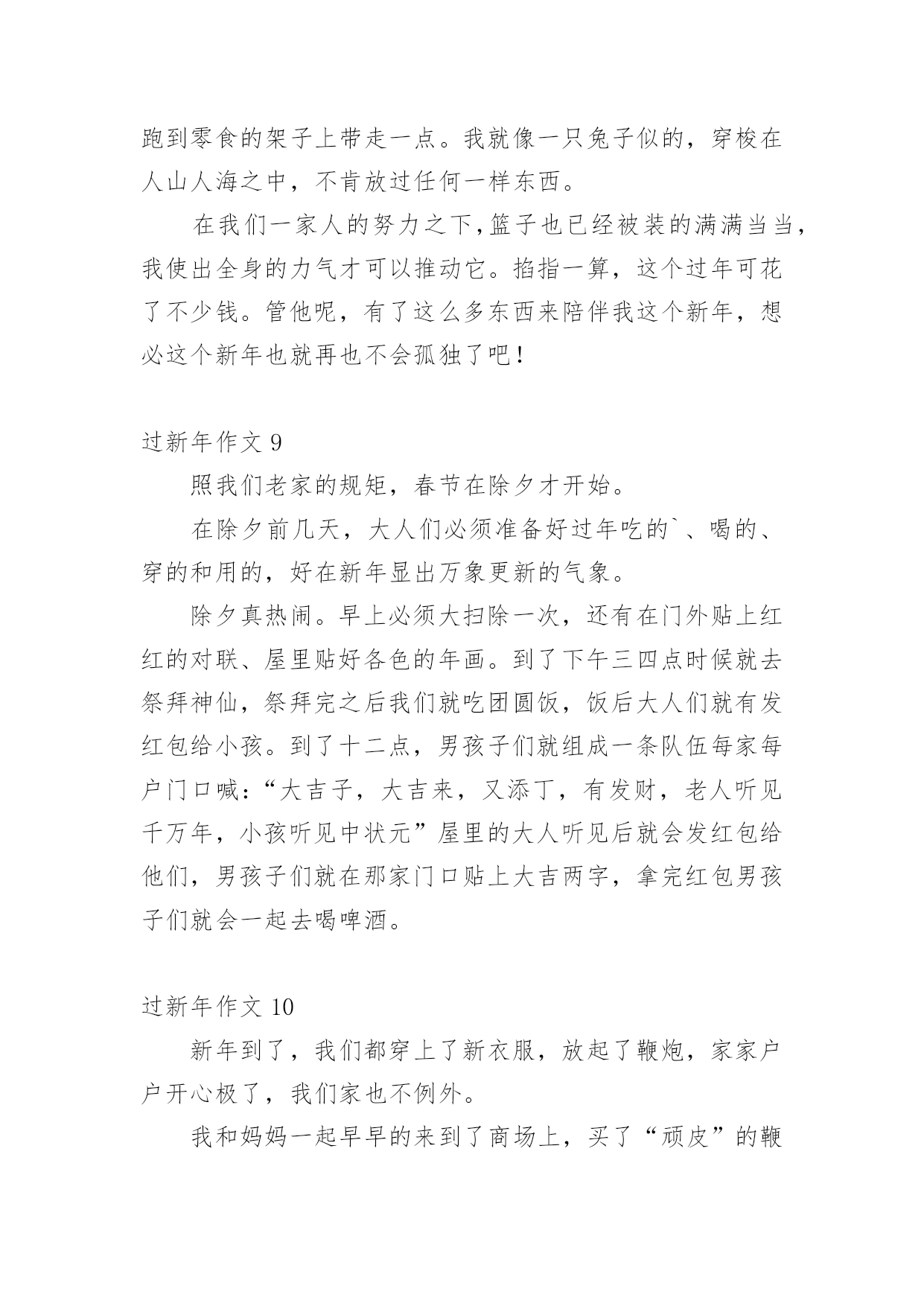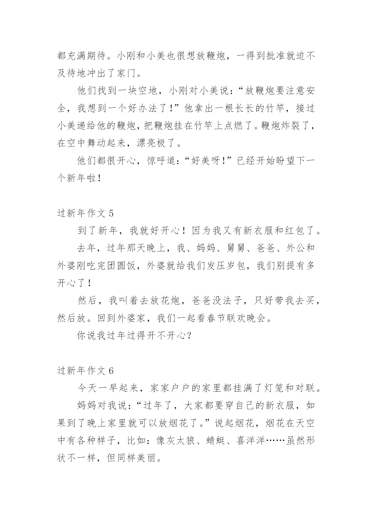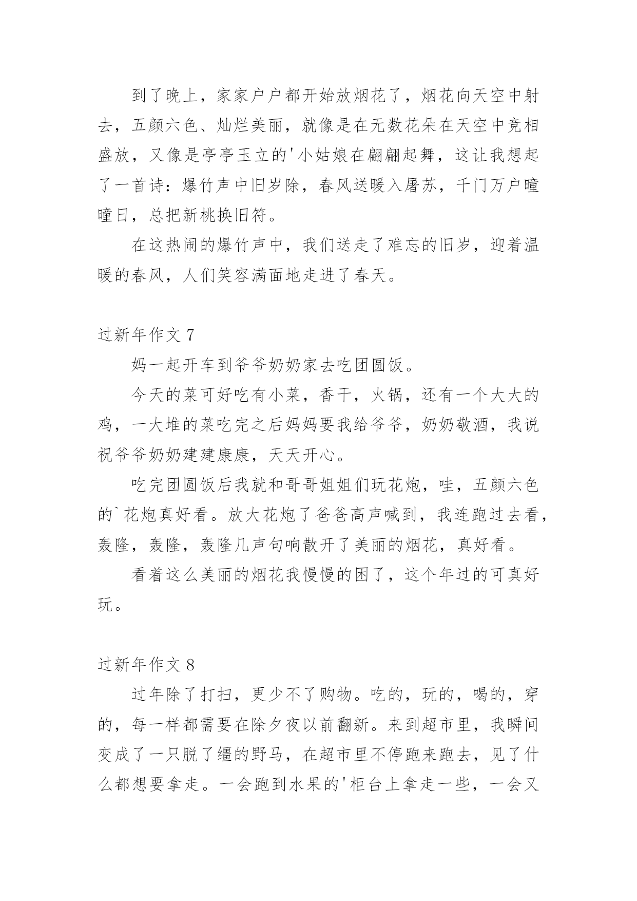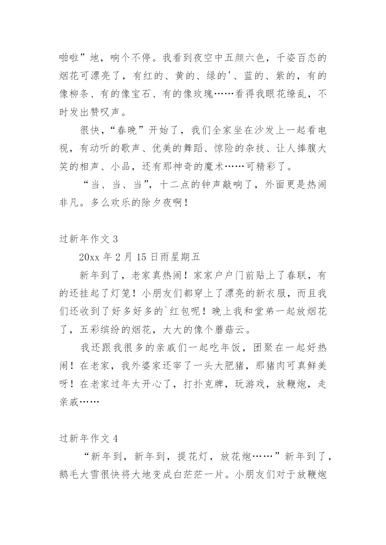 过新年作文 【精华】过新年作文15篇在平时的学习、工作或生活中,大家或多或少都会接触过作文吧,作文要求篇章结构完整,一定要避免无结尾作文的出现。那要怎么写好作文呢?下面是小编为大家收集的过新年作文,仅供参考,欢迎大家阅读。过新年作文1过年了,我有新衣,新裤,新鞋,我去了奶奶家,奶奶家好热闹哦!大人们忙的大汗淋淋,气喘吁吁,满头大汗,我真想帮忙,可是我的'任务是学习,大人们的任务是干活……天黑了,我也要放鞭炮了,哇哦!鞭炮响的声音很吵,放出来地烟花非常美。我还去了丽水,外冯村。过年还收了许多压岁钱,过年真好!过新年作文2大年三十,是辞旧迎新的日子。这天,我们把爷爷、奶奶、外婆接到自己家来过新年。晚上,奶奶准备了一桌丰盛的年夜饭,我们围着桌子,高兴地吃着。饭后我迫不及待地跑到楼下和爸爸一起放烟花,“噼里啪啦”地,响个不停。我看到夜空中五颜六色,千姿百态的烟花可漂亮了,有红的、黄的、绿的'、蓝的、紫的,有的像柳条、有的像宝石、有的像玫瑰……看得我眼花缭乱,不时发出赞叹声。很快,“春晚”开始了,我们全家坐在沙发上一起看电视,有动听的歌声、优美的舞蹈、惊险的杂技、让人捧腹大笑的相声、小品,还有那神奇的魔术……可精彩了。“当、当、当”,十二点的钟声敲响了,外面更是热闹非凡。多么欢乐的除夕夜啊!过新年作文320xx年2月15日雨星期五新年到了,老家真热闹!家家户户门前贴上了春联,有的还挂起了灯笼!小朋友们都穿上了漂亮的新衣服,而且我们还收到了好多好多的`红包呢!晚上我和堂弟一起放烟花了,五彩缤纷的烟花,大大的像个蘑菇云。我还跟我很多的亲戚们一起吃年饭,团聚在一起好热闹!在老家,我外婆家还宰了一头大肥猪,那猪肉可真鲜美呀!在老家过年太开心了,打扑克牌,玩游戏,放鞭炮,走亲戚……过新年作文4“新年到,新年到,提花灯,放花炮……”新年到了,鹅毛大雪很快将大地变成白茫茫一片。小朋友们对于放鞭炮都充满期待。小刚和小美也很想放鞭炮,一得到批准就迫不及待地冲出了家门。他们找到一块空地,小刚对小美说:“放鞭炮要注意安全,我想到一个好办法了!”他拿出一根长长的竹竿,接过小美递给他的鞭炮,把鞭炮挂在竹竿上点燃了。鞭炮炸裂了,在空中舞动起来,漂亮极了。他们都很开心,惊呼道:“好美呀!”已经开始盼望下一个新年啦!过新年作文5到了新年,我就好开心!因为我又有新衣服和红包了。去年,过年那天晚上,我、妈妈、舅舅、爸爸、外公和外婆刚吃完团圆饭,外婆就给我们发压岁包,我们别提有多开心了!然后,我叫着去放花炮,爸爸没法子,只好带我去买,然后放。回到外婆家,我们一起看春节联欢晚会。你说我过年过得开不开心?过新年作文6今天一早起来,家家户户的家里都挂满了灯笼和对联。妈妈对我说:“过年了,大家都要穿自己的新衣服,如果到了晚上家里就可以放烟花了。”说起烟花,烟花在天空中有各种样子,比如:像灰太狼、蜻蜓、喜洋洋……虽然形状不一样,但同样美丽。到了晚上,家家户户都开始放烟花了,烟花向天空中射去,五颜六色、灿烂美丽,就像是在无数花朵在天空中竞相盛放,又像是亭亭玉立的'小姑娘在翩翩起舞,这让我想起了一首诗:爆竹声中旧岁除,春风送暖入屠苏,千门万户曈曈日,总把新桃换旧符。在这热闹的爆竹声中,我们送走了难忘的旧岁,迎着温暖的春风,人们笑容满面地走进了春天。过新年作文7妈一起开车到爷爷奶奶家去吃团圆饭。今天的菜可好吃有小菜,香干,火锅,还有一个大大的鸡,一大堆的菜吃完之后妈妈要我给爷爷,奶奶敬酒,我说祝爷爷奶奶建建康康,天天开心。吃完团圆饭后我就和哥哥姐姐们玩花炮,哇,五颜六色的`花炮真好看。放大花炮了爸爸高声喊到,我连跑过去看,轰隆,轰隆,轰隆几声句响散开了美丽的烟花,真好看。看着这么美丽的烟花我慢慢的困了,这个年过的可真好玩。过新年作文8过年除了打扫,更少不了购物。吃的,玩的,喝的,穿的,每一样都需要在除夕夜以前翻新。来到超市里,我瞬间变成了一只脱了缰的野马,在超市里不停跑来跑去,见了什么都想要拿走。一会跑到水果的'柜台上拿走一些,一会又跑到零食的架子上带走一点。我就像一只兔子似的,穿梭在人山人海之中,不肯放过任何一样东西。在我们一家人的努力之下,篮子也已经被装的满满当当,我使出全身的力气才可以推动它。掐指一算,这个过年可花了不少钱。管他呢,有了这么多东西来陪伴我这个新年,想必这个新年也就再也不会孤独了吧!过新年作文9照我们老家的规矩,春节在除夕才开始。在除夕前几天,大人们必须准备好过年吃的`、喝的、穿的和用的,好在新年显出万象更新的气象。除夕真热闹。早上必须大扫除一次,还有在门外贴上红红的对联、屋里贴好各色的年画。到了下午三四点时候就去祭拜神仙,祭拜完之后我们就吃团圆饭,饭后大人们就有发红包给小孩。到了十二点,男孩子们就组成一条队伍每家每户门口喊:“大吉子,大吉来,又添丁,有发财,老人听见
